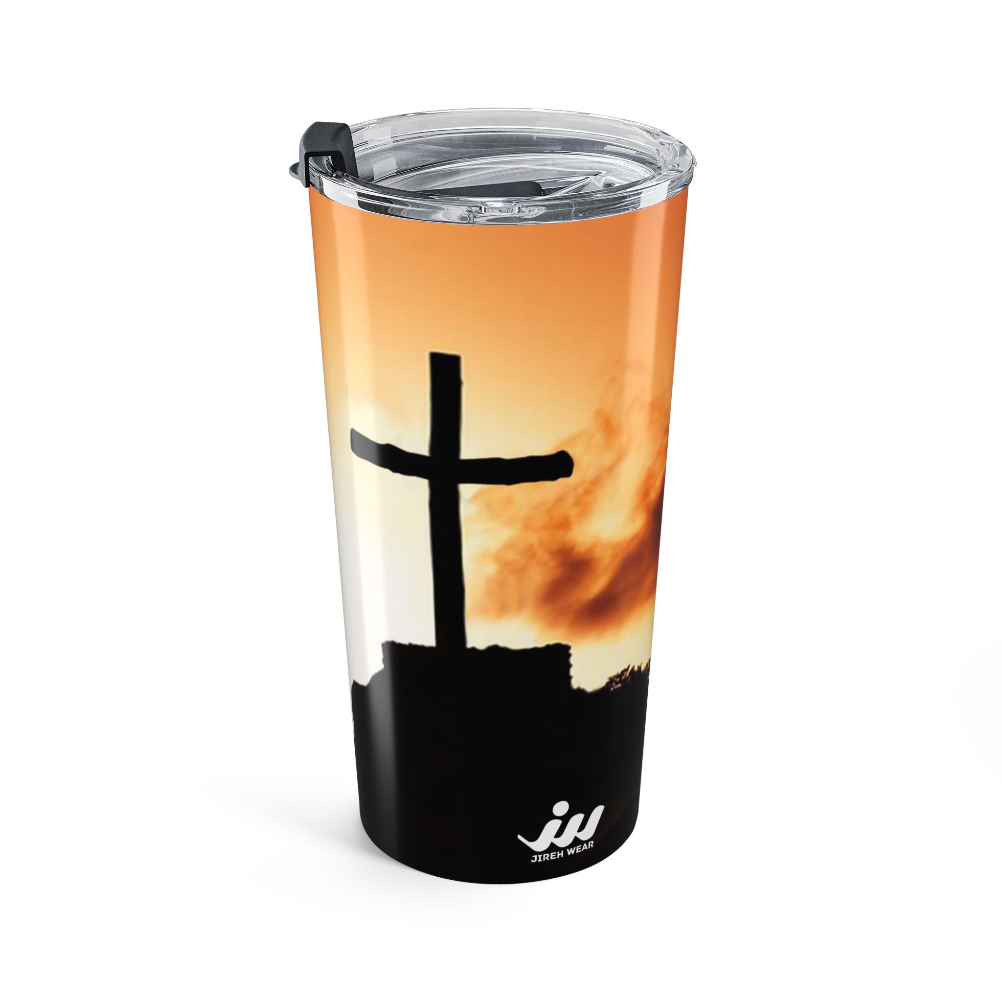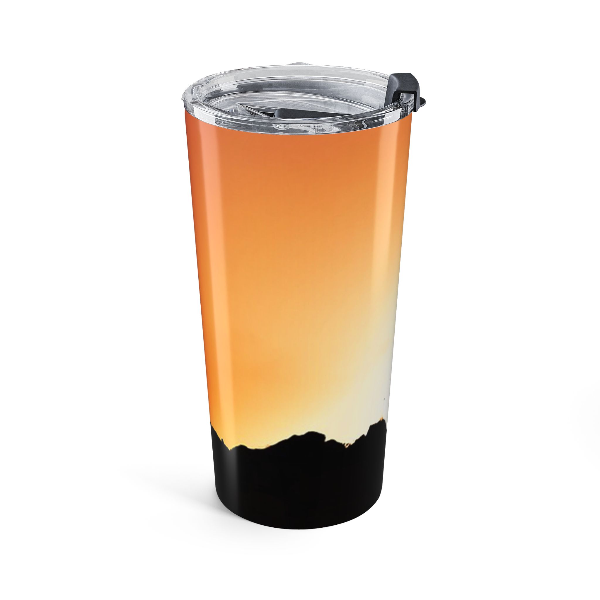 A 20oz stainless steel tumbler wrapped in a warm sunset scene that feels like the slow close of an outdoor day. The glossy, full-color print flows around the curved steel body, showing silhouetted ridgelines and a soft orange sky that shifts with every tilt. It keeps coffee steaming on early drives and iced drinks cold on long walks, while the clear push-on lid with a rubber gasket gives a confident seal for travel. Lightweight, durable, and easy to clean, this tumbler blends practical performance with a quiet, contemplative vibe.