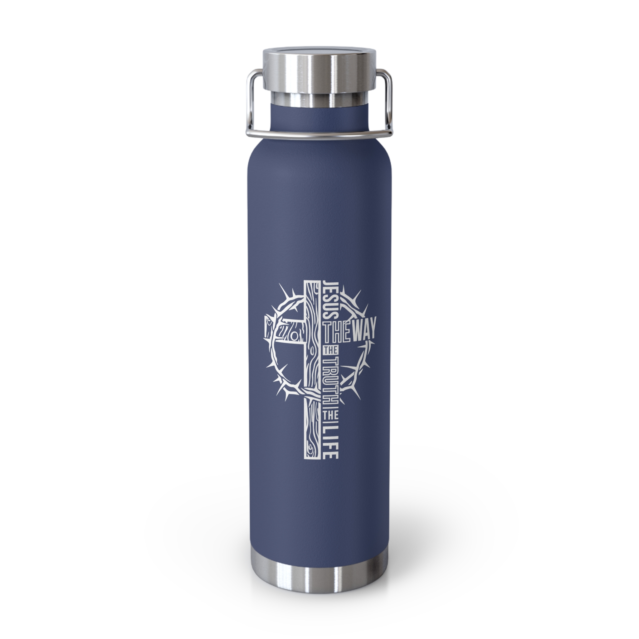This 22oz insulated bottle is built for days that start early and stretch long. The copper-insulated, double-wall stainless steel keeps coffee hot through morning prayers and study, or keeps water chilled on afternoon outreach and weekend hikes. A wide mouth fits ice and makes refills quick; the screw-on lid with a sturdy hand loop stays secure during travel and slips easily onto a backpack. The matte powder-coat finish resists scratches and holds color, while the no-condensation body stays dry in your hand. Subtle faith-inspired artwork wraps the bottle, letting your convictions travel with you — from church gatherings to community service and quiet moments of reflection.