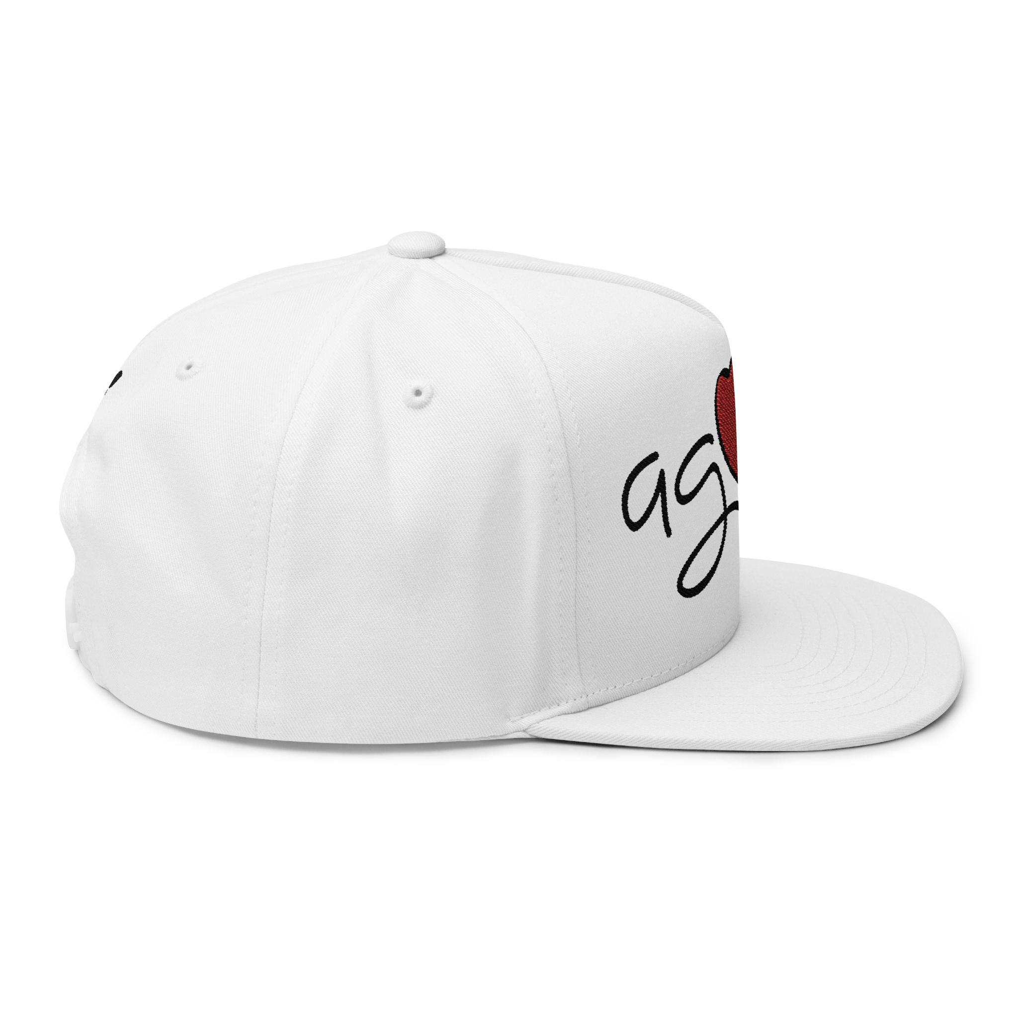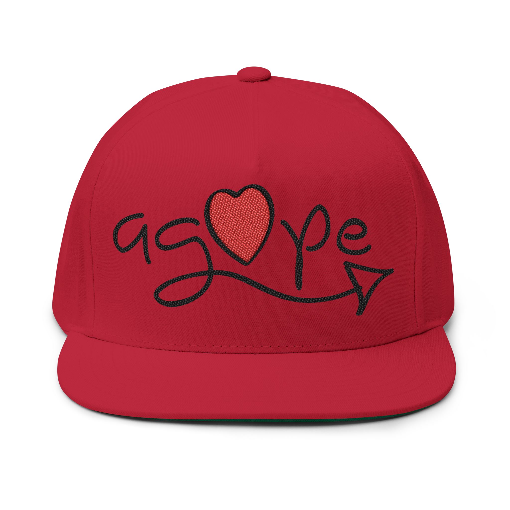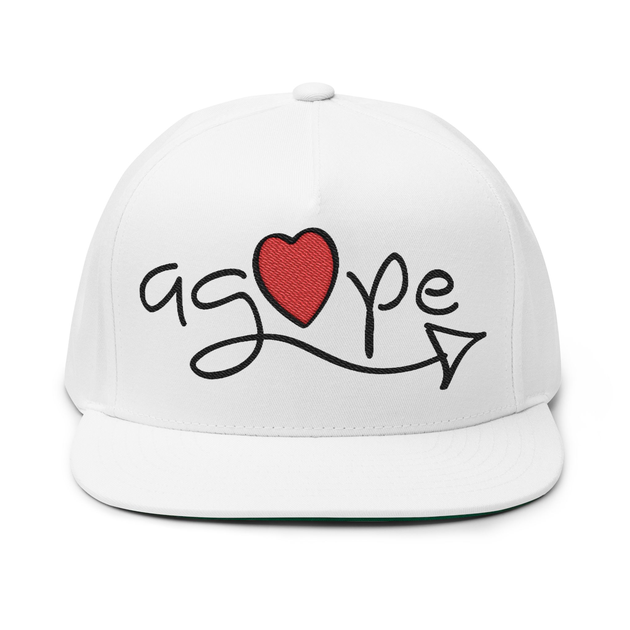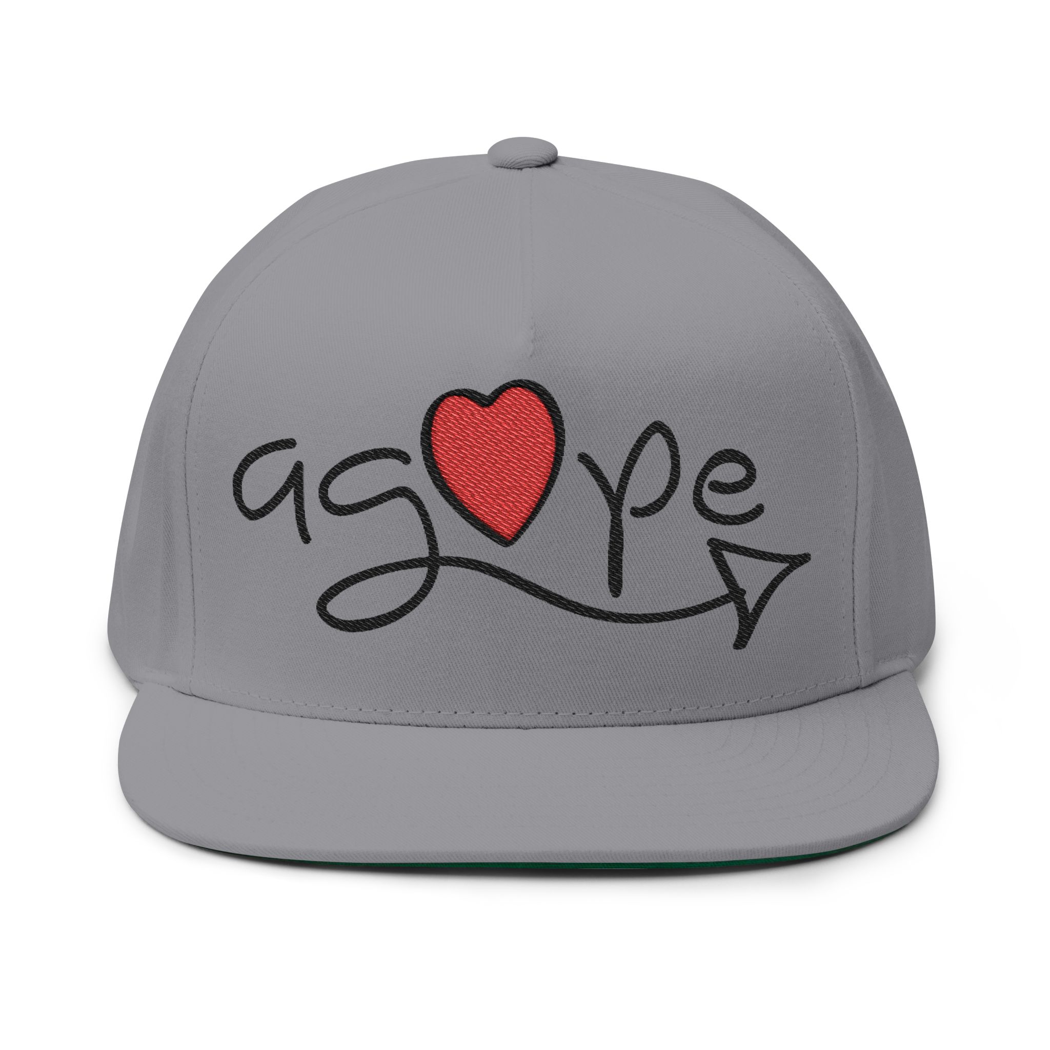 Soft cotton twill meets hand-drawn charm in this high-profile flat bill cap. The front features an embroidered, playful script spelling “agape” with a stitched red heart and arrow—simple, sincere, and quietly expressive. The structured five-panel silhouette keeps its shape while sewn eyelets add breathability for long days outside. A green undervisor gives a subtle vintage nod when you tilt the brim, and the adjustable snapback lets you find a confident, comfortable fit. Wear it with a worn tee or your favorite hoodie for low-key afternoons at the park, volunteer shifts, or mornings spent roaming farmers’ markets.