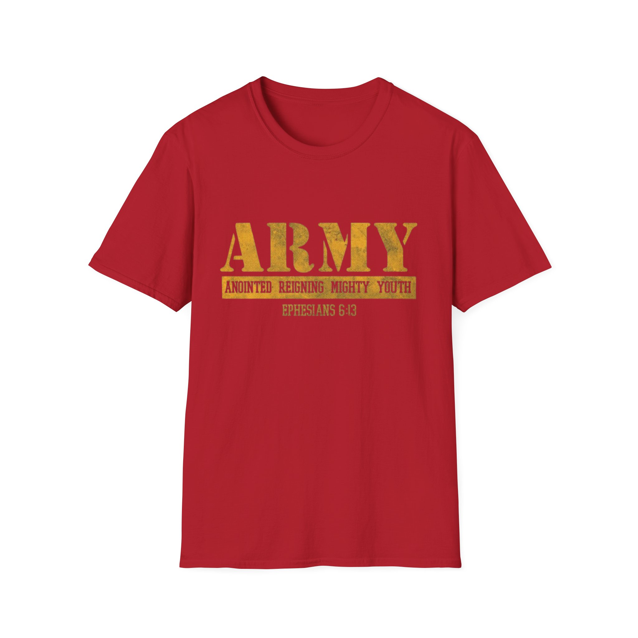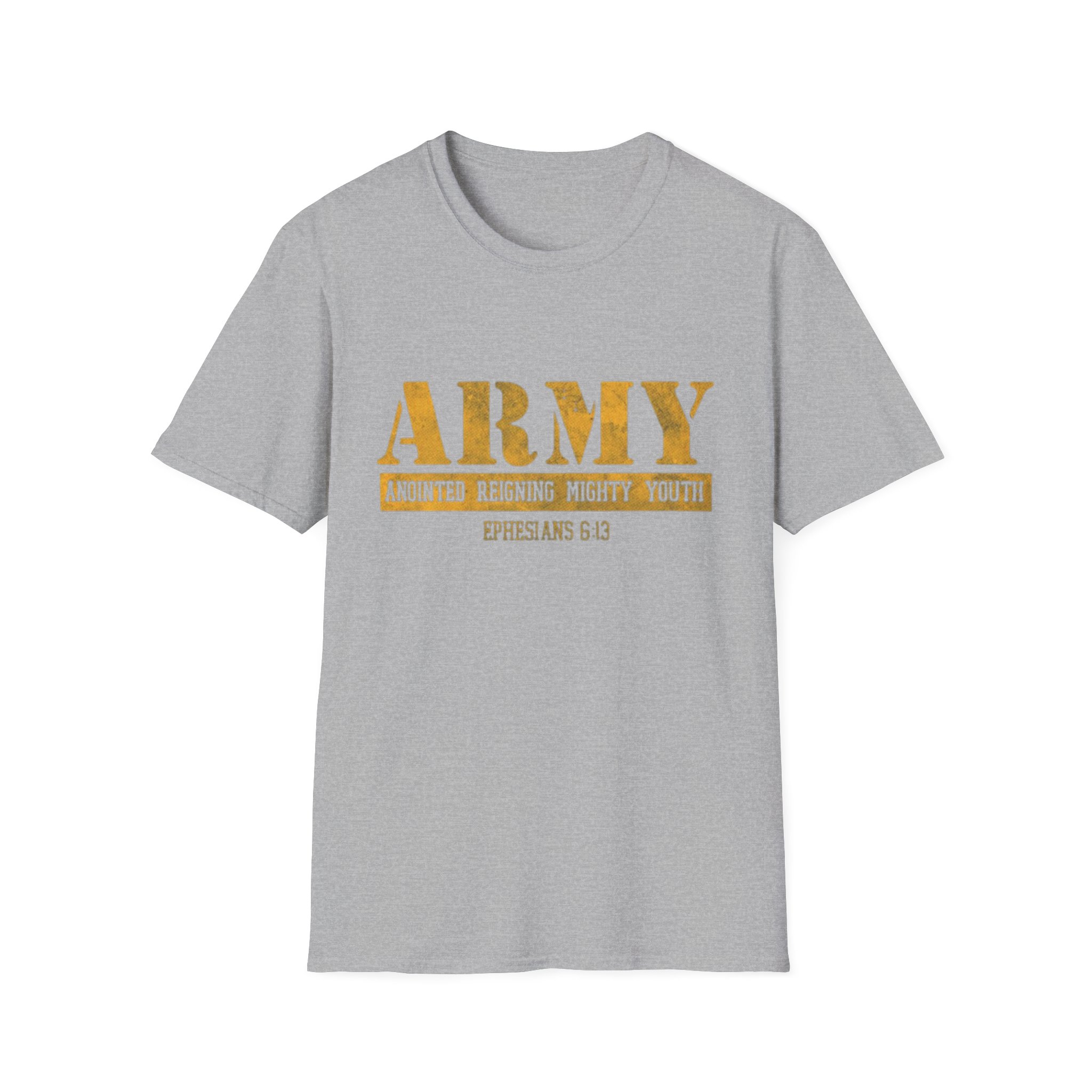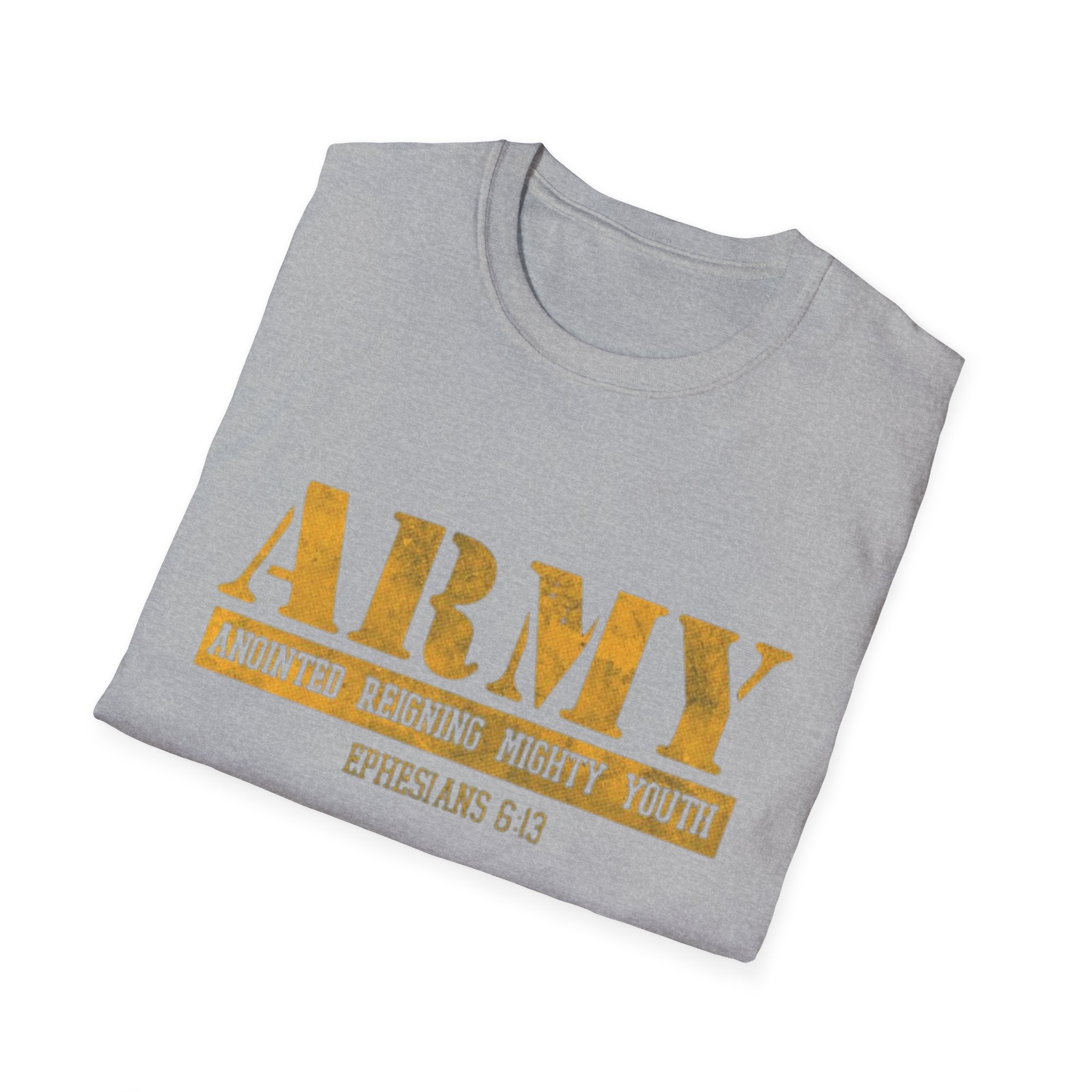 This soft, lightweight tee carries a quiet confidence — a clean white canvas with a distressed gold “ARMY” block across the chest and a small scripture reference beneath. The worn-gold print feels lived-in, like a favorite emblem worn during Sunday service, outreach days, or casual meetups with the youth group. It sits comfortably at the shoulder and hangs in a classic, relaxed way that moves with you, not against you. Wear it to lead worship, volunteer at community events, or just run errands while representing faith and fellowship with subtle strength.