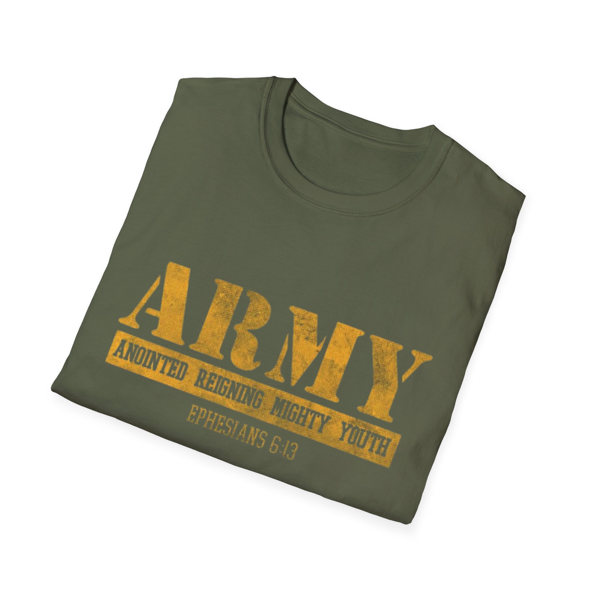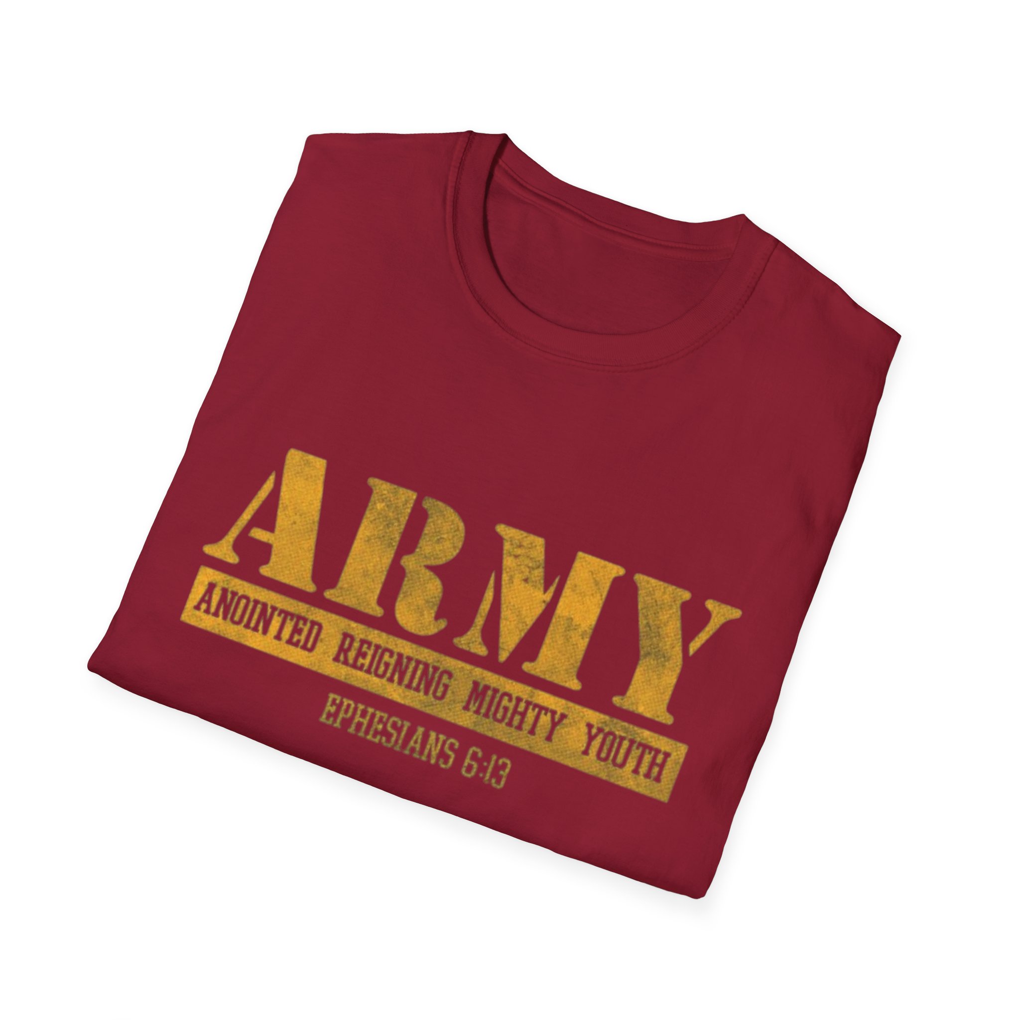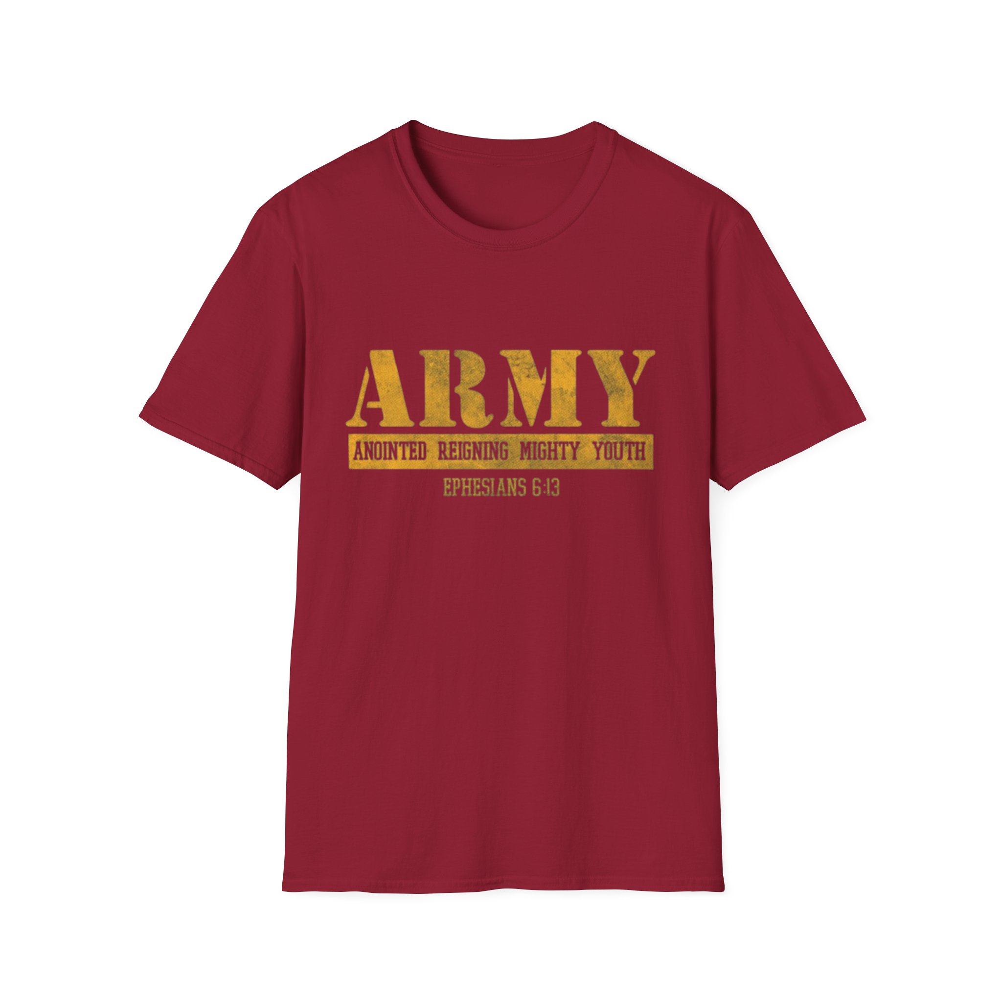 This soft, lightweight tee carries a quiet confidence — a clean white canvas with a distressed gold “ARMY” block across the chest and a small scripture reference beneath. The worn-gold print feels lived-in, like a favorite emblem worn during Sunday service, outreach days, or casual meetups with the youth group. It sits comfortably at the shoulder and hangs in a classic, relaxed way that moves with you, not against you. Wear it to lead worship, volunteer at community events, or just run errands while representing faith and fellowship with subtle strength.