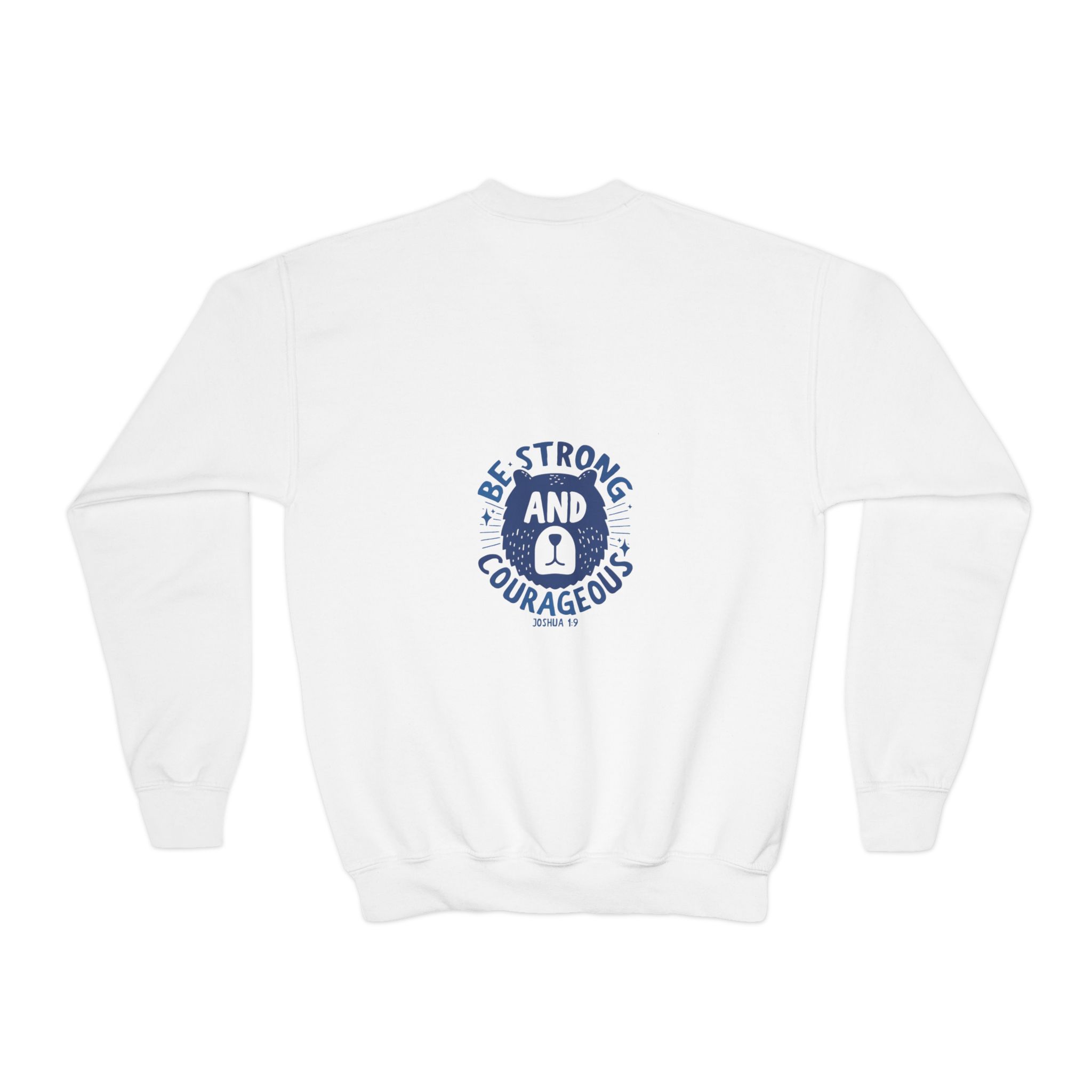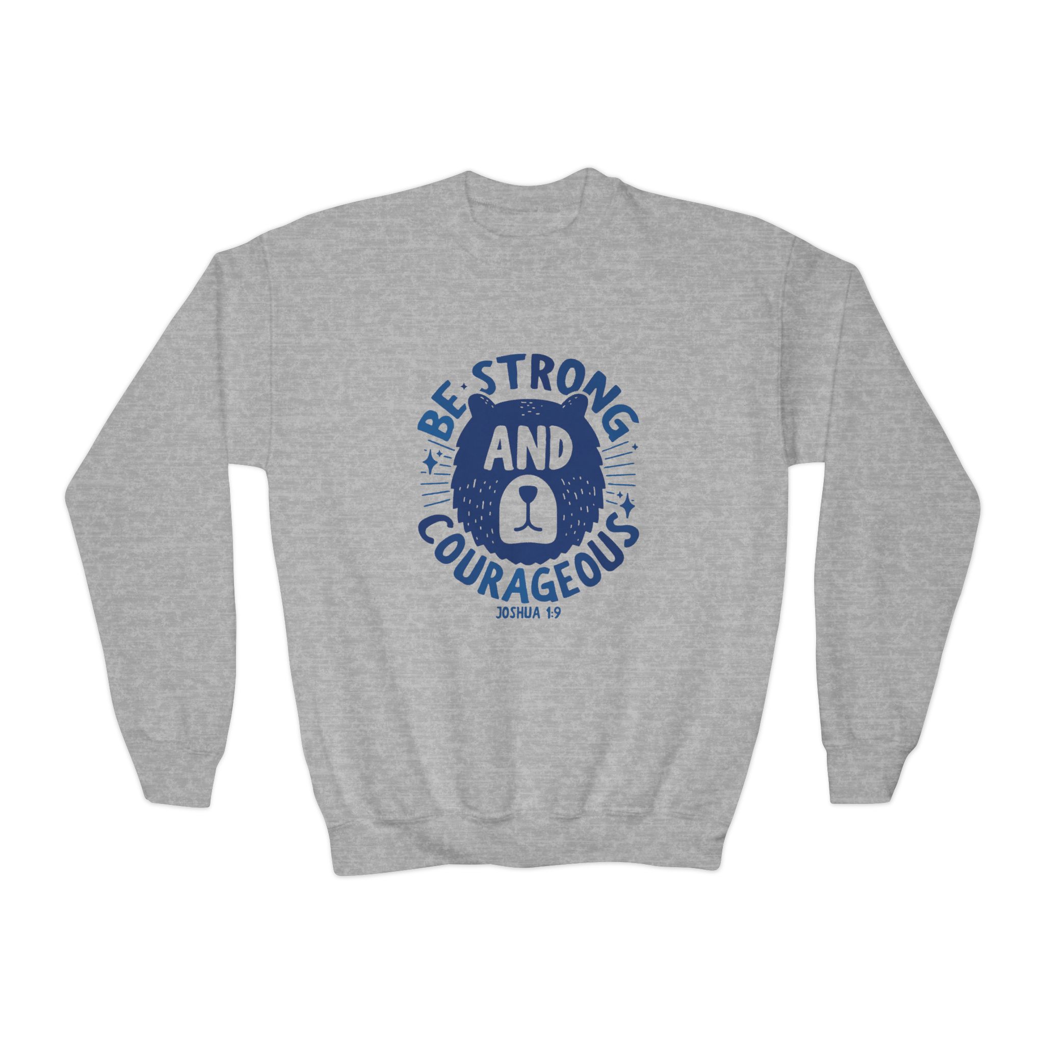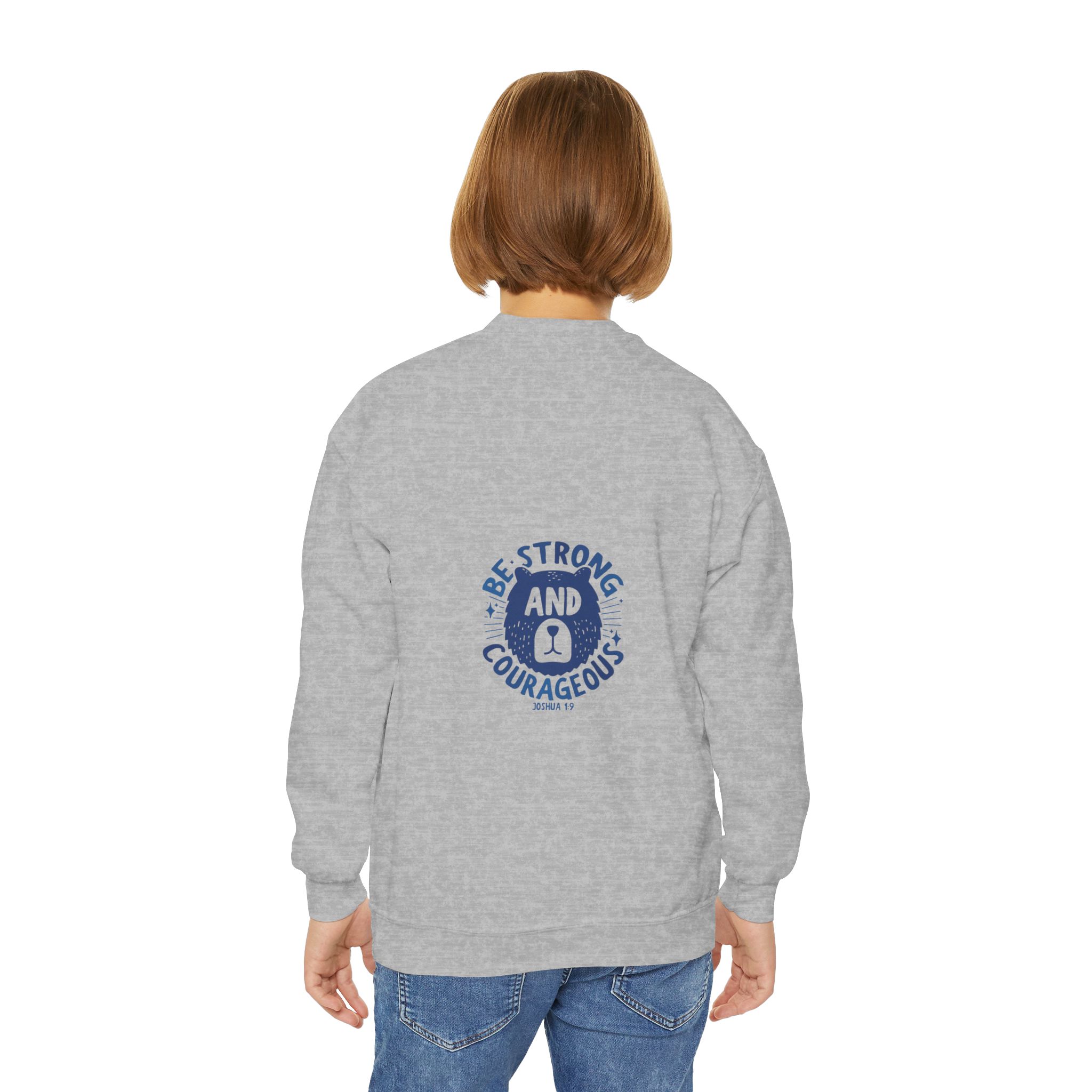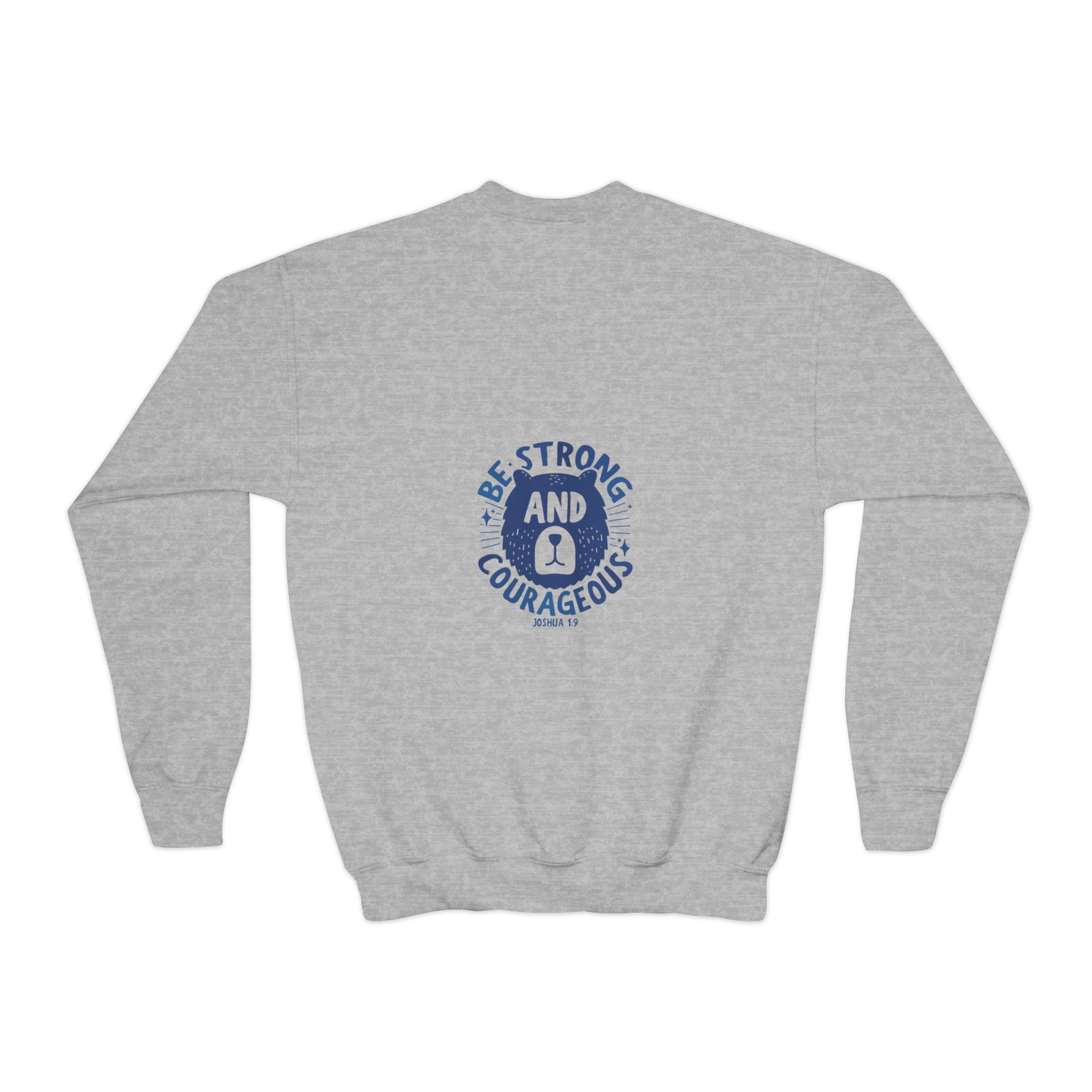 A cozy, sturdy crewneck that carries quiet confidence. This youth sweatshirt pairs a soft, medium-heavy knit with a vintage-style emblem reading “Be Strong and Courageous,” rendered in worn navy ink. The loose fit and ribbed collar make it easy to layer over hoodies or tees, while the tubular knit construction keeps the silhouette clean and minimizes waste. It’s the kind of sweatshirt a kid reaches for on chilly mornings before school, on weekend park adventures, or when they need a little extra reassurance during big moments. Embroidery options on the left or center chest add texture and durability to the design, and the tear-away label keeps things comfortable against growing skin.