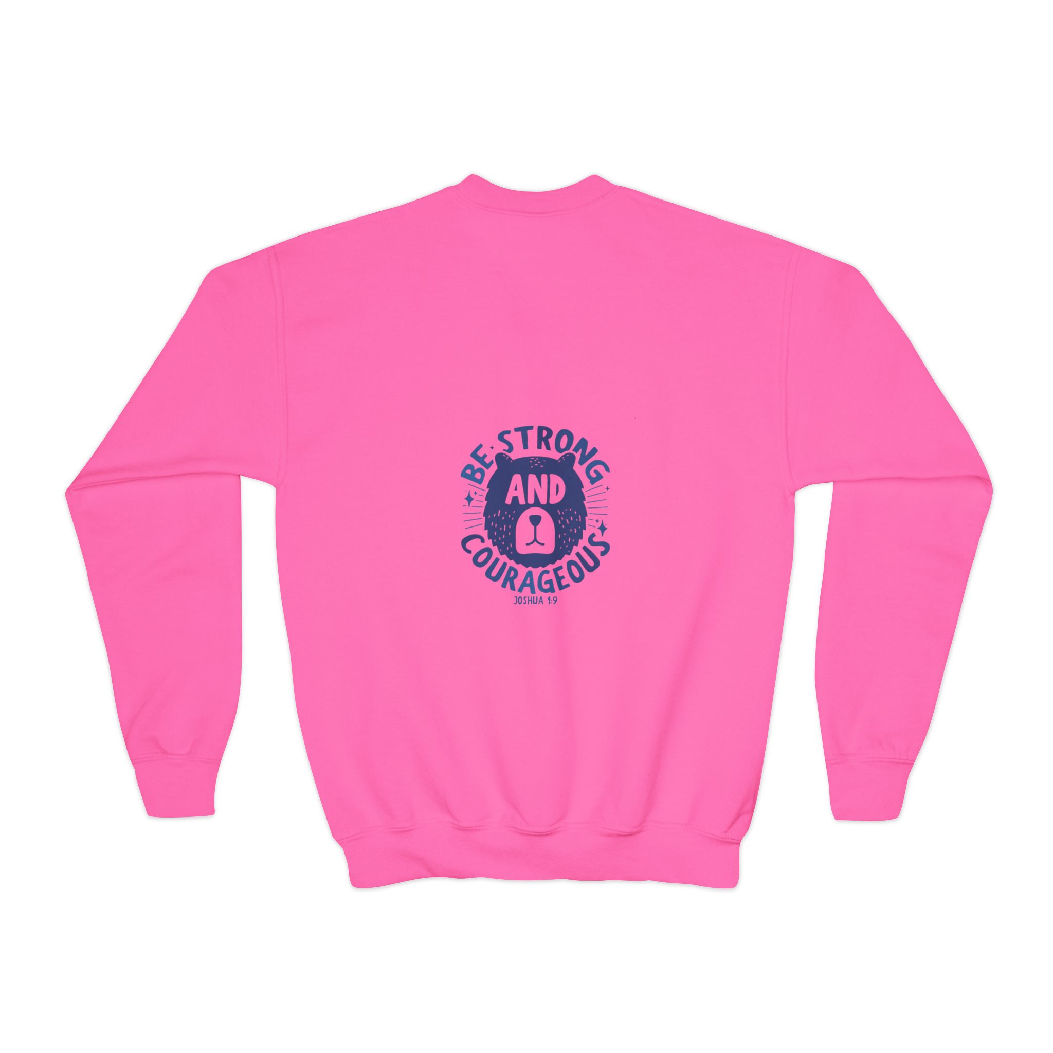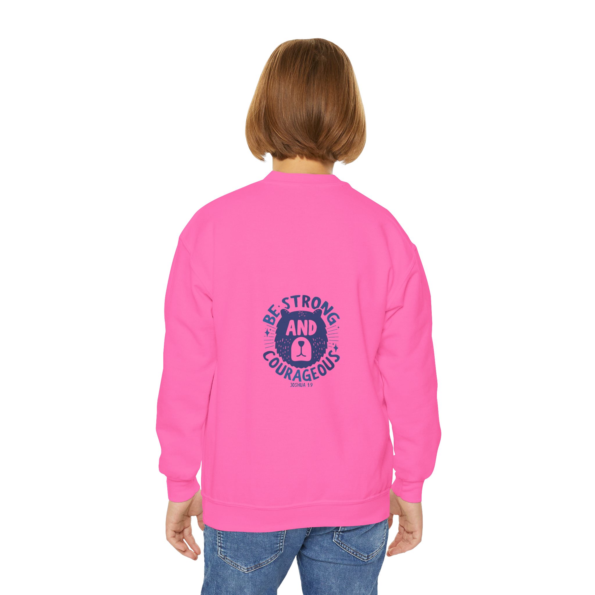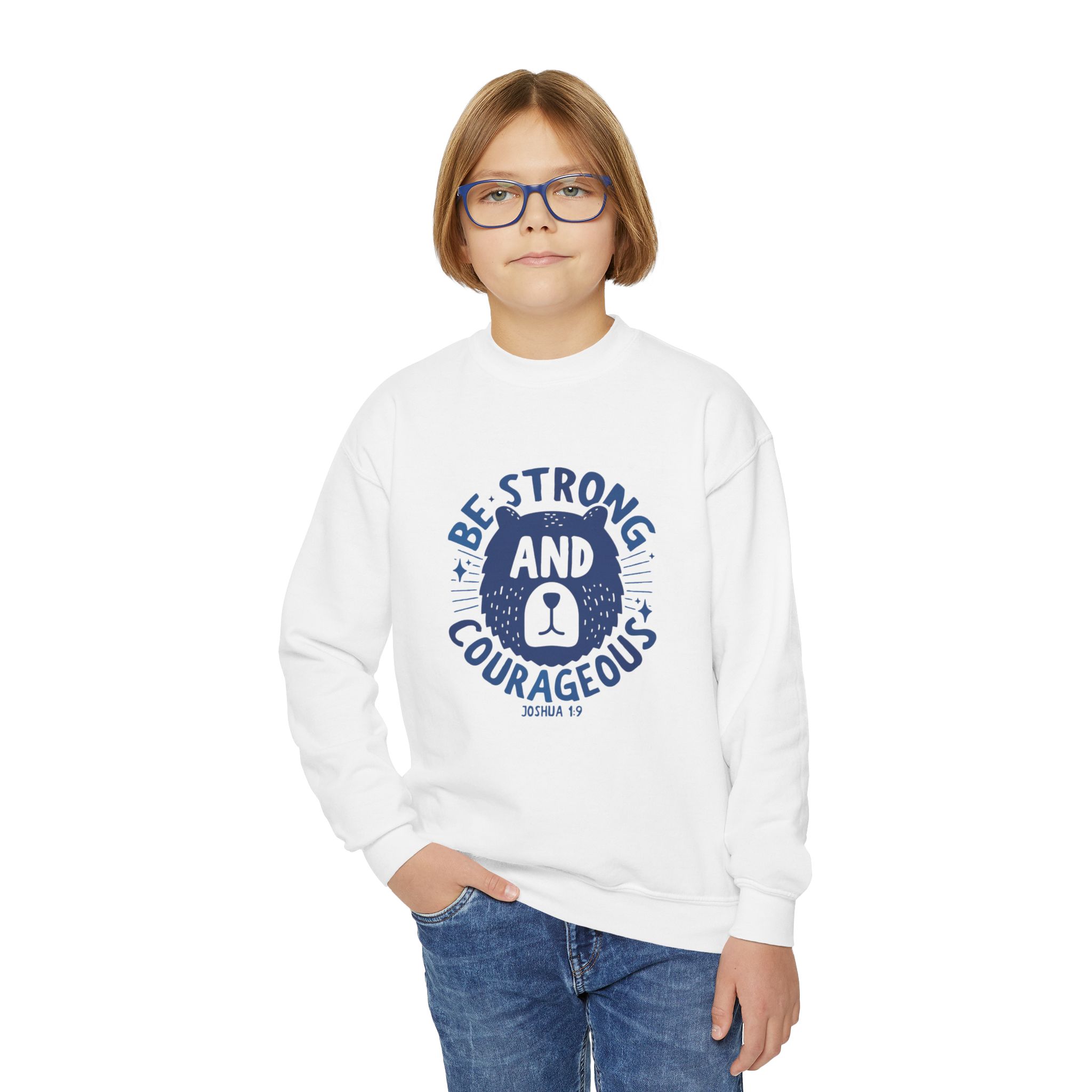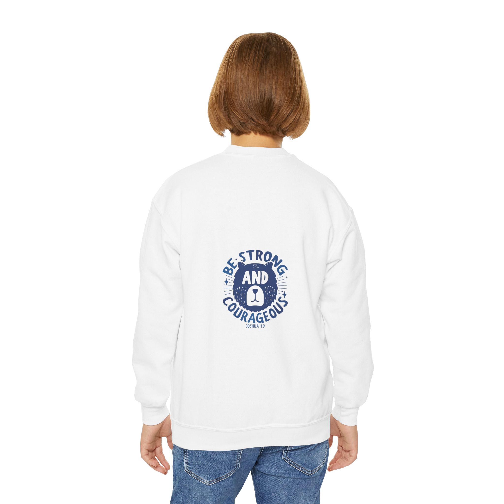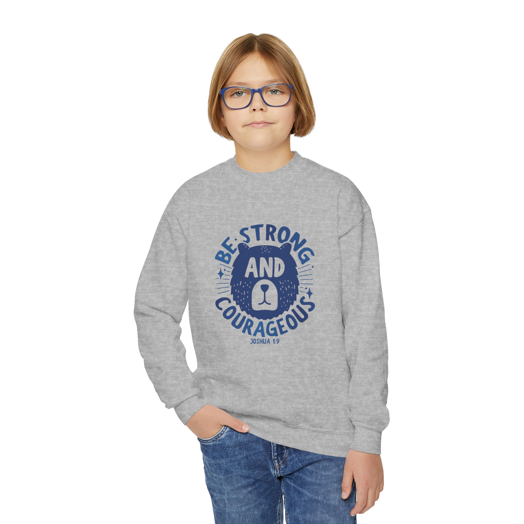 A cozy, sturdy crewneck that carries quiet confidence. This youth sweatshirt pairs a soft, medium-heavy knit with a vintage-style emblem reading “Be Strong and Courageous,” rendered in worn navy ink. The loose fit and ribbed collar make it easy to layer over hoodies or tees, while the tubular knit construction keeps the silhouette clean and minimizes waste. It’s the kind of sweatshirt a kid reaches for on chilly mornings before school, on weekend park adventures, or when they need a little extra reassurance during big moments. Embroidery options on the left or center chest add texture and durability to the design, and the tear-away label keeps things comfortable against growing skin.