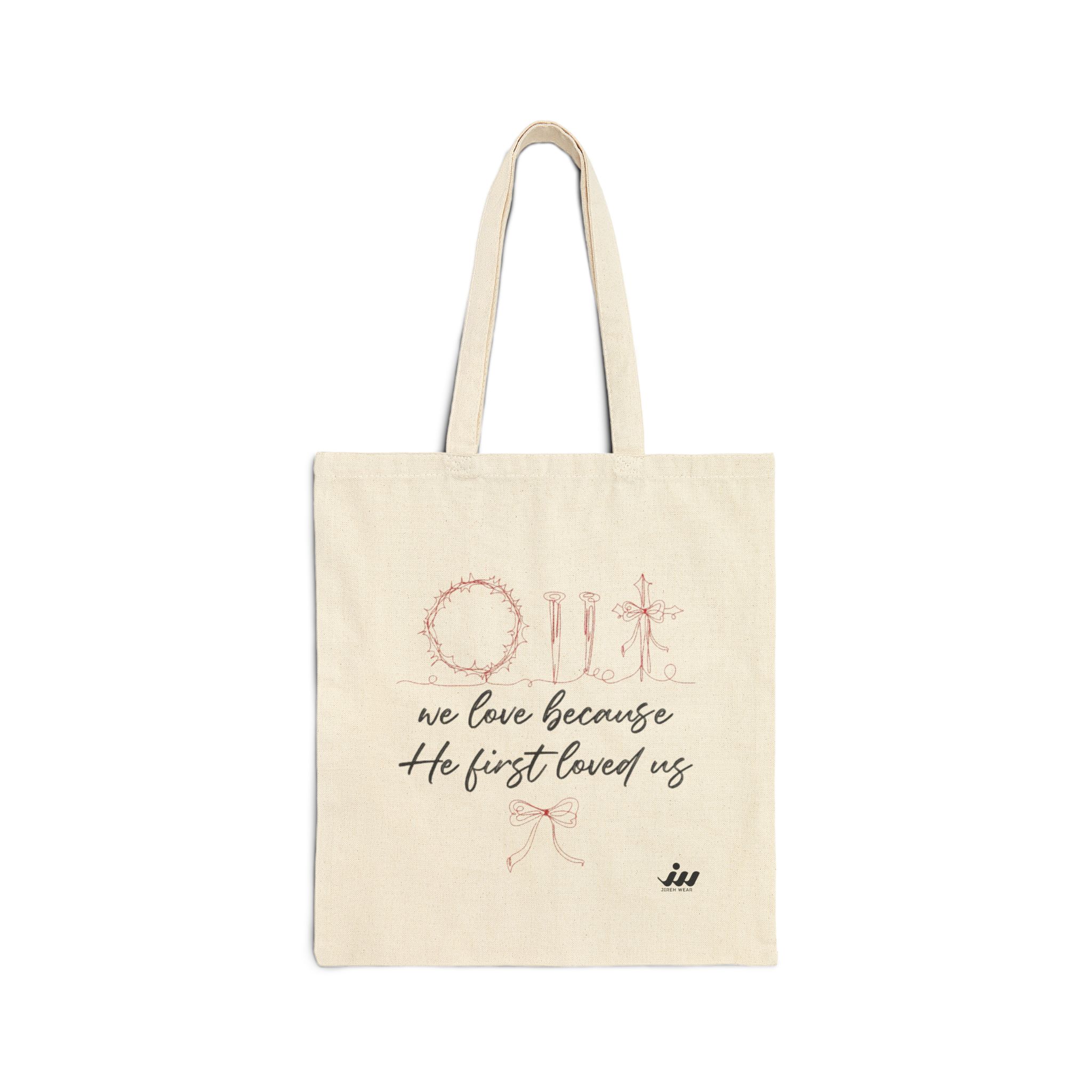 Light, honest, and made to carry the little things that matter. This sturdy cotton canvas tote wears its message with a quiet confidence: a soft, hand-drawn wreath and subtle script that reads “we love because He first loved us.” The natural canvas ground and muted ink feel like a page from a journal — calm, contemplative, and real. It slips over the shoulder for market runs, bible study nights, or a walk to the coffee shop, folding flat when you need to tuck it into a bag. The heavy 12 oz fabric and reinforced handles mean it moves through daily life without fuss, while the sewn-in label and clean construction keep the look simple and sincere.