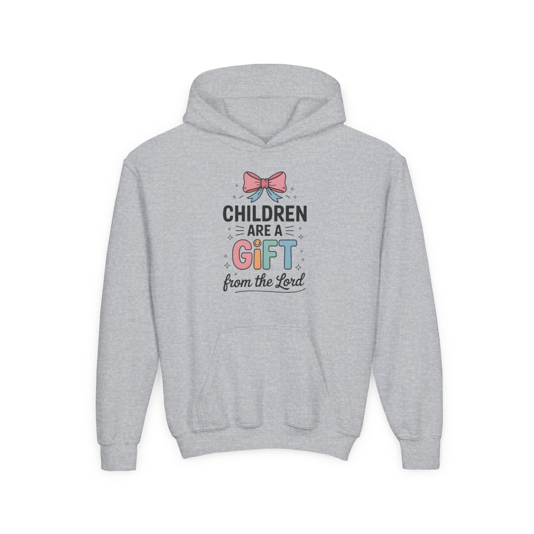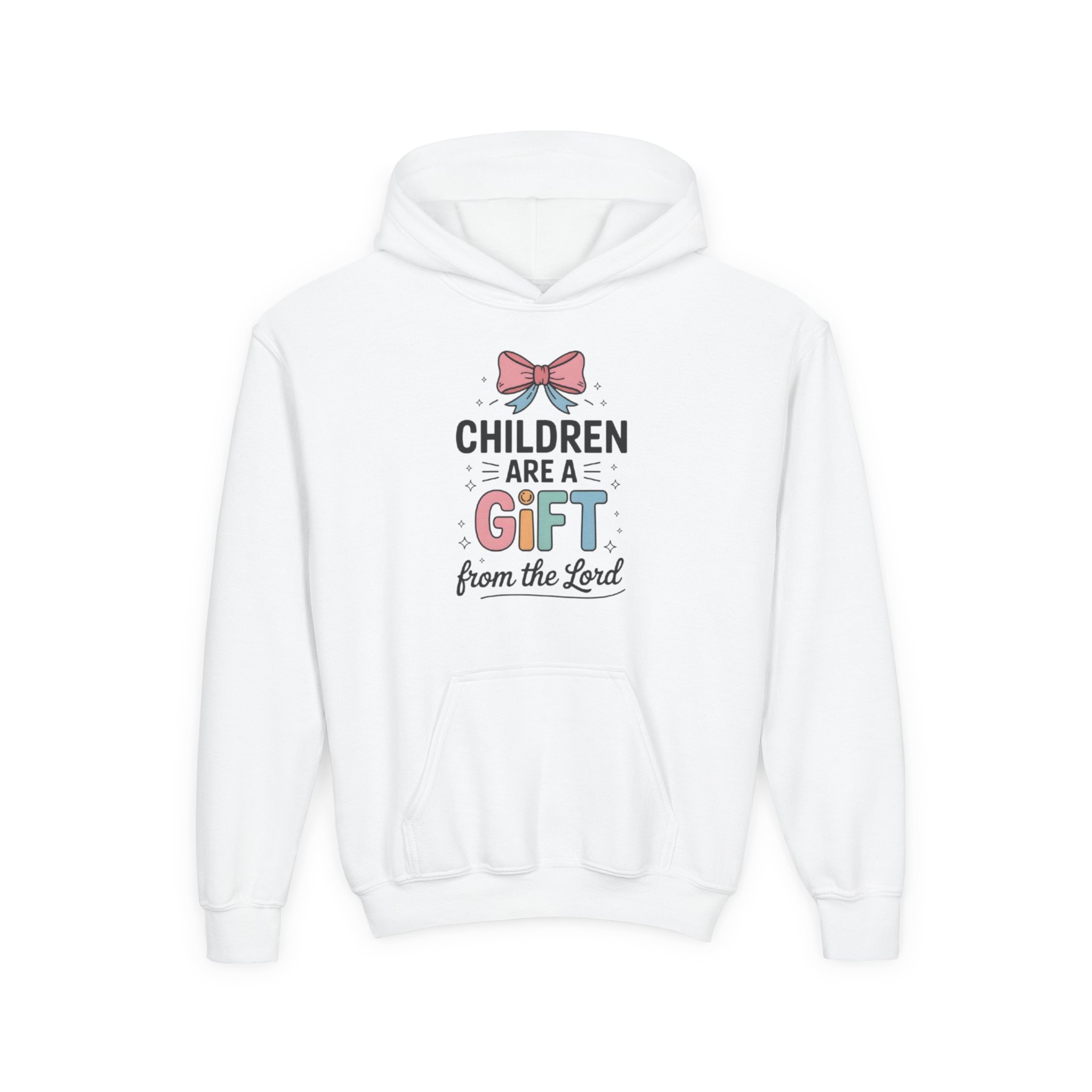 Soft, cozy, and quietly joyful — this youth hoodie carries a gentle message for little ones and the families who love them. A sweet bow and playful lettering read “Children are a gift from the Lord,” rendered in soft pastels that feel warm and tender on the chest. The medium-weight fabric holds shape and color through playtime and wash, while the roomy kangaroo pocket keeps small hands warm. Subtle wrist prints and the option for embroidered chest detail add a handcrafted touch that makes this hoodie feel personal and cared-for. Thoughtfully made and safety-tested, it’s a comforting layer for church mornings, family gatherings, nursery moments, or simply everyday wear that celebrates faith and childhood.