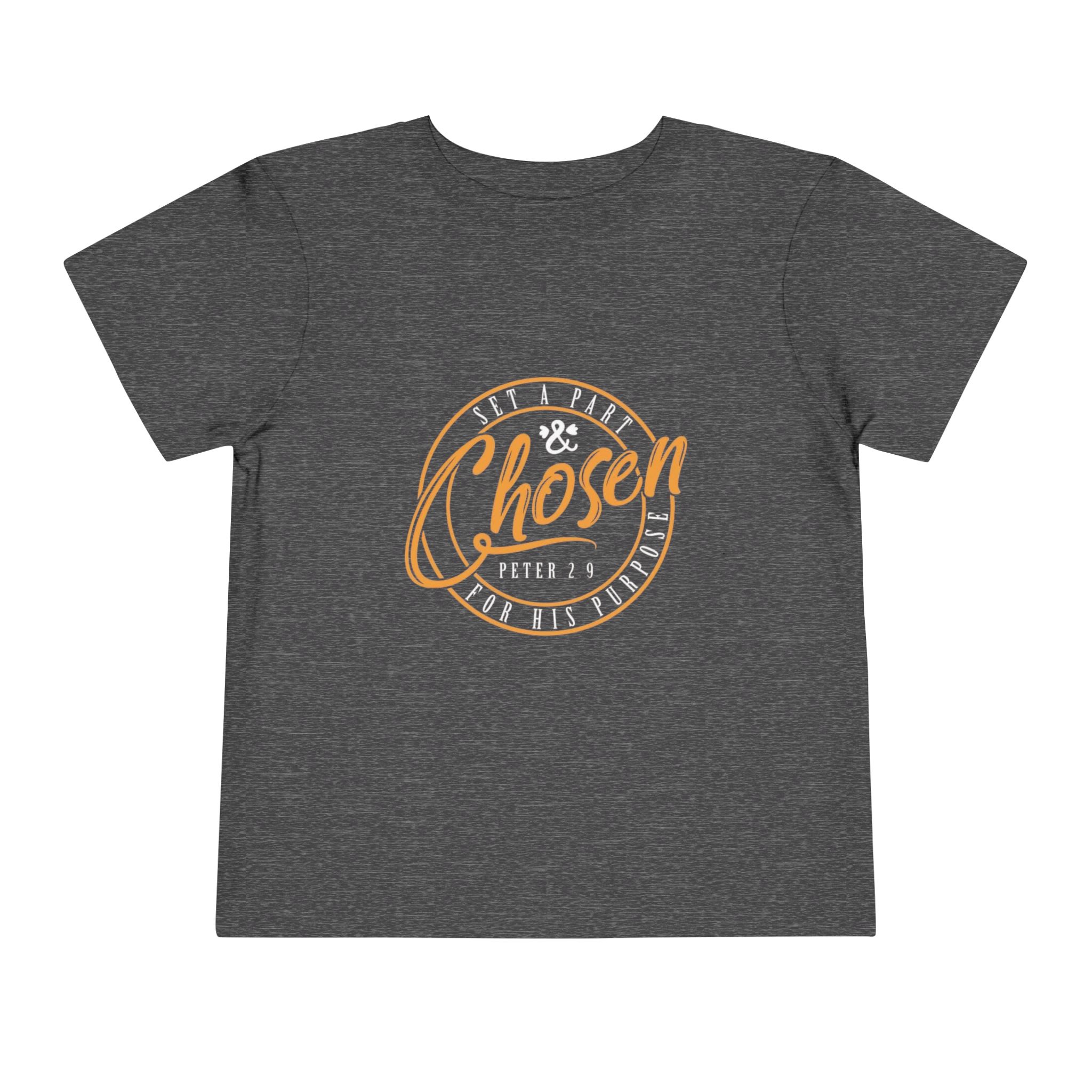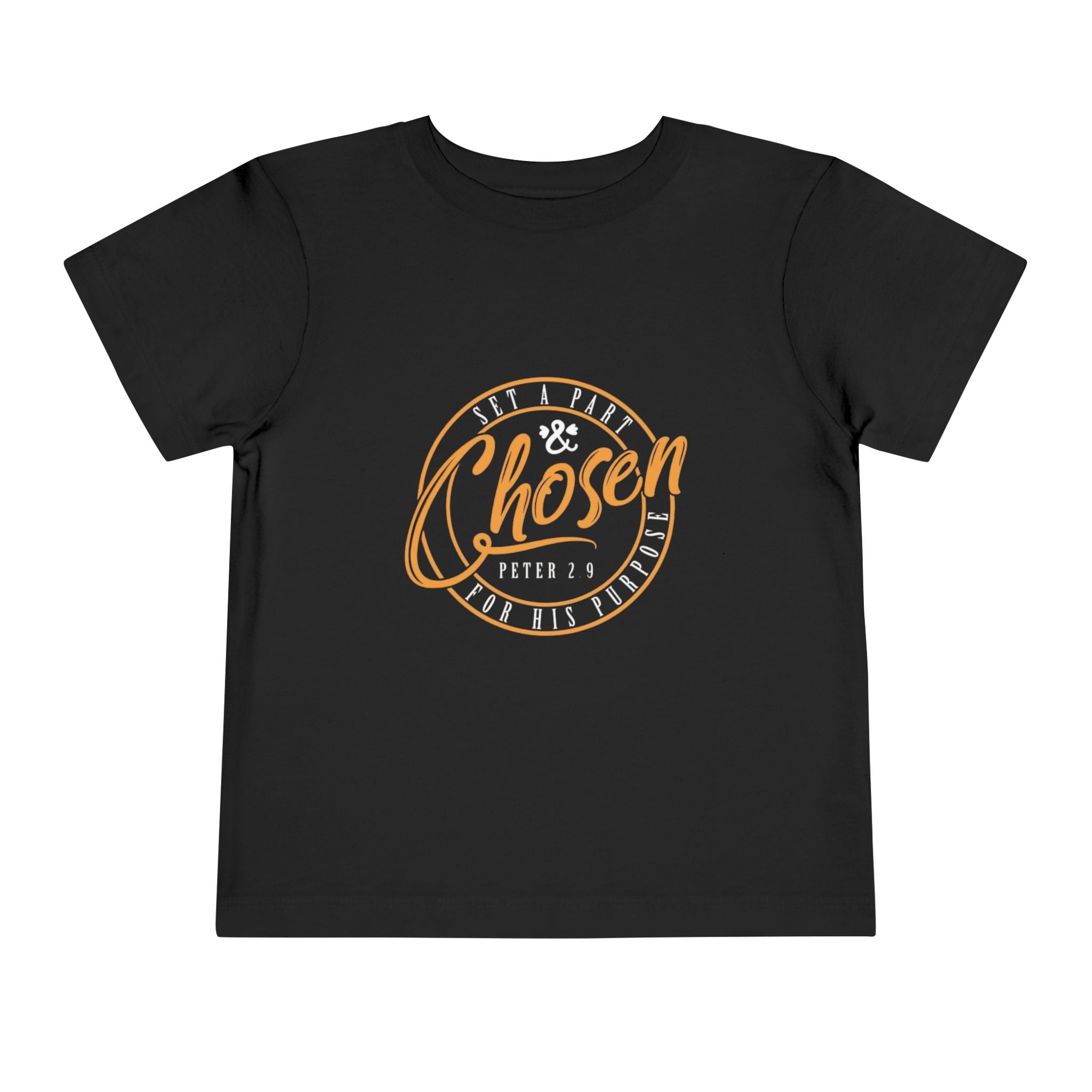 Soft, lightweight toddler tee with a warm, hand-lettered faith-inspired design that reads “Chosen” with a subtle verse reference. The vintage-inspired badge graphic in warm gold tones sits centered on a smooth black background, giving quiet confidence without being loud. Breathable airlume combed cotton keeps little ones comfortable for playtime, story time, and church Sundays. Side seams keep the shape through washes. The tear-away label prevents irritation so sensitive necks stay happy.