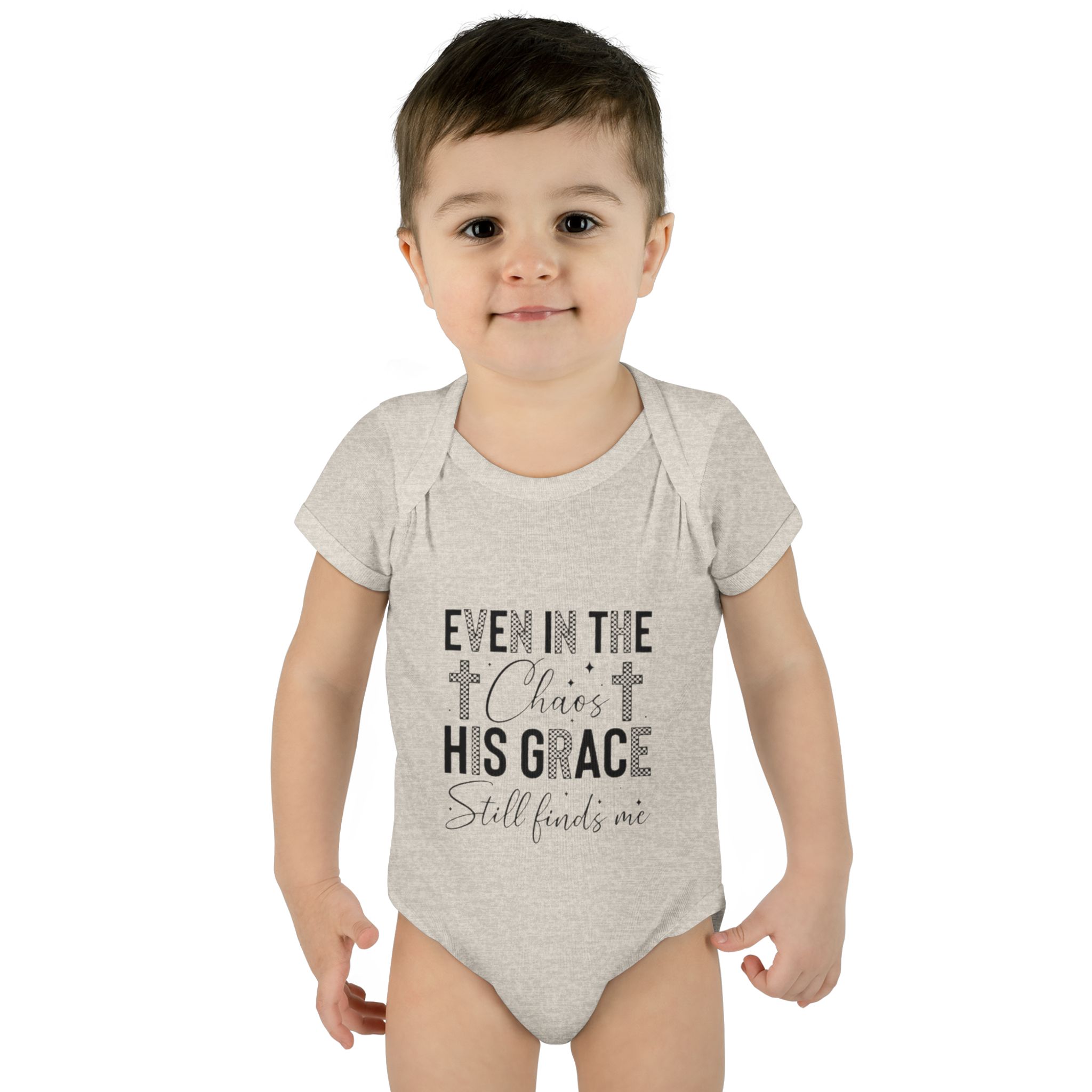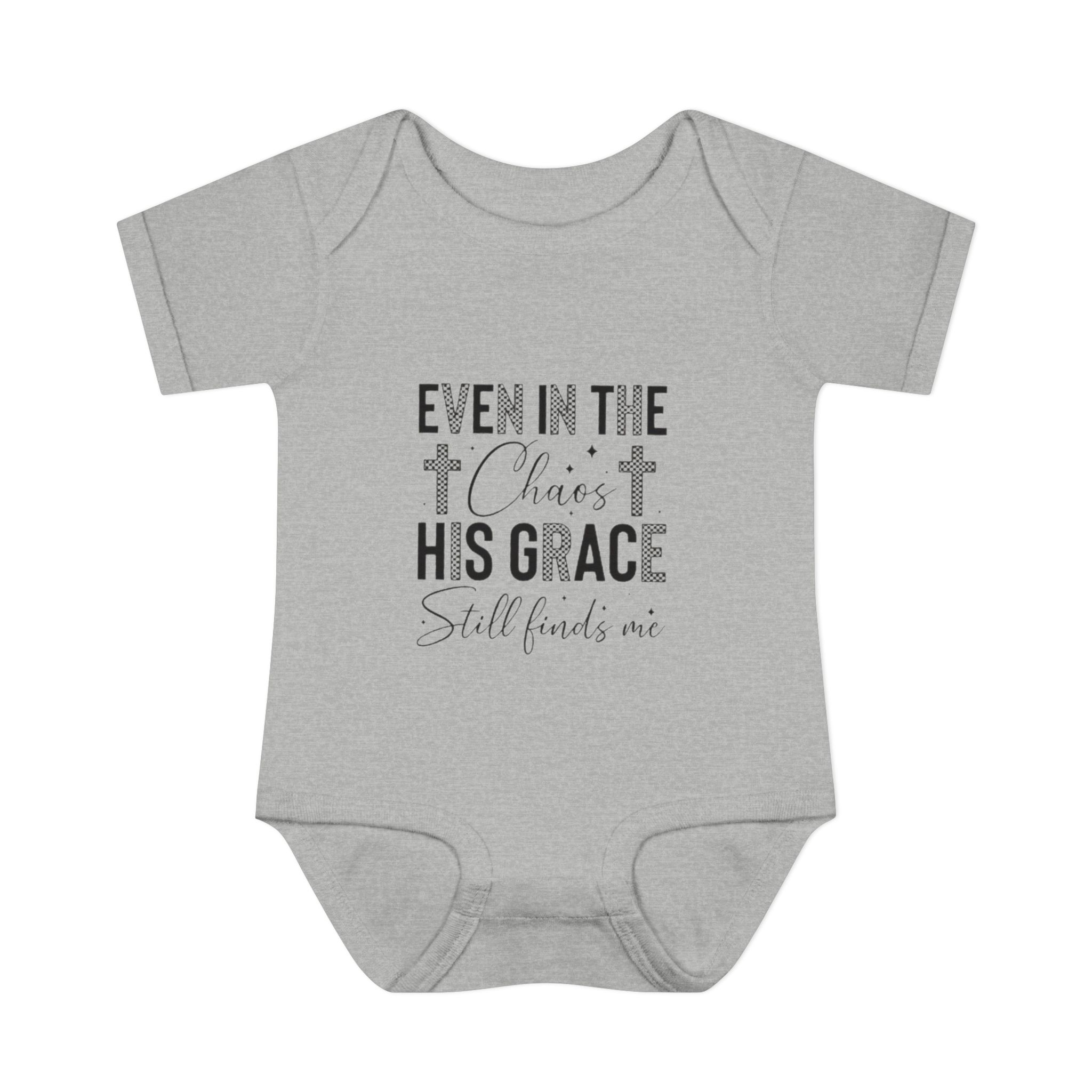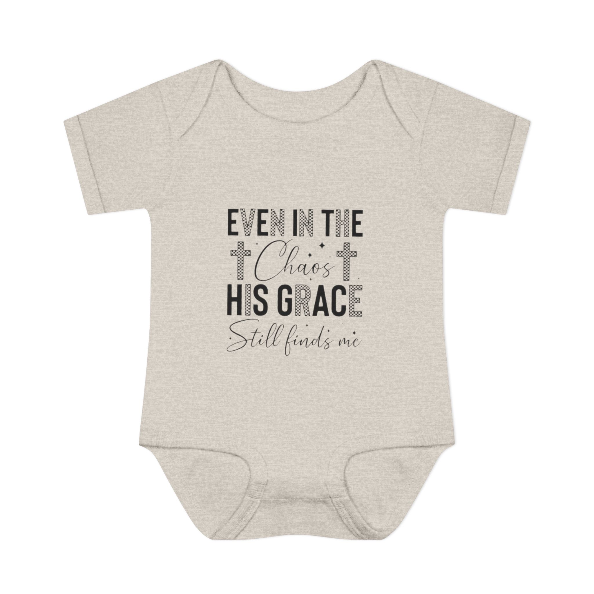 Soft, simple, and quietly comforting — this infant rib bodysuit carries a gentle message of faith: “Even in the chaos His grace still finds me.” Lightweight rib knit keeps the shape while the lap shoulder and three-snap closure make quick changes calm and easy. Subtle neutral print blends with nursery tones and layers well under sweaters or blankets. It’s made to hold up to cuddles and washes, with neat double-needle bindings and a tear-away label so nothing distracts from cuddles. Let this little piece be a small, steady reminder of peace during busy days and quiet nights.