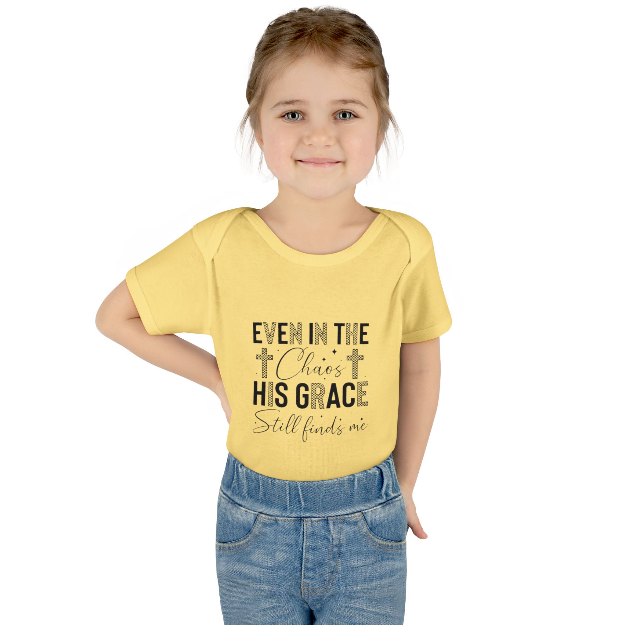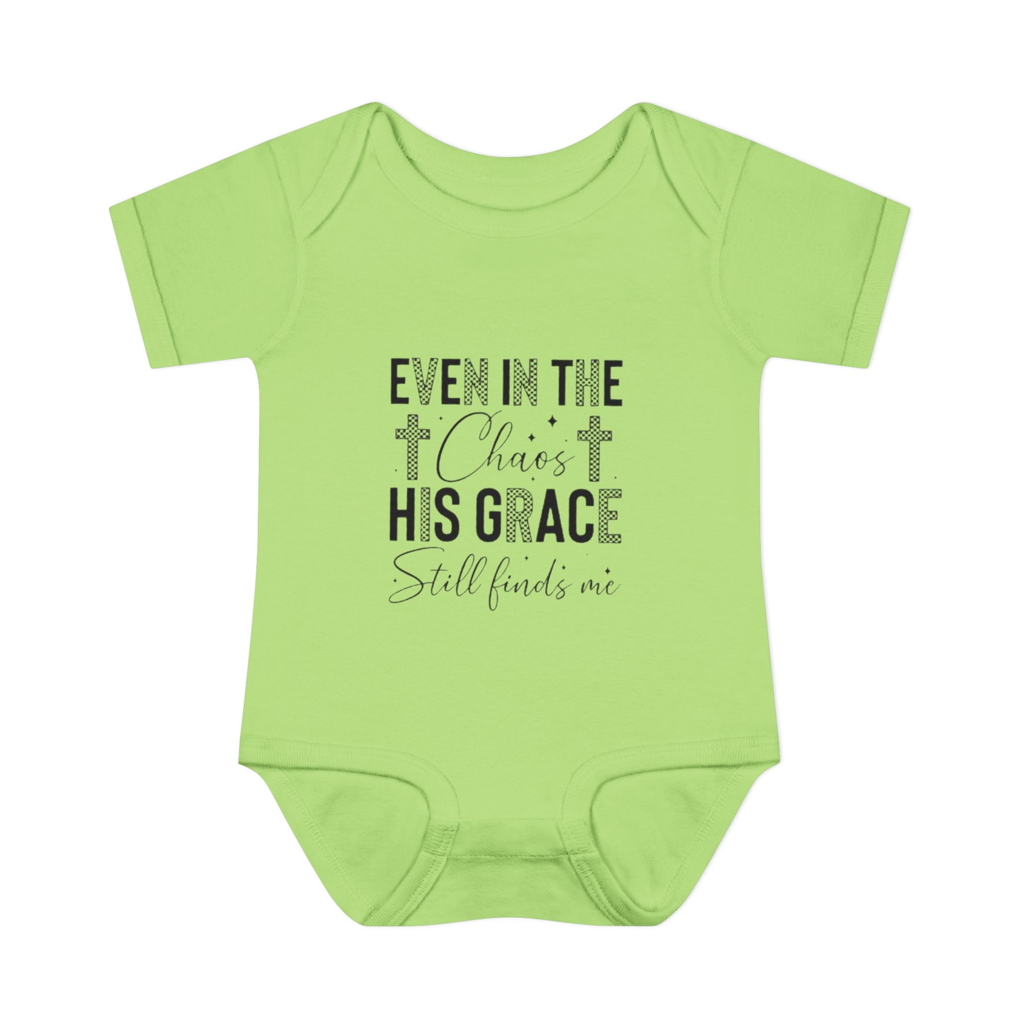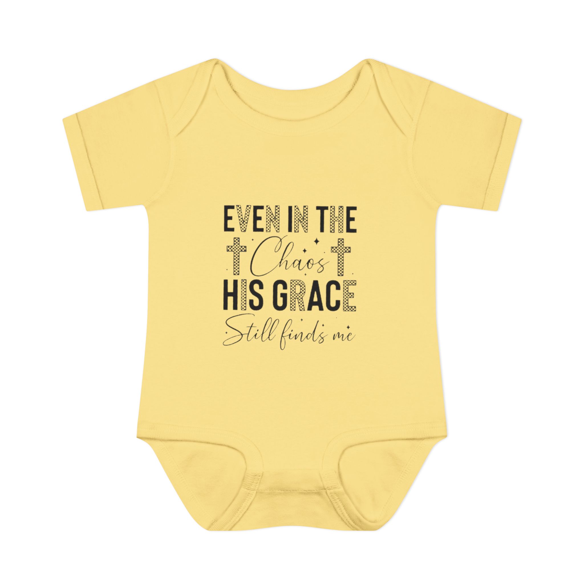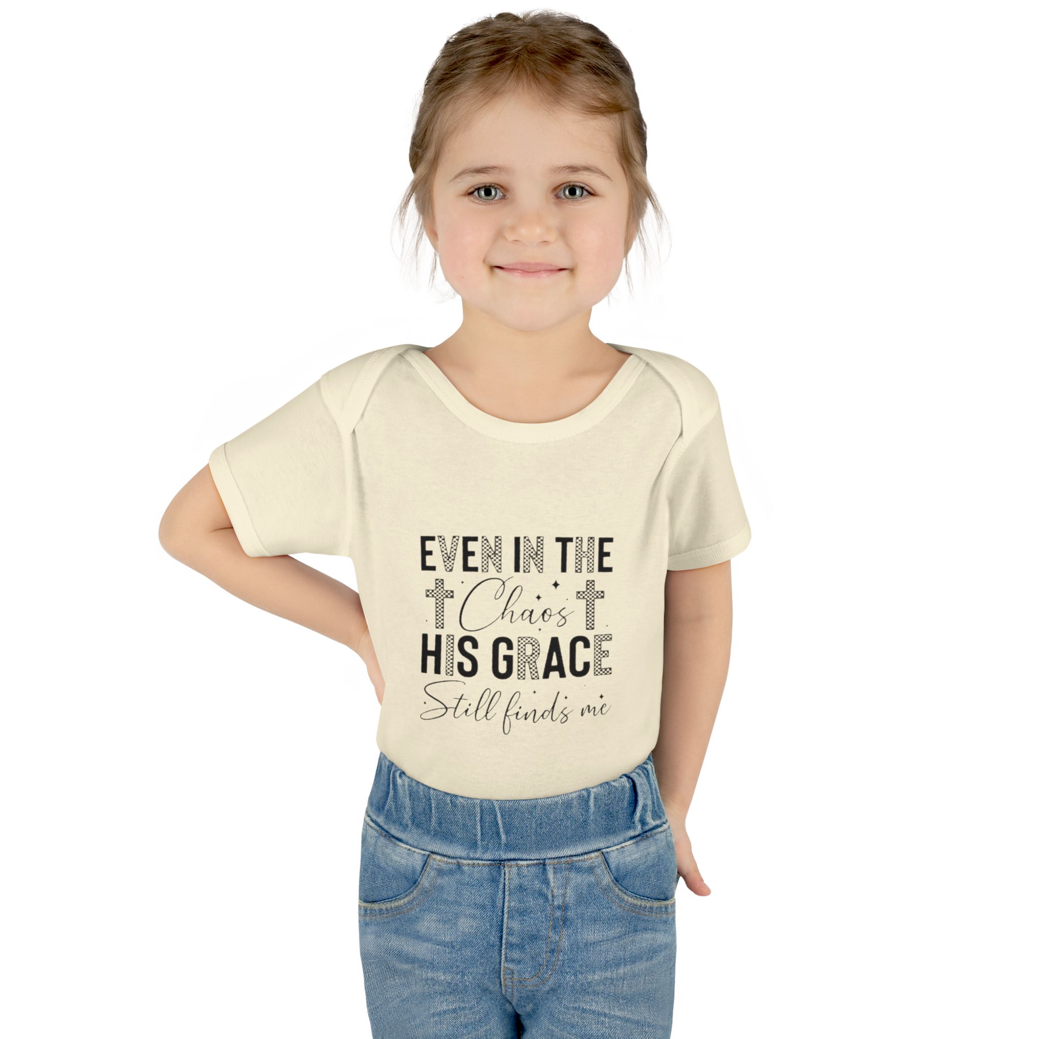 Soft, simple, and quietly comforting — this infant rib bodysuit carries a gentle message of faith: “Even in the chaos His grace still finds me.” Lightweight rib knit keeps the shape while the lap shoulder and three-snap closure make quick changes calm and easy. Subtle neutral print blends with nursery tones and layers well under sweaters or blankets. It’s made to hold up to cuddles and washes, with neat double-needle bindings and a tear-away label so nothing distracts from cuddles. Let this little piece be a small, steady reminder of peace during busy days and quiet nights.