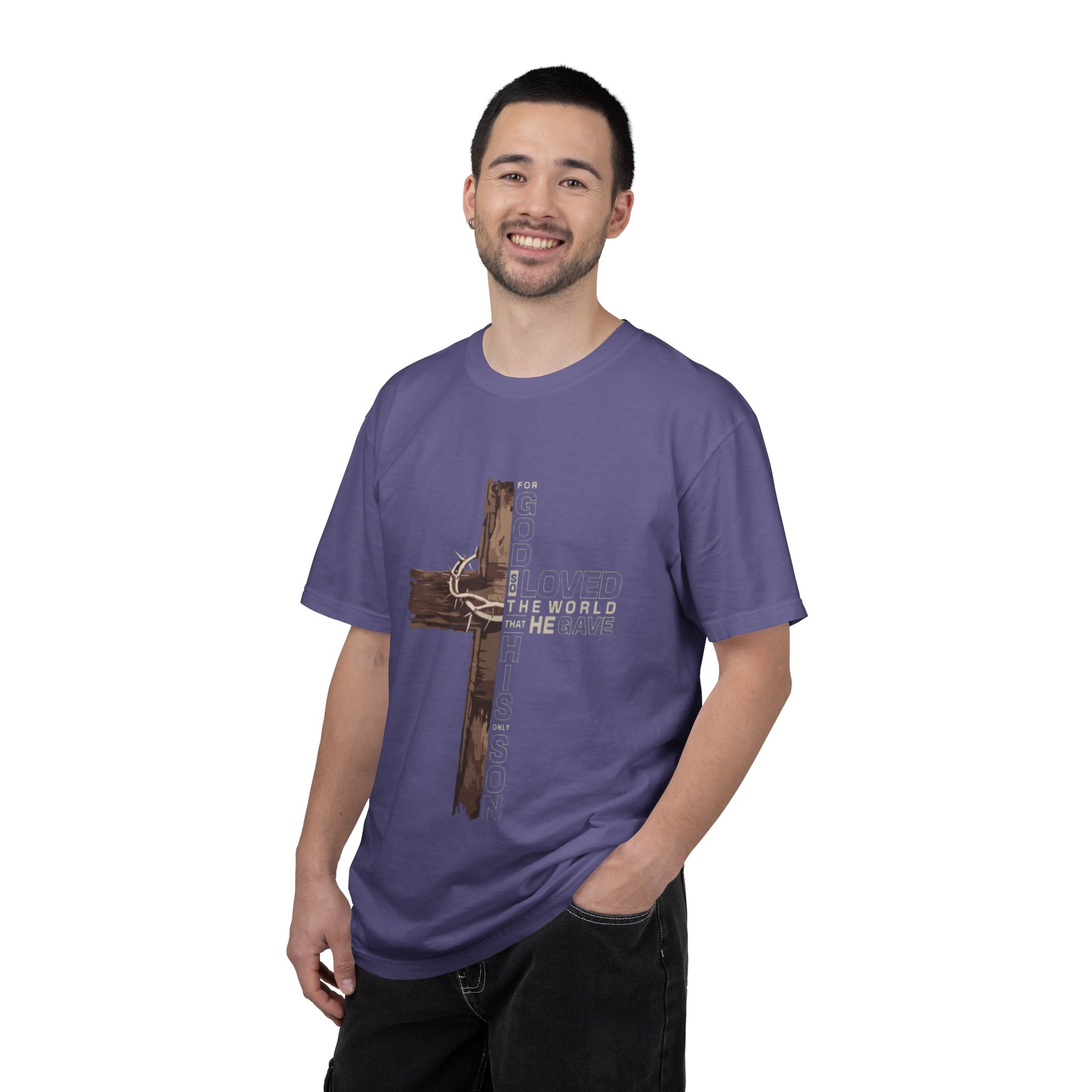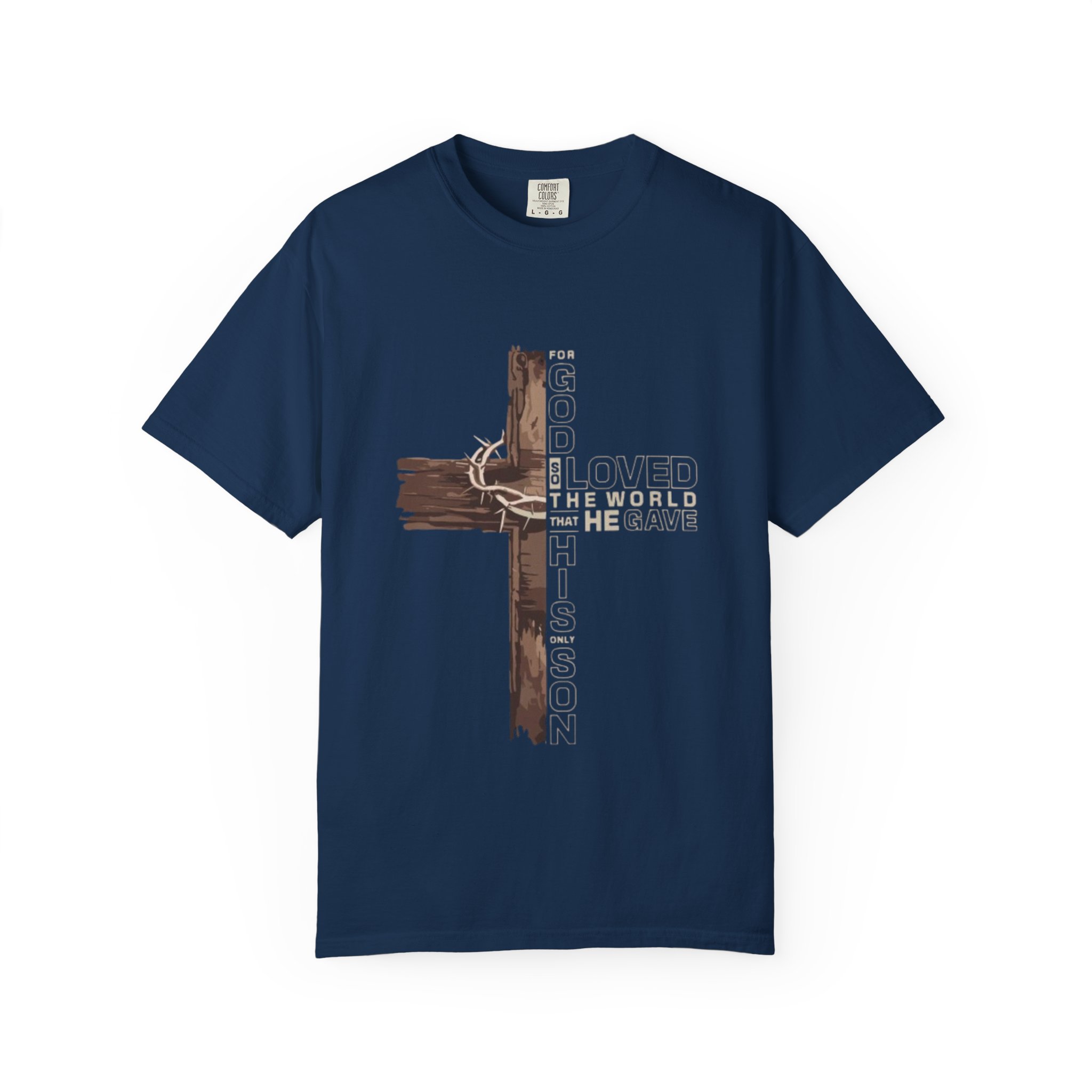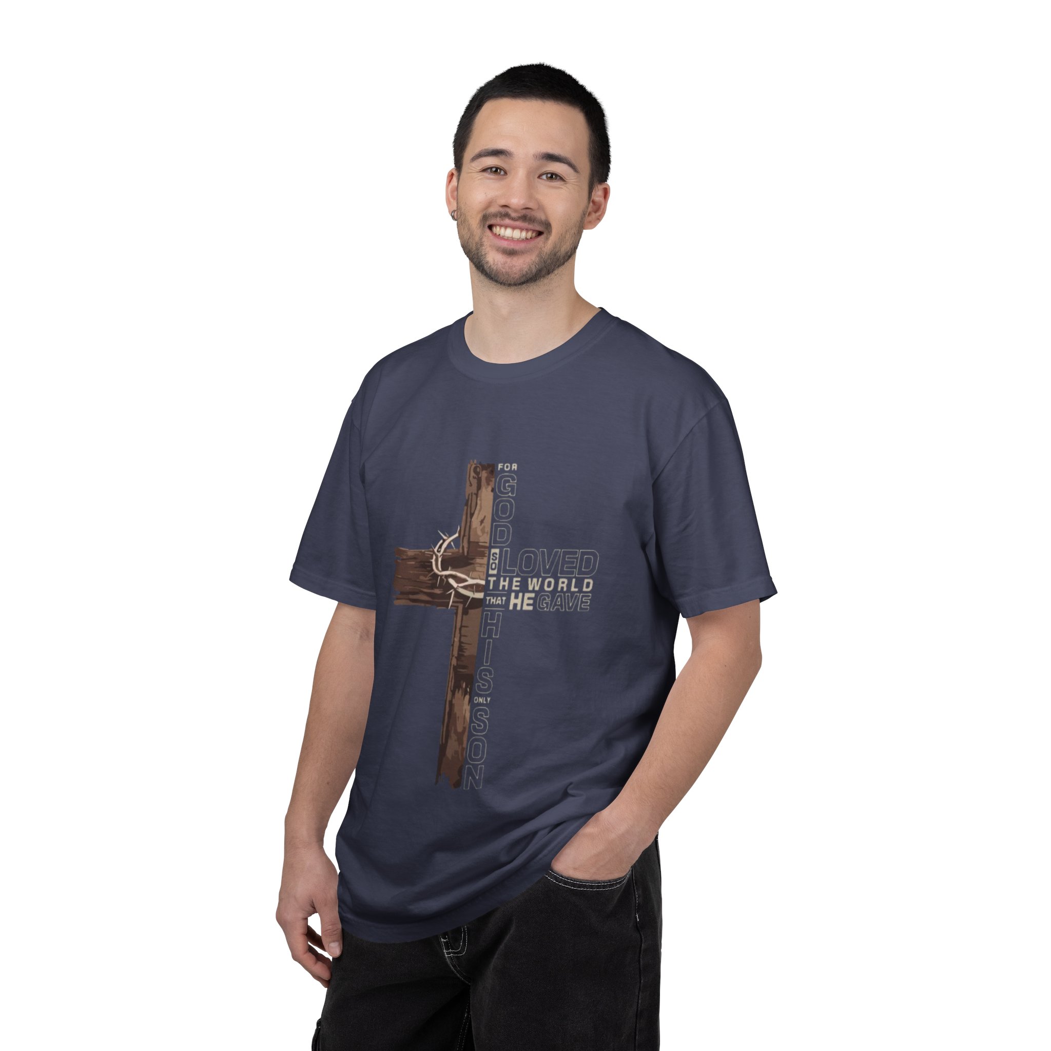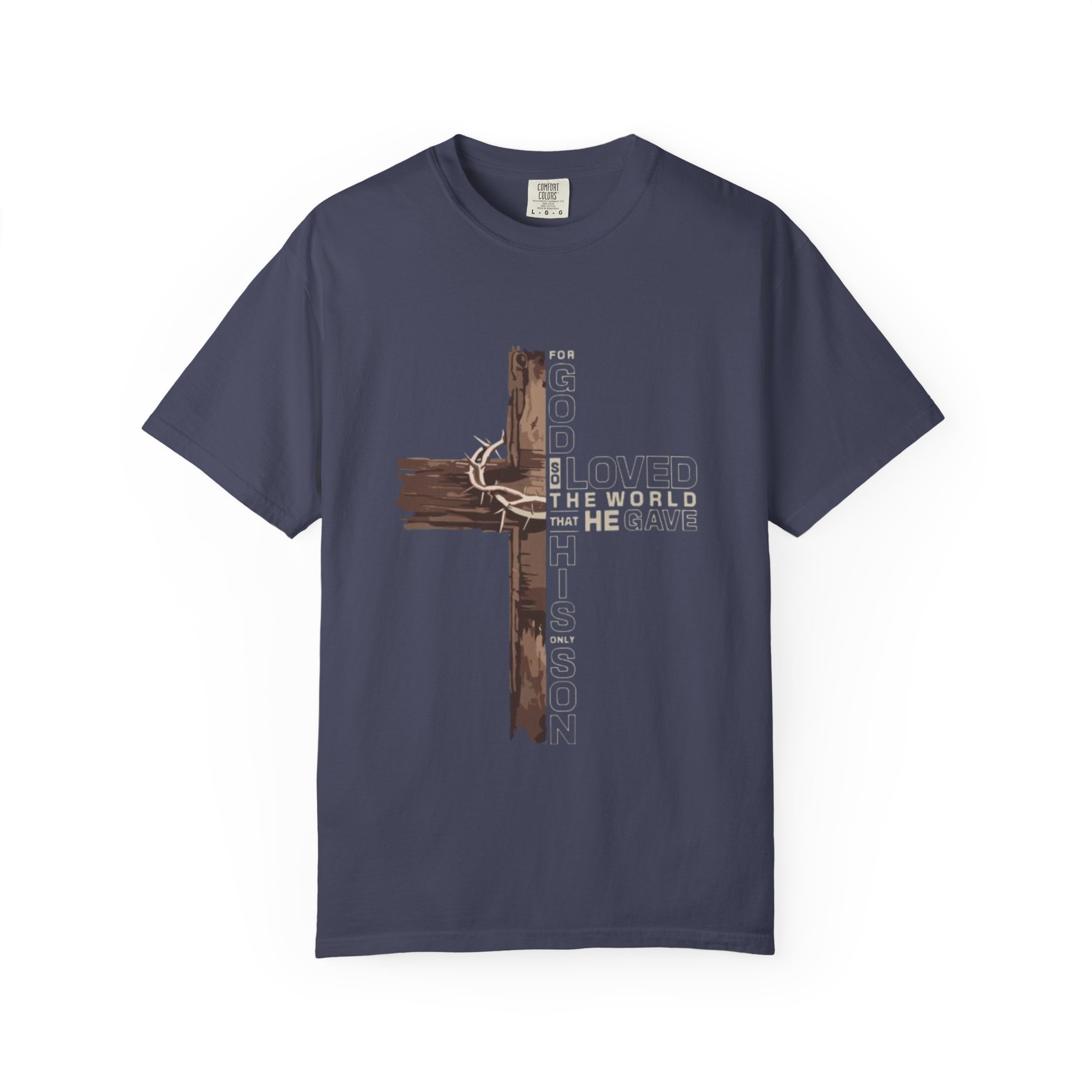 This garment-dyed tee carries a quiet, faith-rooted statement — a rustic wooden cross wrapped in a crown of thorns, with the layered text of John 3:16 woven into the design. The heavyweight, relaxed silhouette feels lived-in from the first wear: soft, slightly faded color and a pillowy hand that comes from dyeing after construction. Wear it to small group meetings, volunteer days, or slow Sundays when you want your faith to speak softly but steadily. The muted navy shown here pairs easily with worn denim, layered flannels, or a cardigan, giving a grounded, understated look that invites conversation without shouting.