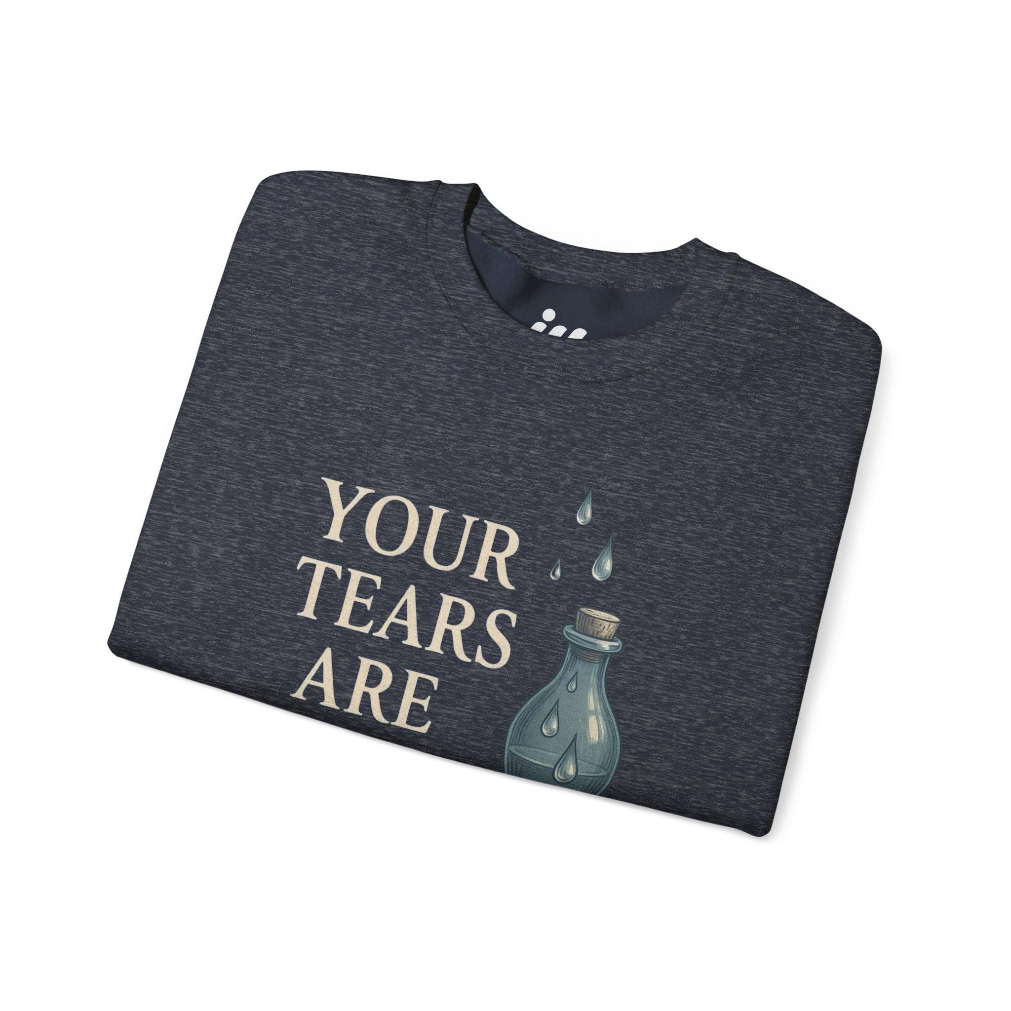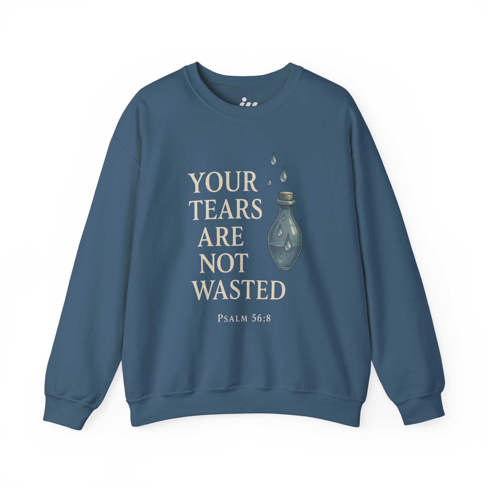Soft, reassuring, and quietly hopeful — this crewneck wraps you in comfort while carrying a gentle message of faith. The matte-black sweatshirt features a calm, hand-drawn vial and falling teardrops beside the words “YOUR TEARS ARE NOT WASTED” with the reference Psalm 56:8. Wear it on slow mornings, after long conversations, or when you need a reminder that grief and gratitude both belong. The medium-heavy 50/50 fabric and classic crewneck silhouette keep the piece feeling lived-in without losing structure. Subtle embroidery options let you add a small stitched detail on the chest or wrists for a tactile, made-by-hand touch. Ethically sourced cotton and OEKO-TEX dyes mean you can trust the materials as much as the message.