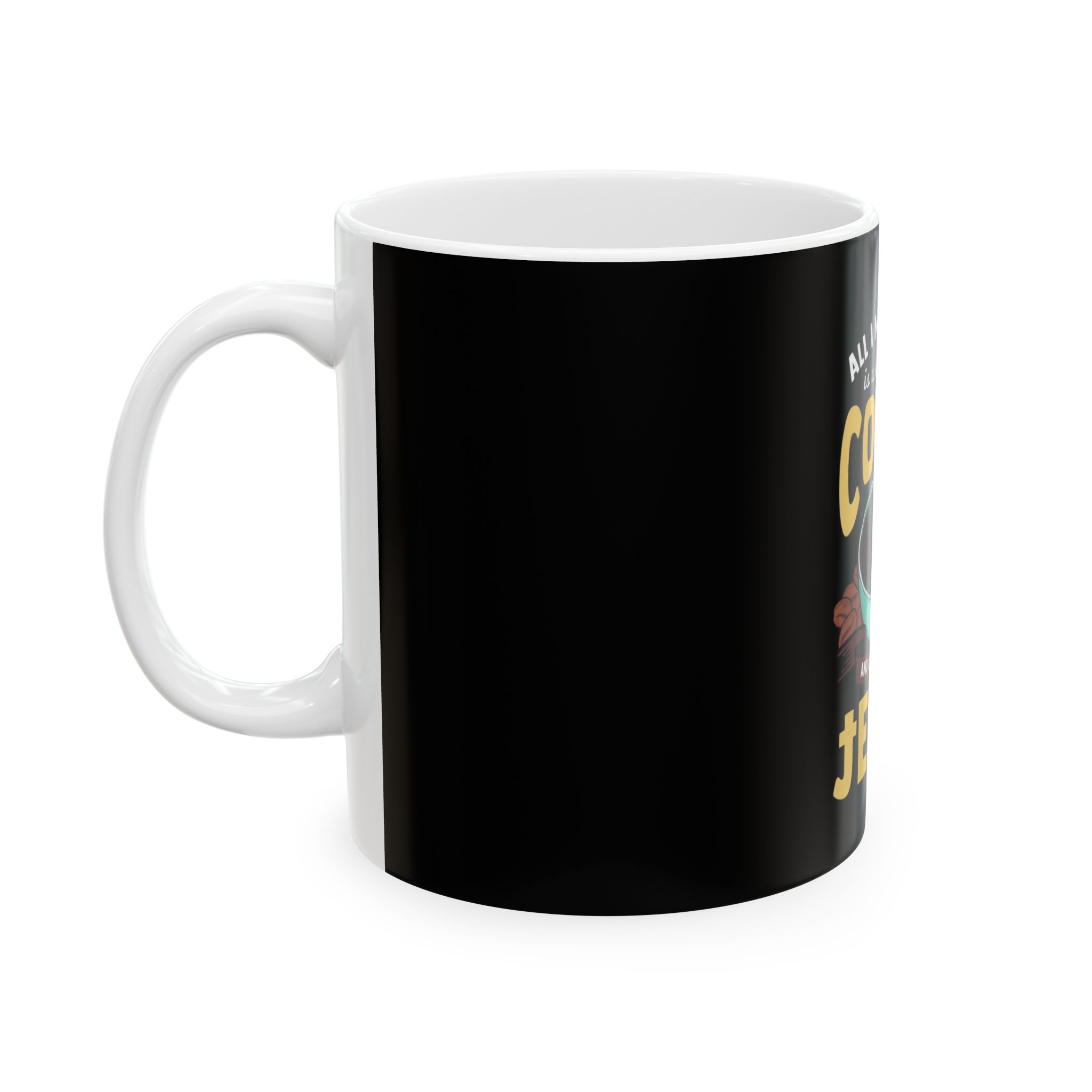 Mornings that start with a warm cup and a quiet heart—this glossy ceramic mug holds both. The rich black backdrop makes the retro-style illustration pop: a steaming teal cup of coffee paired with playful lettering that reads, “All I need today is a little bit of coffee and a whole lot of Jesus.” Sip slowly between prayers, Bible study, or while planning the day. The comfortable C-handle fits naturally in your hand and the shiny finish gives the art a crisp, uplifted look. Available in two sizes to match your routine—reach for the smaller cup for quick refills or the larger one when you need extra warmth and comfort. Microwave- and dishwasher-safe, lead- and BPA-free: built for daily use and honest moments of reflection.