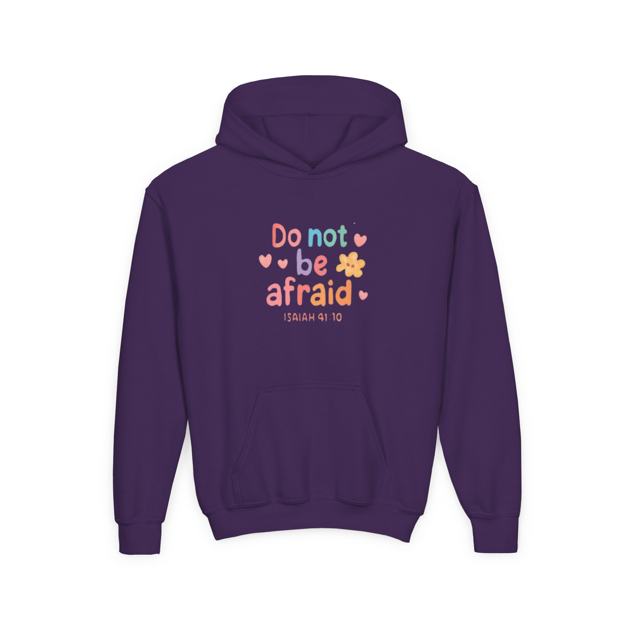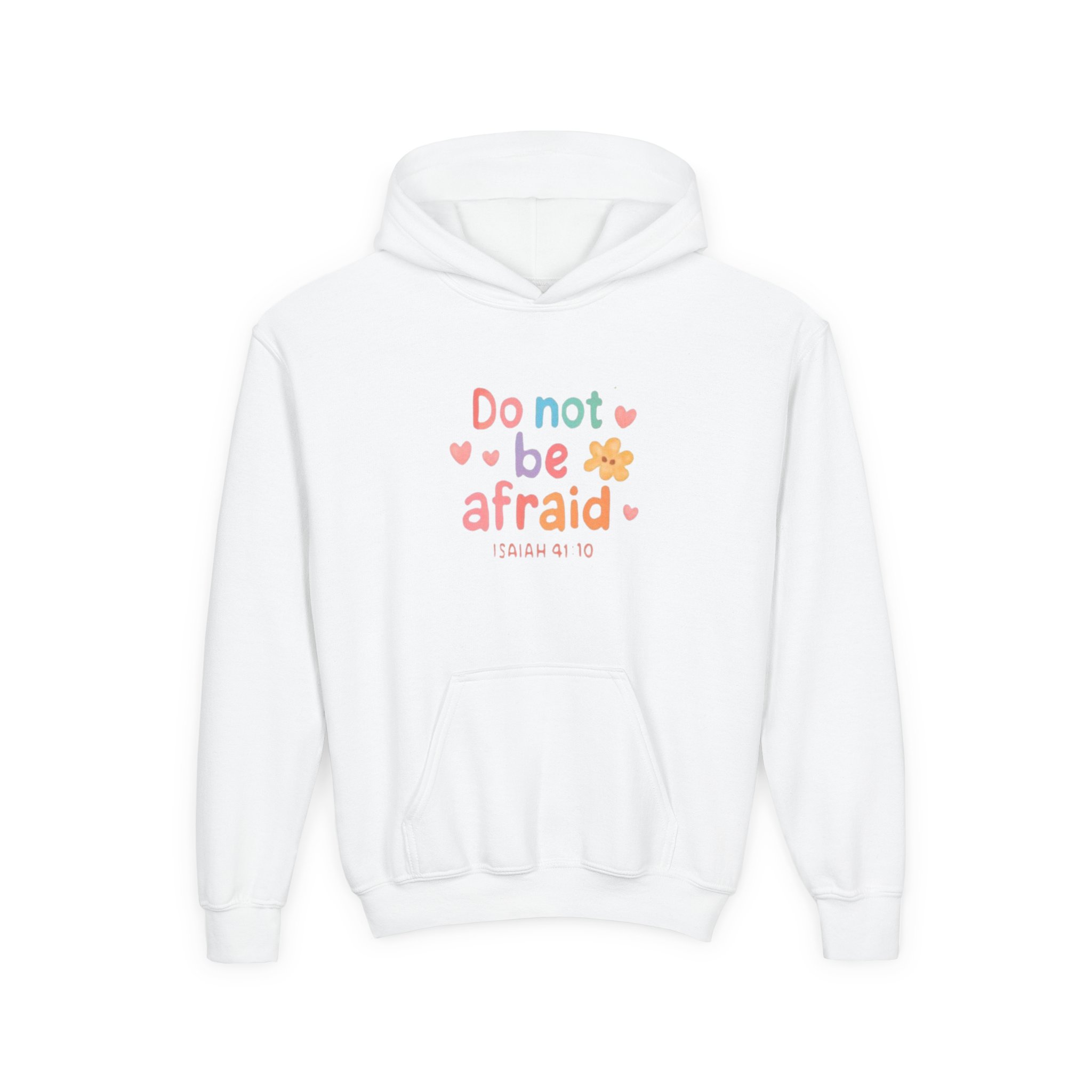 A cozy youth hoodie that feels like a gentle hug. Soft, mid-weight fleece holds warmth without weighing little ones down. The front wears a cheerful, hand-lettered reminder — “Do not be afraid” — surrounded by pastel hearts and a tiny flower, giving it an uplifting, comforting presence. The roomy kangaroo pouch keeps hands warm and carries small treasures. Durable twill necktape and a sewn-in label keep the hoodie feeling neat through play and wash. Subtle wrist prints and the option for small chest embroidery add charming detail without overpowering the sweet design. Built to meet child-safety standards and made with a sturdy cotton-poly blend, this hoodie is meant for everyday comfort, quiet courage, and soft moments at home or school.