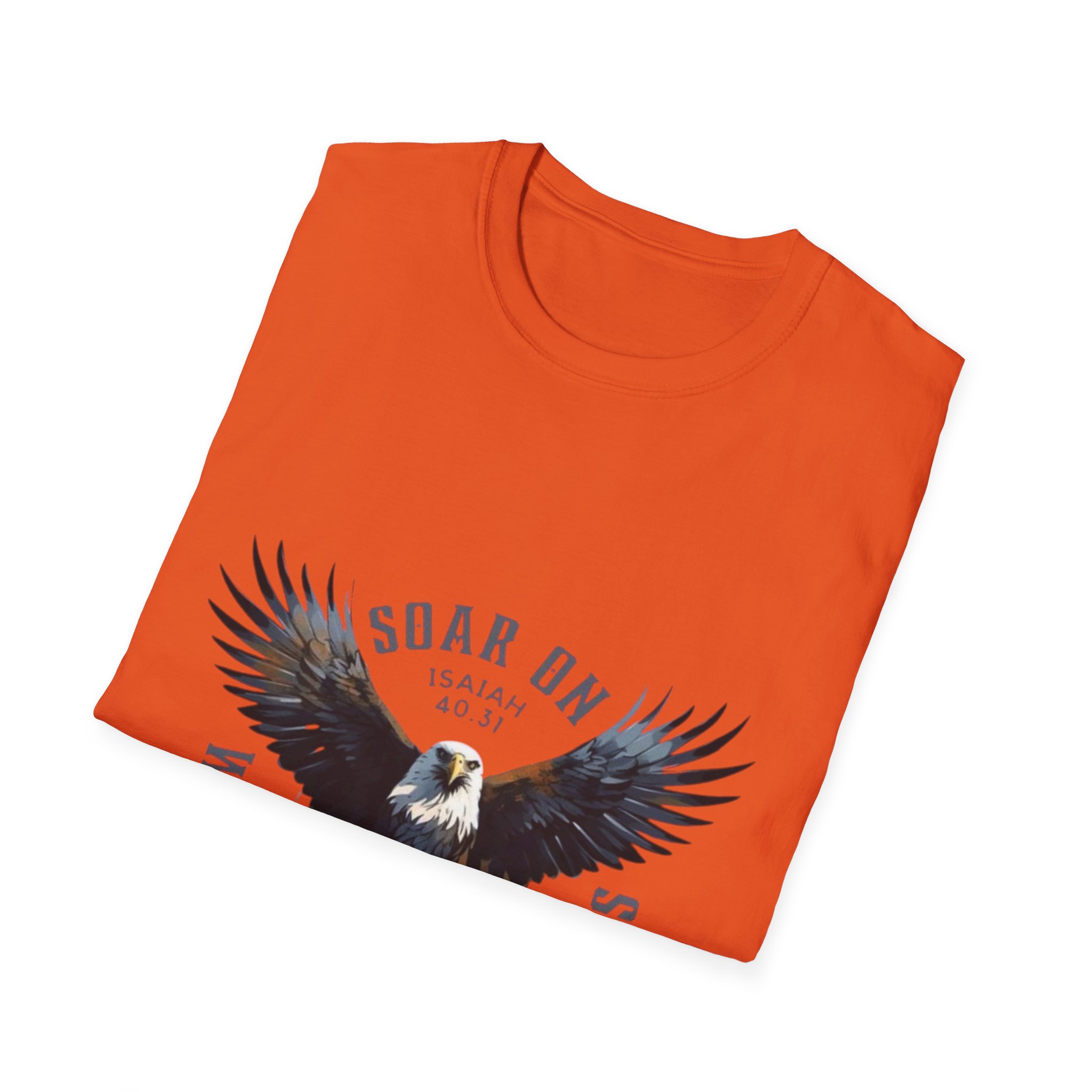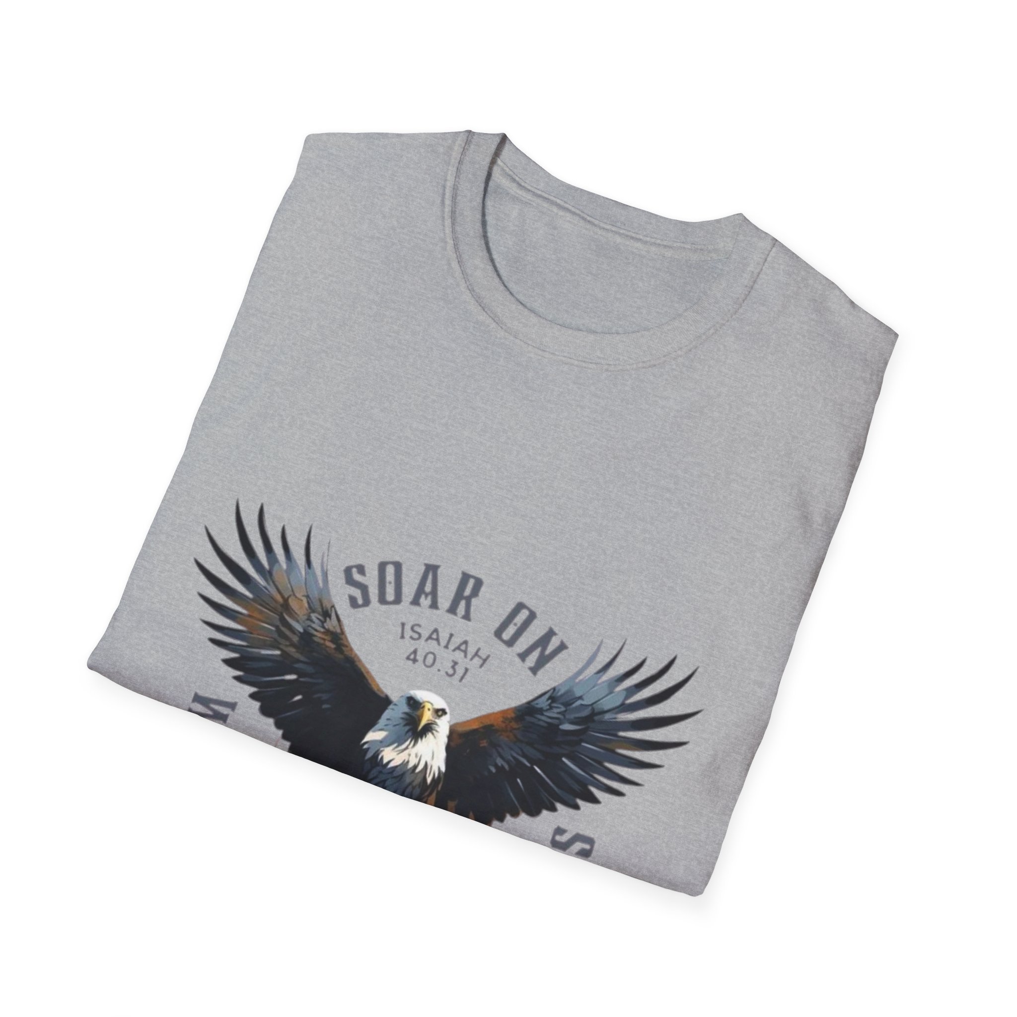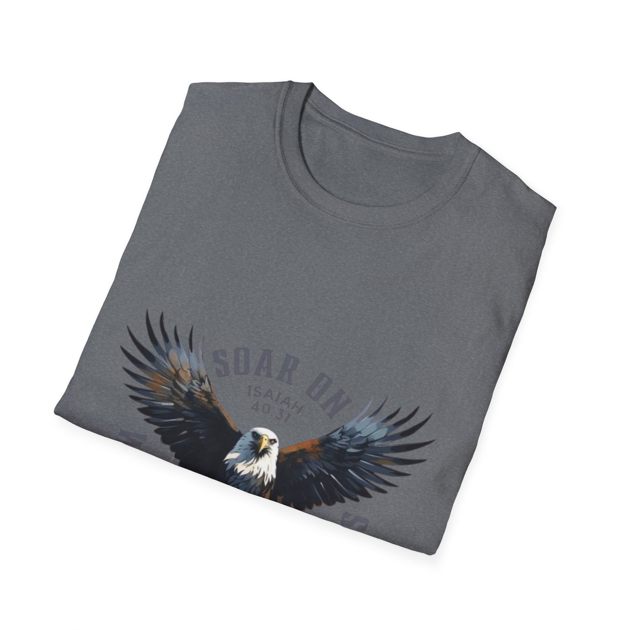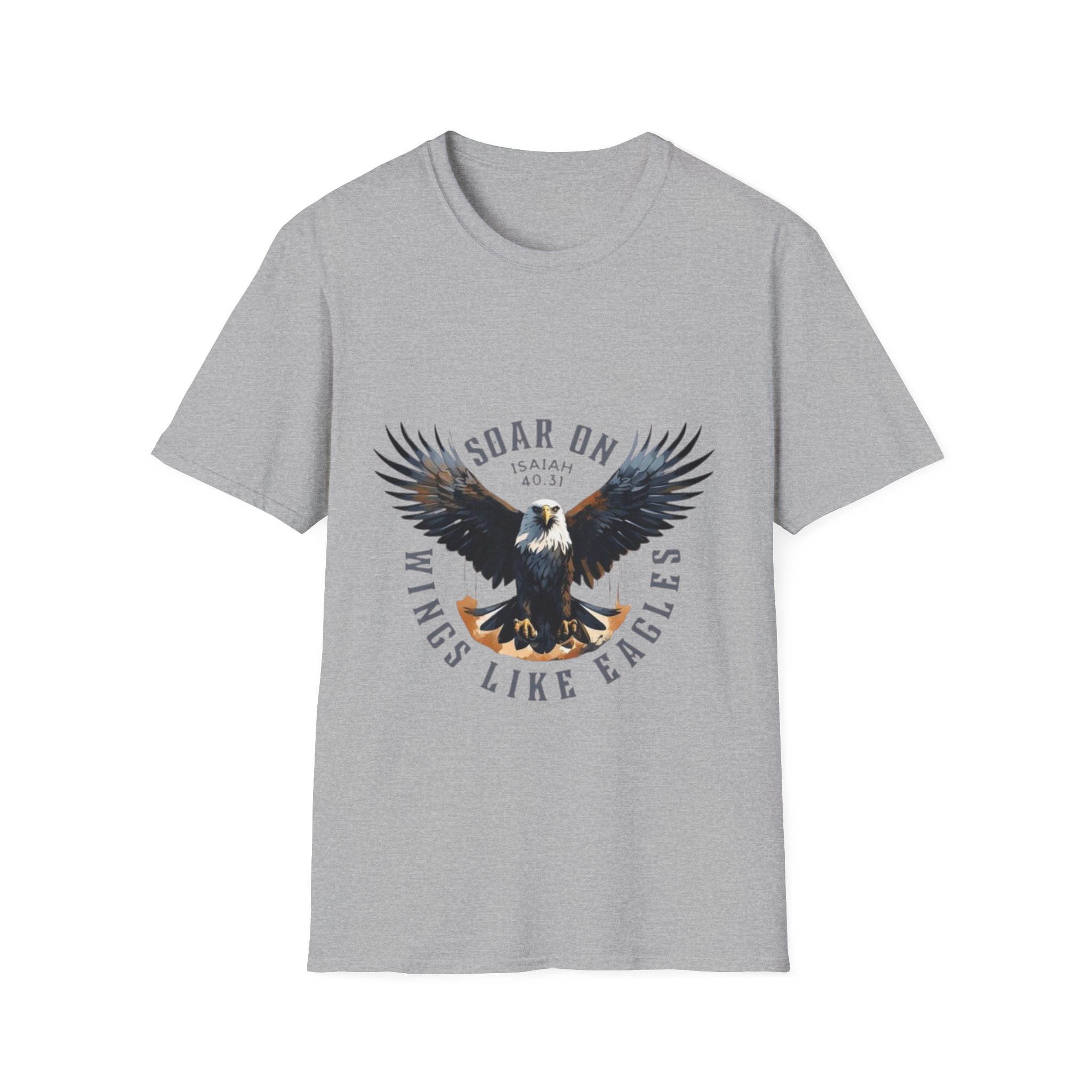 This lightweight cotton tee carries a bold, vintage-style eagle graphic that reads “Soar On — Wings Like Eagles.” It feels like wearing a quiet declaration: steady, grounded confidence with room to breathe. The soft ring-spun fabric drapes easily and the classic crew cut keeps the look familiar and effortless. Wear it on a morning hike, at a casual meet-up, or layered beneath a flannel when the temperature dips. The artwork’s muted palette and distressed finish give the shirt a lived-in character that ages well with every wash — it’s the kind of piece you reach for when you want to feel composed and steady, not loud.