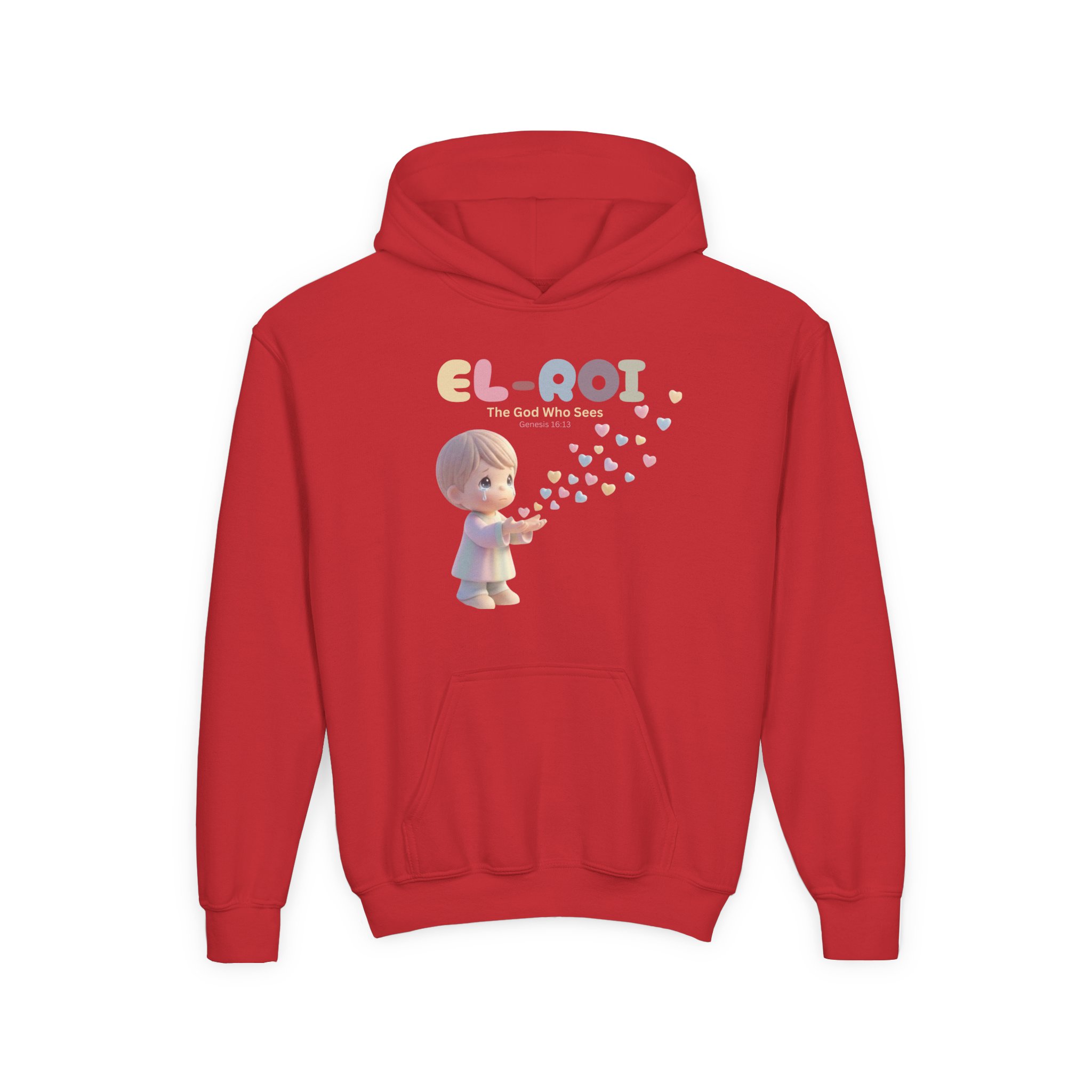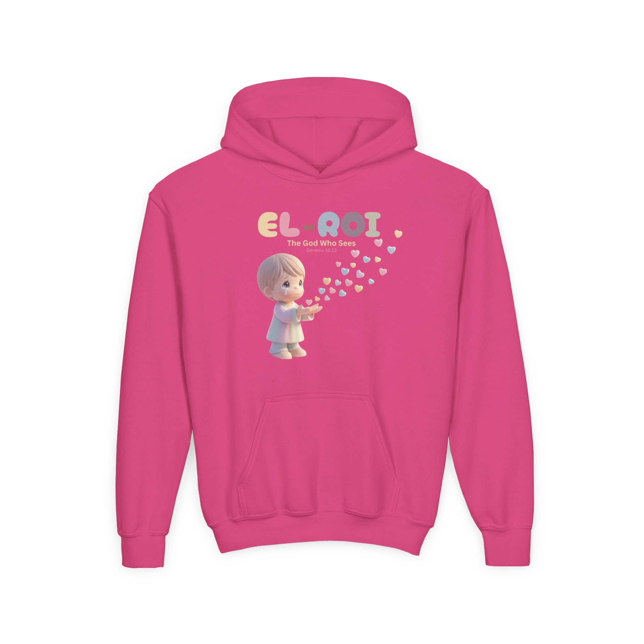 A cozy, kid-sized hoodie with a gentle, nostalgic design made for little ones who love soft colors and sweet moments. The front shows a small child figure blowing a trail of pastel hearts toward the word “EL-ROI,” creating an atmosphere of quiet wonder and comfort. The midweight fabric feels warm without being bulky, and the roomy kangaroo pocket keeps small hands snug. Subtle embroidery options add a textured, keepsake quality to the chest design. Washable, durable prints and reinforced neck tape mean this hoodie will stand up to daily wear and play while still looking tender and thoughtful.
