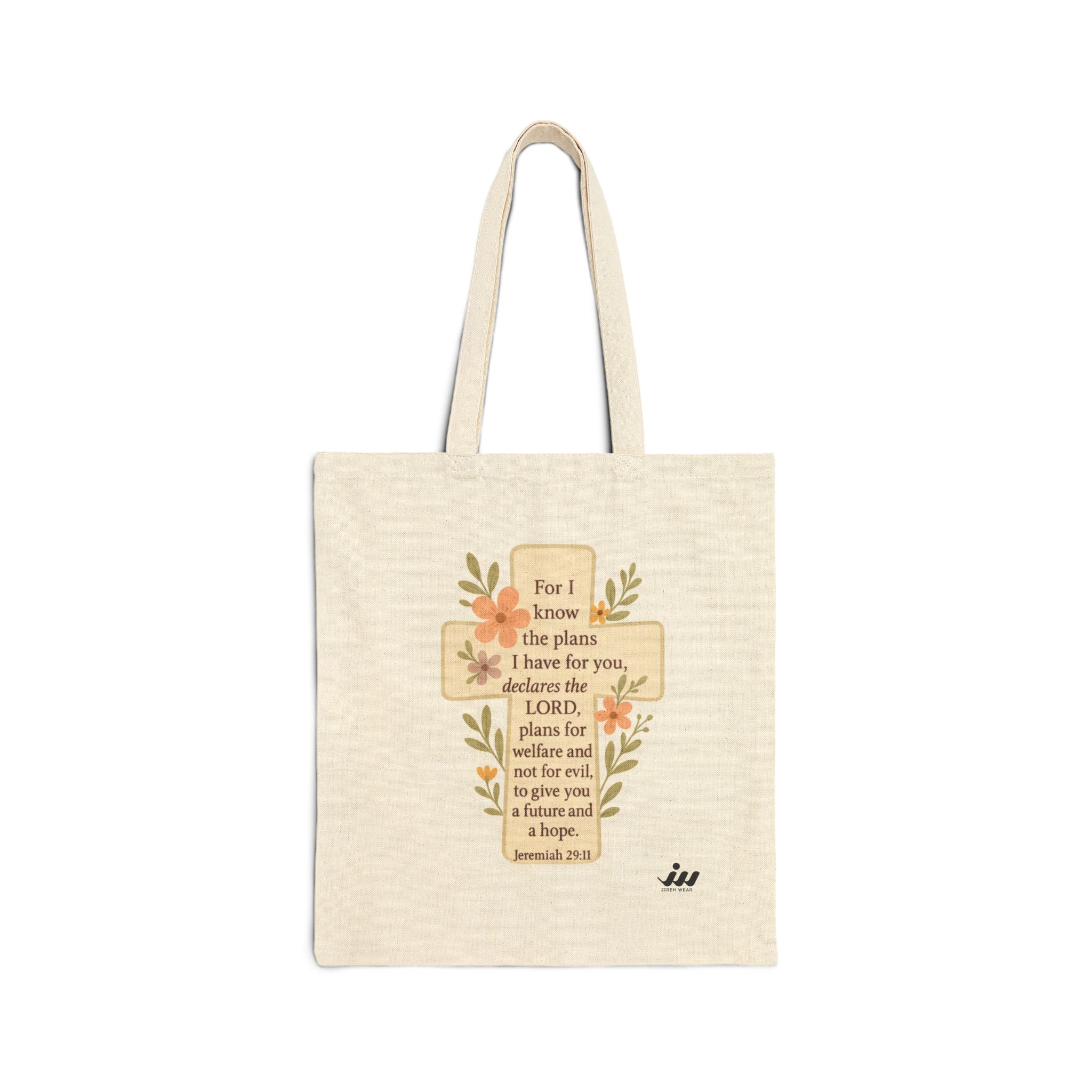 A sturdy cotton canvas tote that carries more than groceries — it carries intention. The natural heavyweight fabric holds shape and weight without sagging, while long reinforced handles sit comfortably on the shoulder. The front art features a warm, floral-accented cross with an uplifting scripture verse, giving the bag a quiet, faith-forward presence. Use it for church group meetups, daily errands, library runs, or as a simple way to share encouragement when carrying items to a friend. It feels lived-in from the first use, and the flat, structured body keeps contents neat and accessible.