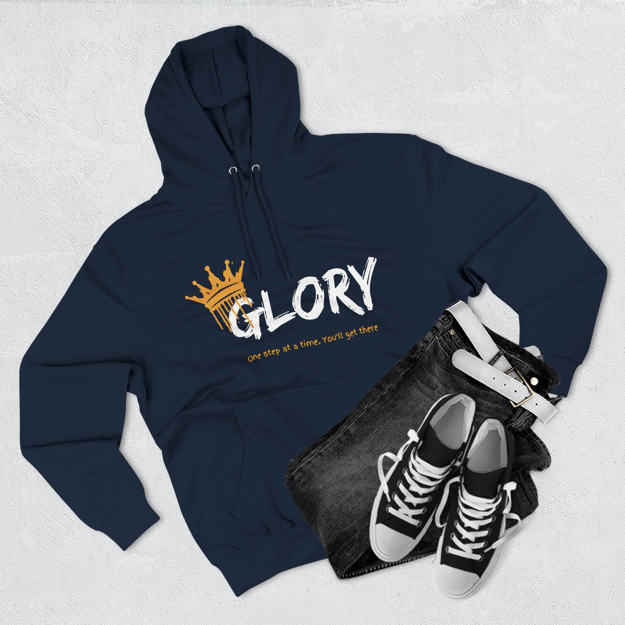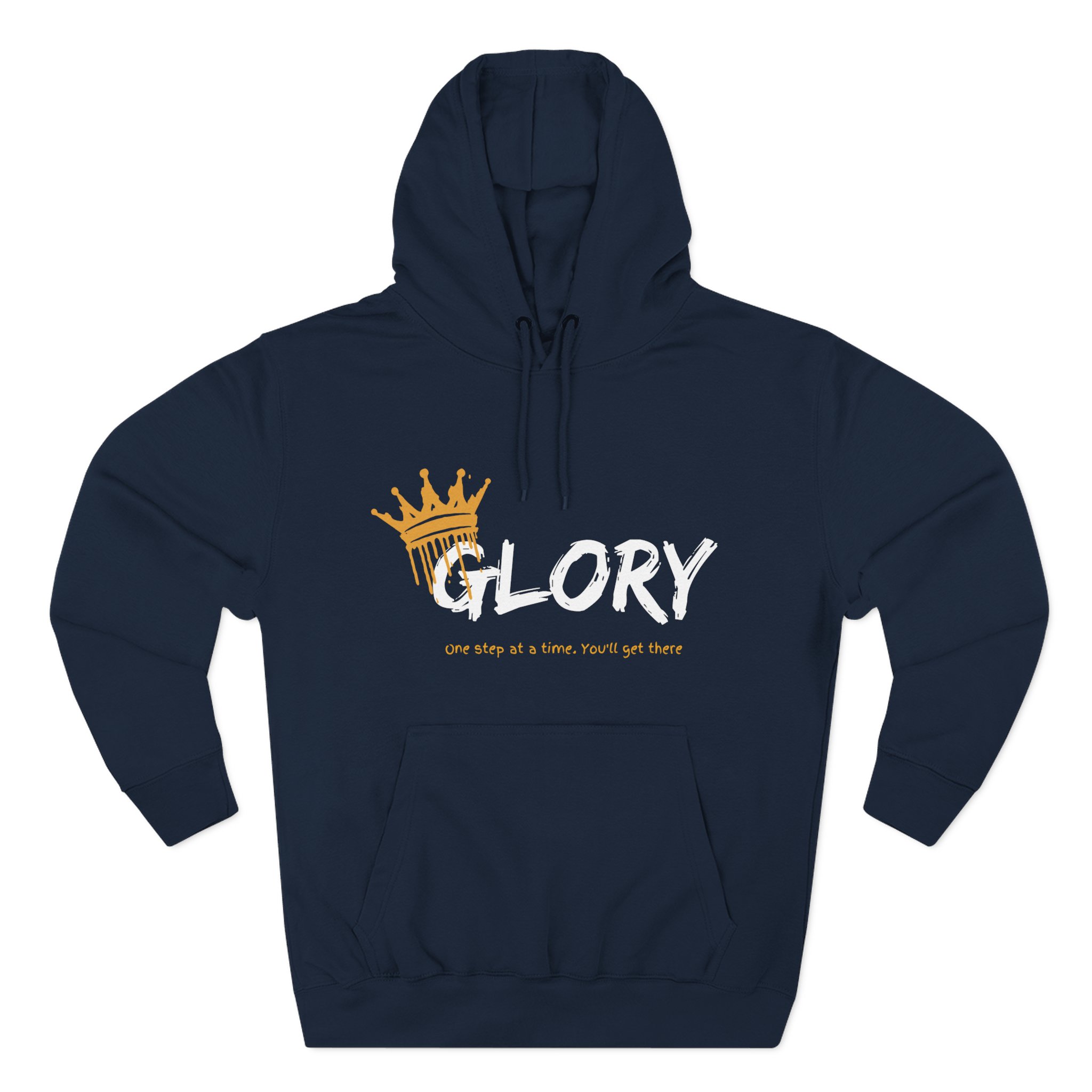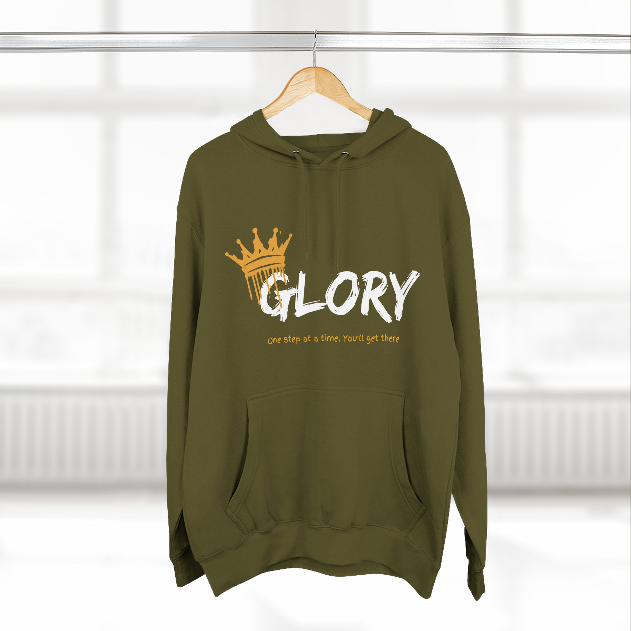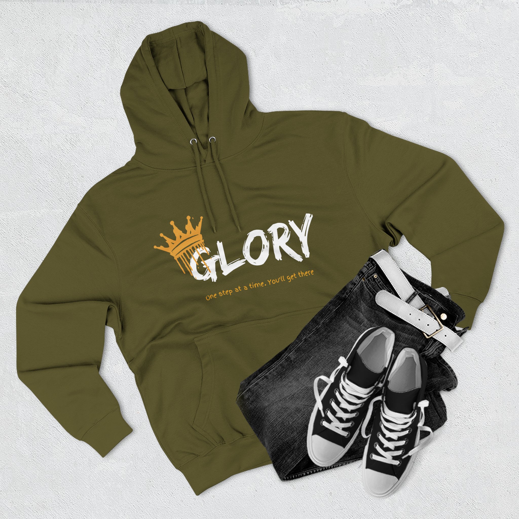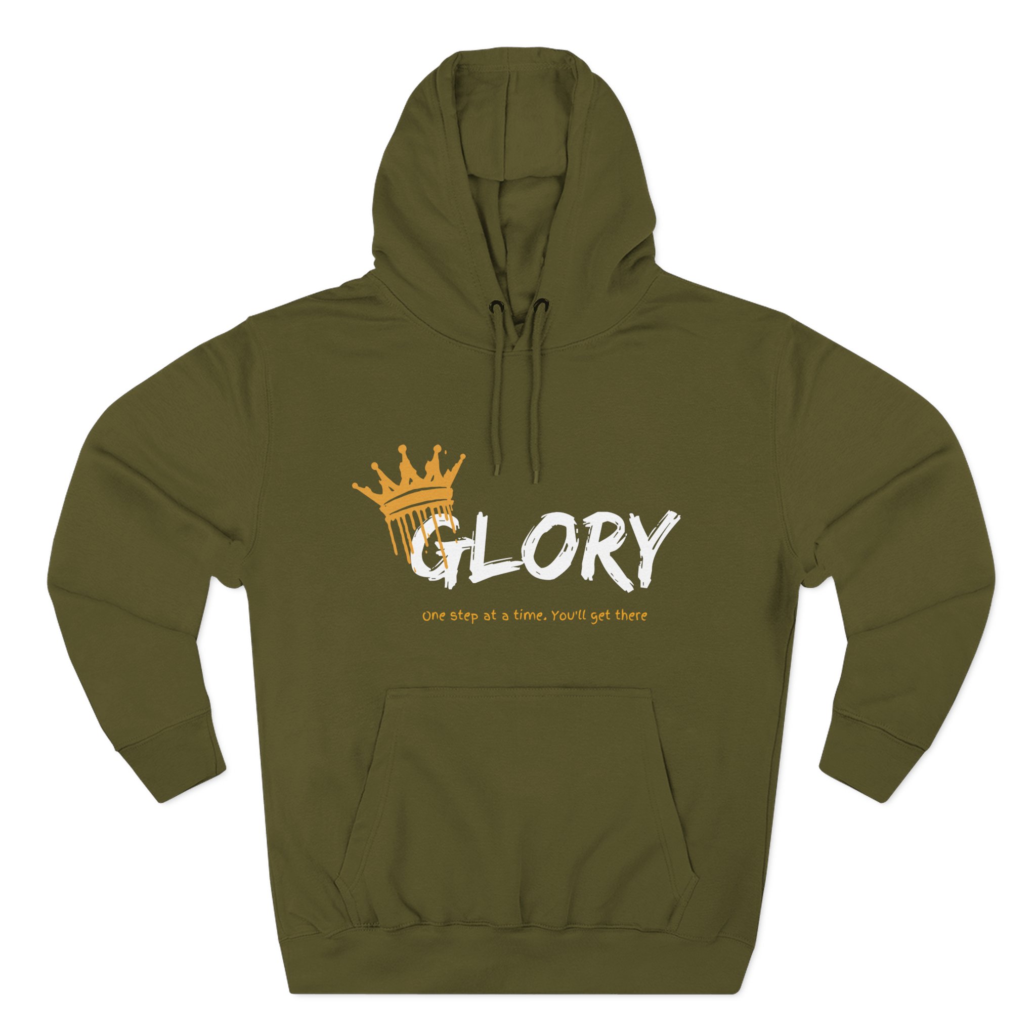This three-panel fleece hoodie blends everyday comfort with quiet confidence. The brushed interior and soft hand-feel invite you to linger — morning coffee, late-night walks, or those focused studio hours. A hand-drawn crown graphic and bold “GLORY” lettering sit over the heart, a subtle reminder of perseverance: small steps add up. The roomy kangaroo pocket keeps hands warm and holds essentials. Built with thoughtful details like twill necktape, reinforced seams, and an adjustable hood with metal-grommet drawstrings, it wears well and keeps its shape through repeated wears. Olive green gives it an earthy, lived-in look that layers easily under jackets or over tees.