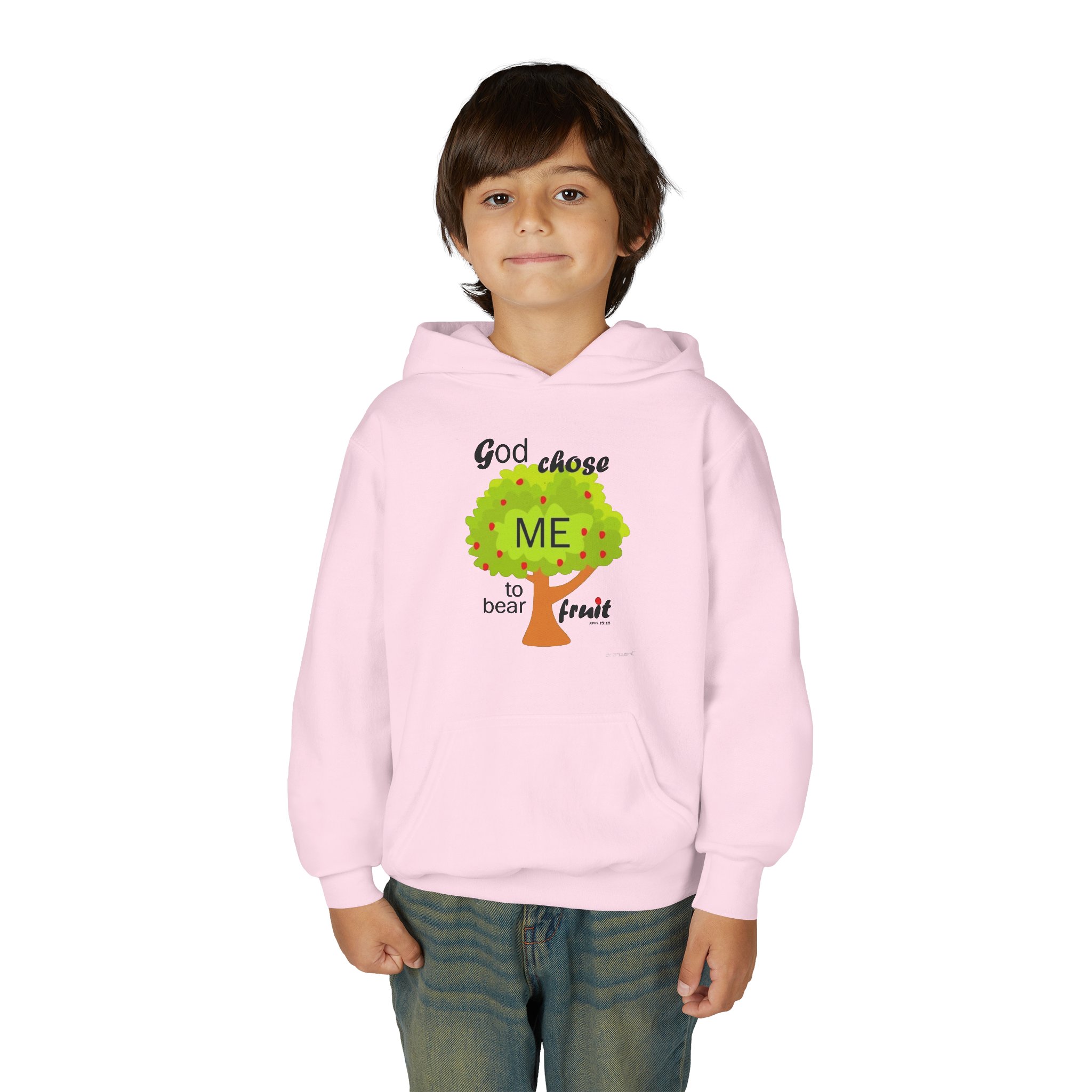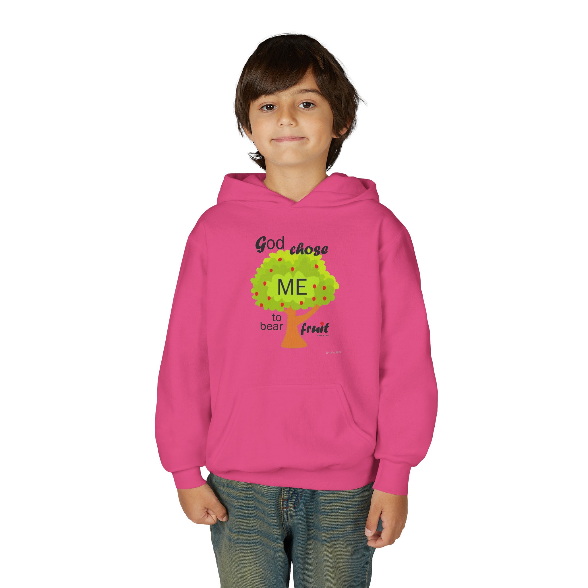 A cozy youth hoodie with a soft, midweight feel and a cheerful, faith-inspired tree graphic. The artwork — a bright green tree with the words “God chose ME to bear fruit” — sits on the chest and gives kids a gentle, affirming message they can wear to school, church, or play. Built from a sturdy 50/50 cotton-poly blend, the hoodie holds up to active days while keeping its shape and print clarity. A kangaroo pouch pocket and roomy hood add warmth and everyday practicality. Subtle embroidery is available for a raised, tactile option on the chest, while DTF wrist prints add a playful finishing detail. Safety-tested and compliant for children, this sweatshirt balances durable construction with soft comfort for daily wear.