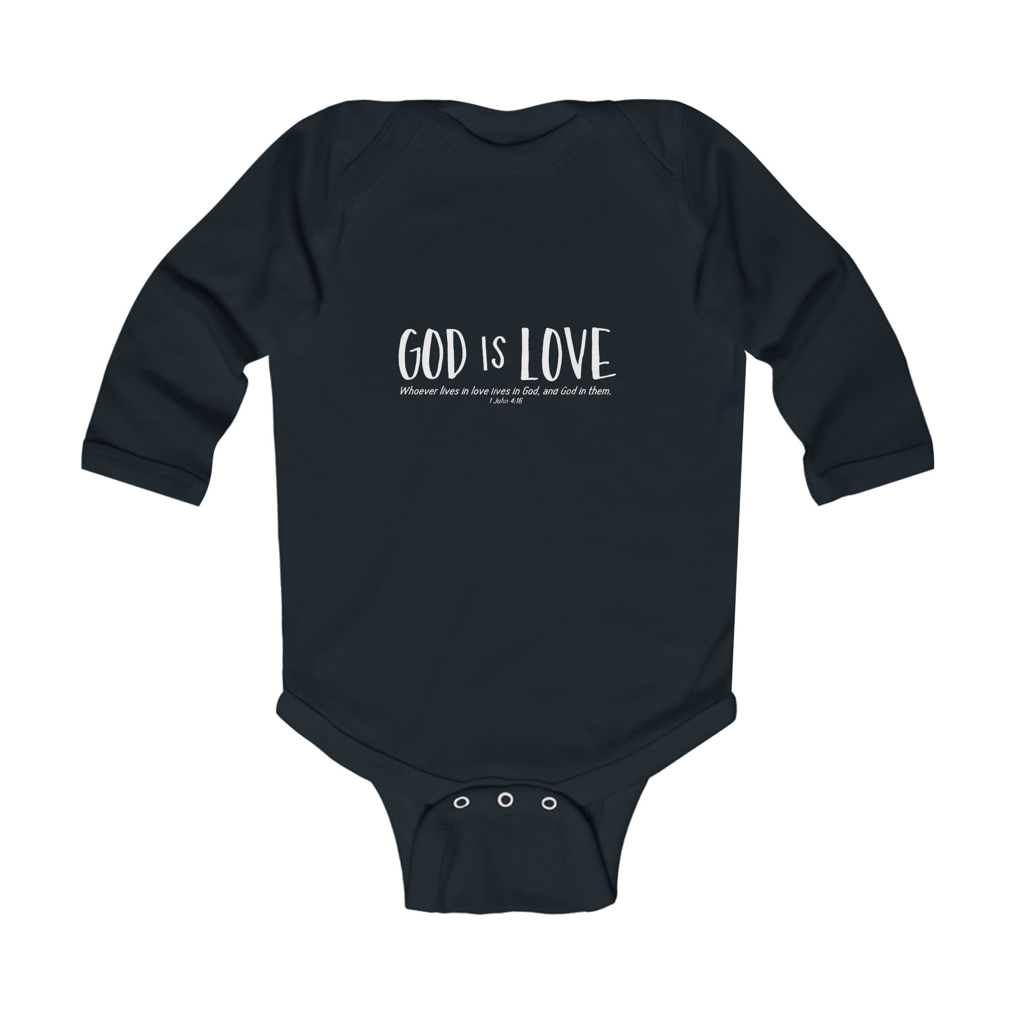 Soft, simple, and full of meaning — this infant long sleeve bodysuit wears its message gently. The small, hand-lettered “GOD IS LOVE” print sits across the chest in crisp white, offering a quiet reminder of faith that complements everyday cuddles, church mornings, and family photos. Lightweight and breathable, the snug ribbed neckline and three-snap closure make diaper changes smooth while letting little arms move freely. It settles into daily life: layering under sweaters in cooler months, peeking out from a cardigan at Sunday gatherings, or keeping baby comfortable during naps and play. This piece is for parents who want baby clothing that speaks to their values without fuss — soft against delicate skin and designed to live in the moments that matter.