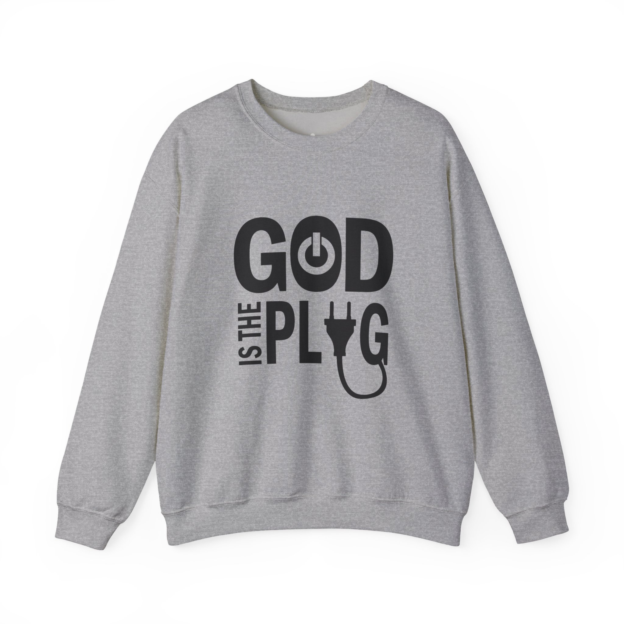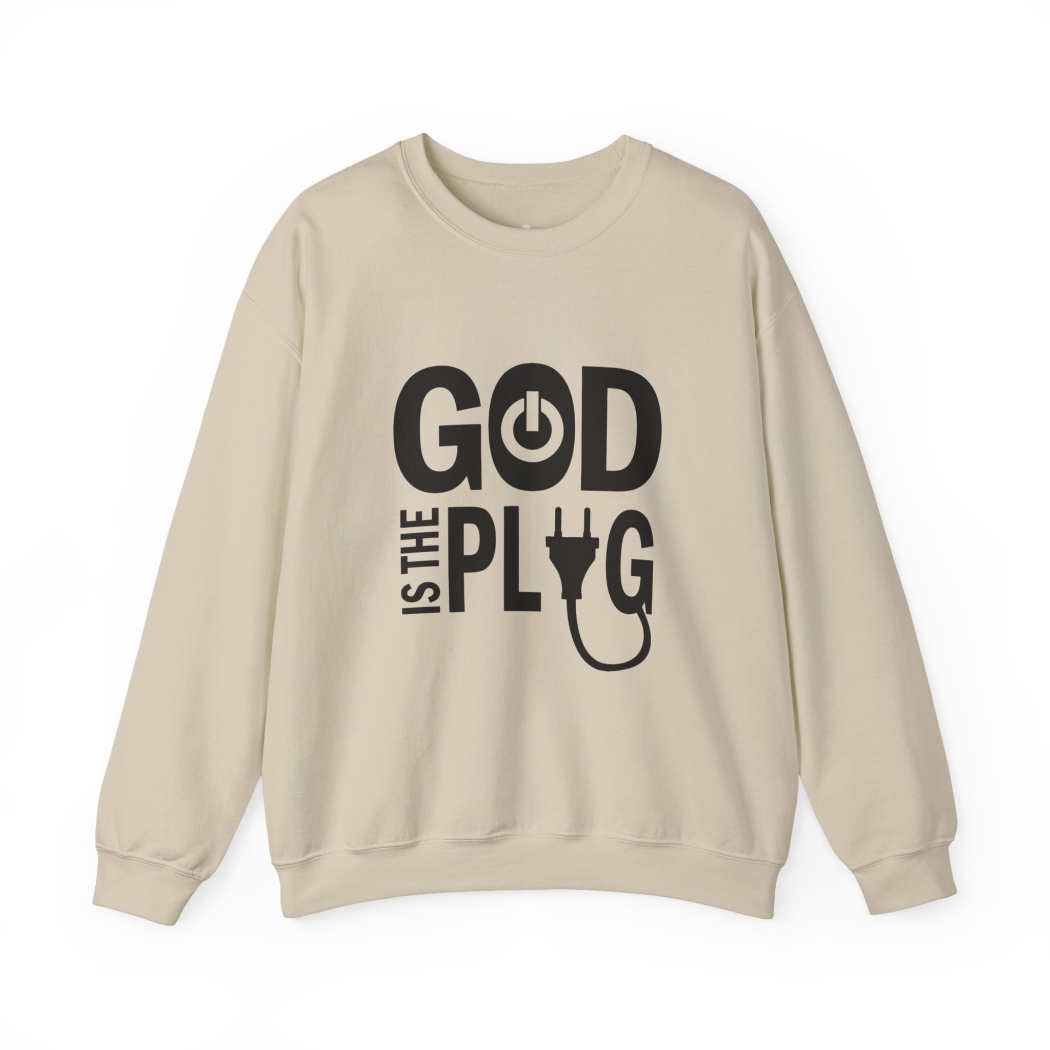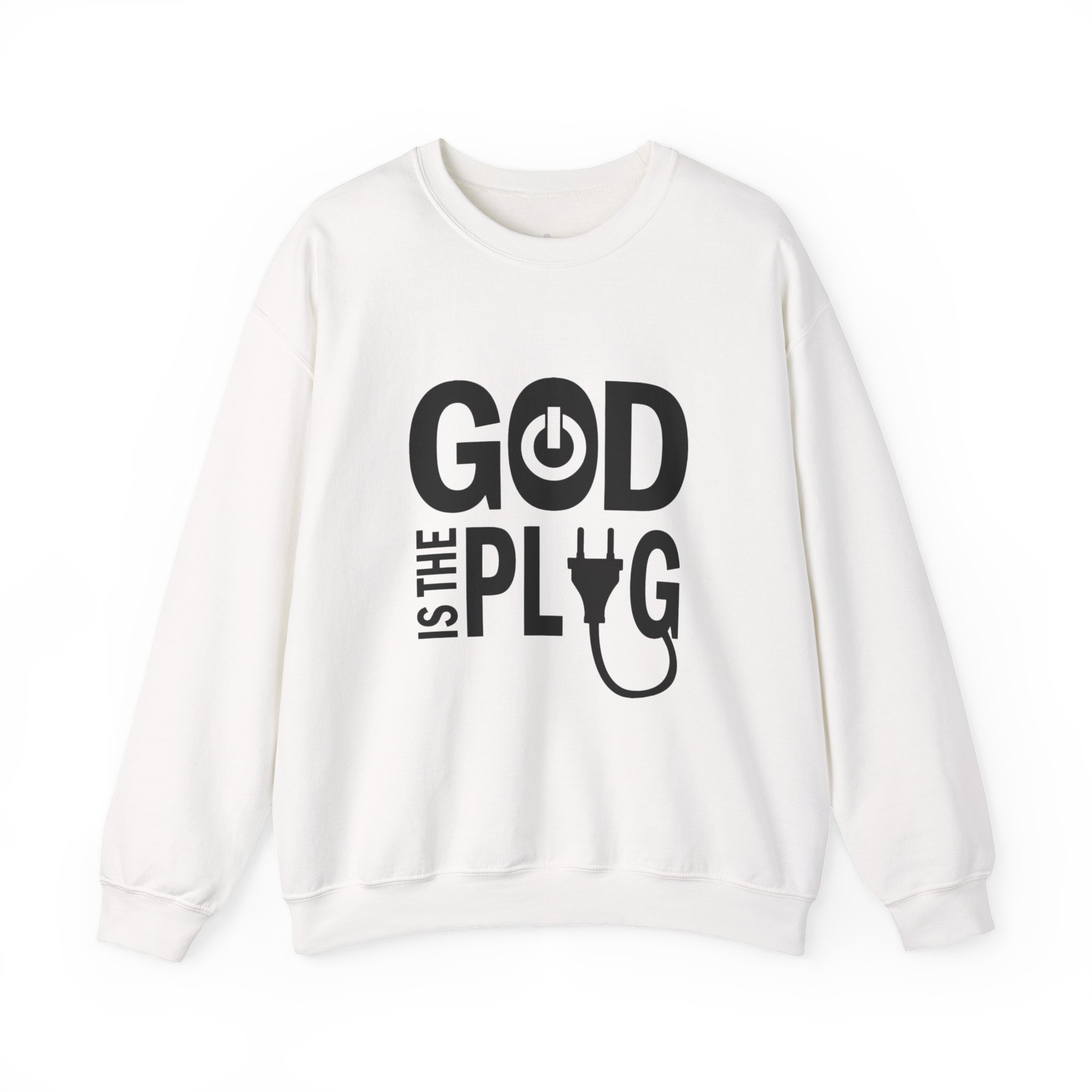 A clean, cozy crewneck that speaks with a wink. This mid-weight sweatshirt pairs soft, pill-resistant fabric with a bold, minimalist graphic that reads “GOD IS THE PLUG” using a power-button and plug motif. Wear it as a quiet statement in coffee shops, at late-night studio sessions, or while layering for a crisp morning walk. The tubular knit body and ribbed collar hold their shape through repeated washes, and reinforced double-needle stitching keeps the silhouette neat. Subtle DTF-printed neck and wrist labels keep the interior smooth so nothing distracts from that effortless, lived-in feel.