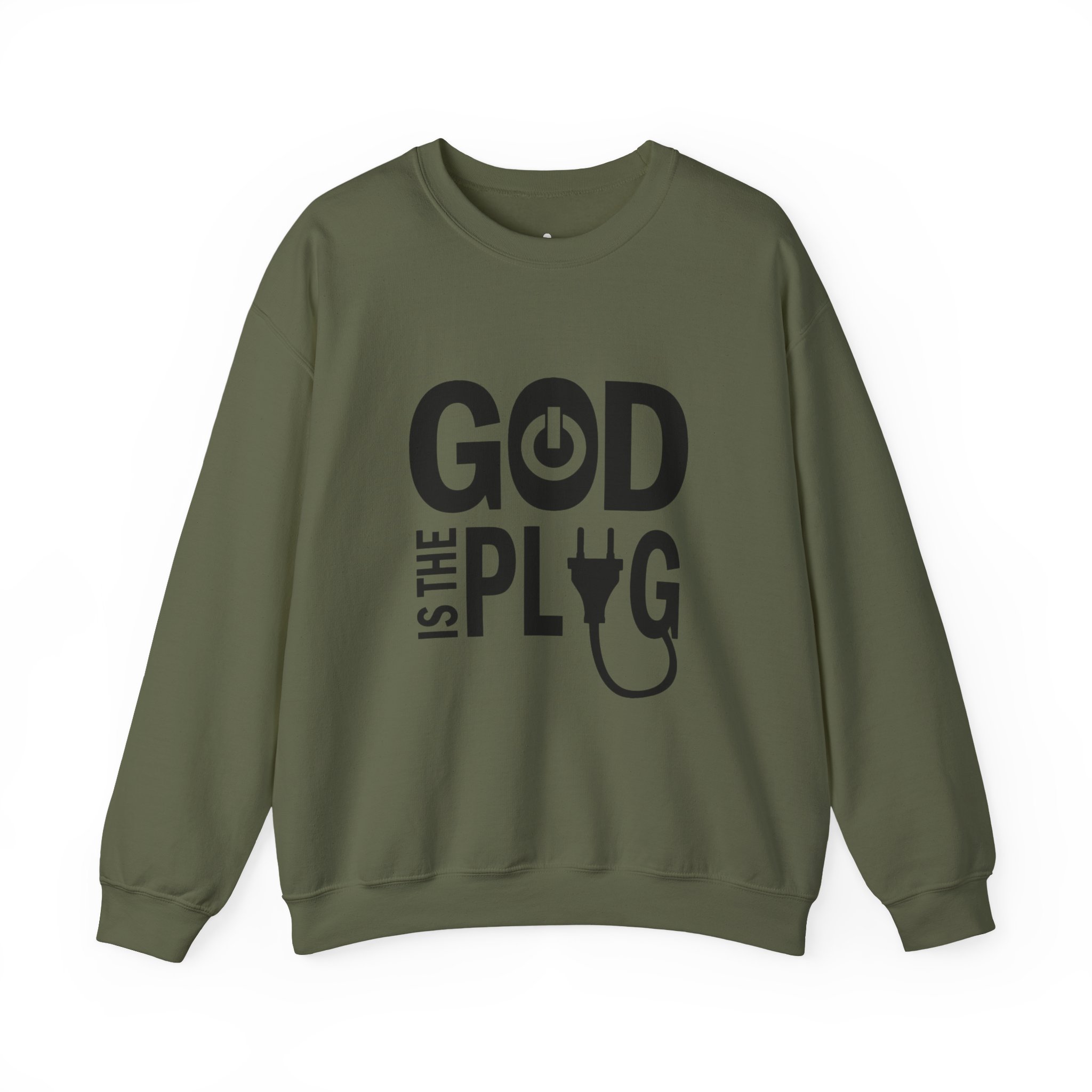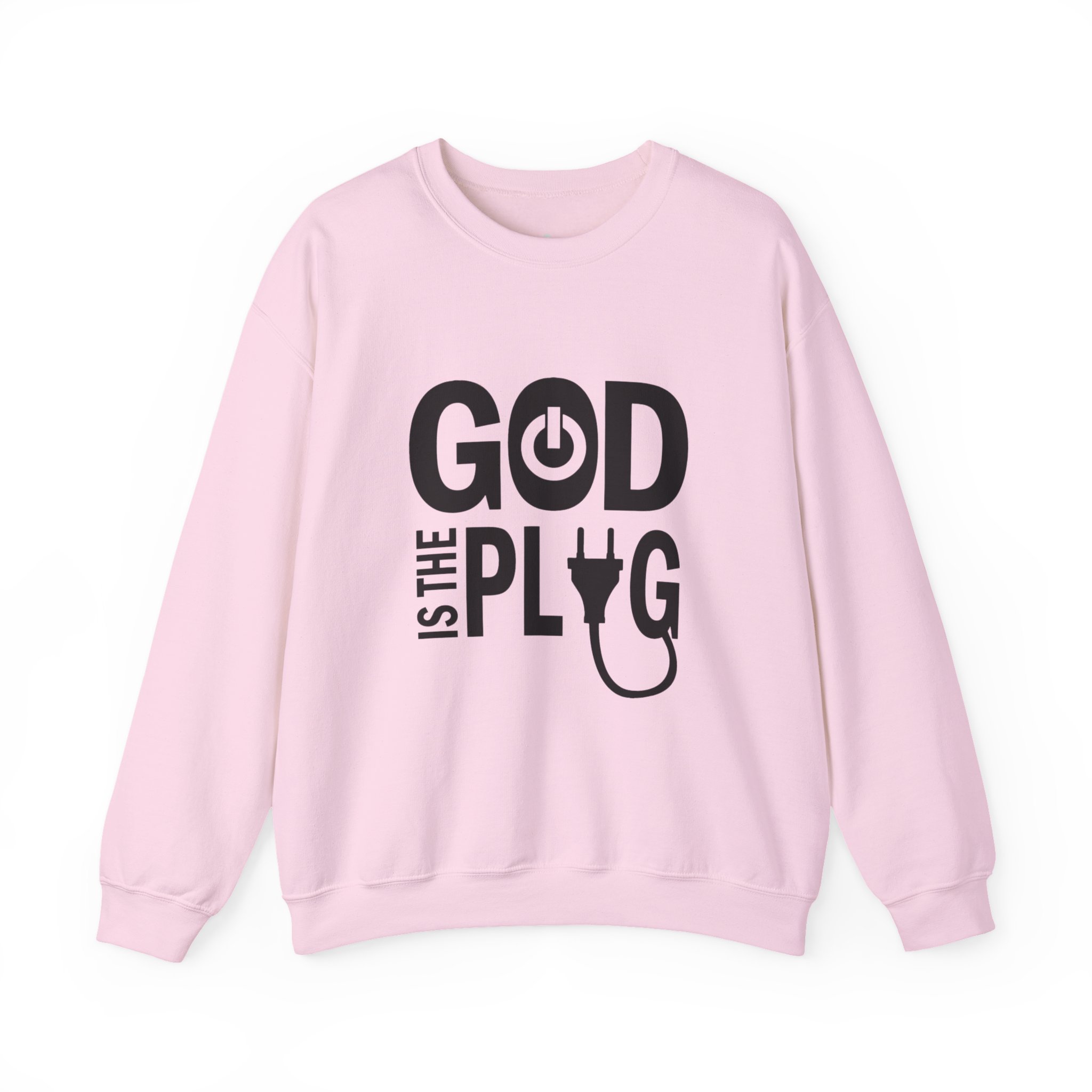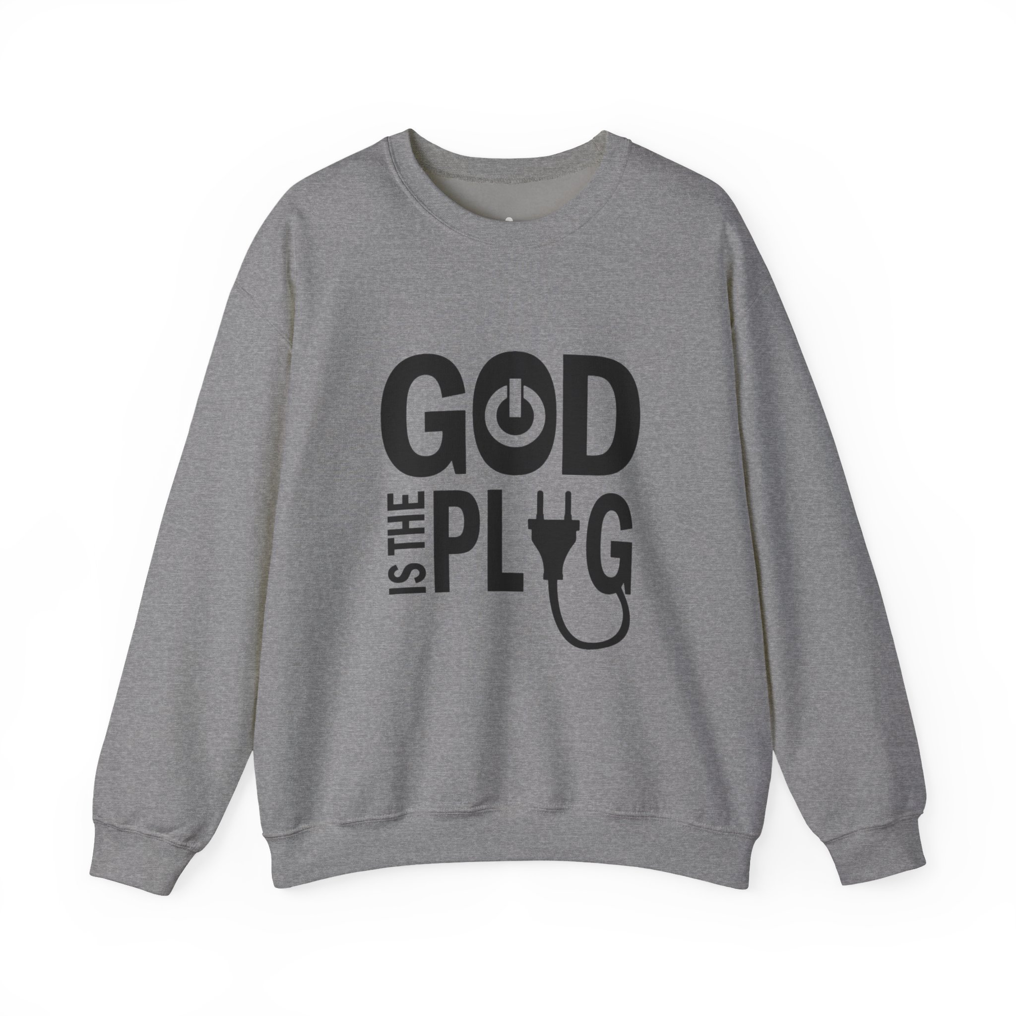 A clean, cozy crewneck that speaks with a wink. This mid-weight sweatshirt pairs soft, pill-resistant fabric with a bold, minimalist graphic that reads “GOD IS THE PLUG” using a power-button and plug motif. Wear it as a quiet statement in coffee shops, at late-night studio sessions, or while layering for a crisp morning walk. The tubular knit body and ribbed collar hold their shape through repeated washes, and reinforced double-needle stitching keeps the silhouette neat. Subtle DTF-printed neck and wrist labels keep the interior smooth so nothing distracts from that effortless, lived-in feel.