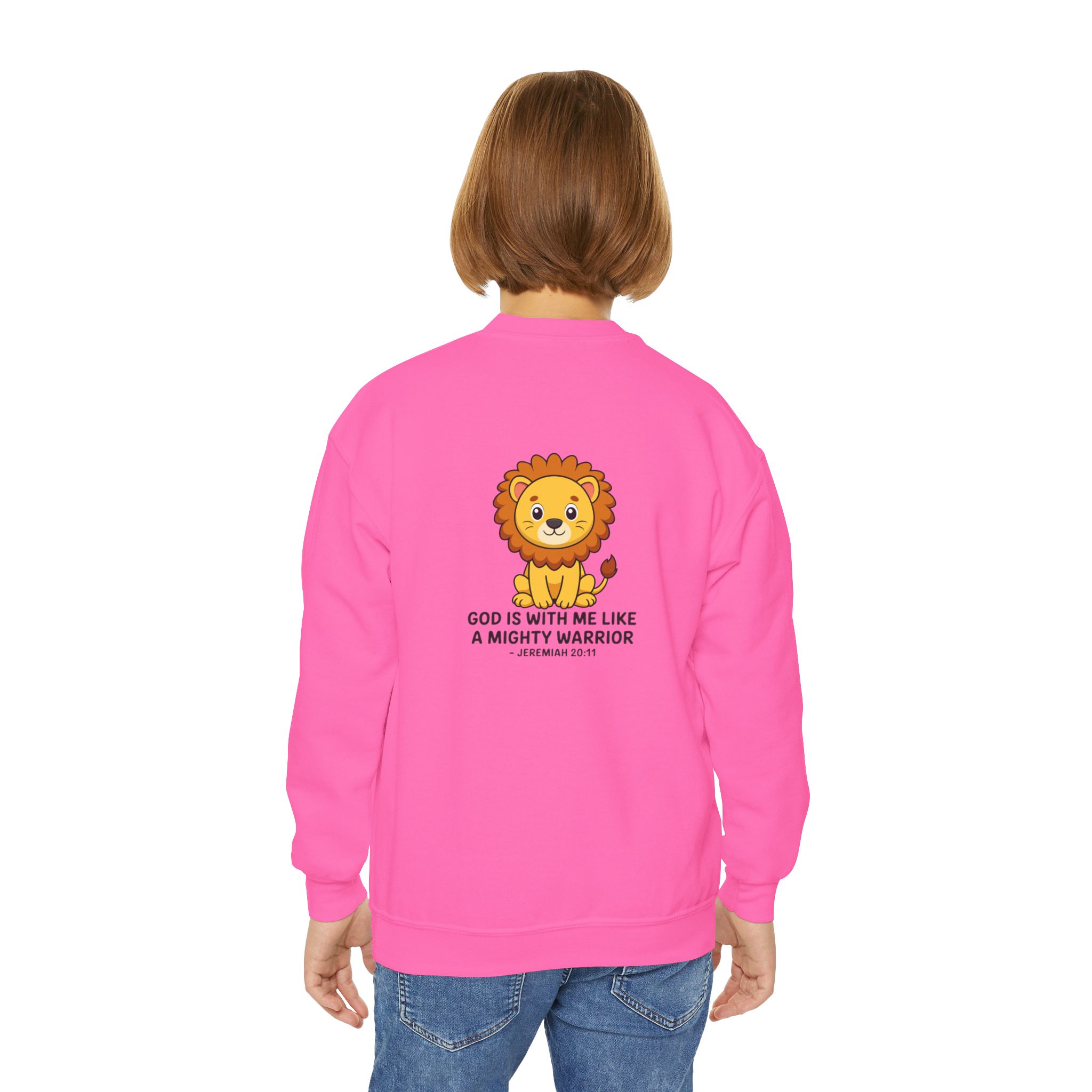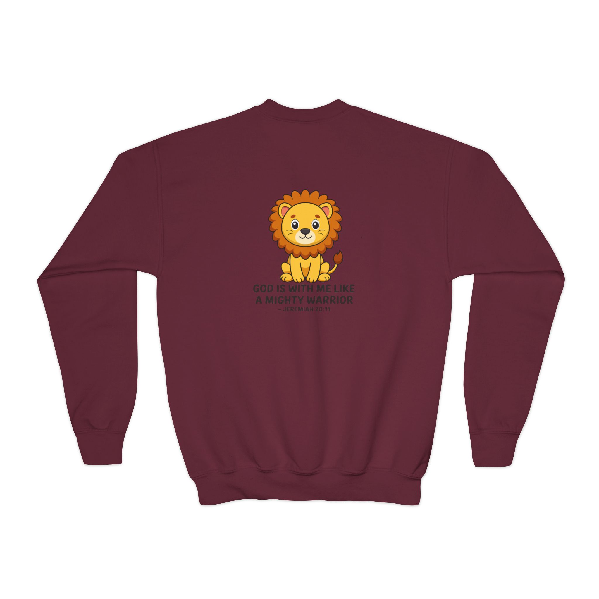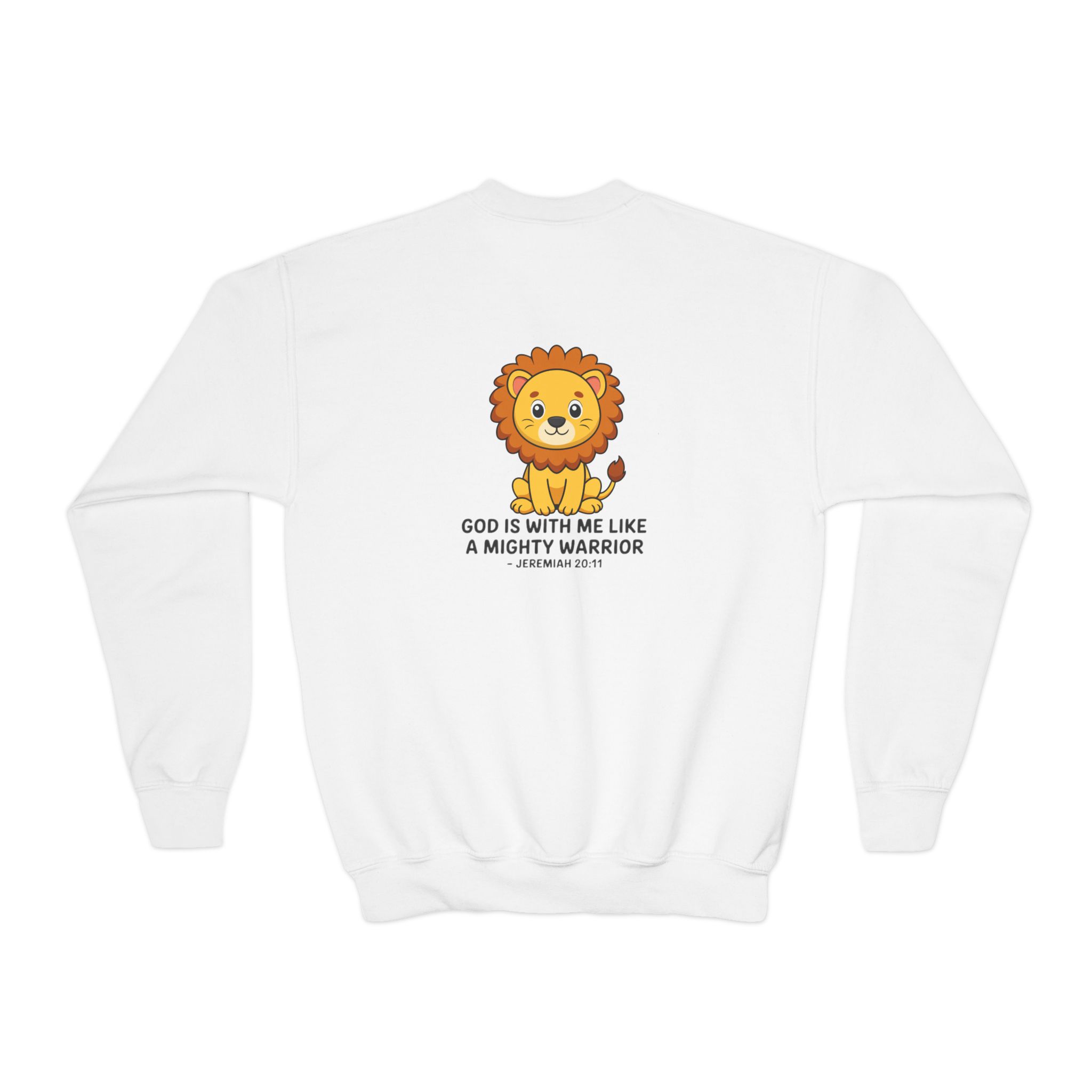 Soft, cozy crewneck designed for little ones who love warmth and gentle encouragement. A friendly cartoon lion sits at the center, paired with the uplifting verse “God is with me like a mighty warrior” beneath — a quiet reminder of courage and comfort. The loose, medium-heavy fabric drapes comfortably for playtime and naps, while the tear-away label keeps skin irritation to a minimum. Choose embroidery placement on the chest for a subtle, heirloom feel or stick with the printed design for bright, playful detail.