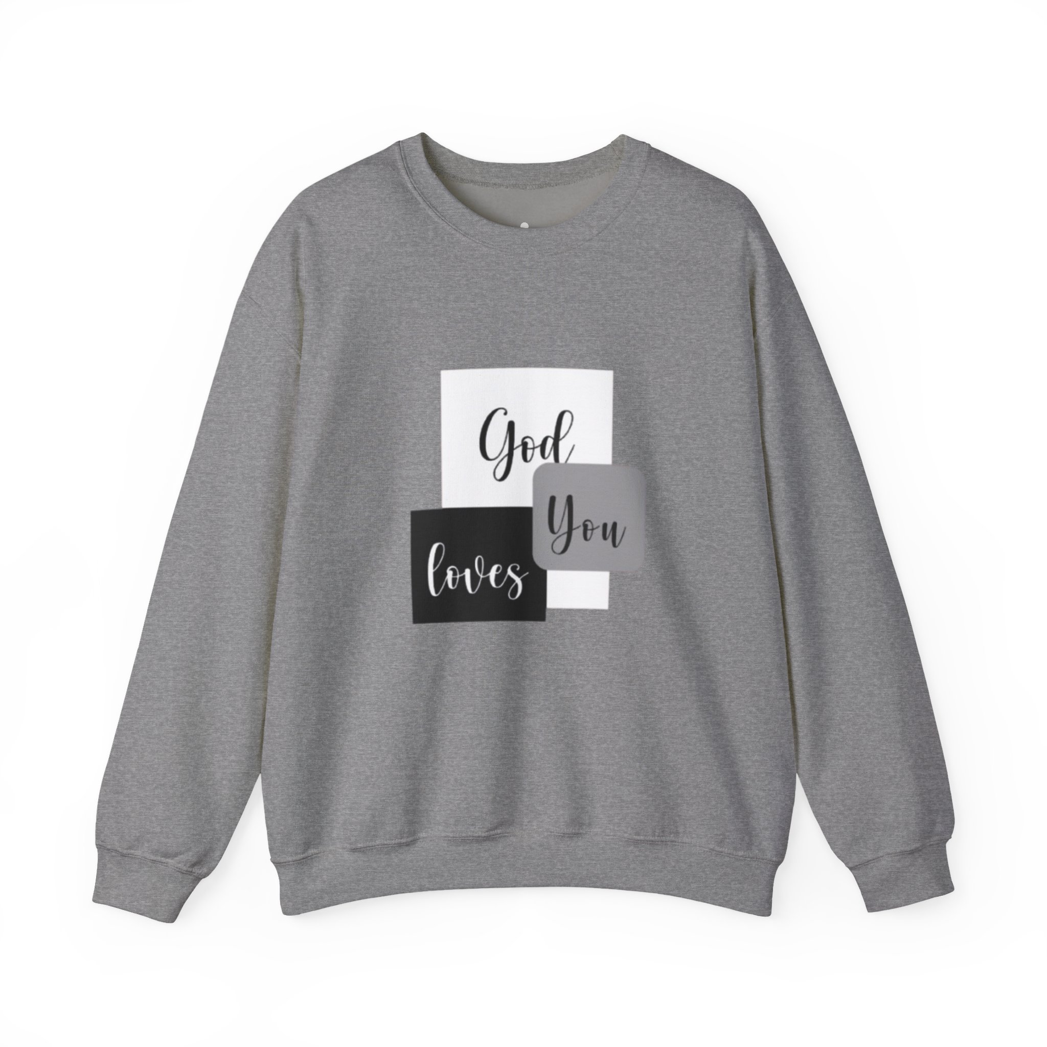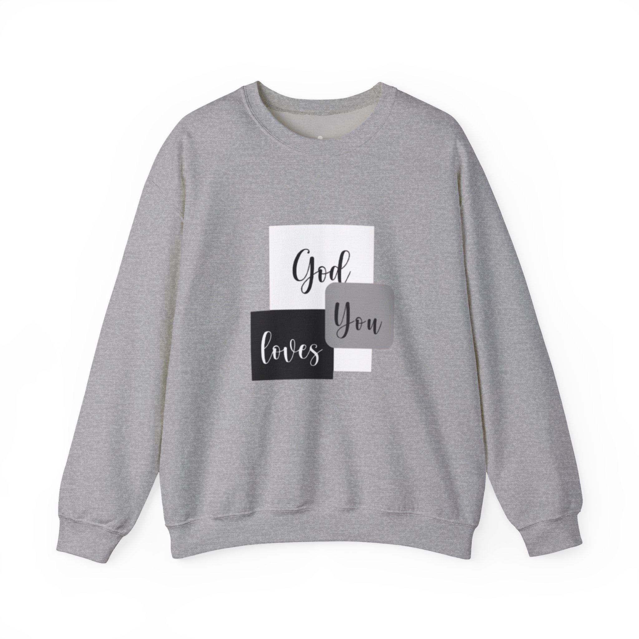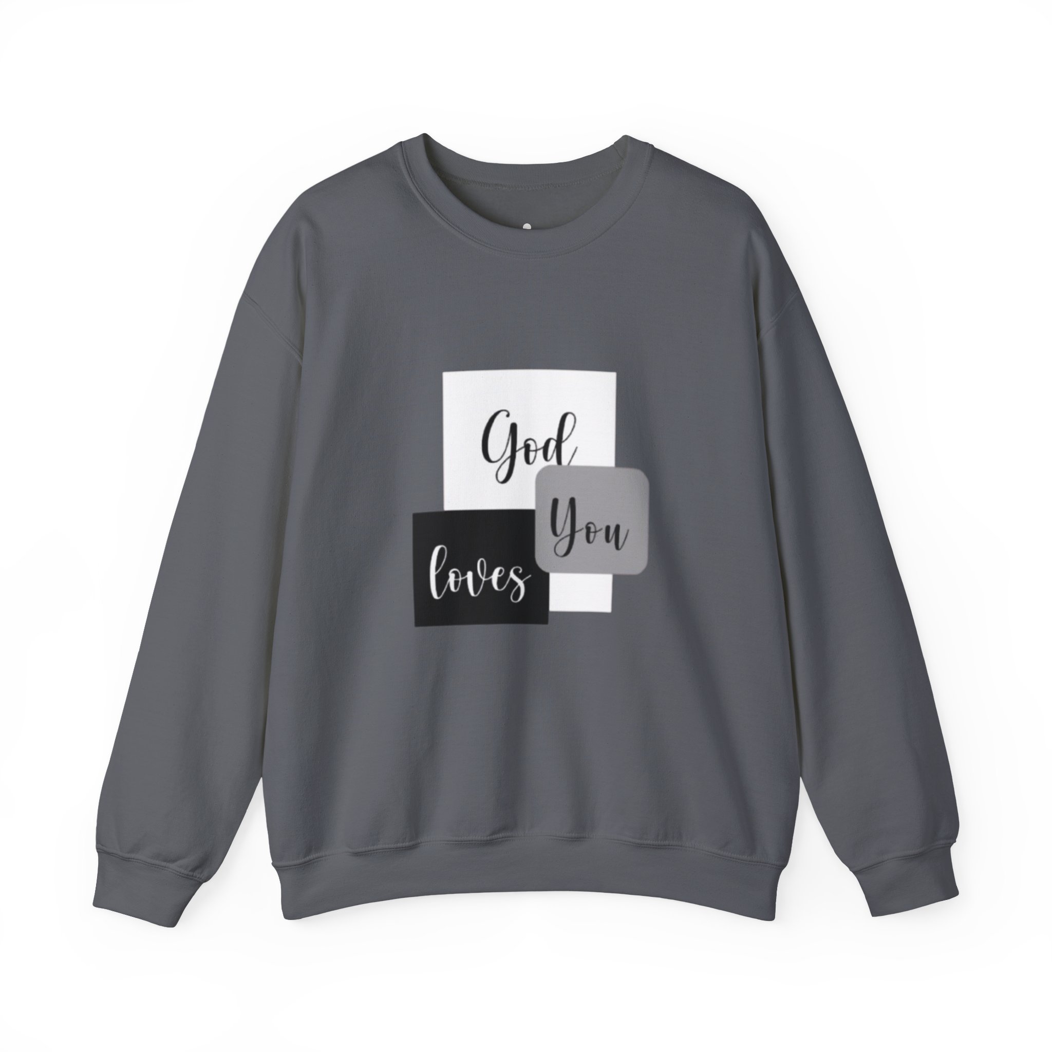 Soft, simple, and quietly confident — this crewneck brings a gentle message into everyday wear. Clean blocks of charcoal and soft gray frame a handwritten-style phrase that reads like a personal note: God loves you. The medium-heavy cotton-poly blend feels substantial without weighing you down, and the classic crew silhouette keeps the look timeless and easy to layer. Subtle embroidery and printed inner labels add refined, thoughtful details that hold up wash after wash. Wear it on slow mornings, church gatherings, or while visiting a friend to offer comfort without saying a word.
