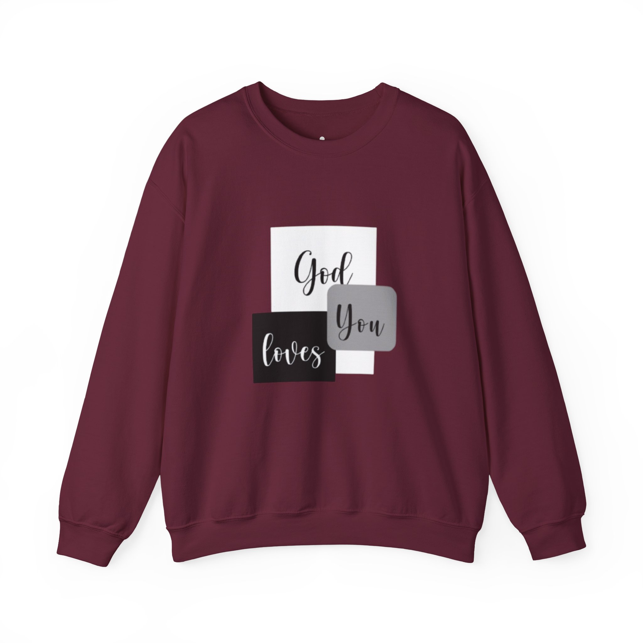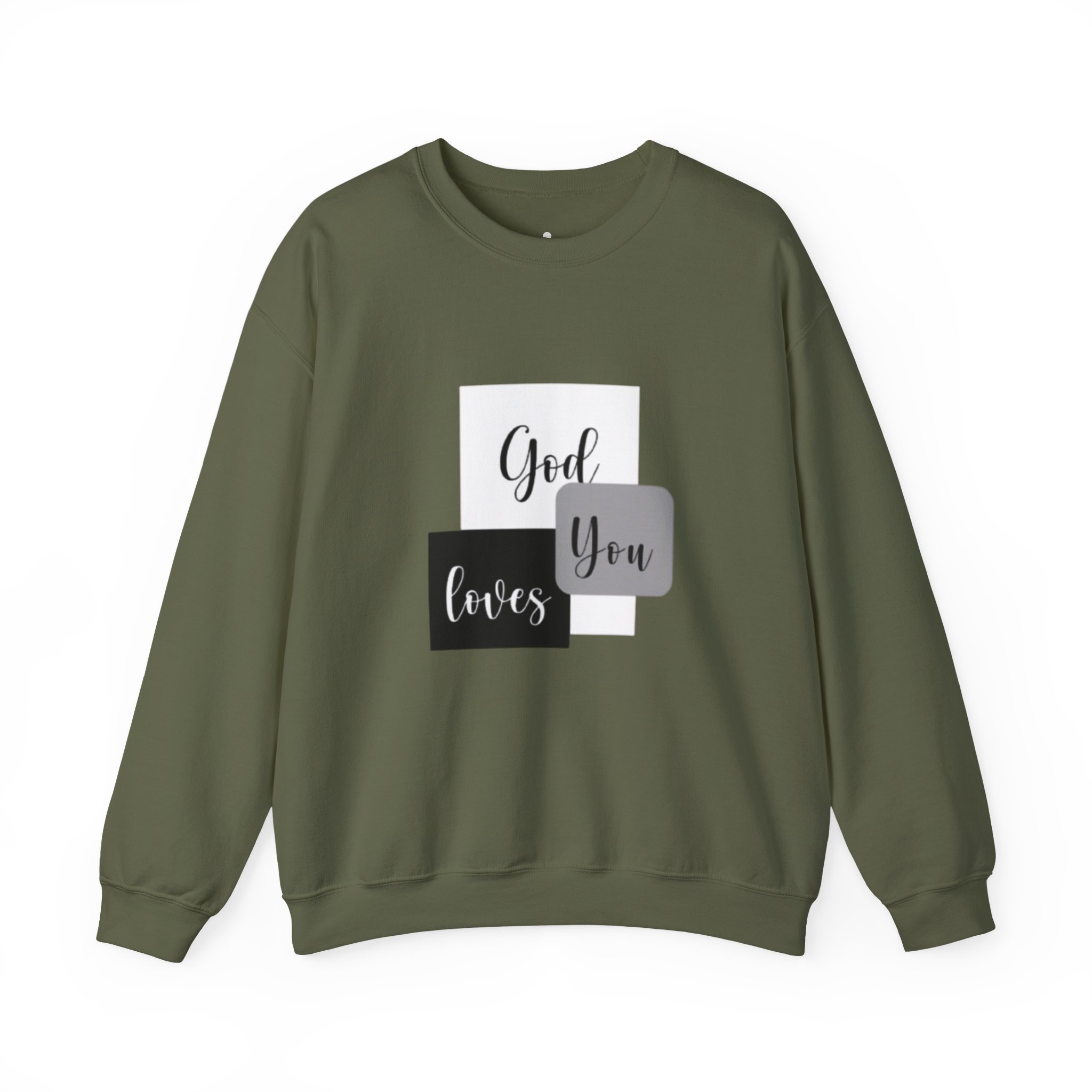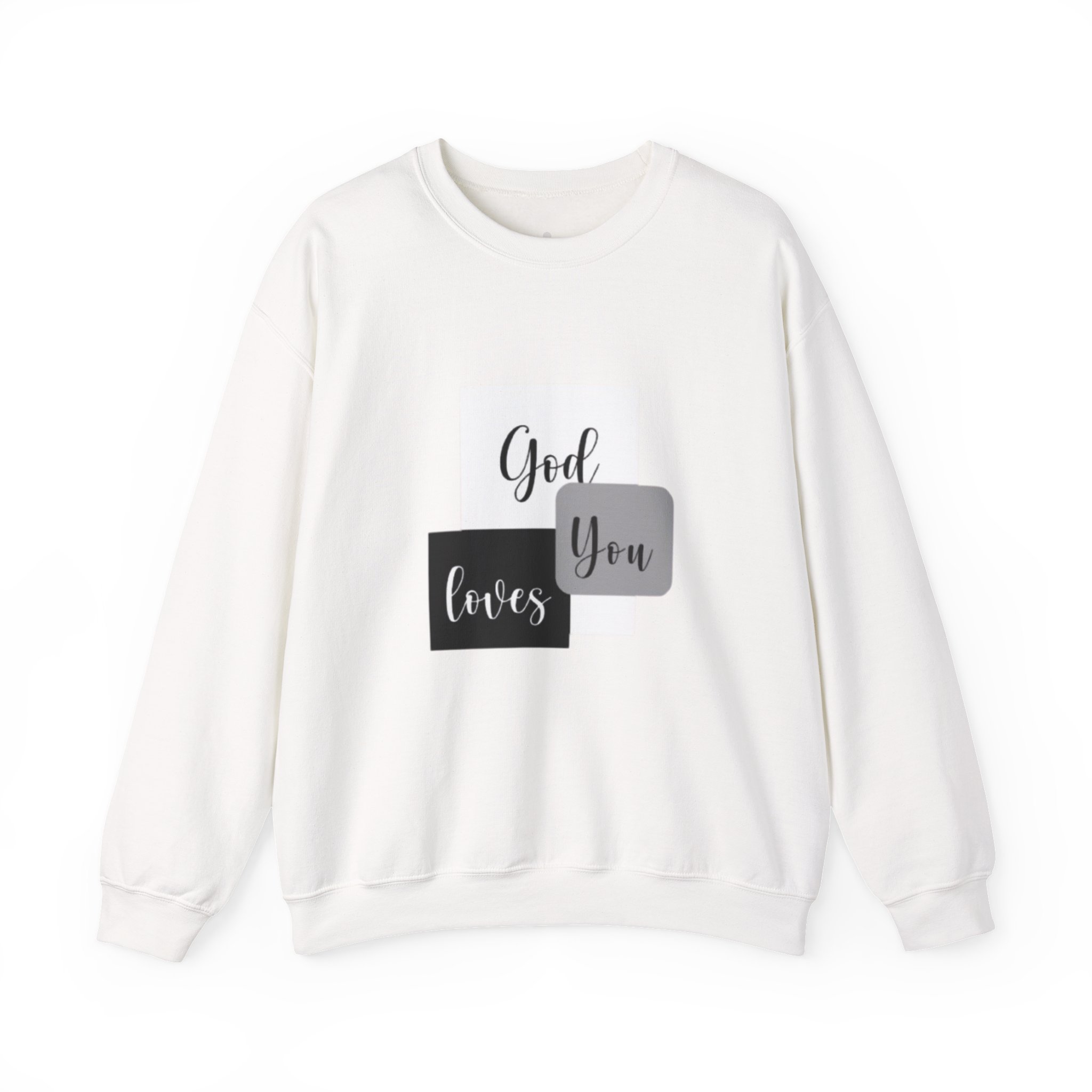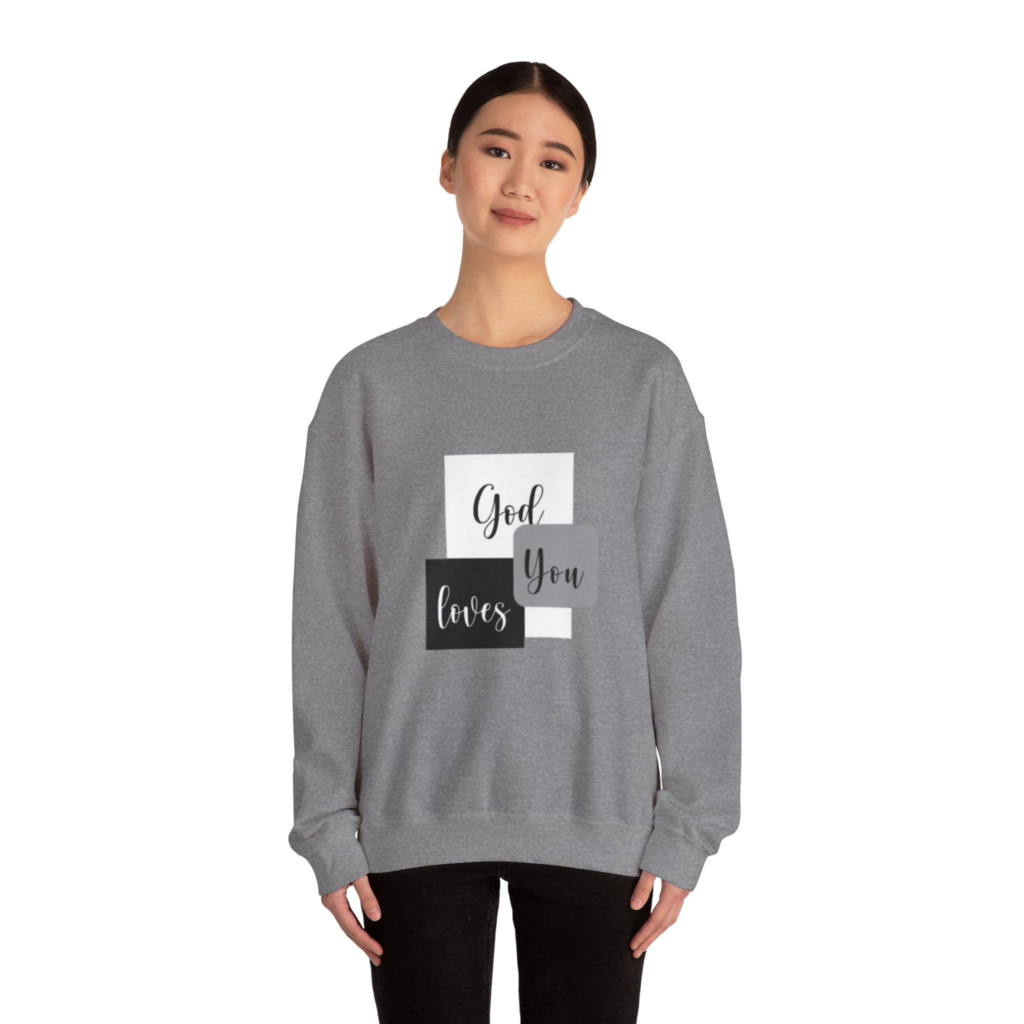 Soft, simple, and quietly confident — this crewneck brings a gentle message into everyday wear. Clean blocks of charcoal and soft gray frame a handwritten-style phrase that reads like a personal note: God loves you. The medium-heavy cotton-poly blend feels substantial without weighing you down, and the classic crew silhouette keeps the look timeless and easy to layer. Subtle embroidery and printed inner labels add refined, thoughtful details that hold up wash after wash. Wear it on slow mornings, church gatherings, or while visiting a friend to offer comfort without saying a word.