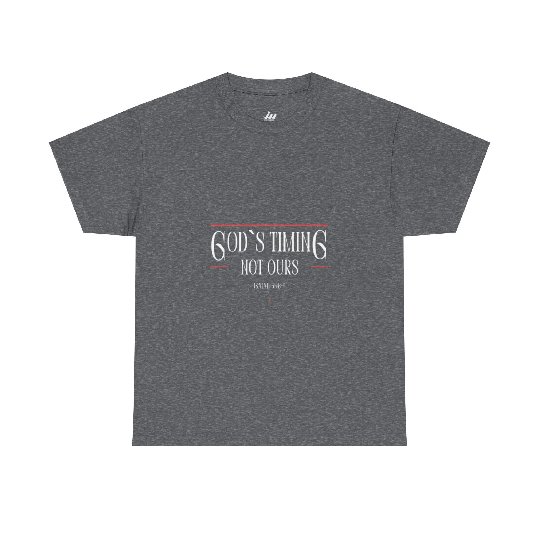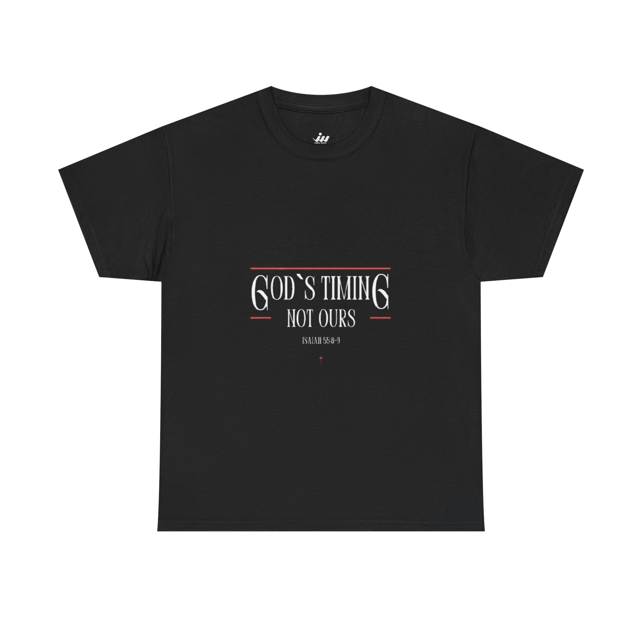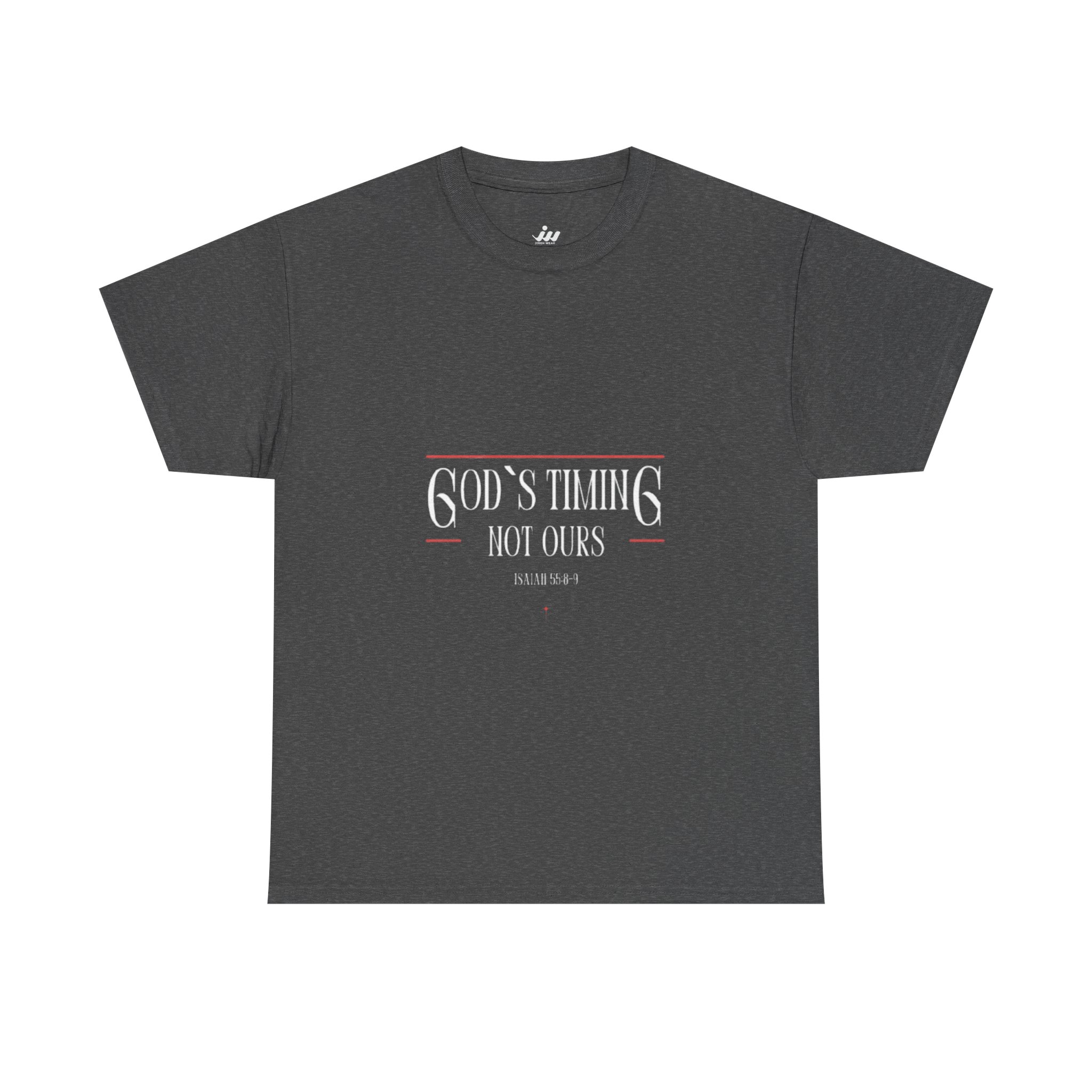 Wear a quiet declaration of faith. This soft, classic tee carries a centered, vintage-inspired text block that reads “God’s Timing Not Ours” with subtle red accents and a scripture reference beneath. The relaxed crew neck and timeless cut make it easy to reach for on rushed mornings or slow Sundays. It drapes comfortably over jeans or layered under a jacket, offering a calm reminder to breathe and trust when plans unravel. The understated design feels thoughtful rather than loud—made for moments of reflection, prayer walks, church gatherings, or simply carrying faith through the everyday hustle.