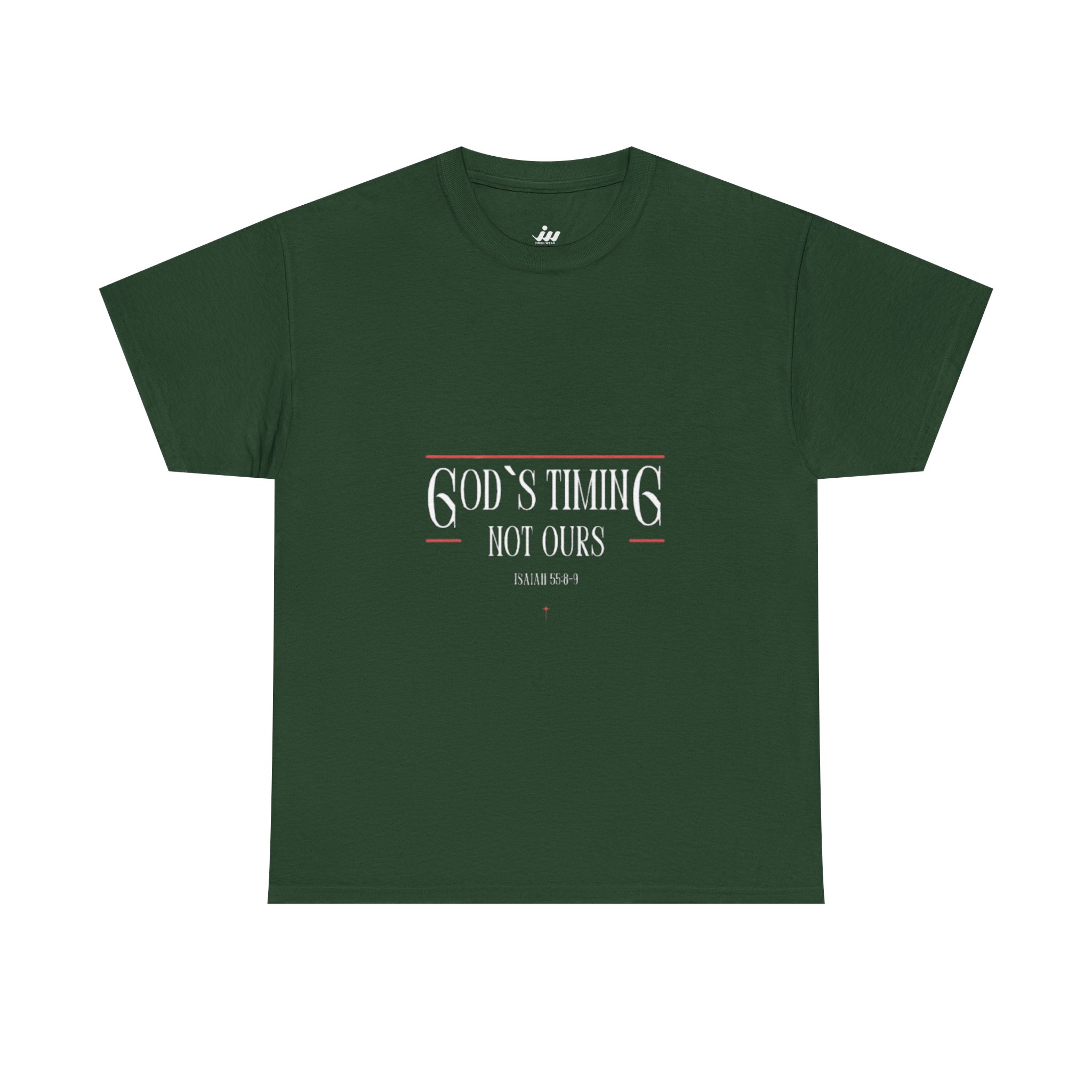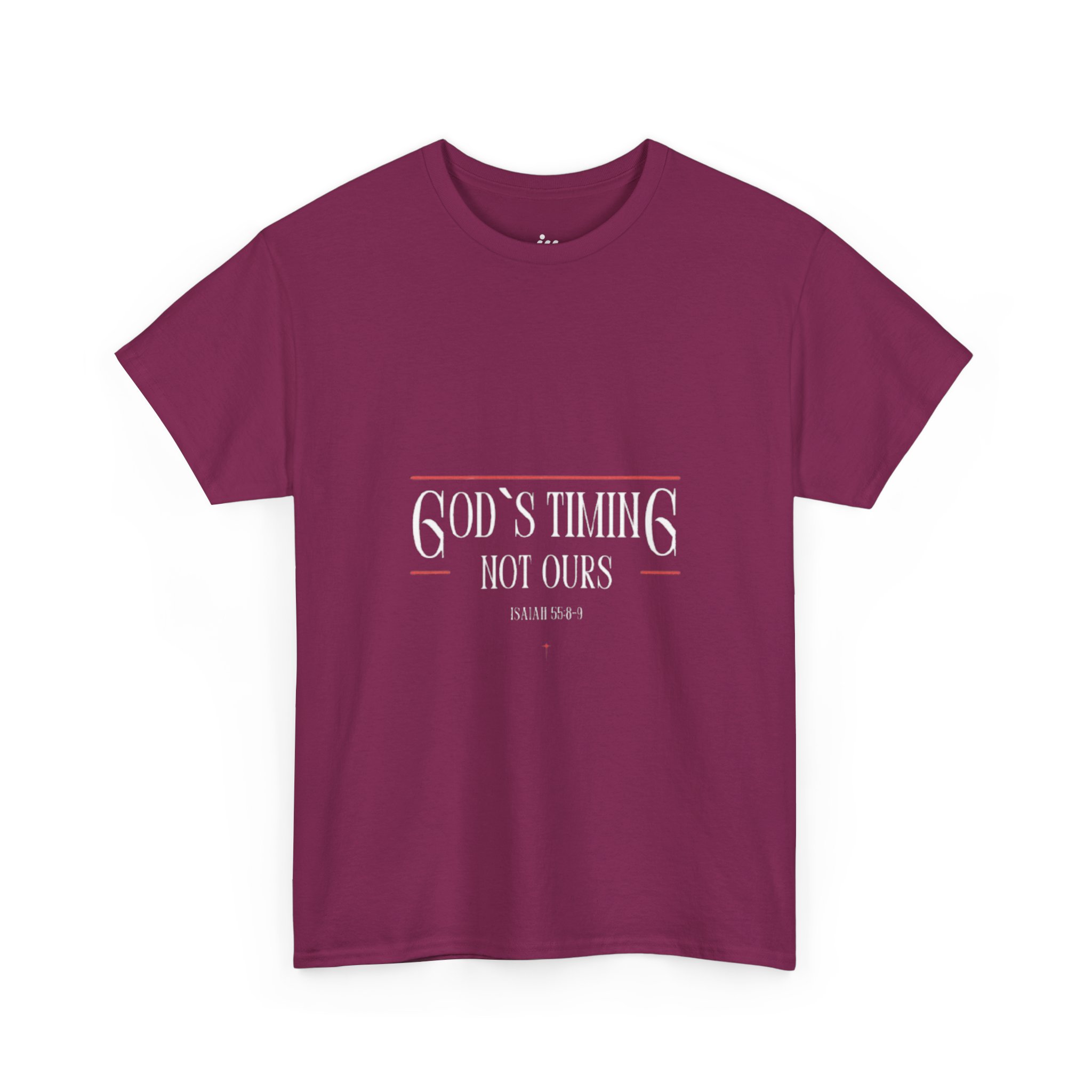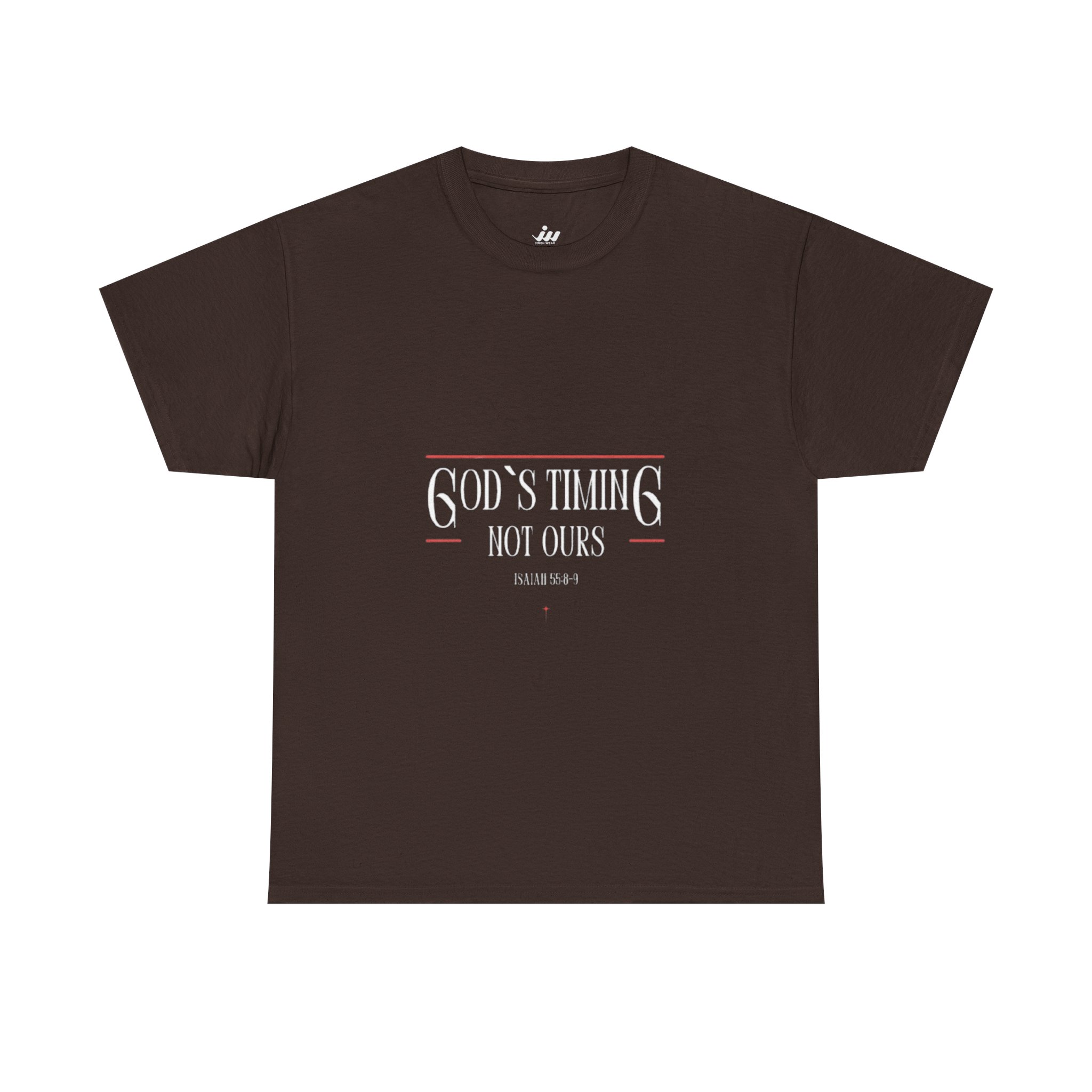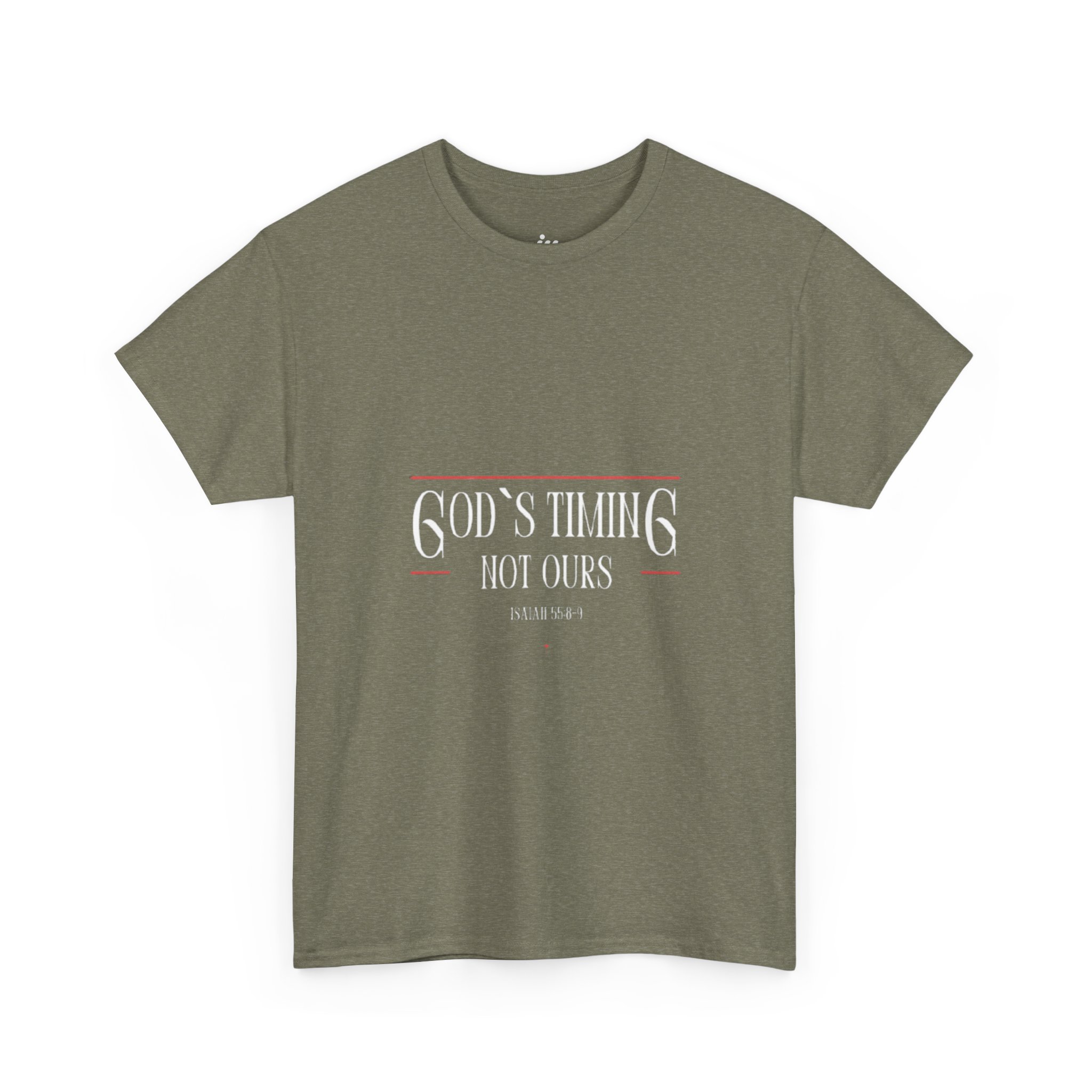 Wear a quiet declaration of faith. This soft, classic tee carries a centered, vintage-inspired text block that reads “God’s Timing Not Ours” with subtle red accents and a scripture reference beneath. The relaxed crew neck and timeless cut make it easy to reach for on rushed mornings or slow Sundays. It drapes comfortably over jeans or layered under a jacket, offering a calm reminder to breathe and trust when plans unravel. The understated design feels thoughtful rather than loud—made for moments of reflection, prayer walks, church gatherings, or simply carrying faith through the everyday hustle.