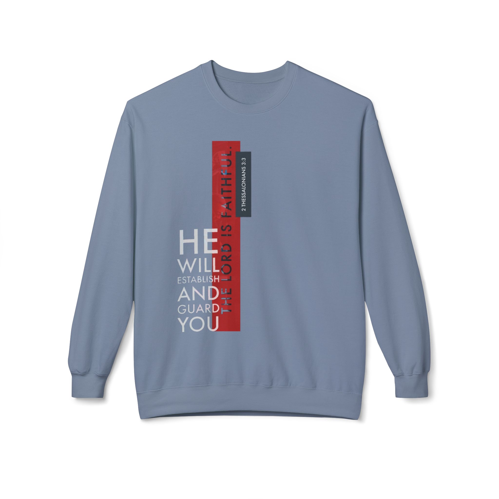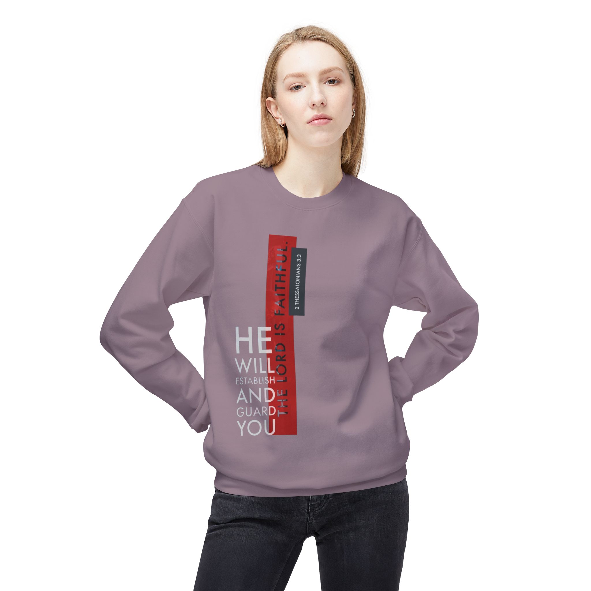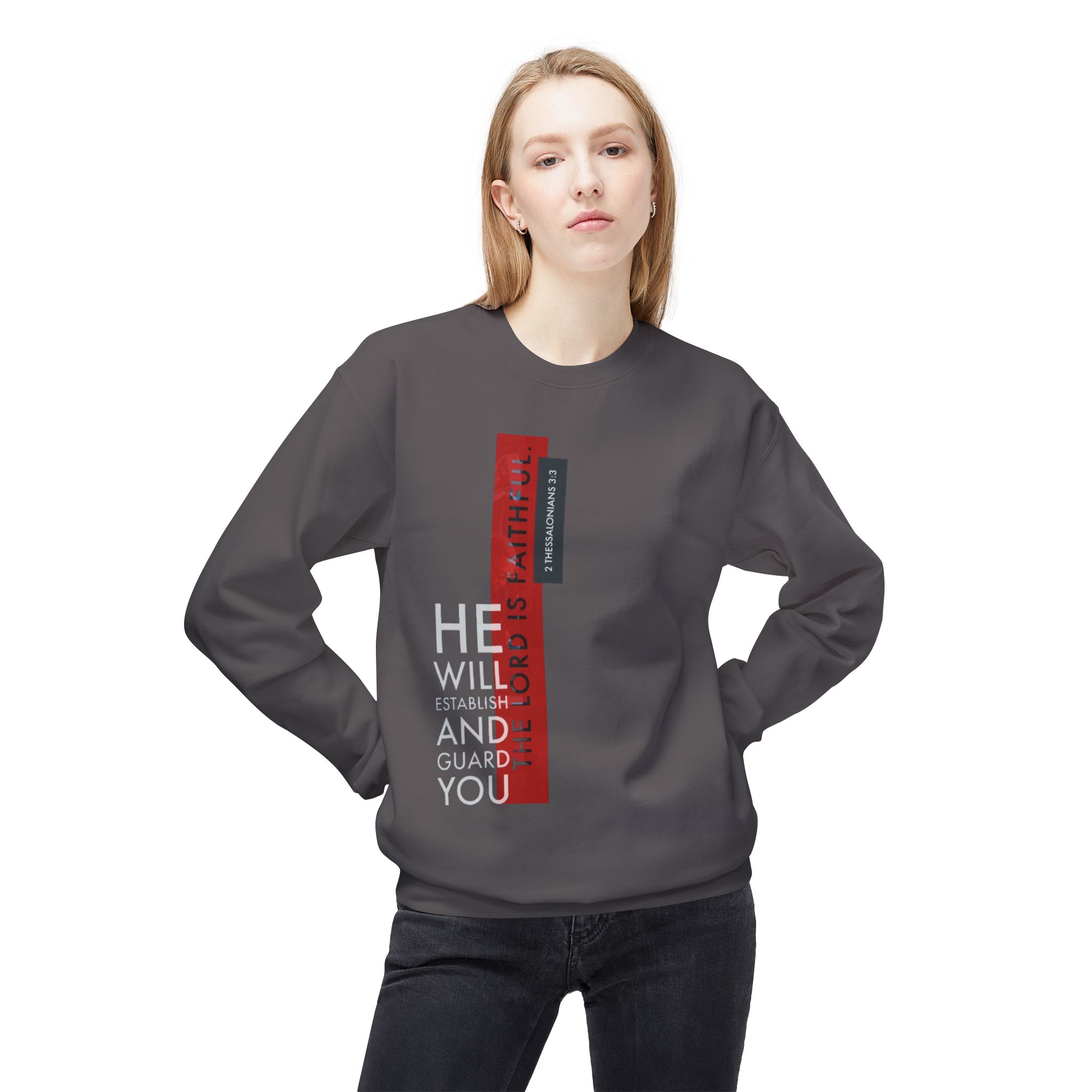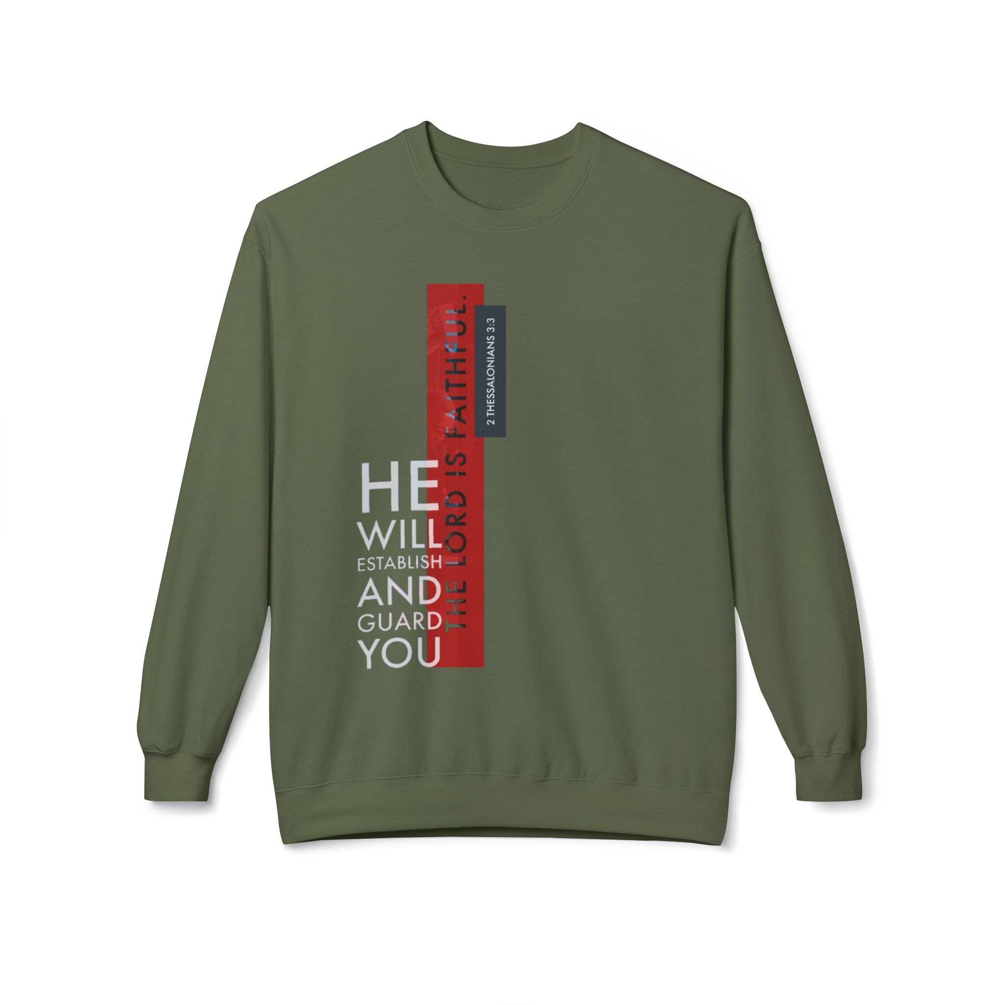 This midweight crewneck sweatshirt carries a quiet, steady confidence. The vertical, typographic design—muted grays and red bars—reads like a modern proclamation on an olive canvas. It settles into the shoulder and torso with a relaxed drop-shoulder silhouette, warm and substantial without feeling bulky. Wear it on cool mornings at the coffee shop, layered for evening walks, or as a comforting layer during reflective moments at home. The tear-away label and soft ring-spun cotton blend keep attention off tags and on the feeling: calm, held, and steady. Subtle yet purposeful, it complements anyone who values pared-back design and reliable comfort.