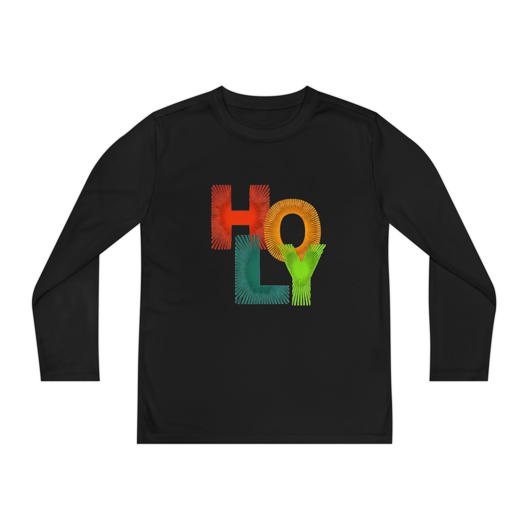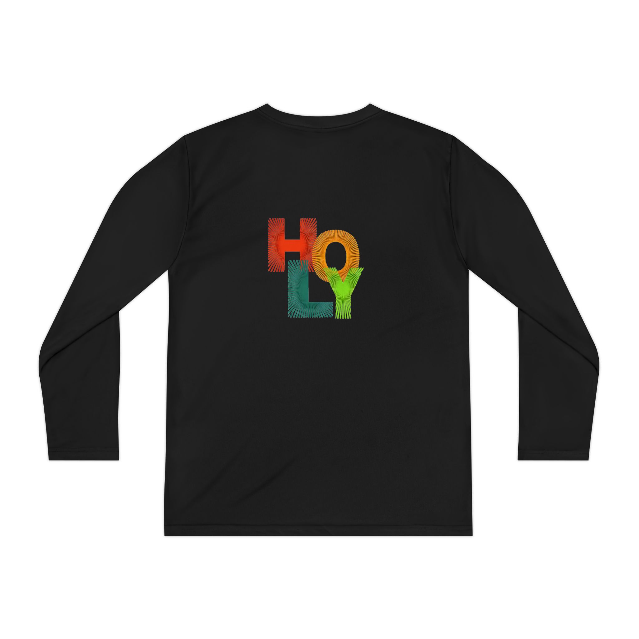 Lightweight, athletic long sleeve built for active kids who move nonstop. The vibrant, textured “HOLY” design pops against the black fabric — colors that stay bright thanks to durable Direct-to-Film printing. Breathable, moisture-wicking 100% polyester keeps young athletes cool and dry during practices, recess, or weekend adventures. The athletic cut and extra-light 3.8 oz fabric let them run, jump, and stretch without feeling weighed down. A tear-away label adds comfort and makes dressing quick and simple. This tee layers easily under hoodies or stands alone when the game gets intense.