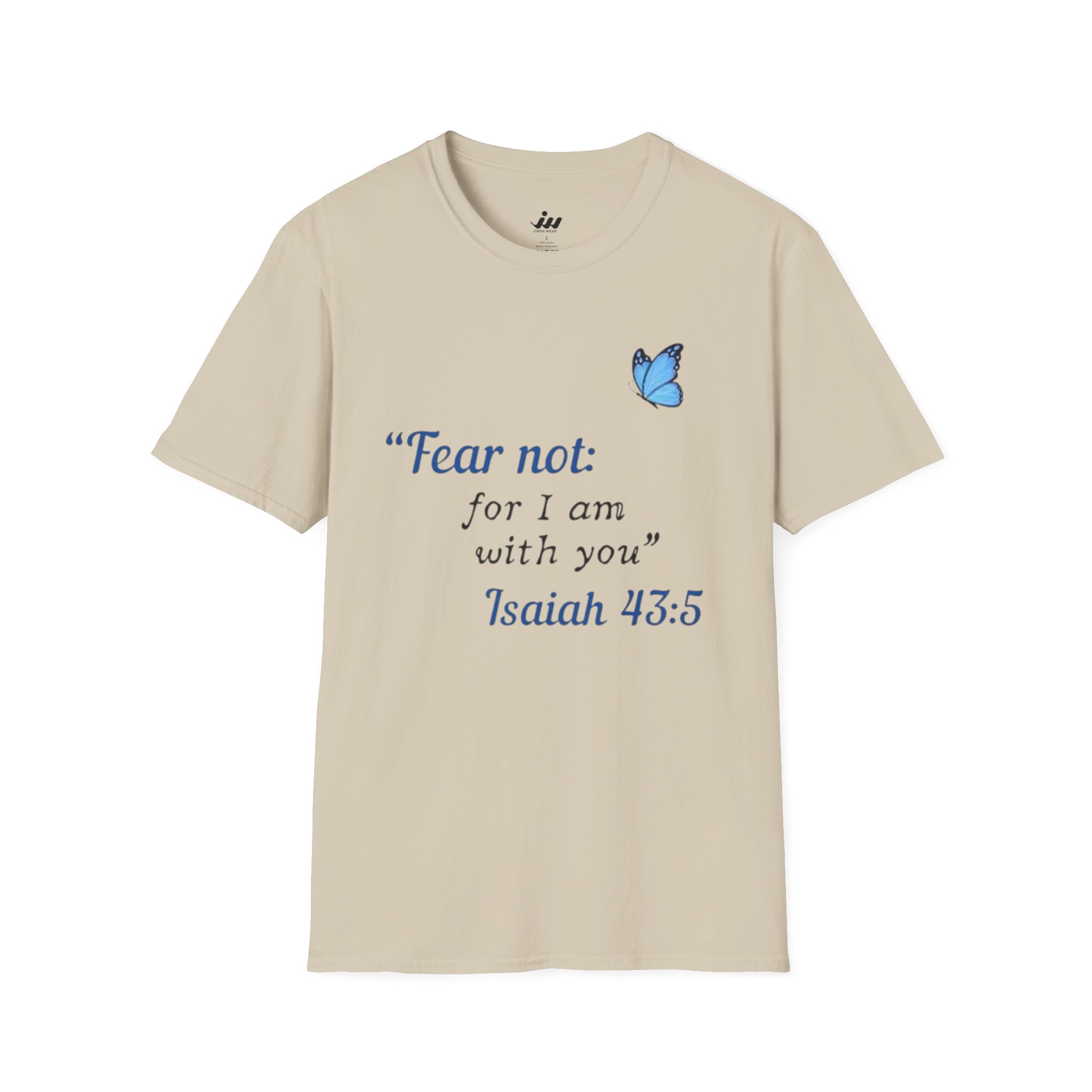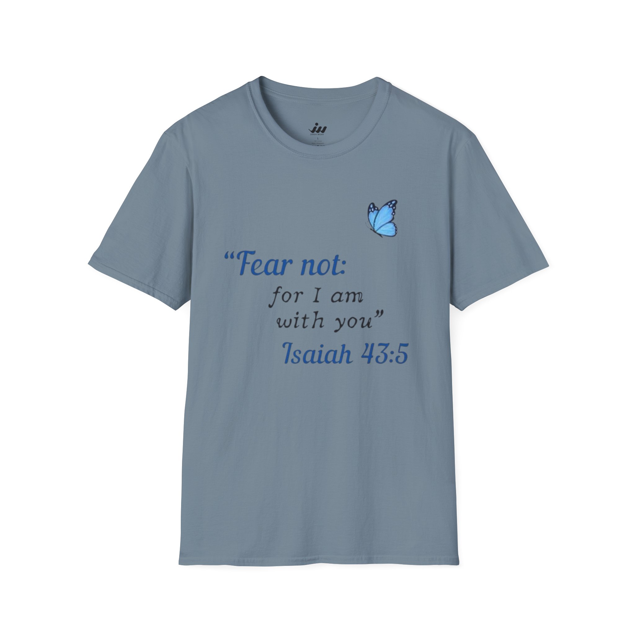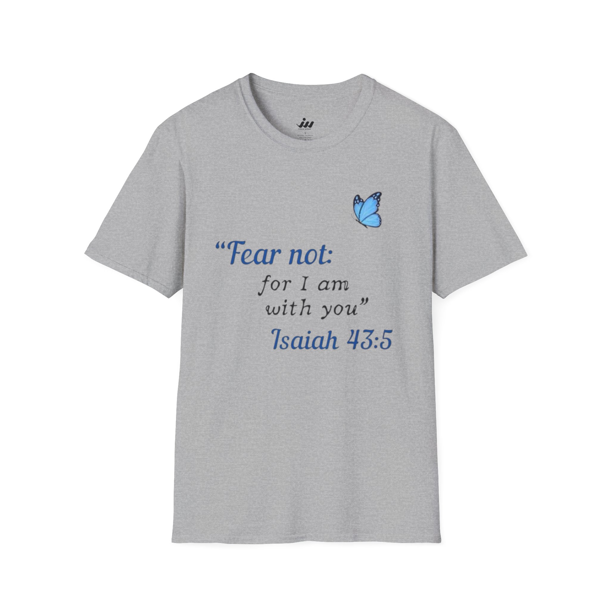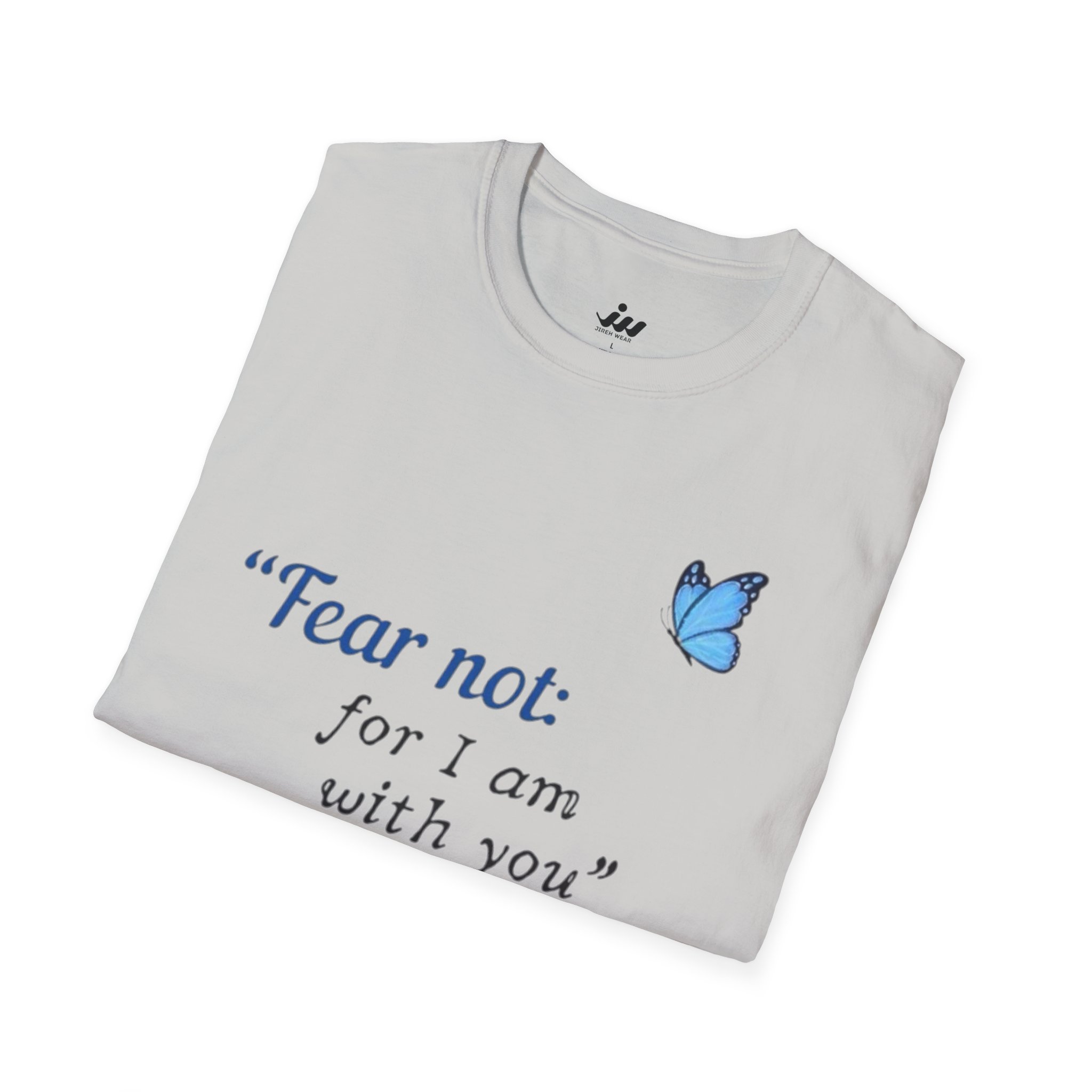Soft, gentle, and quietly hopeful — this lightweight tee carries a small, meaningful message. A delicate blue butterfly floats beside the words “Fear not: for I am with you” Isaiah 43:5, printed in an elegant serif that feels like a handwritten promise. The crew-neck silhouette and classic fit keep the design feeling calm and wearable: layer it under a cardigan, wear it on a slow Sunday, or slip it on when you need a little extra reassurance. The white fabric and subtle blue print make the message easy to read without shouting, letting faith and comfort speak softly. This shirt moves with you, holds its shape, and becomes a steady, familiar piece in quiet mornings and gentle gatherings.