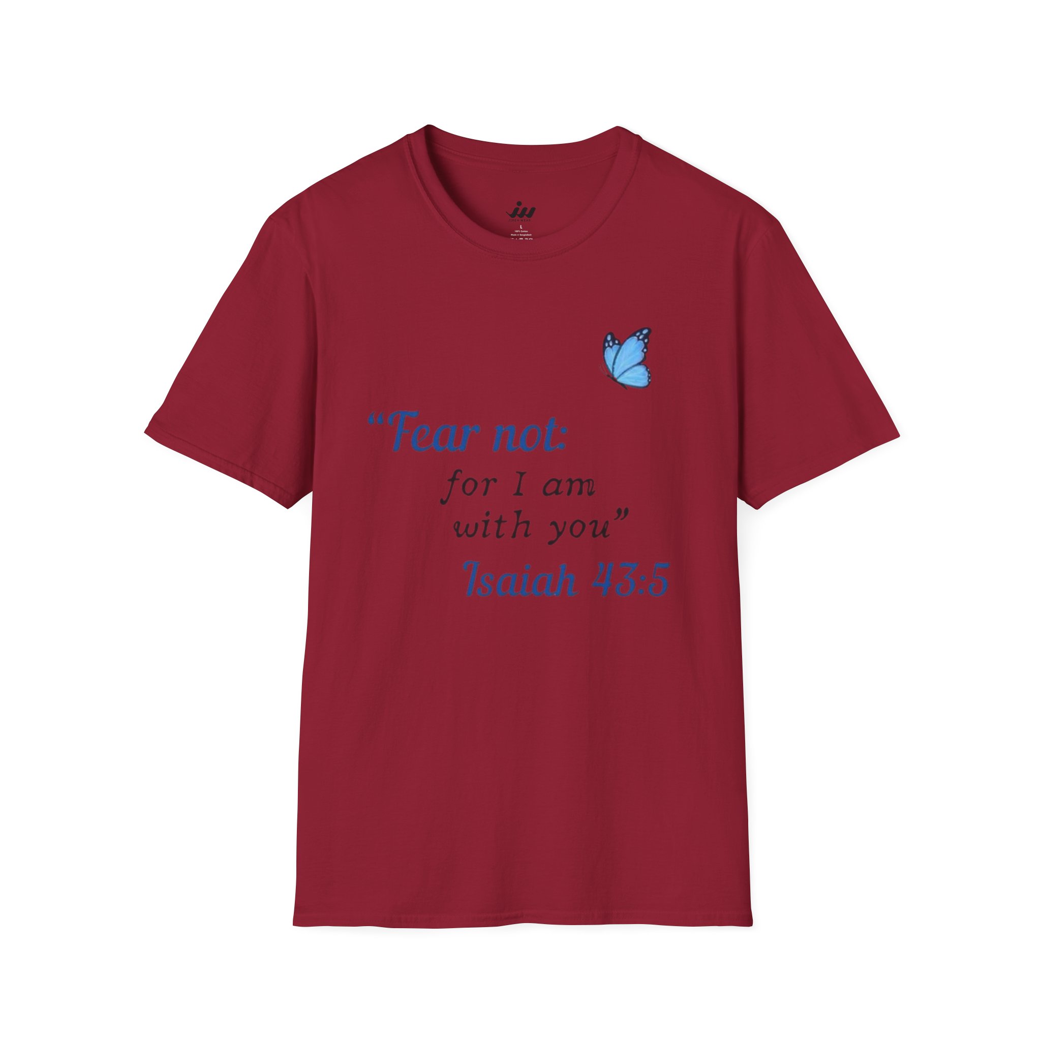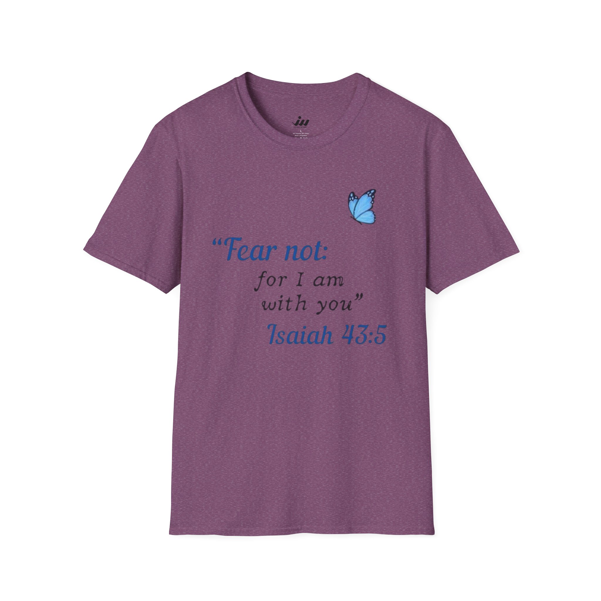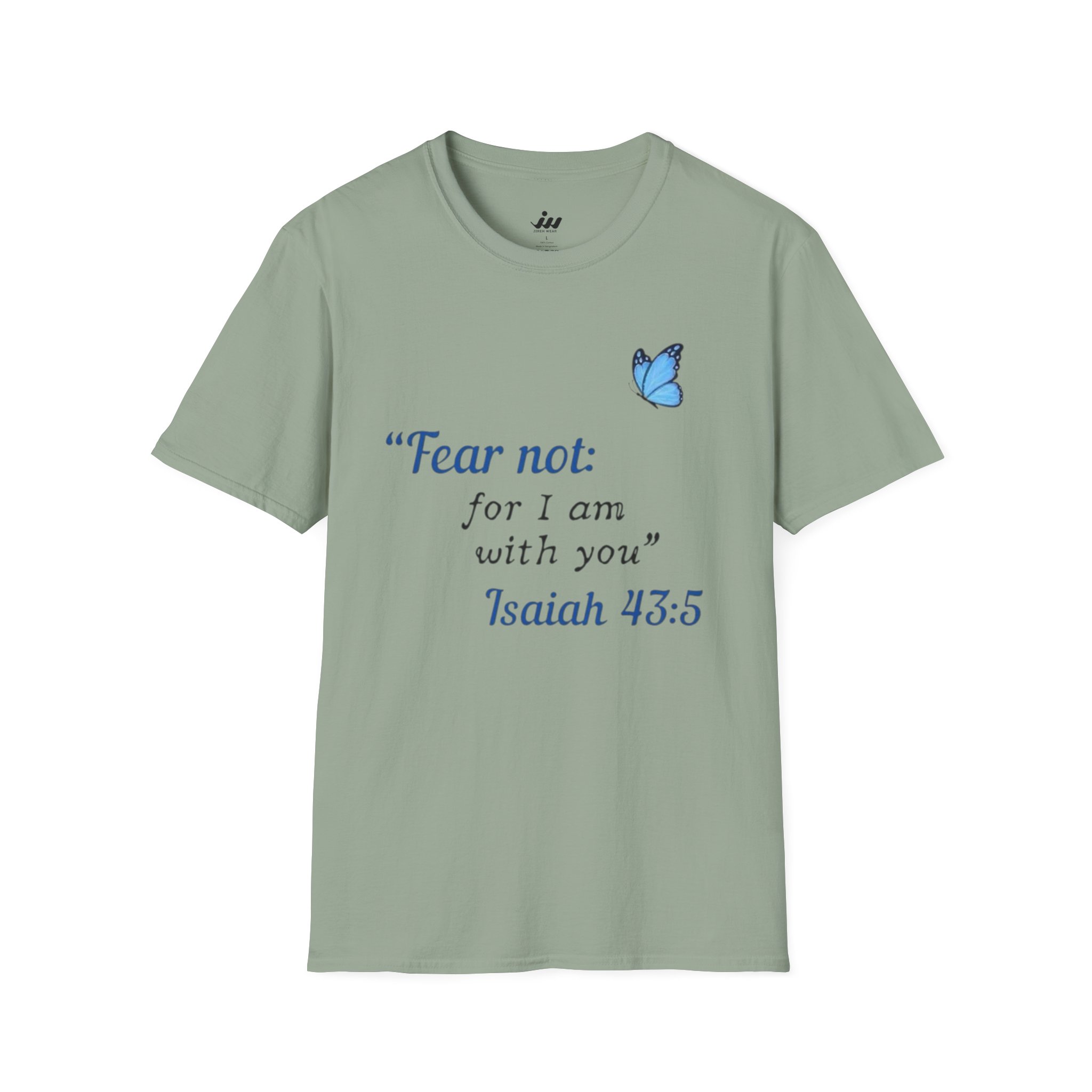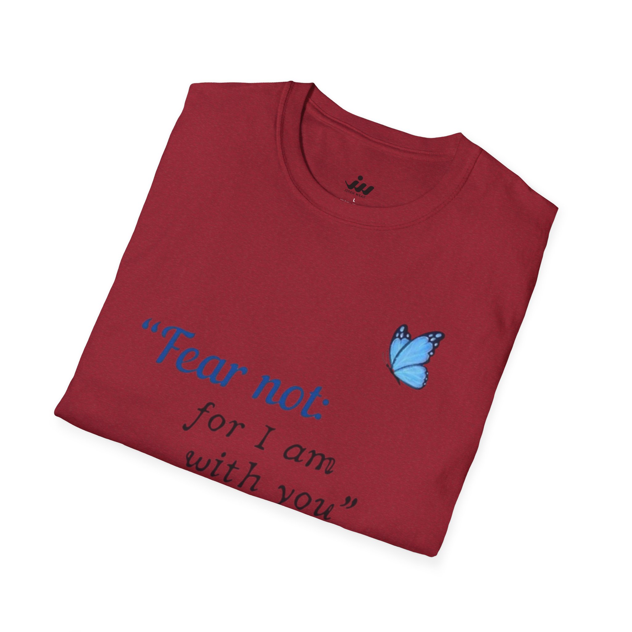 Soft, gentle, and quietly hopeful — this lightweight tee carries a small, meaningful message. A delicate blue butterfly floats beside the words “Fear not: for I am with you” Isaiah 43:5, printed in an elegant serif that feels like a handwritten promise. The crew-neck silhouette and classic fit keep the design feeling calm and wearable: layer it under a cardigan, wear it on a slow Sunday, or slip it on when you need a little extra reassurance. The white fabric and subtle blue print make the message easy to read without shouting, letting faith and comfort speak softly. This shirt moves with you, holds its shape, and becomes a steady, familiar piece in quiet mornings and gentle gatherings.