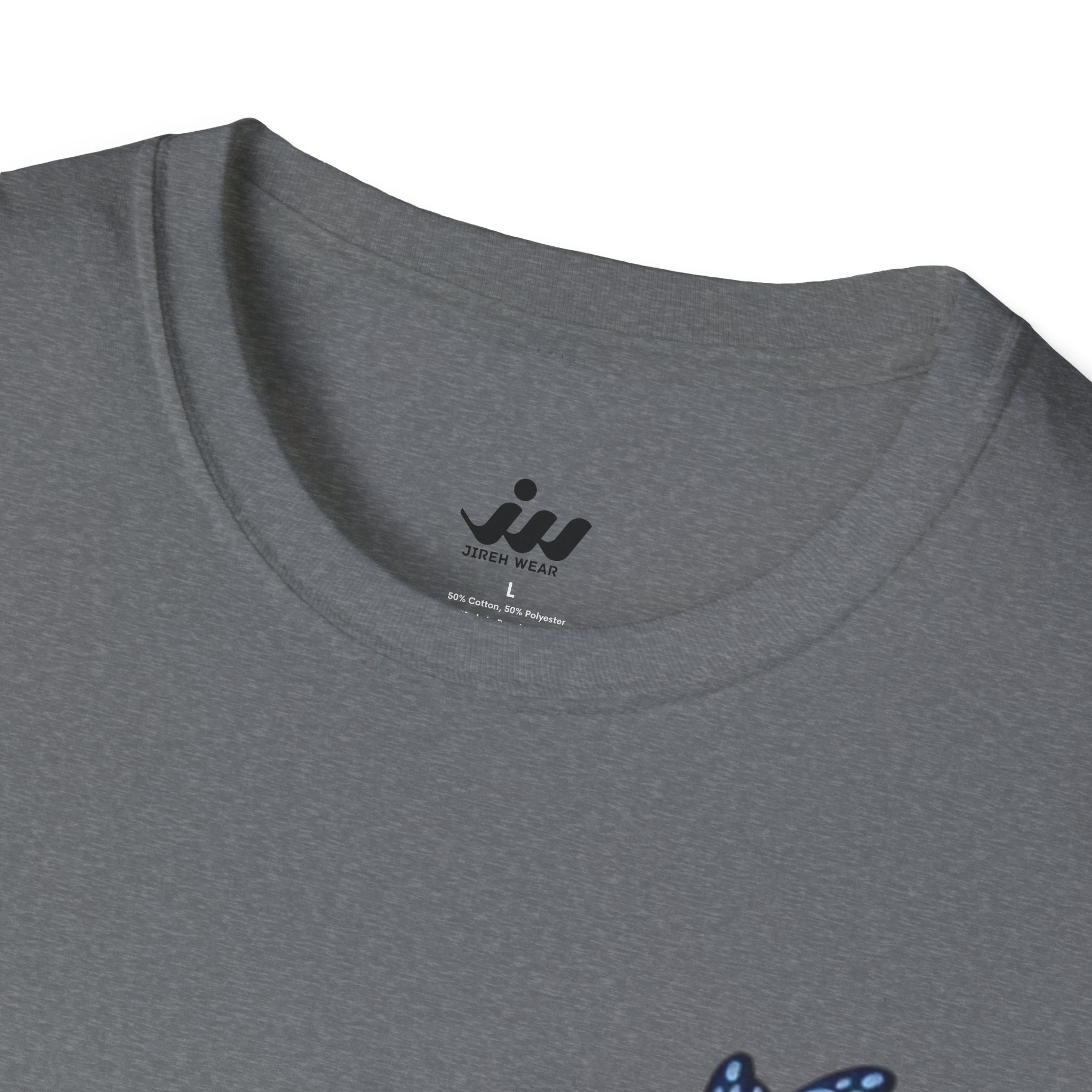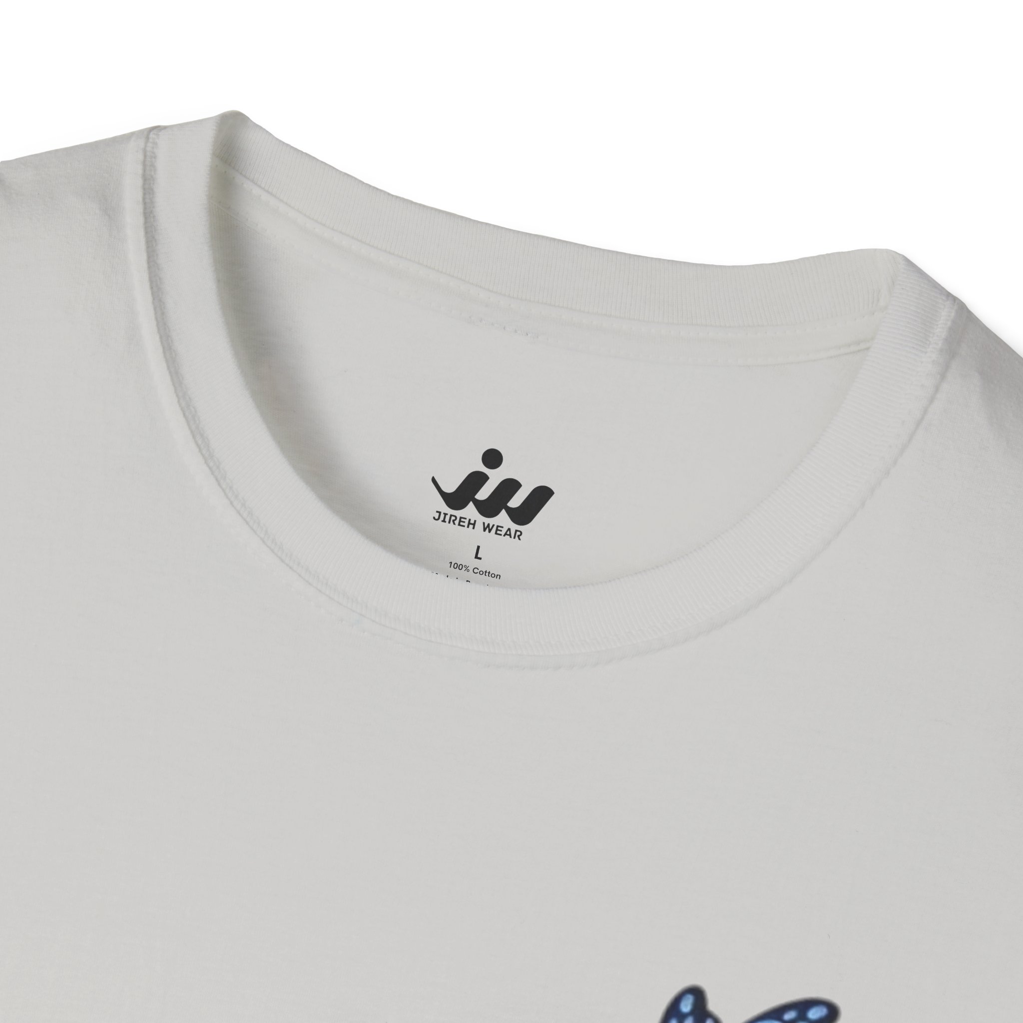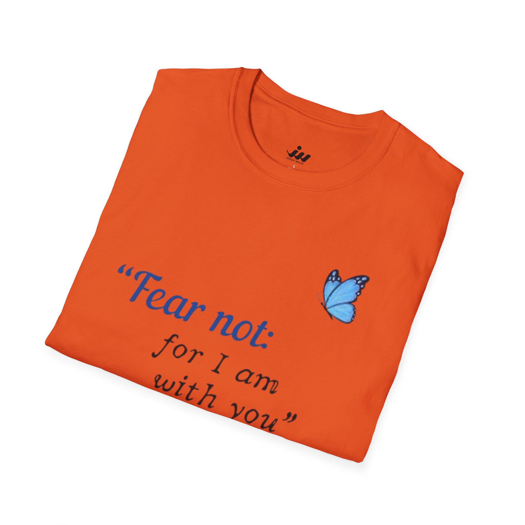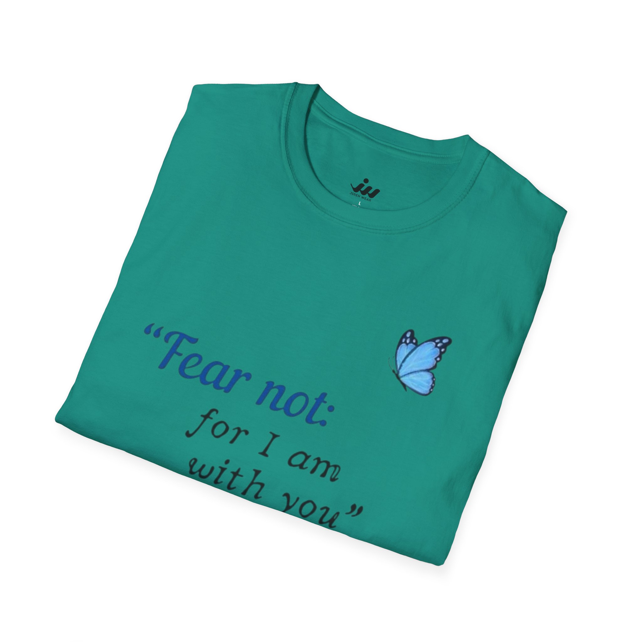 Soft, gentle, and quietly hopeful — this lightweight tee carries a small, meaningful message. A delicate blue butterfly floats beside the words “Fear not: for I am with you” Isaiah 43:5, printed in an elegant serif that feels like a handwritten promise. The crew-neck silhouette and classic fit keep the design feeling calm and wearable: layer it under a cardigan, wear it on a slow Sunday, or slip it on when you need a little extra reassurance. The white fabric and subtle blue print make the message easy to read without shouting, letting faith and comfort speak softly. This shirt moves with you, holds its shape, and becomes a steady, familiar piece in quiet mornings and gentle gatherings.