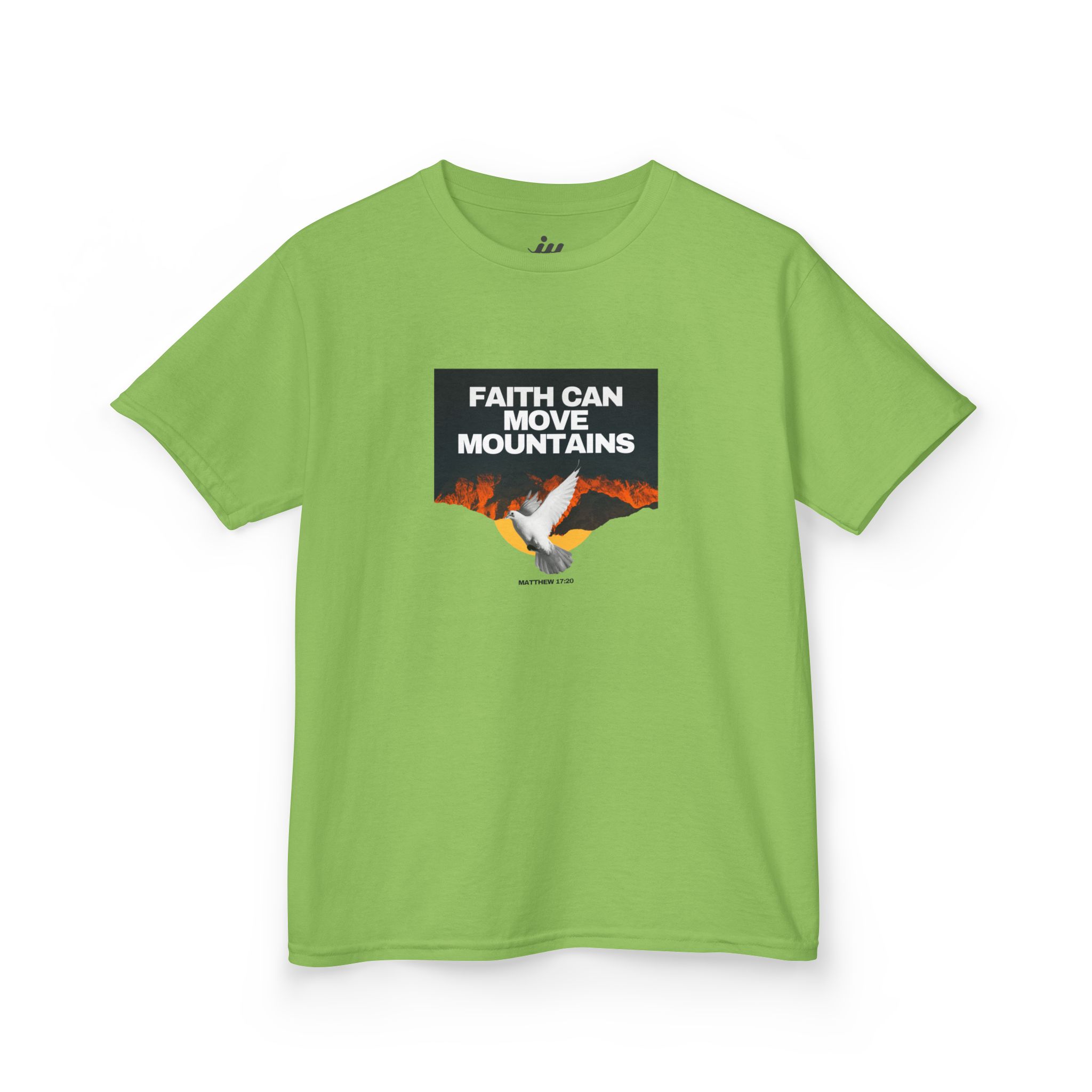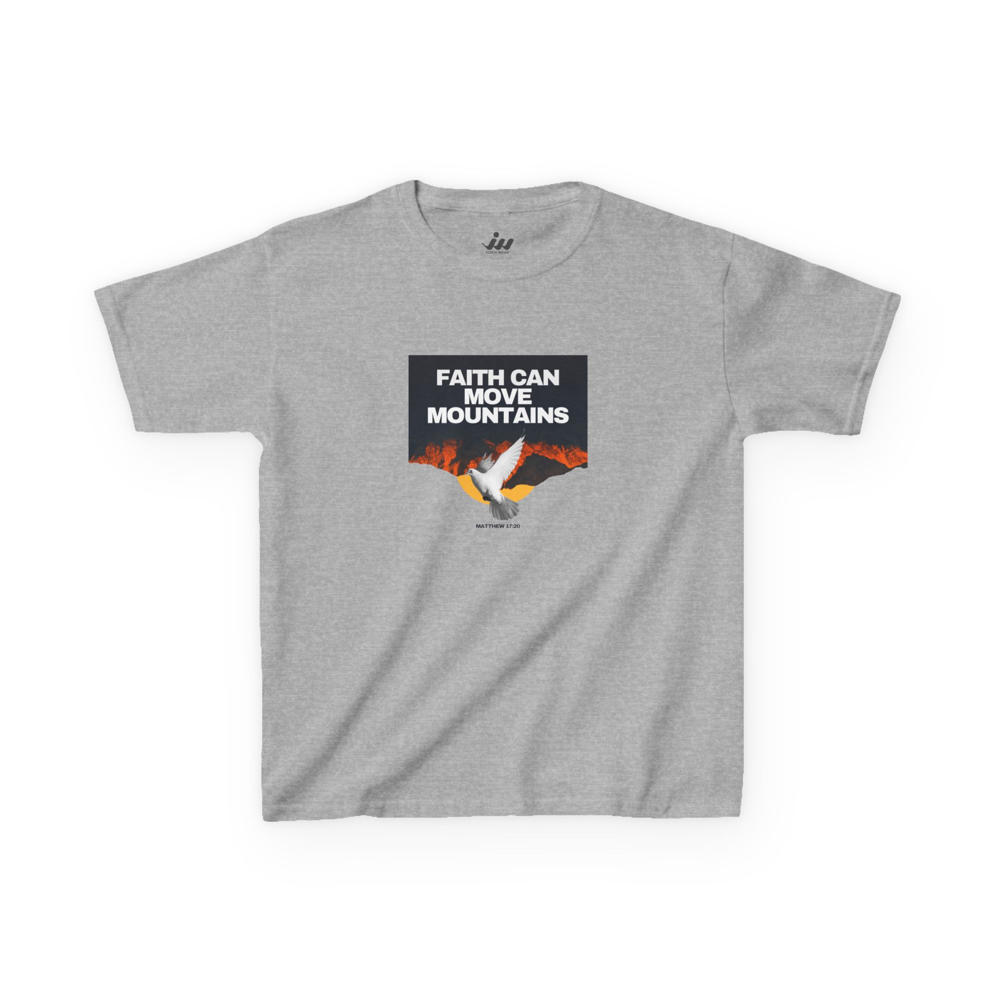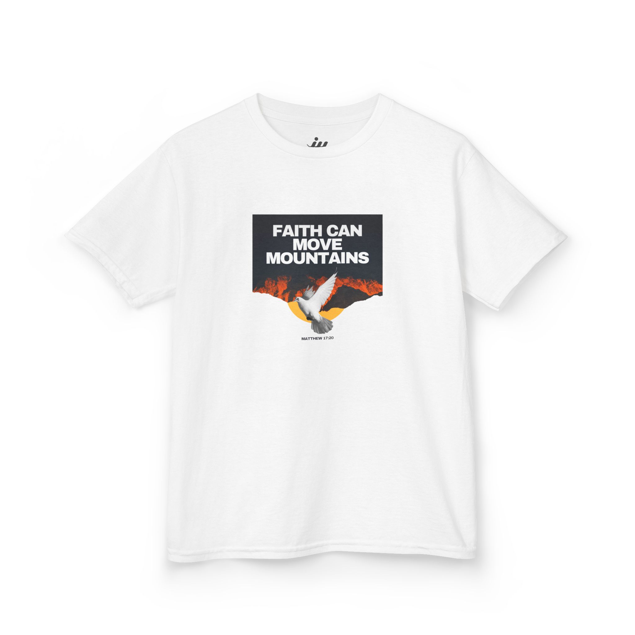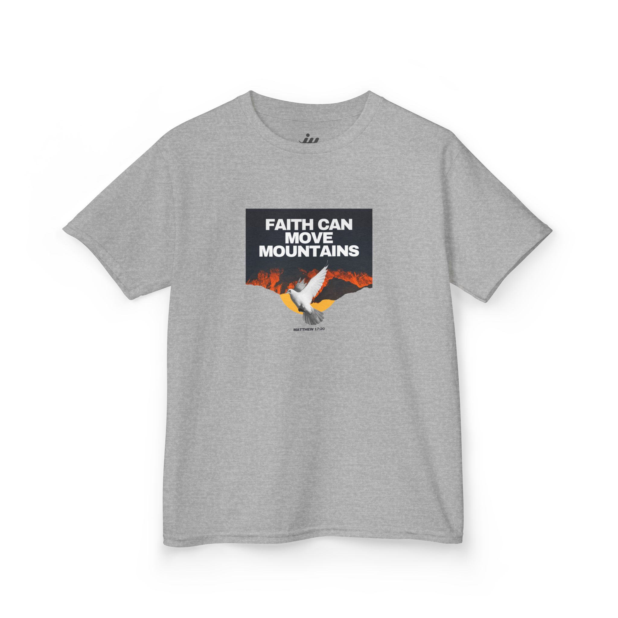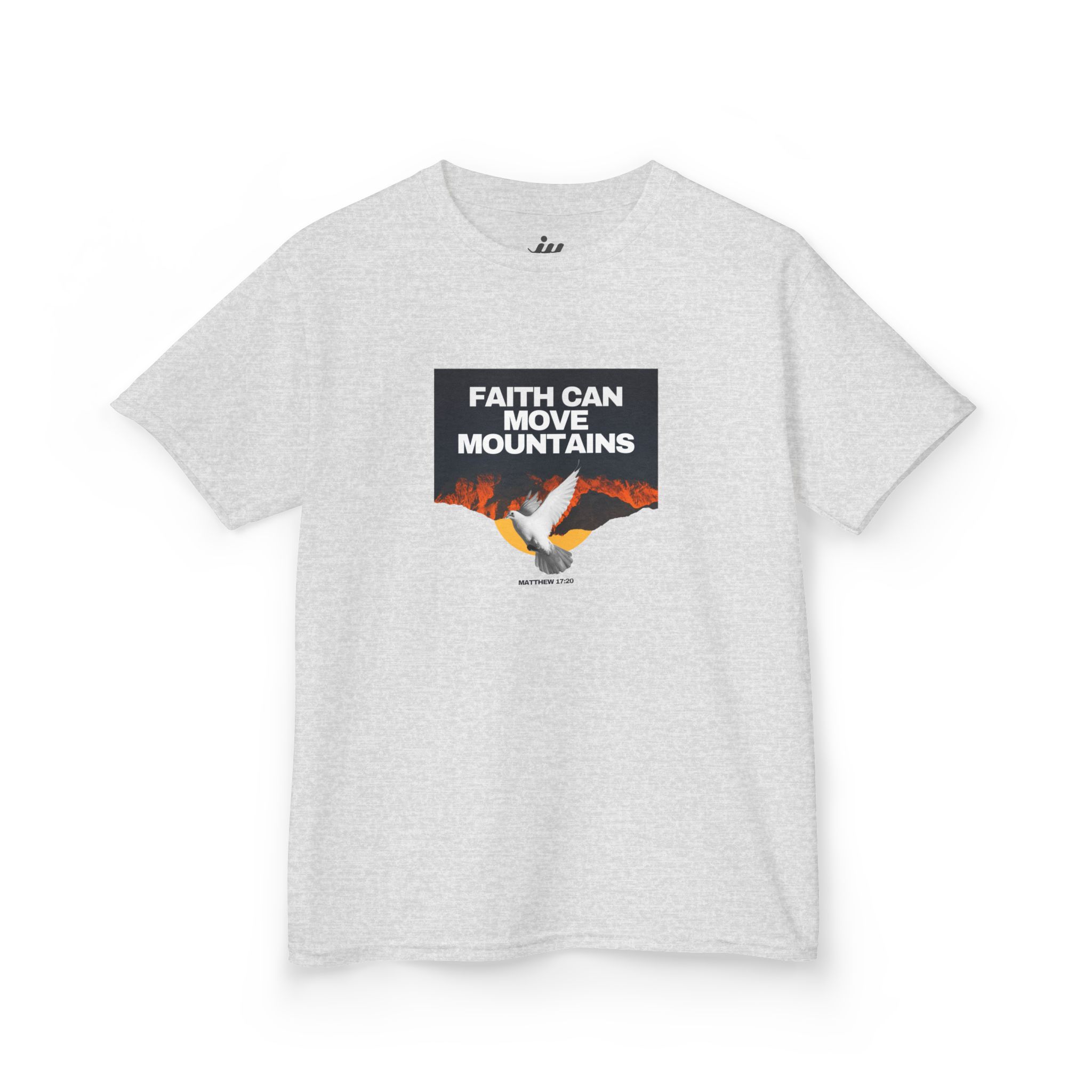 A soft, midweight kids tee printed with a bold, inspiring graphic: “FAITH CAN MOVE MOUNTAINS” set above a stylized mountain silhouette and a soaring dove. The clean crew neckline and classic cut make this shirt easy to layer or wear on its own. Breathable 100% US cotton (midweight) gives it everyday durability while staying gentle on young skin. Ethically sourced and Oeko‑Tex certified, this tee carries a quiet promise—confidence and calm for little ones facing big days.