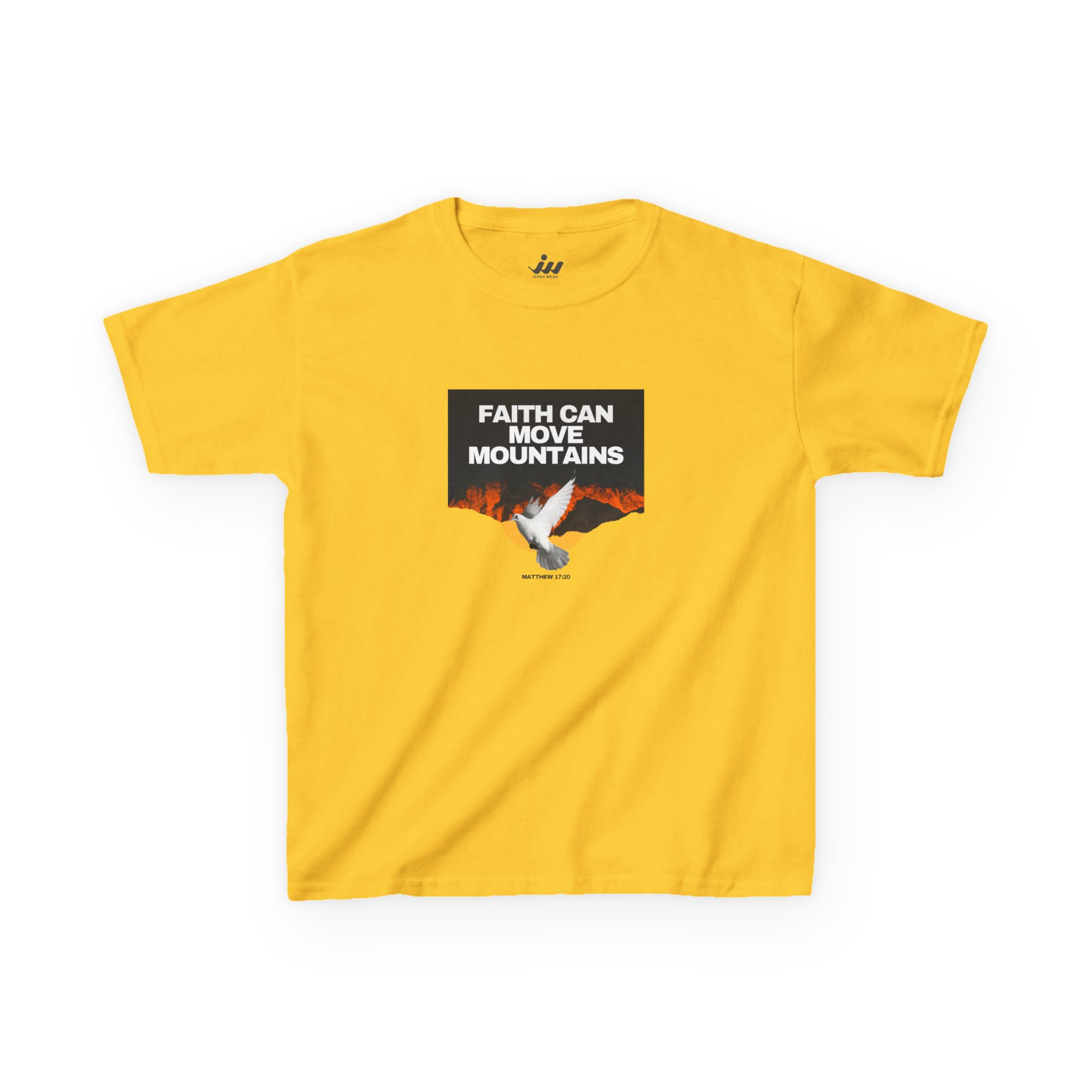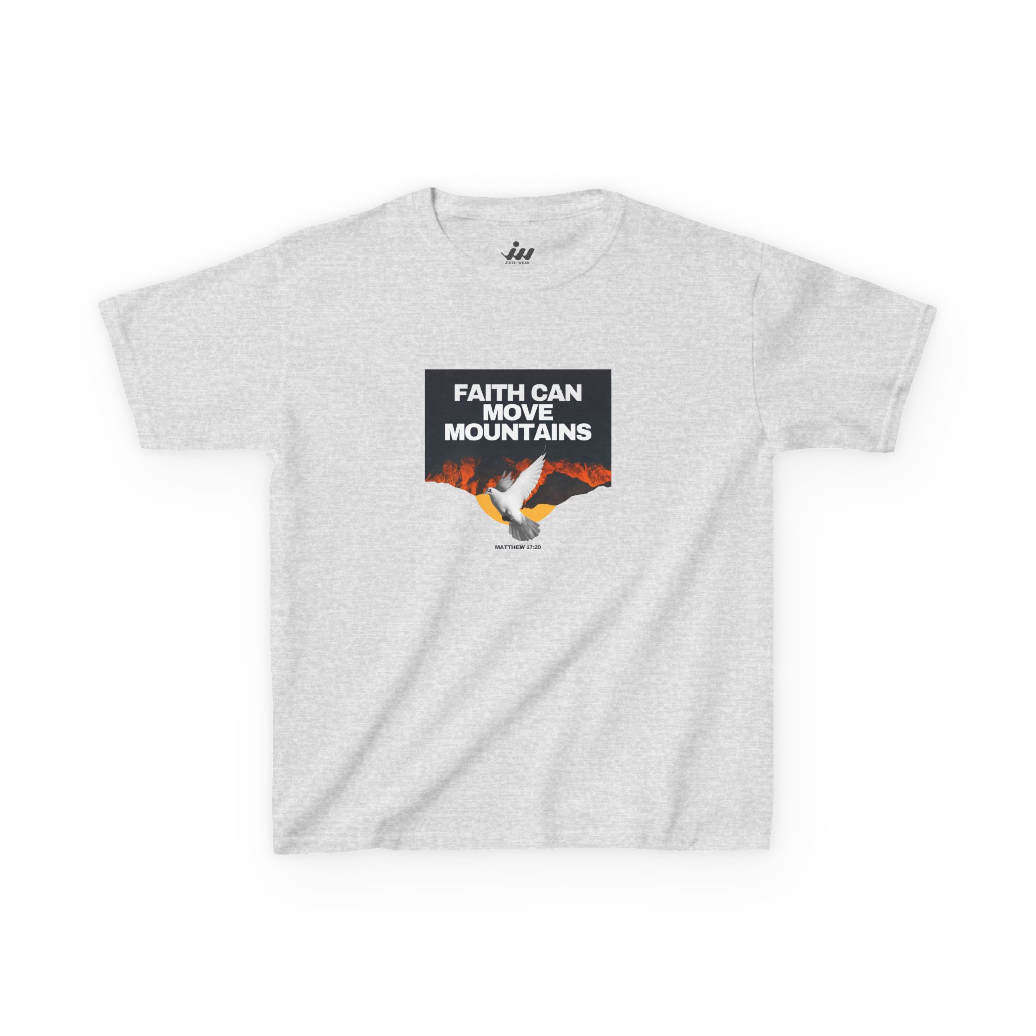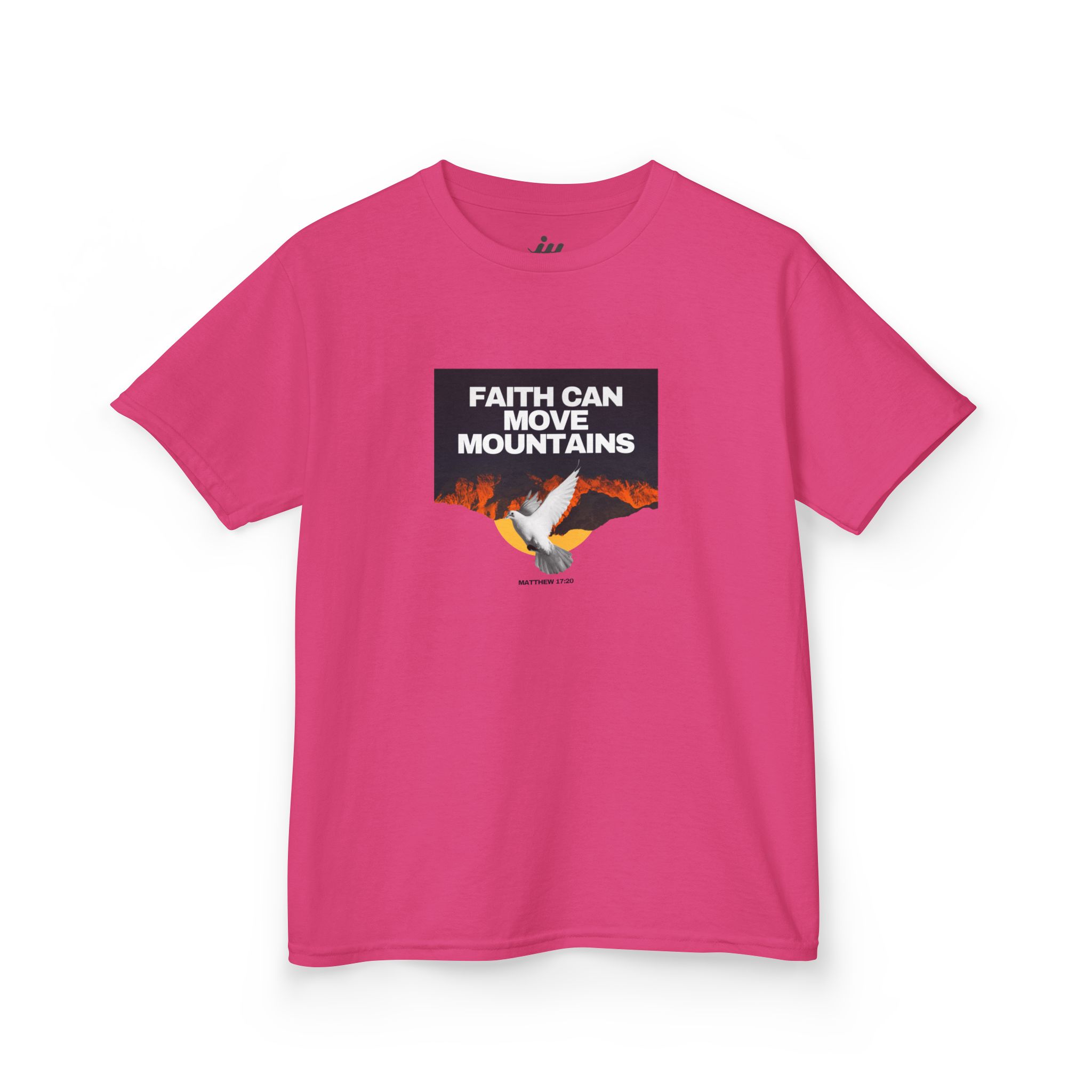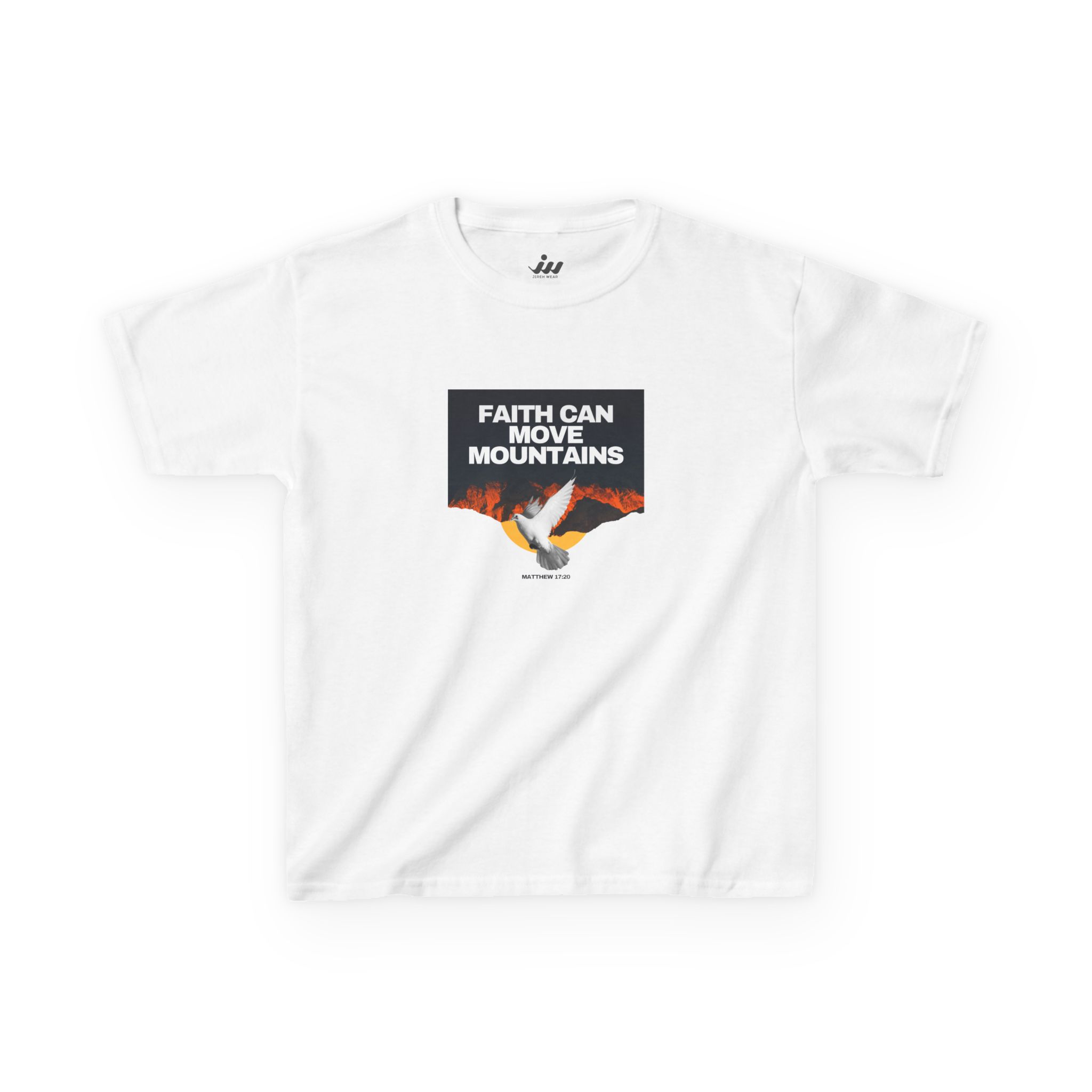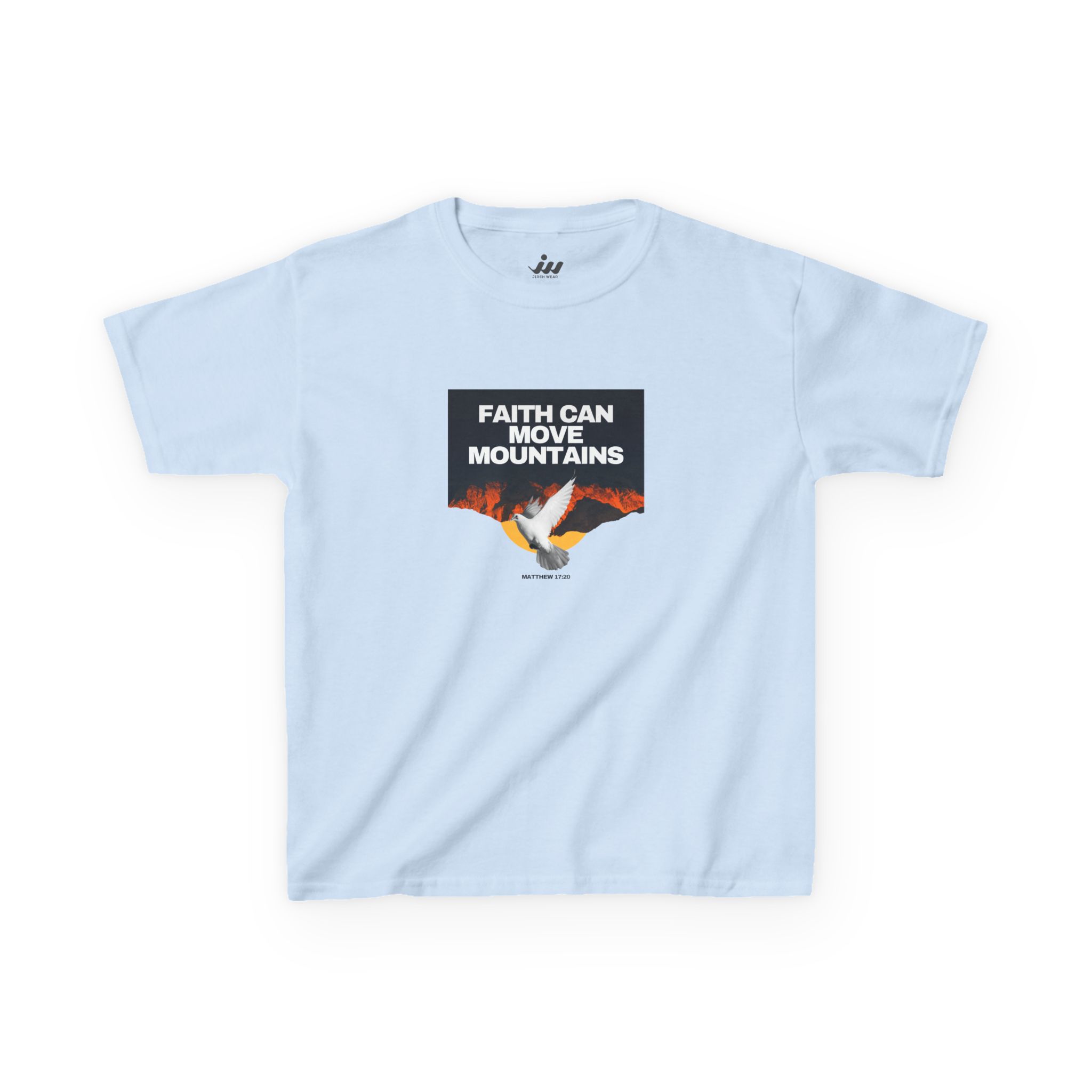 A soft, midweight kids tee printed with a bold, inspiring graphic: “FAITH CAN MOVE MOUNTAINS” set above a stylized mountain silhouette and a soaring dove. The clean crew neckline and classic cut make this shirt easy to layer or wear on its own. Breathable 100% US cotton (midweight) gives it everyday durability while staying gentle on young skin. Ethically sourced and Oeko‑Tex certified, this tee carries a quiet promise—confidence and calm for little ones facing big days.