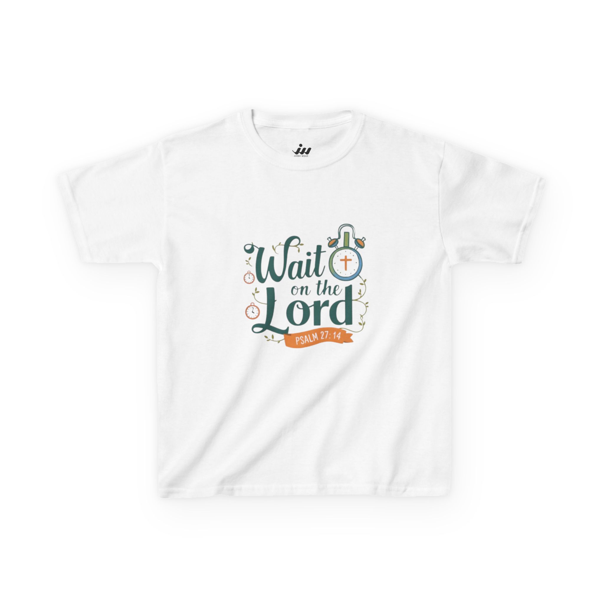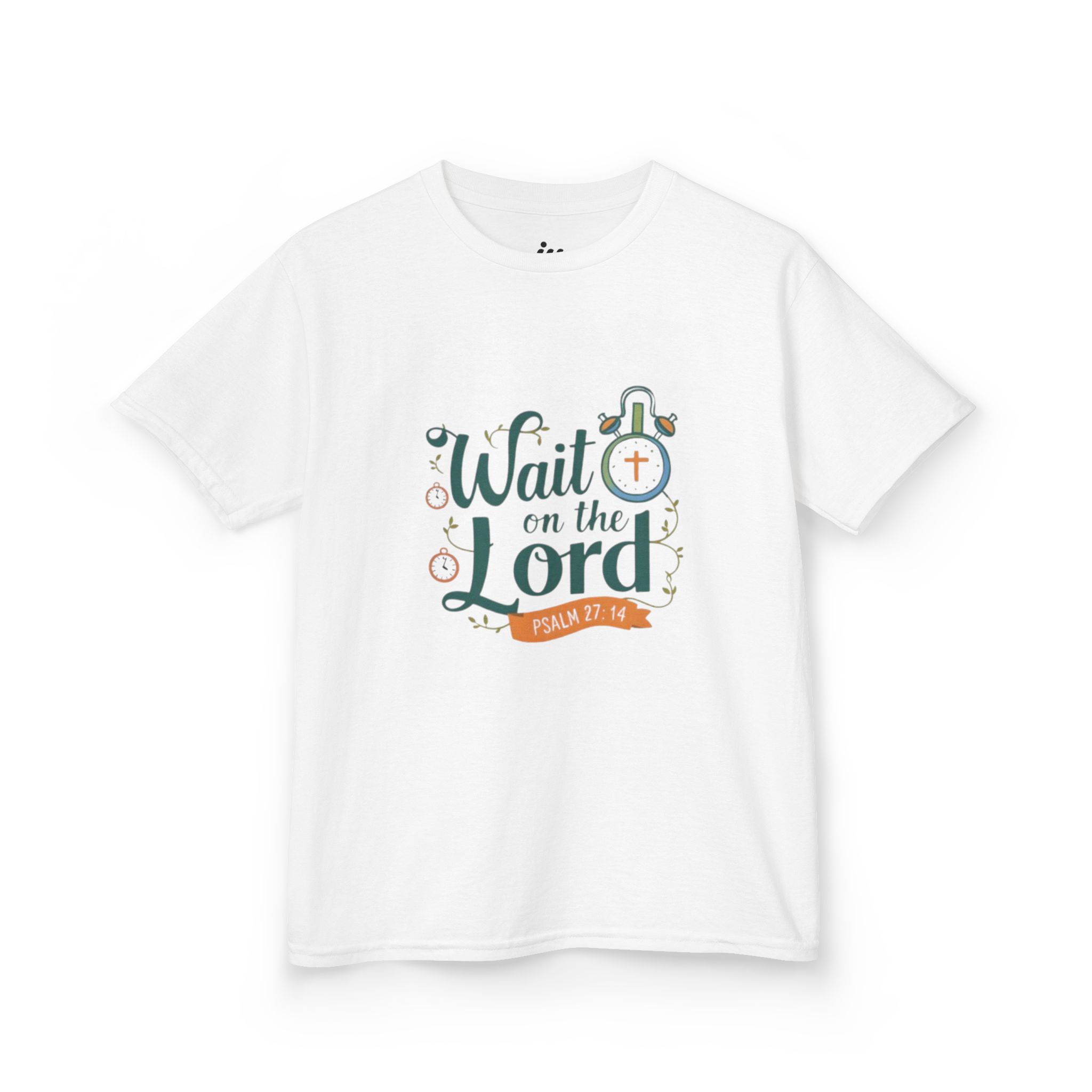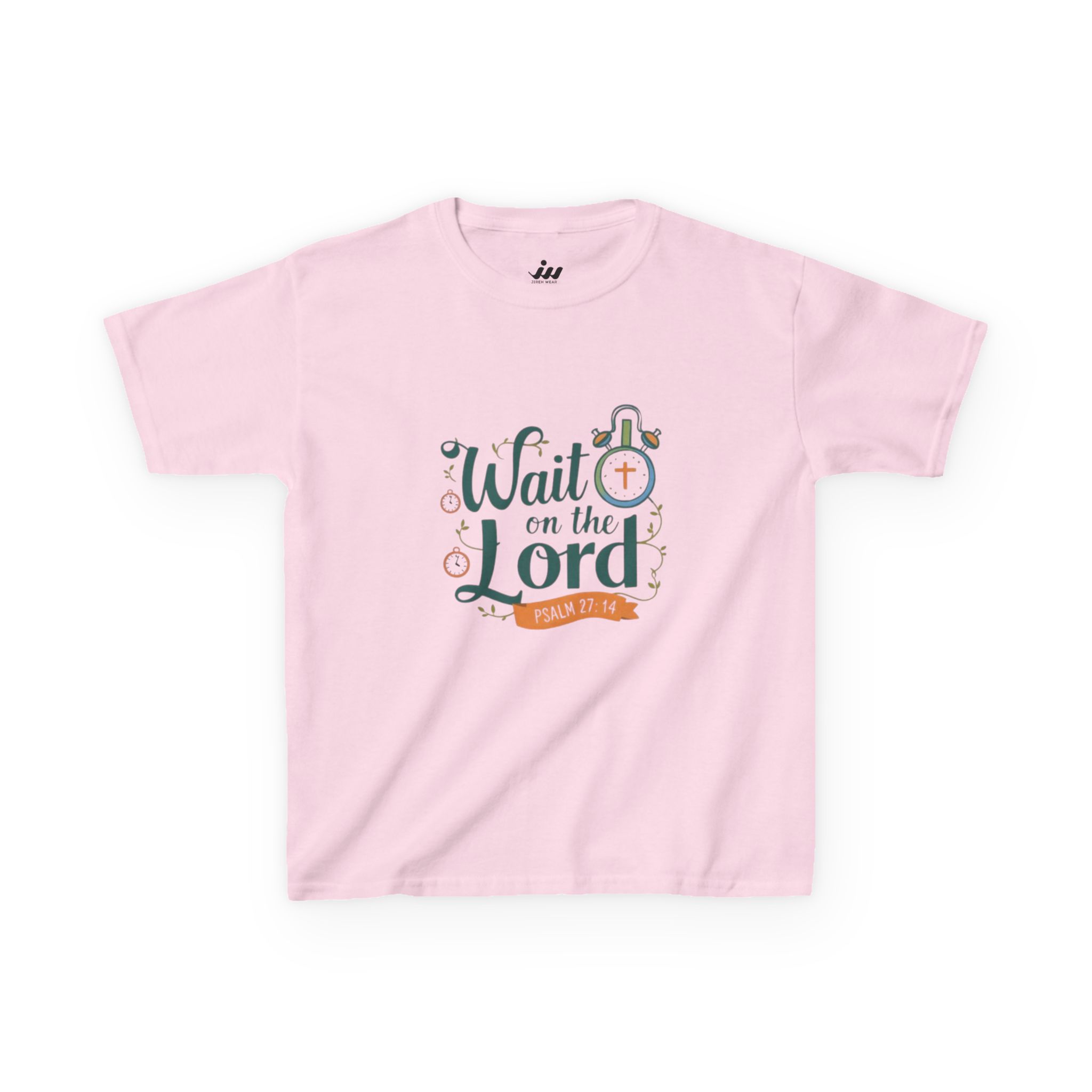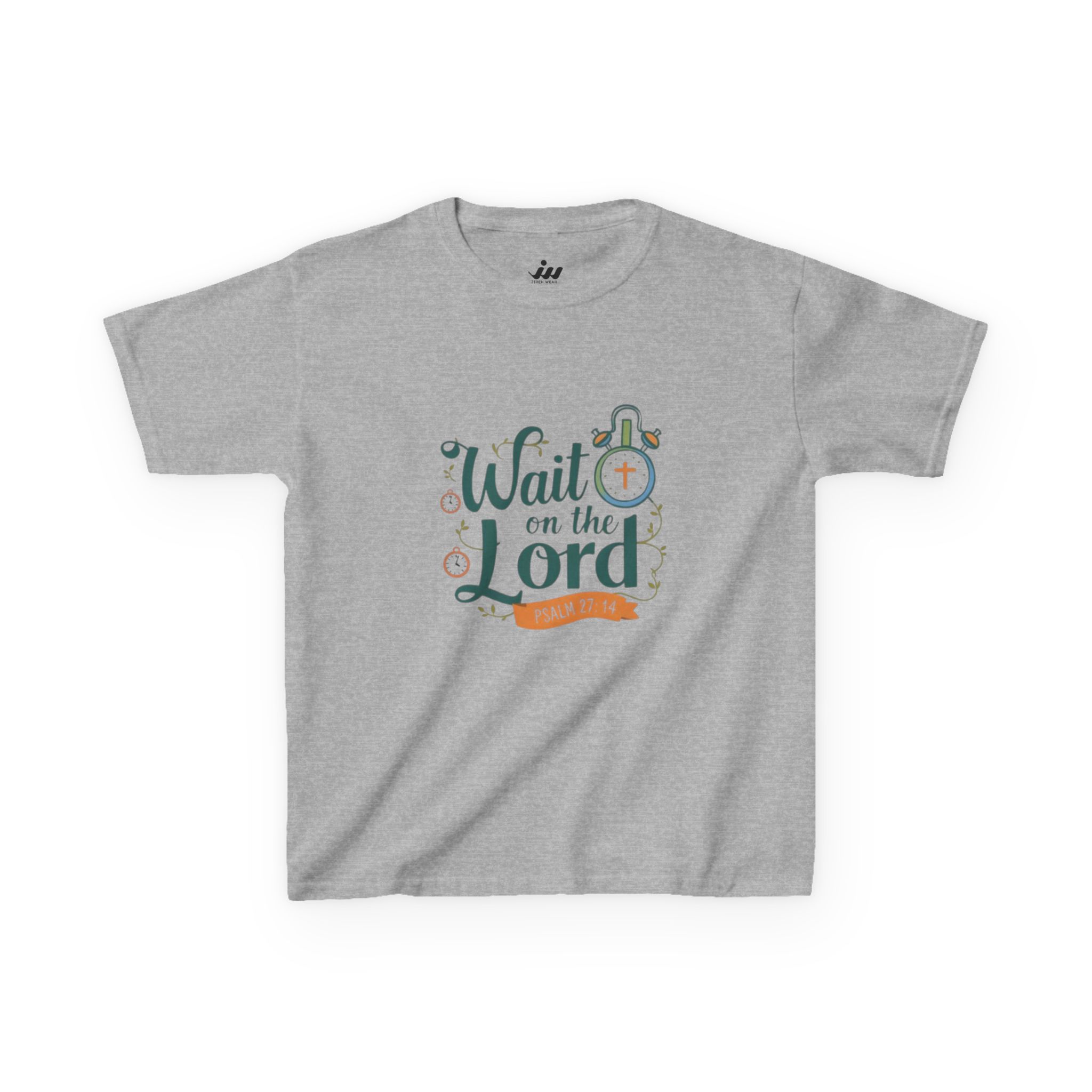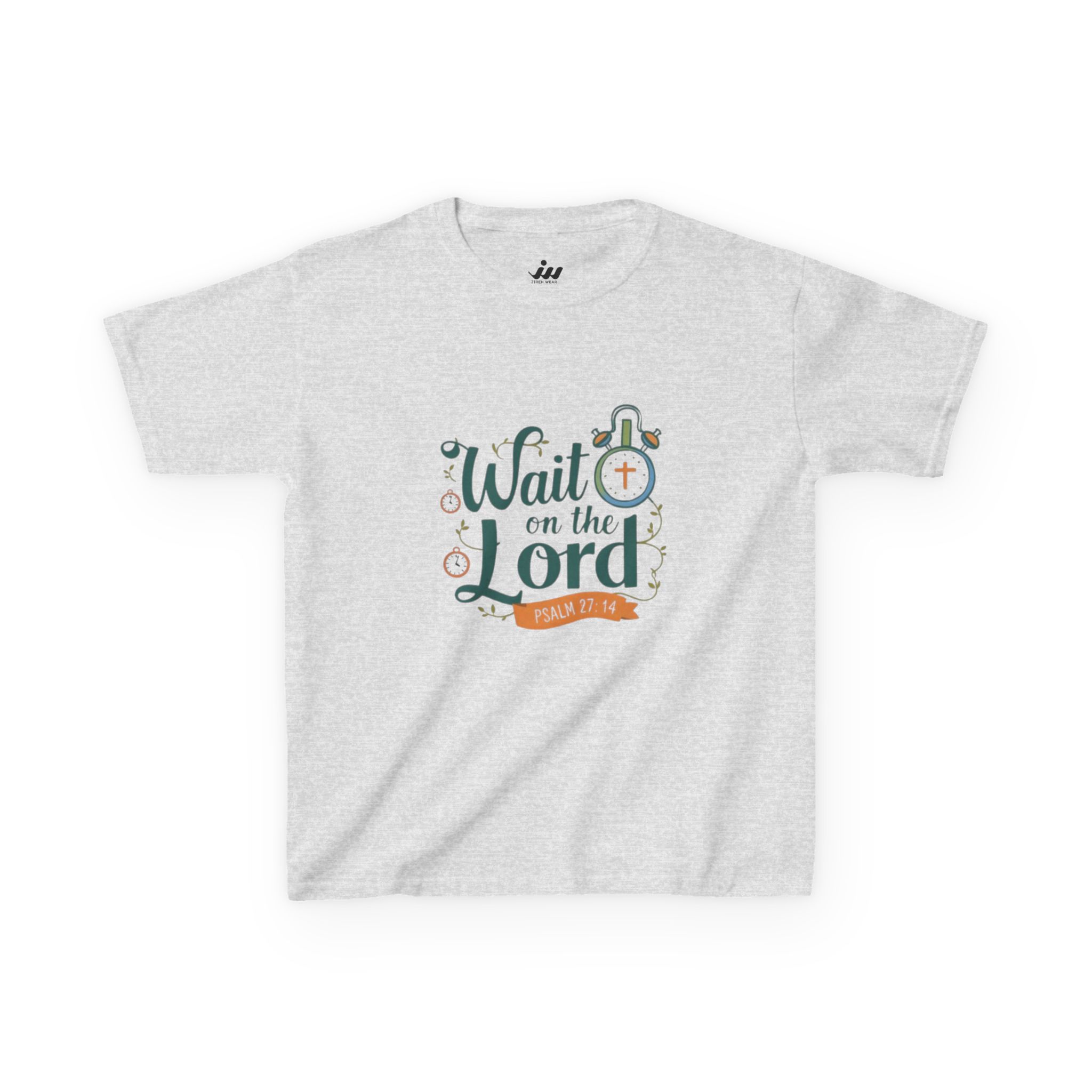A soft, midweight kids tee printed with a gentle faith-centered message. The design—hand-lettered type with a small cross and comforting accents—reads “Wait on the Lord,” giving this shirt a quiet, hopeful presence. Lightweight enough for layering, the tee keeps its shape through play thanks to a ribbed collar and shoulder tape. Breathable US-grown cotton feels soft against a child’s skin and the tear-away label ensures scratch-free comfort. It’s a calm, everyday piece that fits into family routines, Sunday mornings, faith-based gatherings, and cozy moments at home.