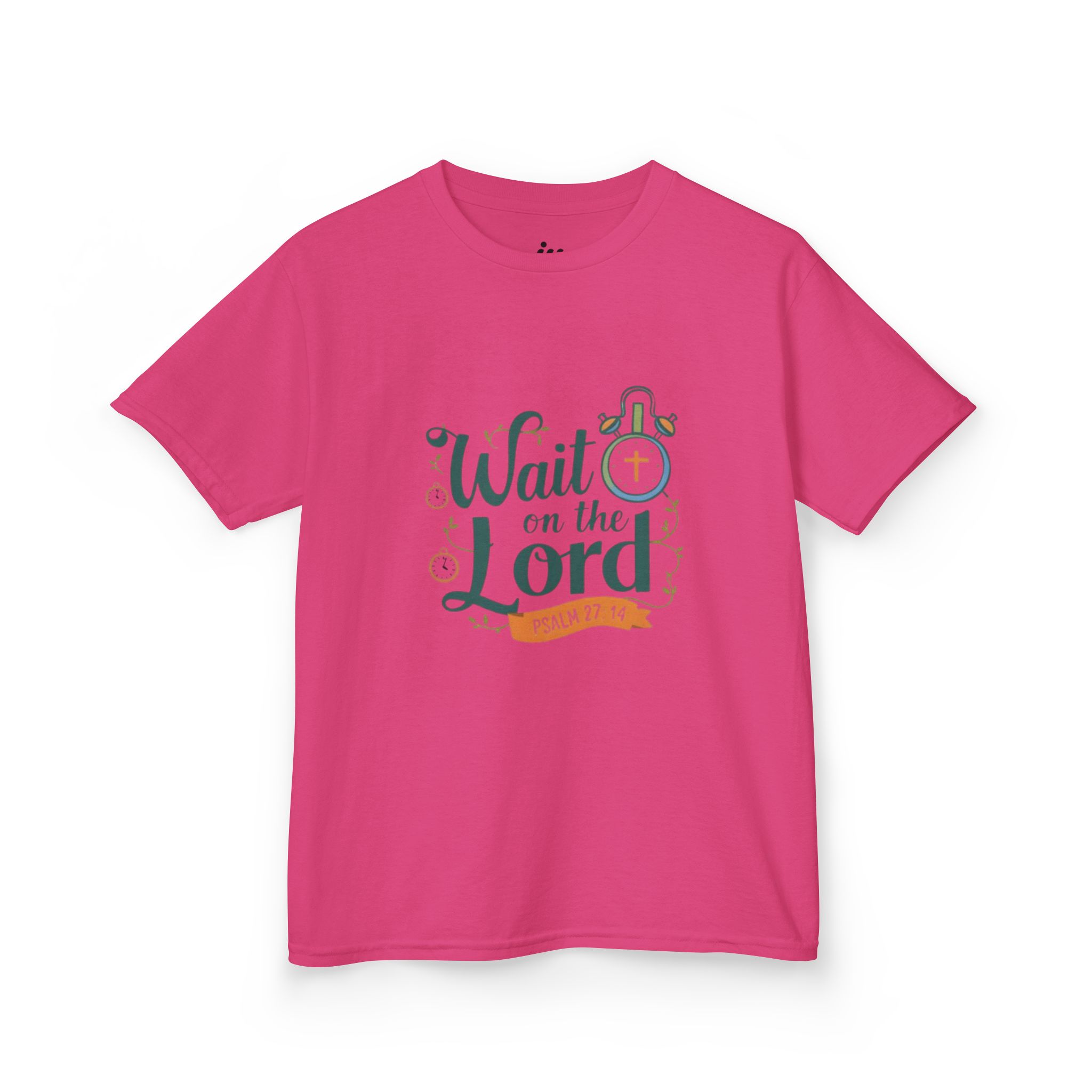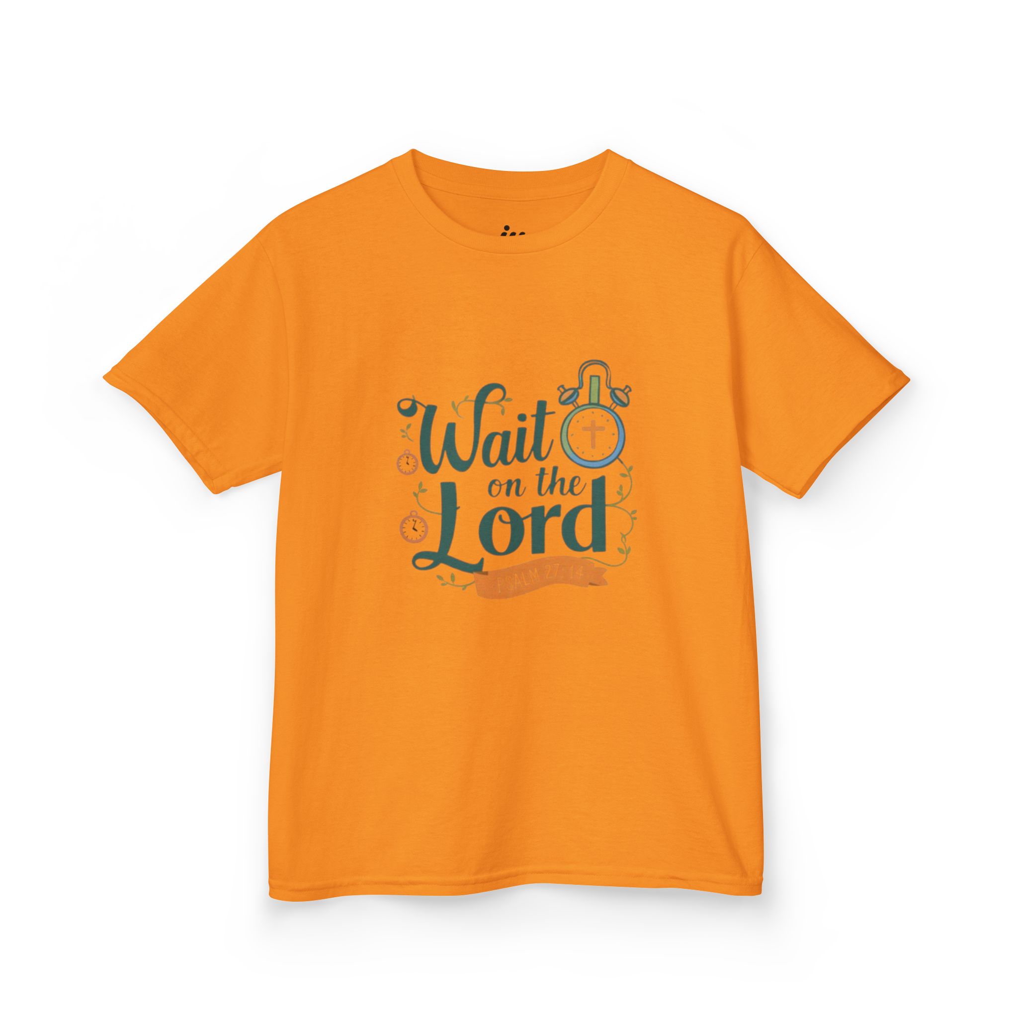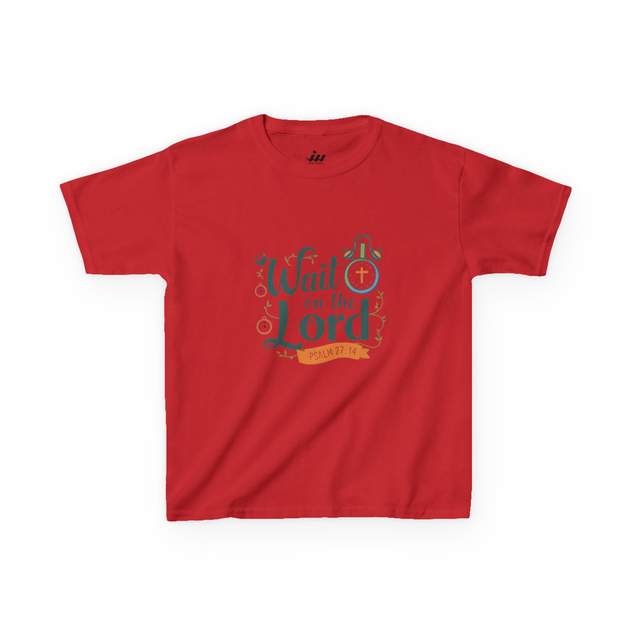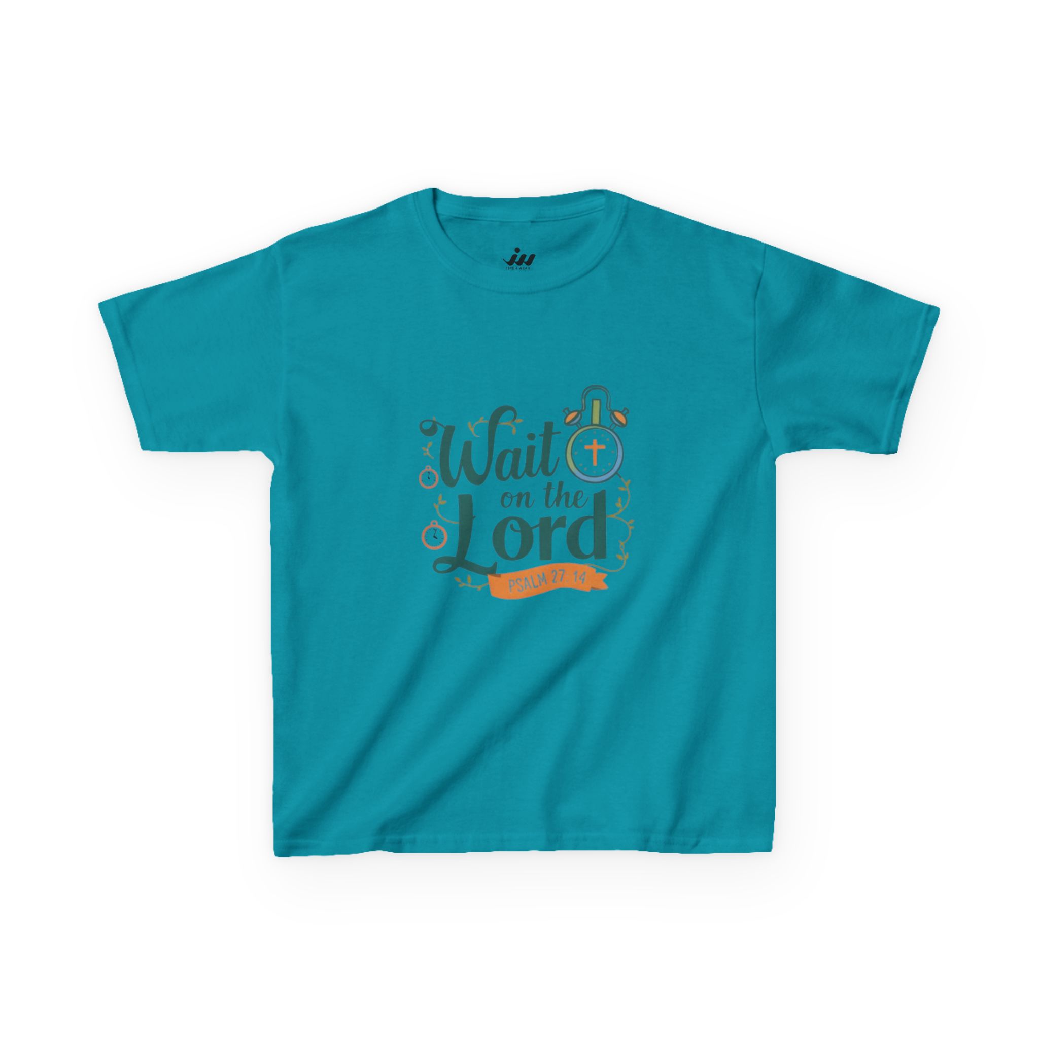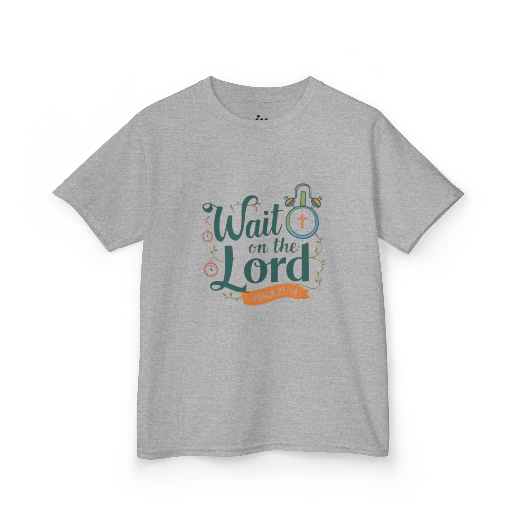 A soft, midweight kids tee printed with a gentle faith-centered message. The design—hand-lettered type with a small cross and comforting accents—reads “Wait on the Lord,” giving this shirt a quiet, hopeful presence. Lightweight enough for layering, the tee keeps its shape through play thanks to a ribbed collar and shoulder tape. Breathable US-grown cotton feels soft against a child’s skin and the tear-away label ensures scratch-free comfort. It’s a calm, everyday piece that fits into family routines, Sunday mornings, faith-based gatherings, and cozy moments at home.