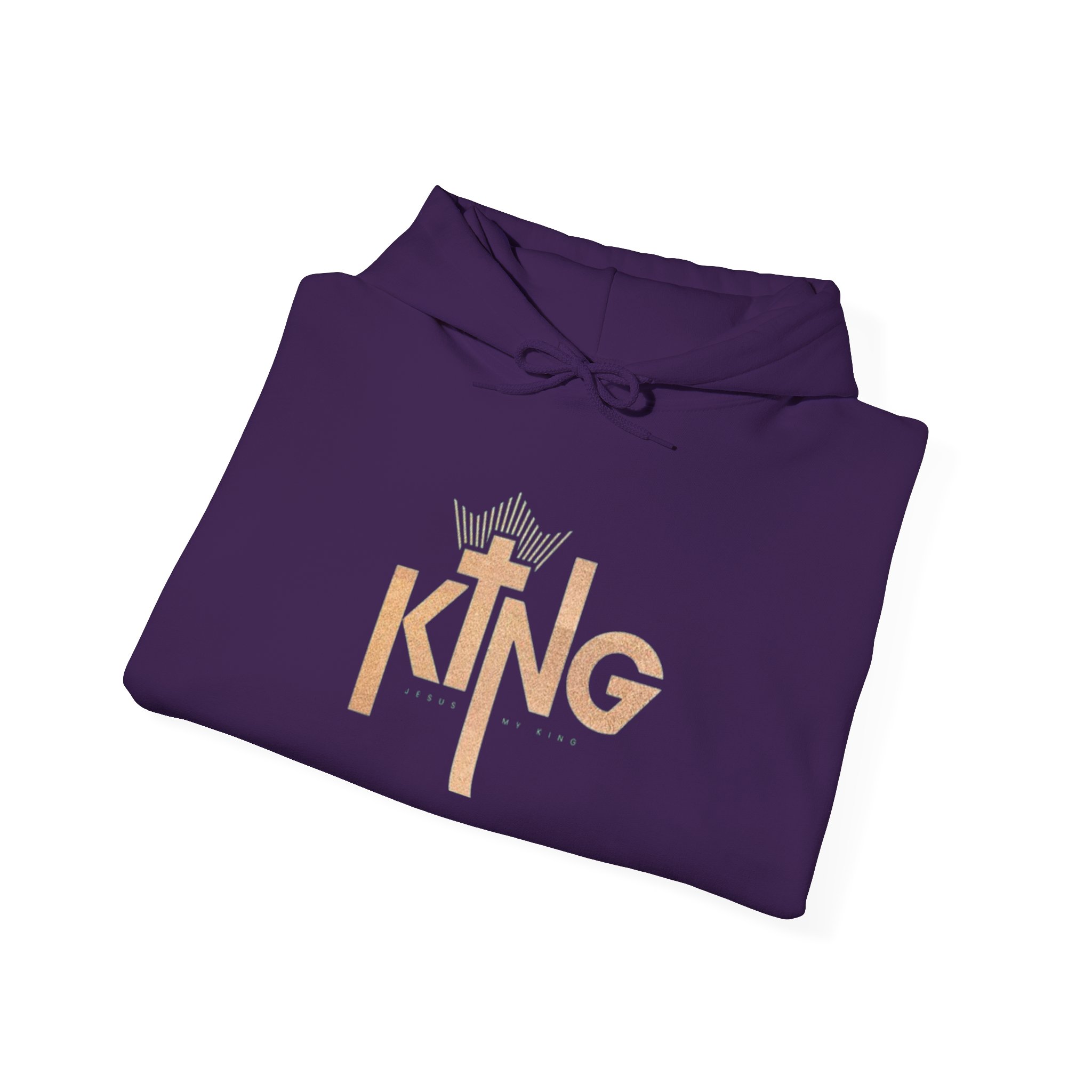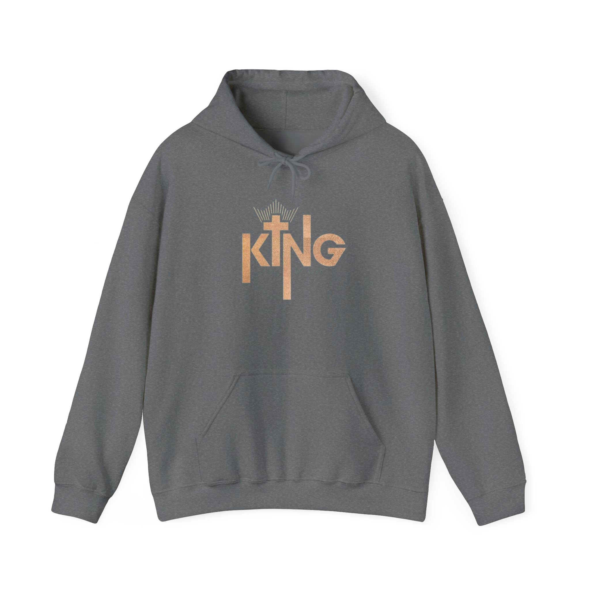 Lightweight warmth with quiet confidence. This soft hooded sweatshirt carries a subtle, regal graphic at the chest — a minimalist “KING” emblem with a small crown and a vertical cross-like stroke — that reads calm strength rather than loud proclamation. Wear it on cool mornings as you head out to coffee, fold it into travel bags for weekend road trips, or pull it on after evening runs when the air cools. The relaxed silhouette and pouch pocket make it easy to layer over tees or under coats, while the muted print lets the design sit comfortably in everyday outfits. It’s clothing that settles into routines: morning commutes, late-night study sessions, casual meetups, and those quiet at-home nights when you want to feel grounded.