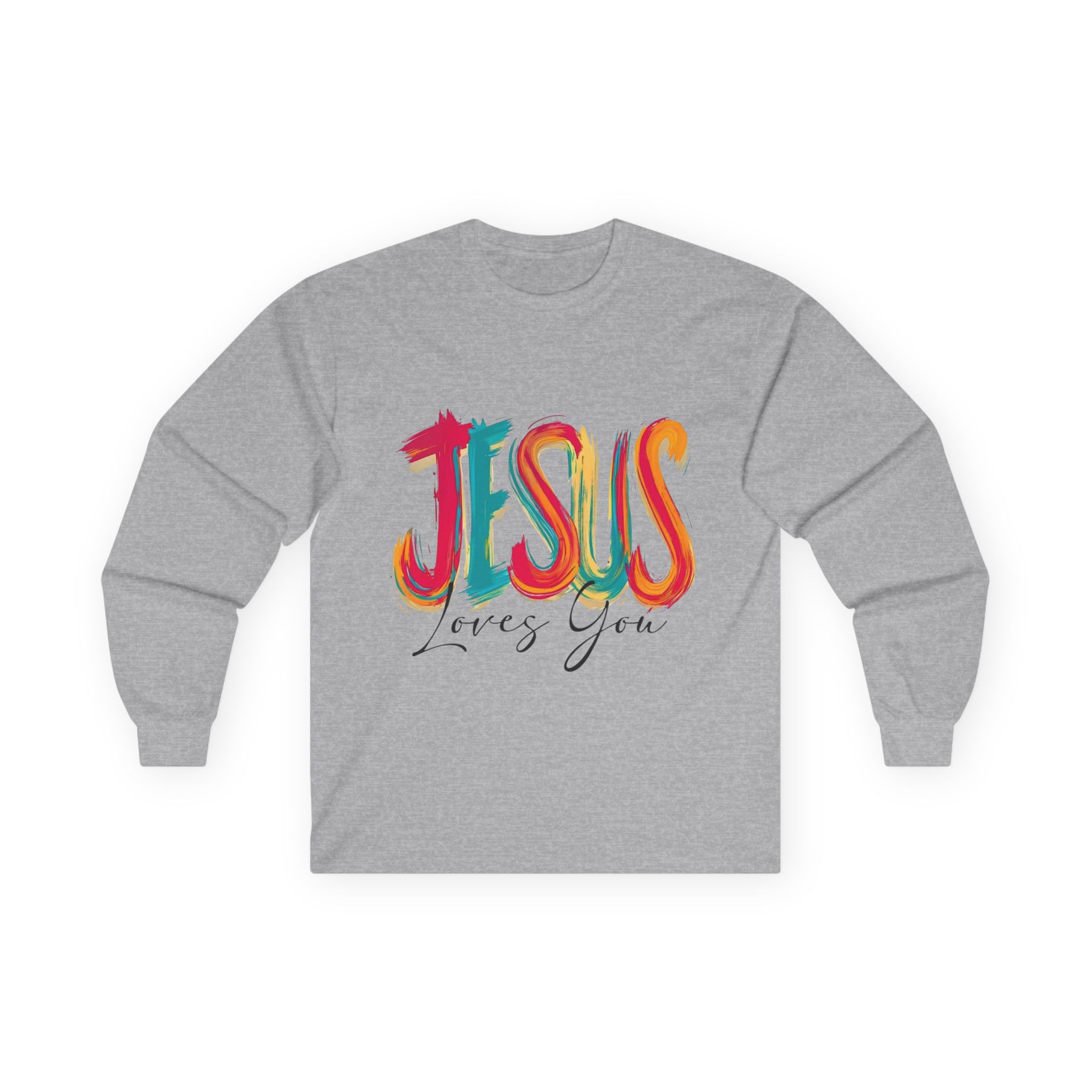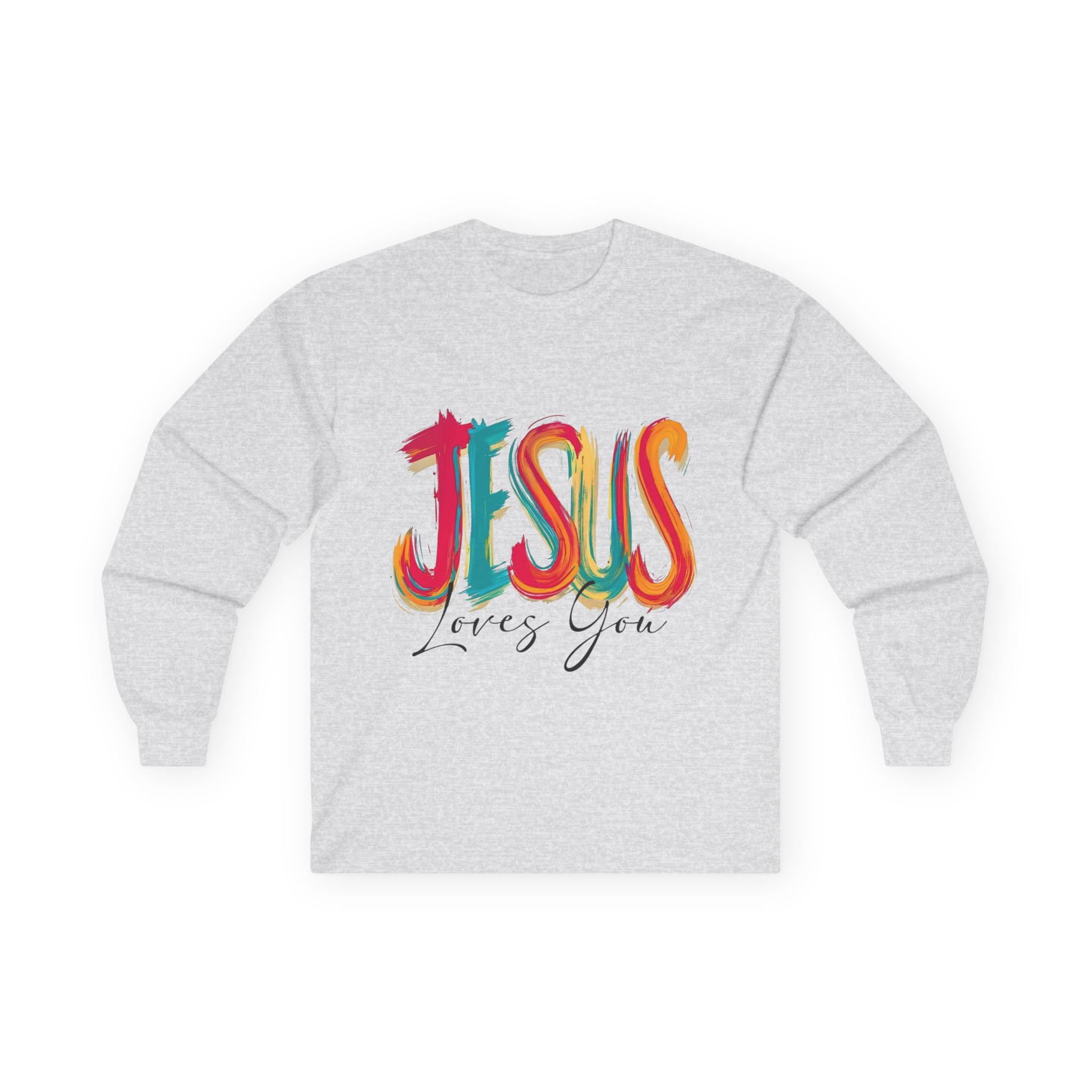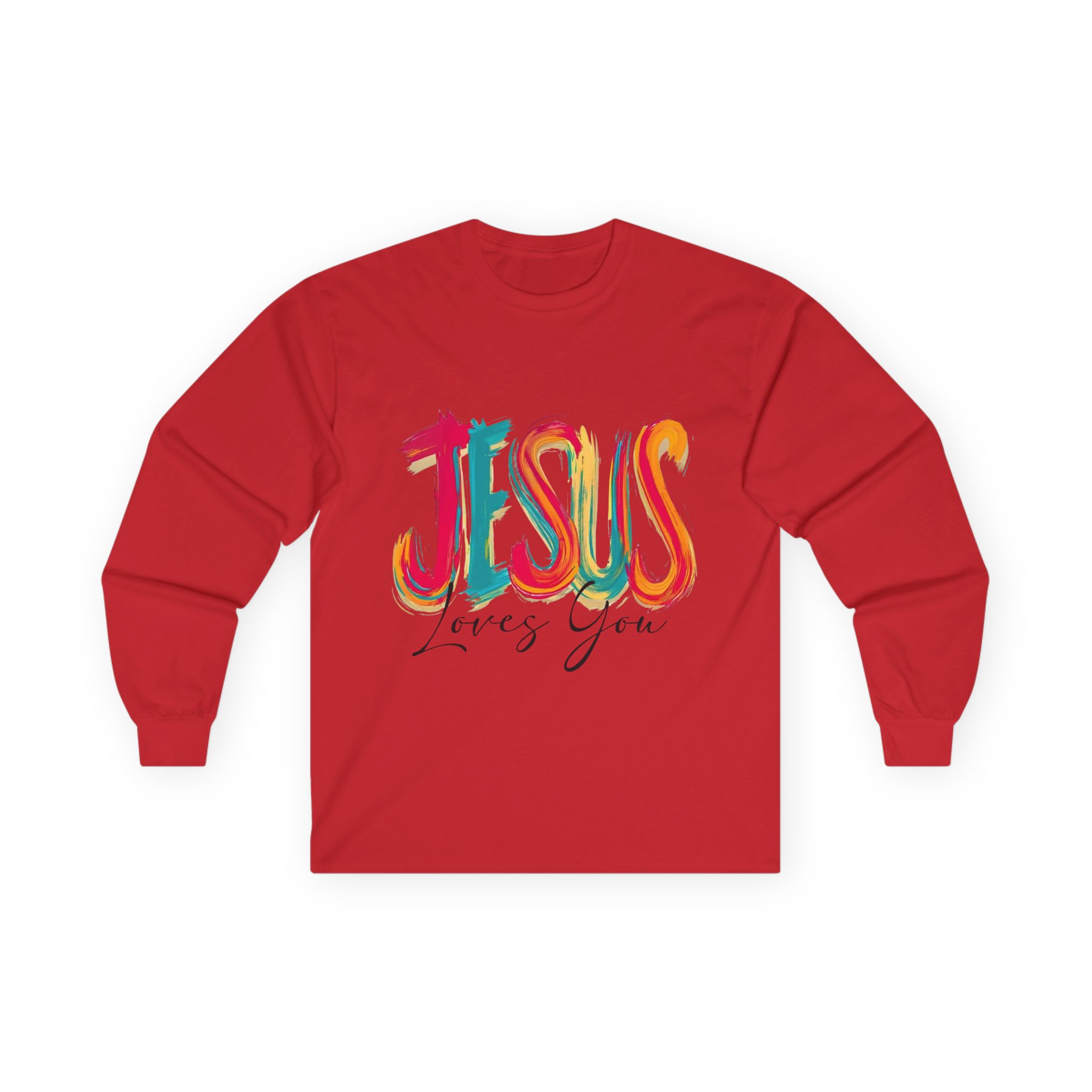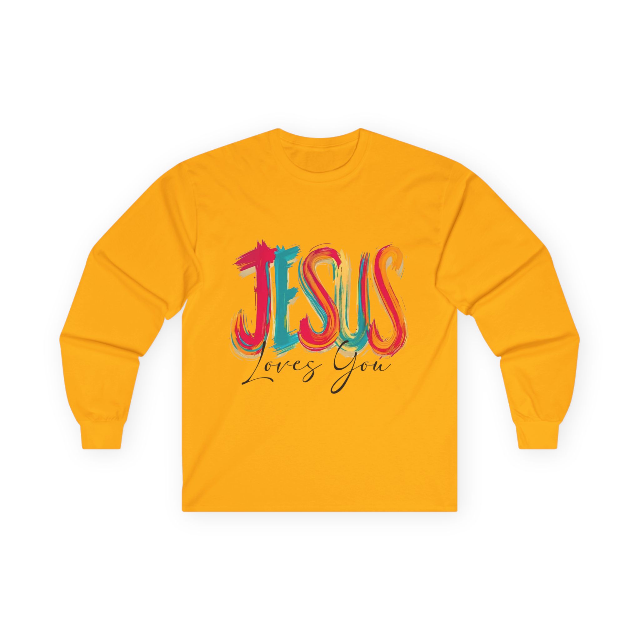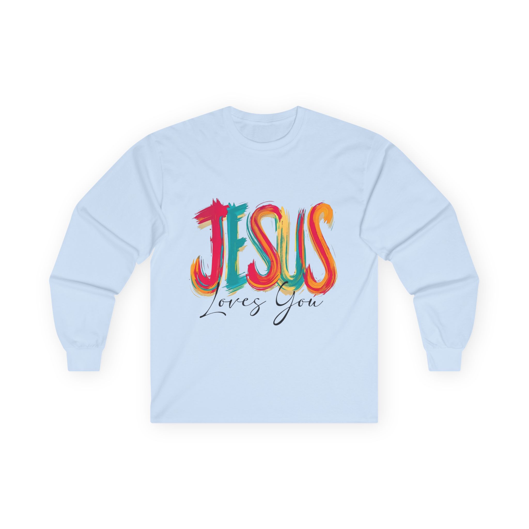 Lightweight yet substantial, this long sleeve tee speaks softly of faith with a bold, painterly “JESUS” across the chest and a gentle “loves you” script beneath. The hand-painted look brings color and warmth to quiet mornings at Bible study or slow afternoons of porch fellowship. It sits comfortably in the wardrobe of someone who wants to share belief without shouting—layer it under a denim jacket for community nights or wear it alone while meeting friends after church. The tubular knit and ribbed collar keep the silhouette clean and familiar, while the vintage-feel cotton gives a lived-in softness that grows more personal with every wash.