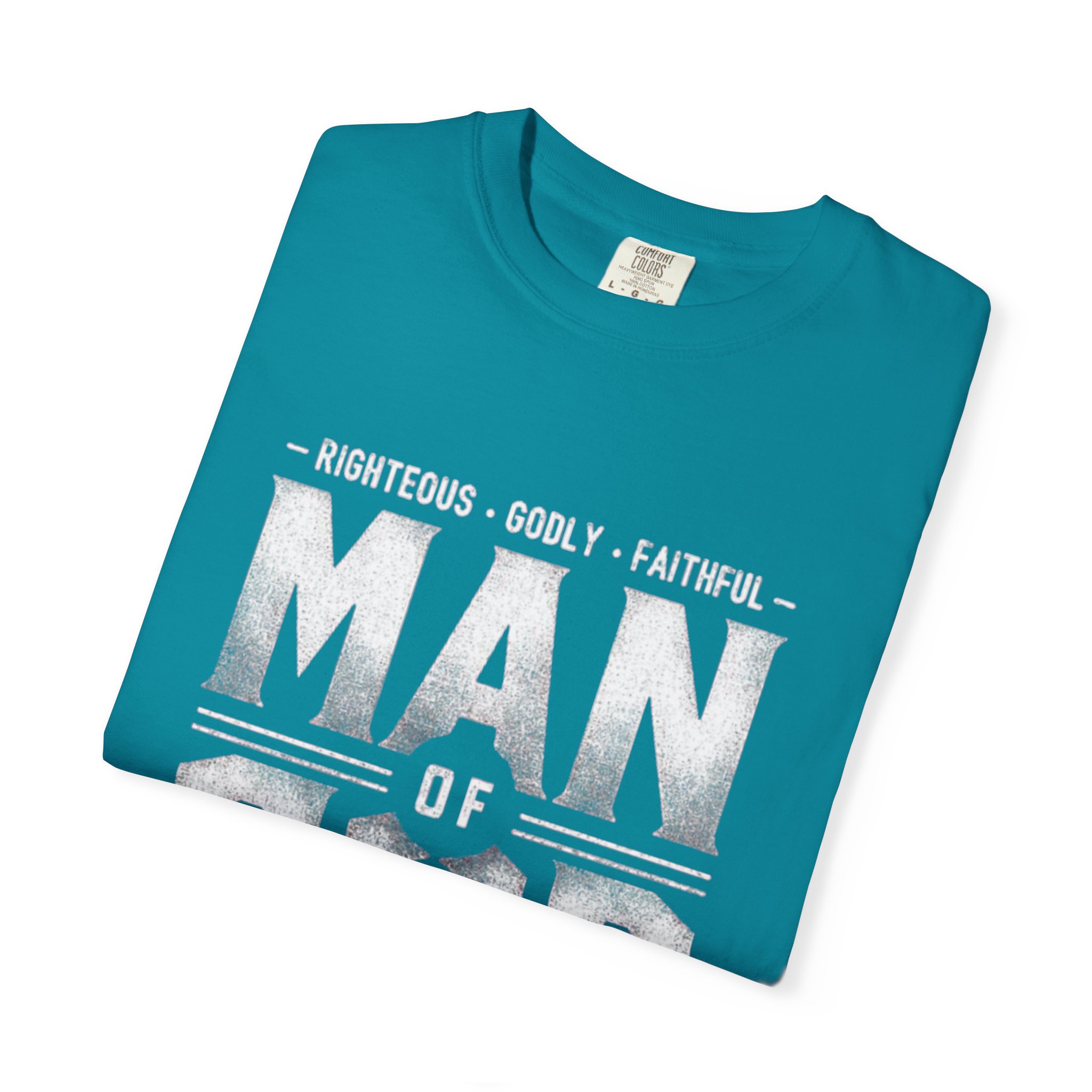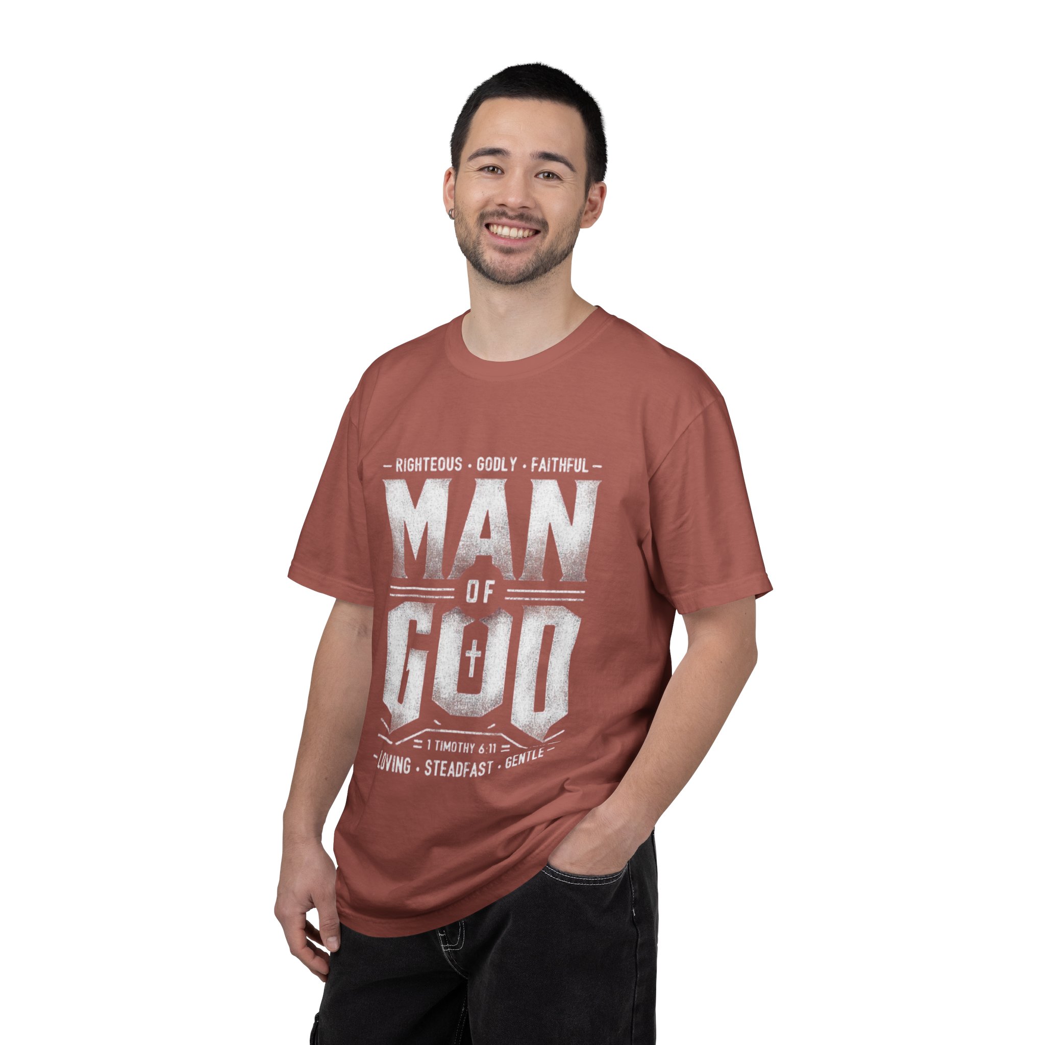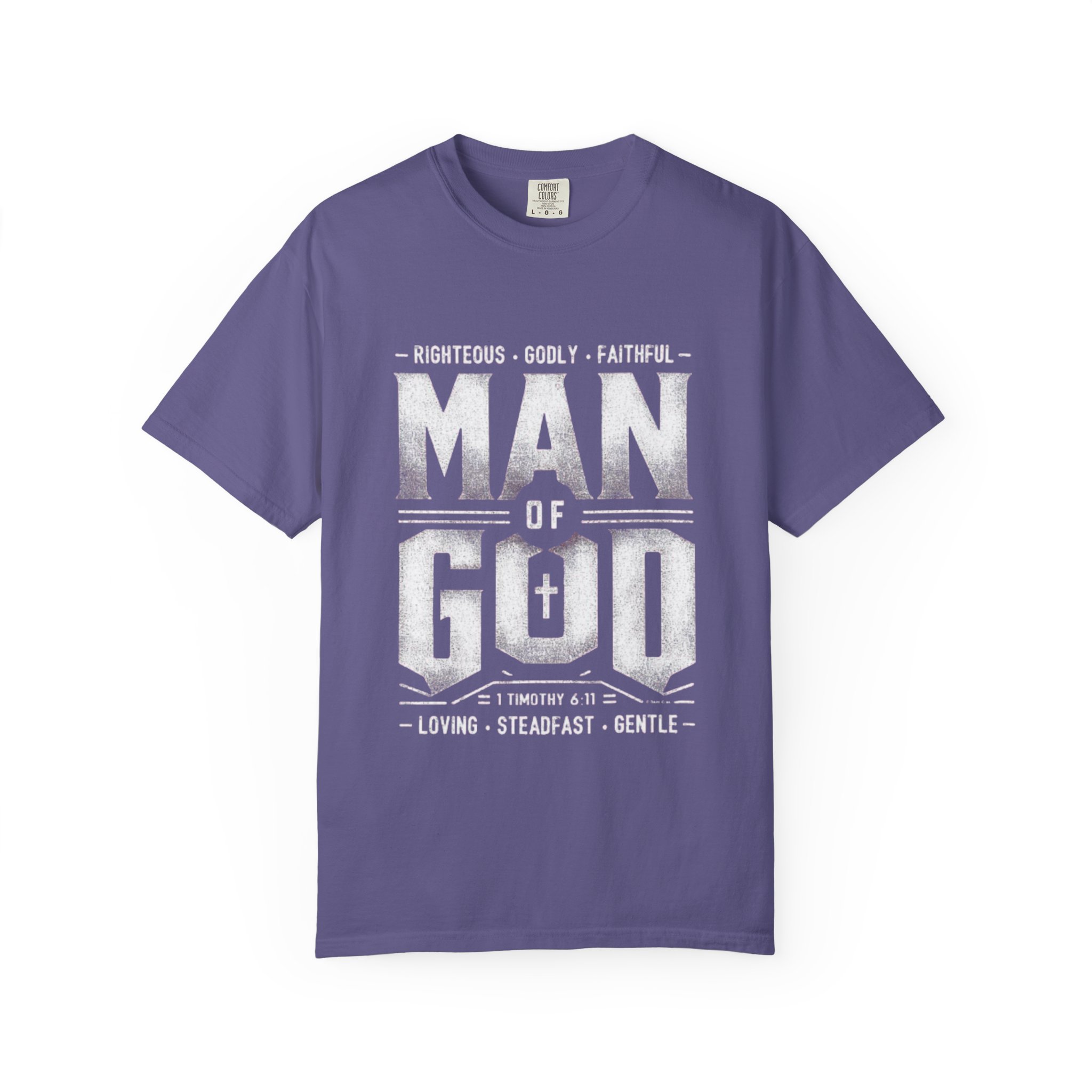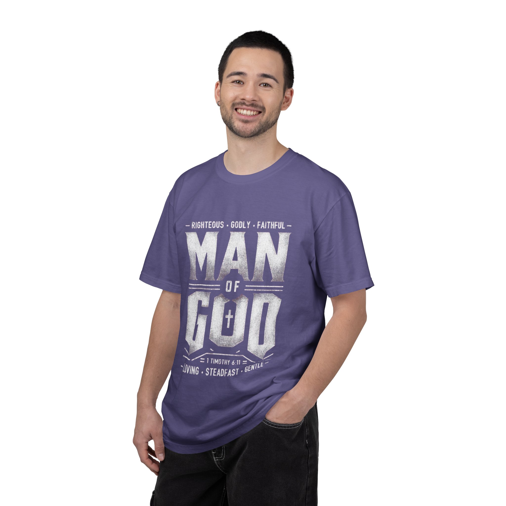 This heavyweight, garment-dyed tee brings quiet strength to everyday wear. The vintage-finish print reads “MAN OF GOD” with subtle scripture and character words, giving the shirt a faithful, steadfast vibe without shouting. Soft, broken-in color and a relaxed silhouette make it feel lived-in from the first wear — reach for it before service, while volunteering, or on slow weekends at home. It pairs naturally with worn denim or a flannel overtop, and the sturdy construction stands up to frequent washing and movement. Wear it as a humble statement of faith and steady character.