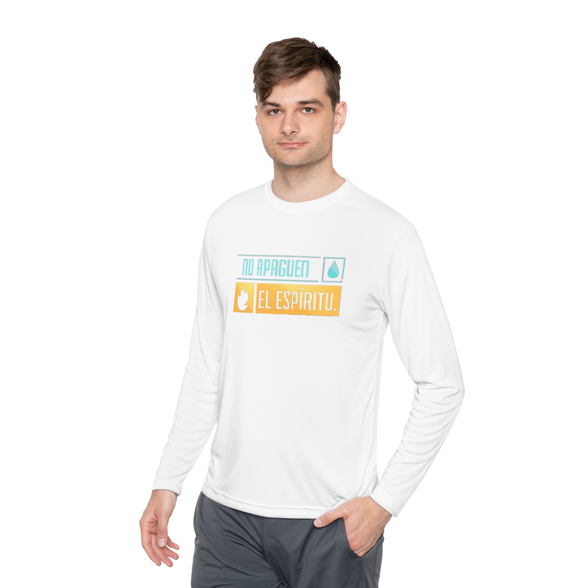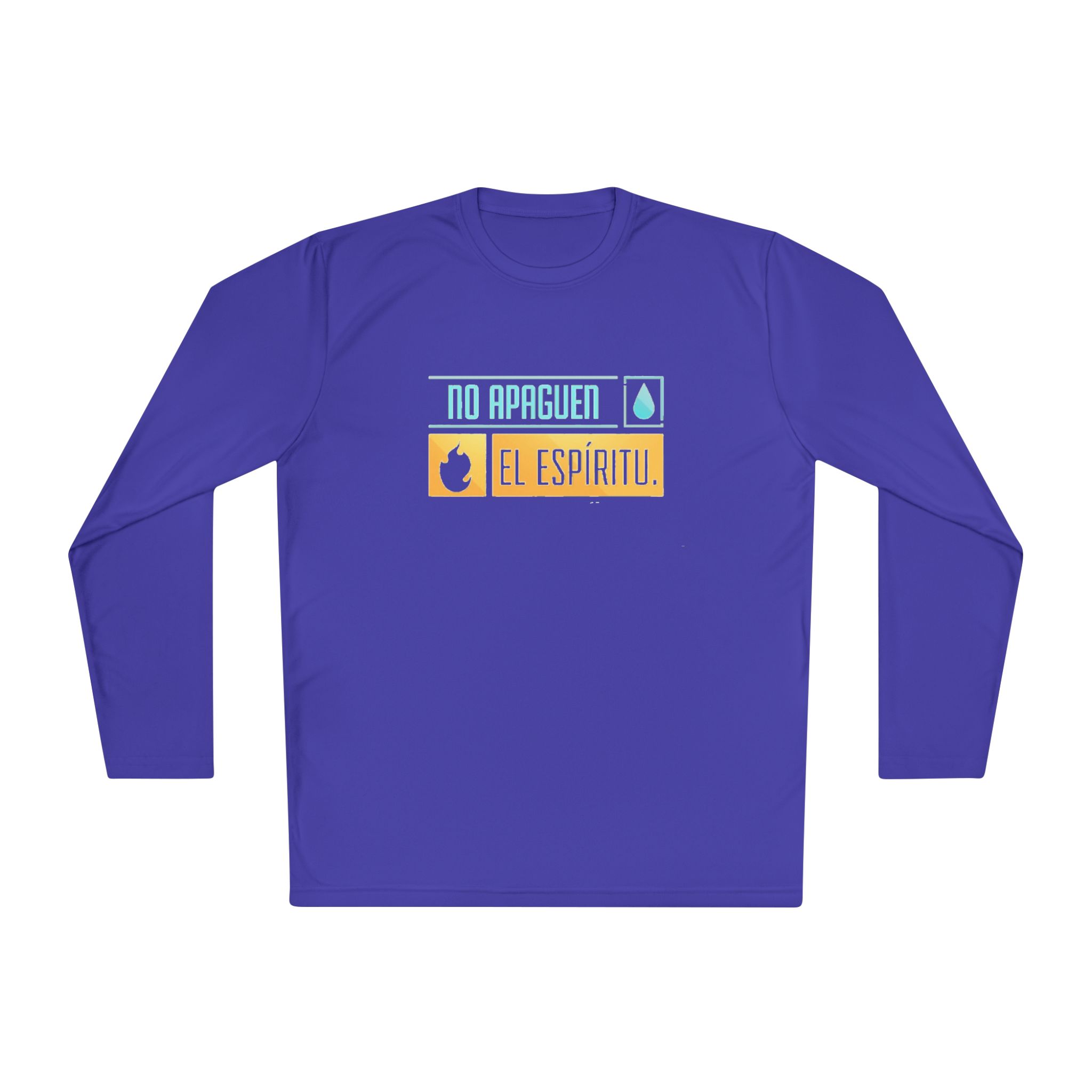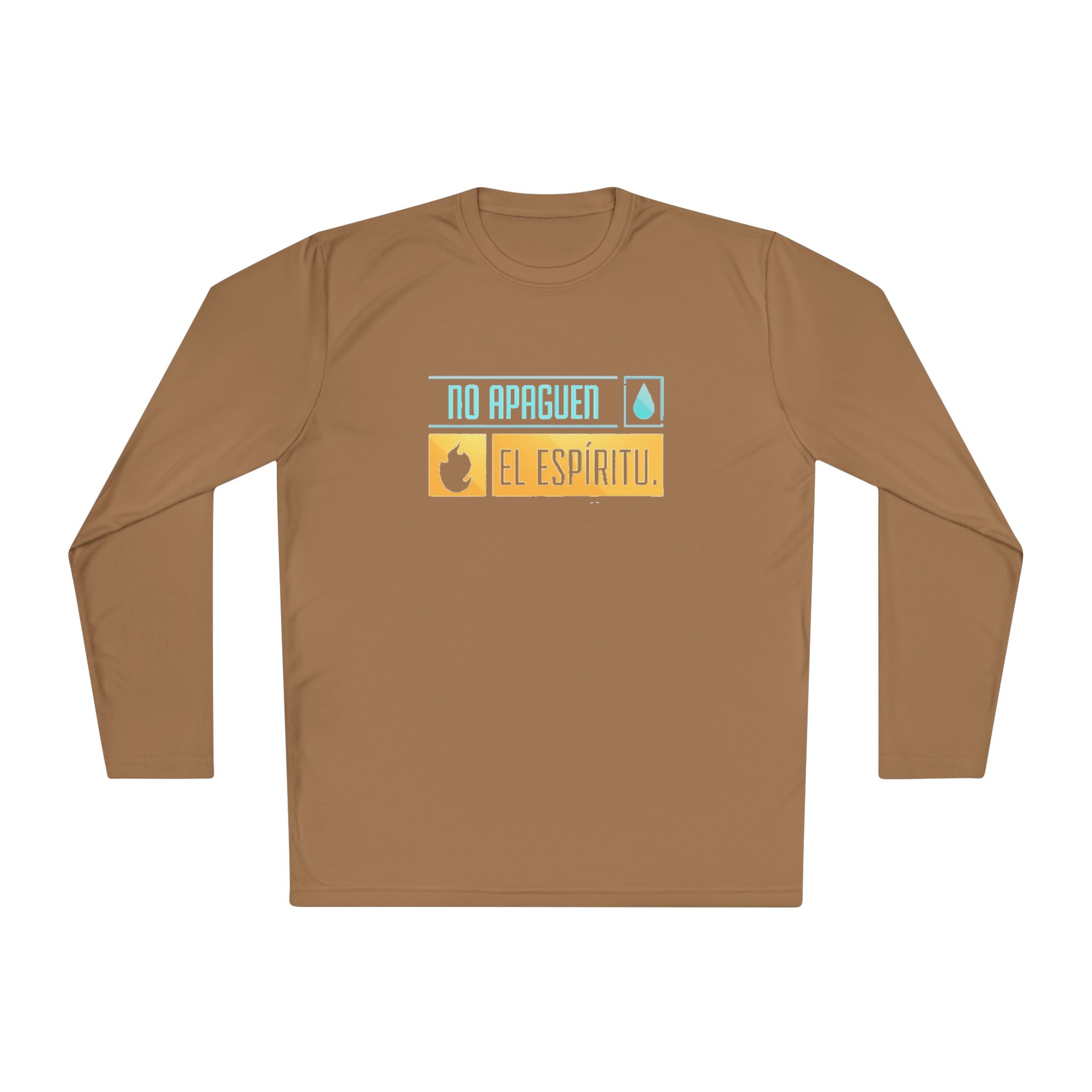 Lightweight long-sleeve performance tee carrying a subtle, bilingual design that reads “No Apaguen / El Espíritu.” The soft, extra-light polyester feels barely there while wicking sweat and drying fast—made for movement, not fuss. The athletic cut and tear-away label keep things comfortable whether you’re heading to a morning run, a community event, or a summer evening gathering. Colors in the small chest print use muted teal and warm amber blocks with simple water and flame icons, giving the shirt a calm, reflective energy that slips easily into everyday life.