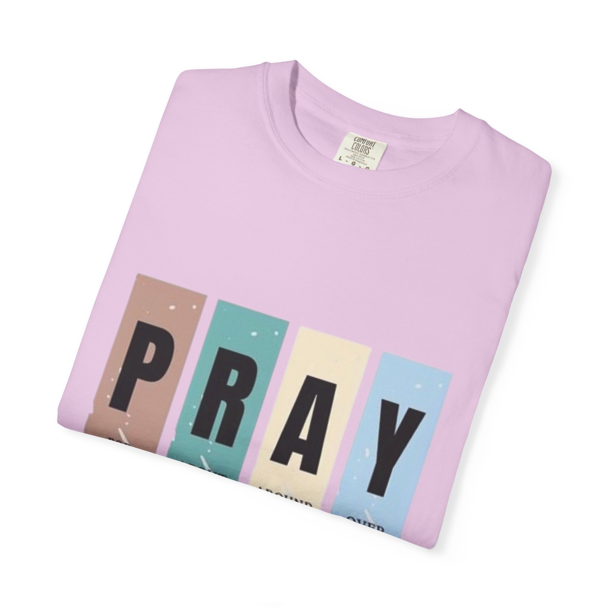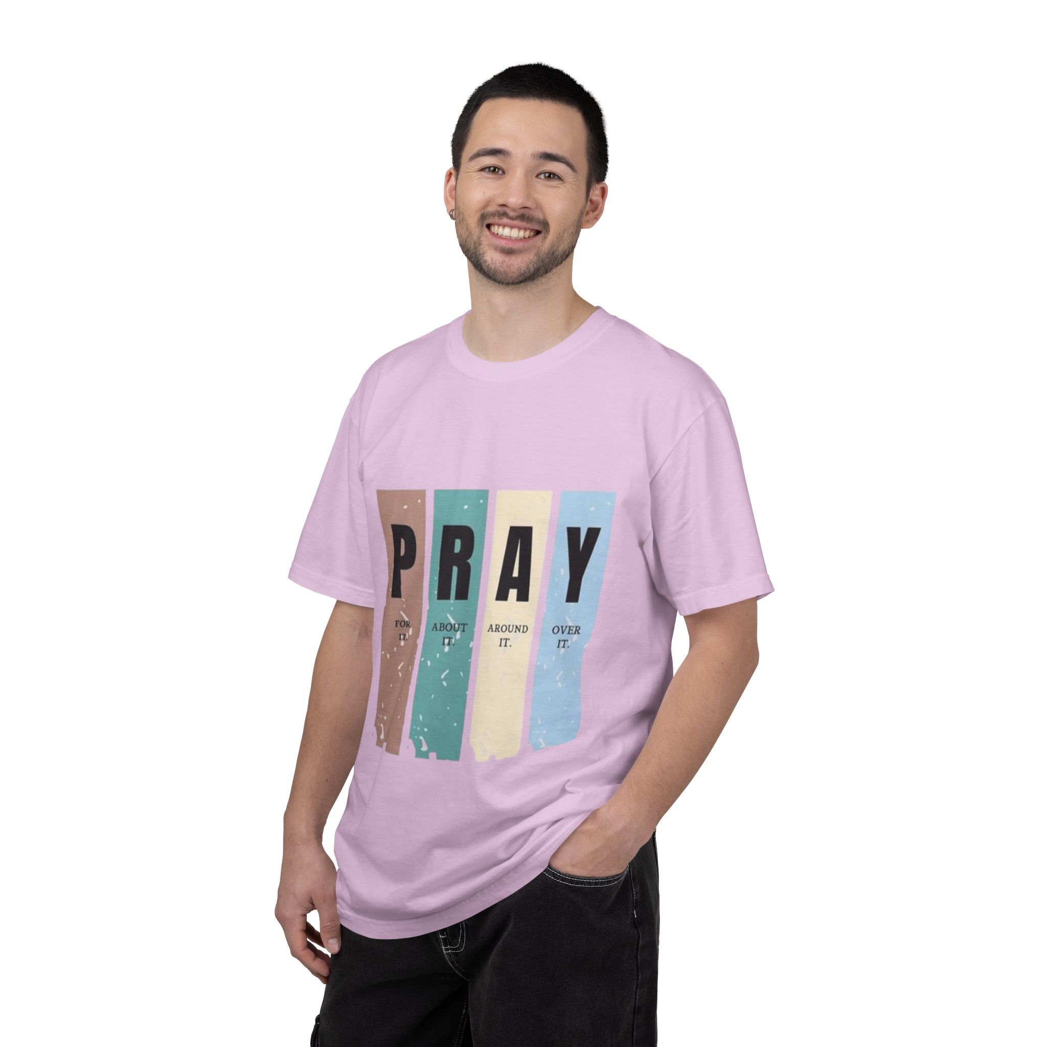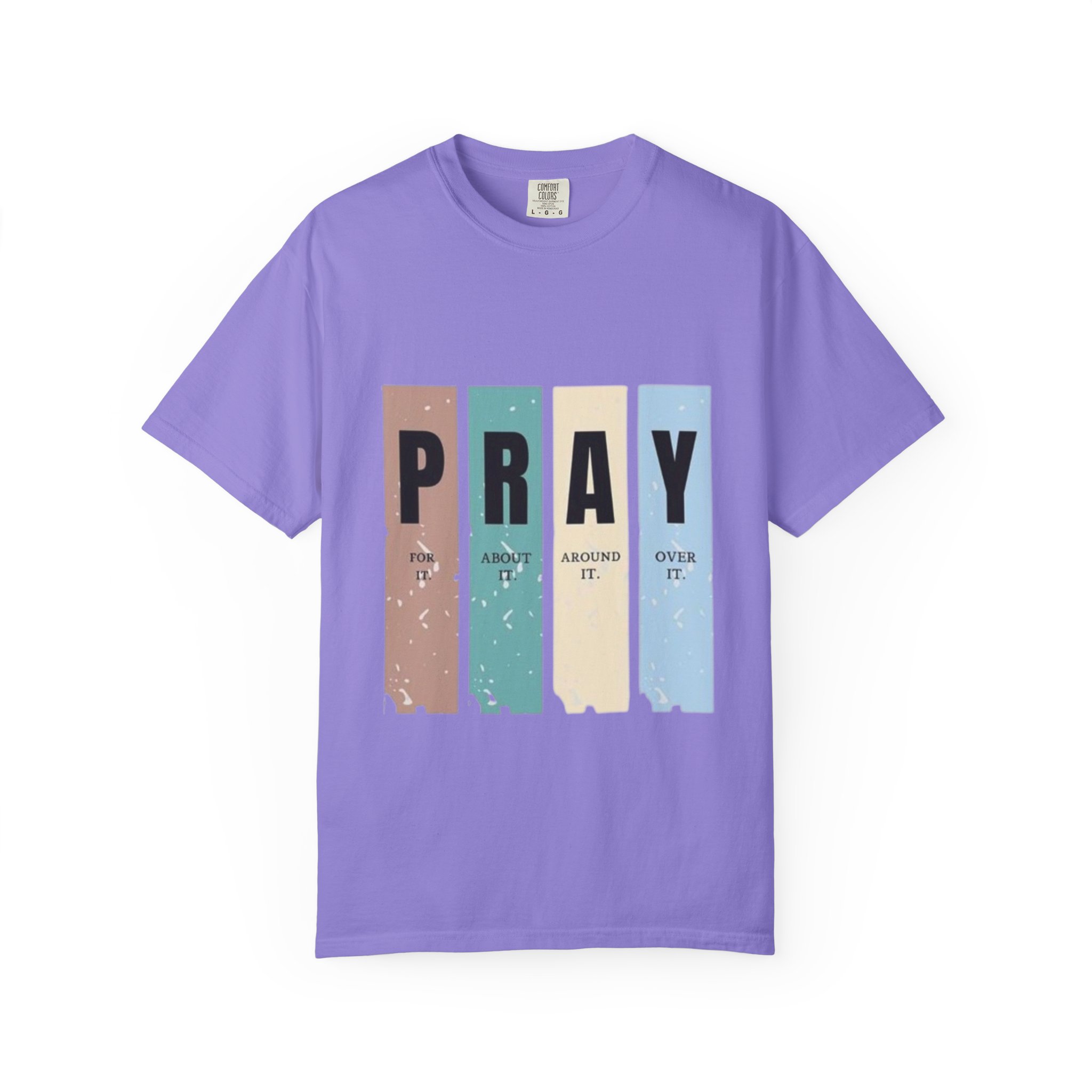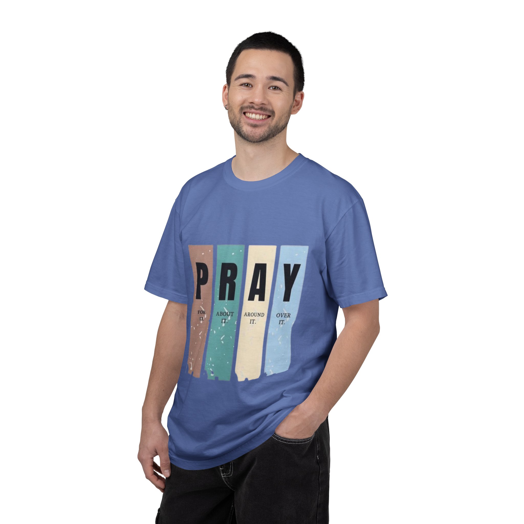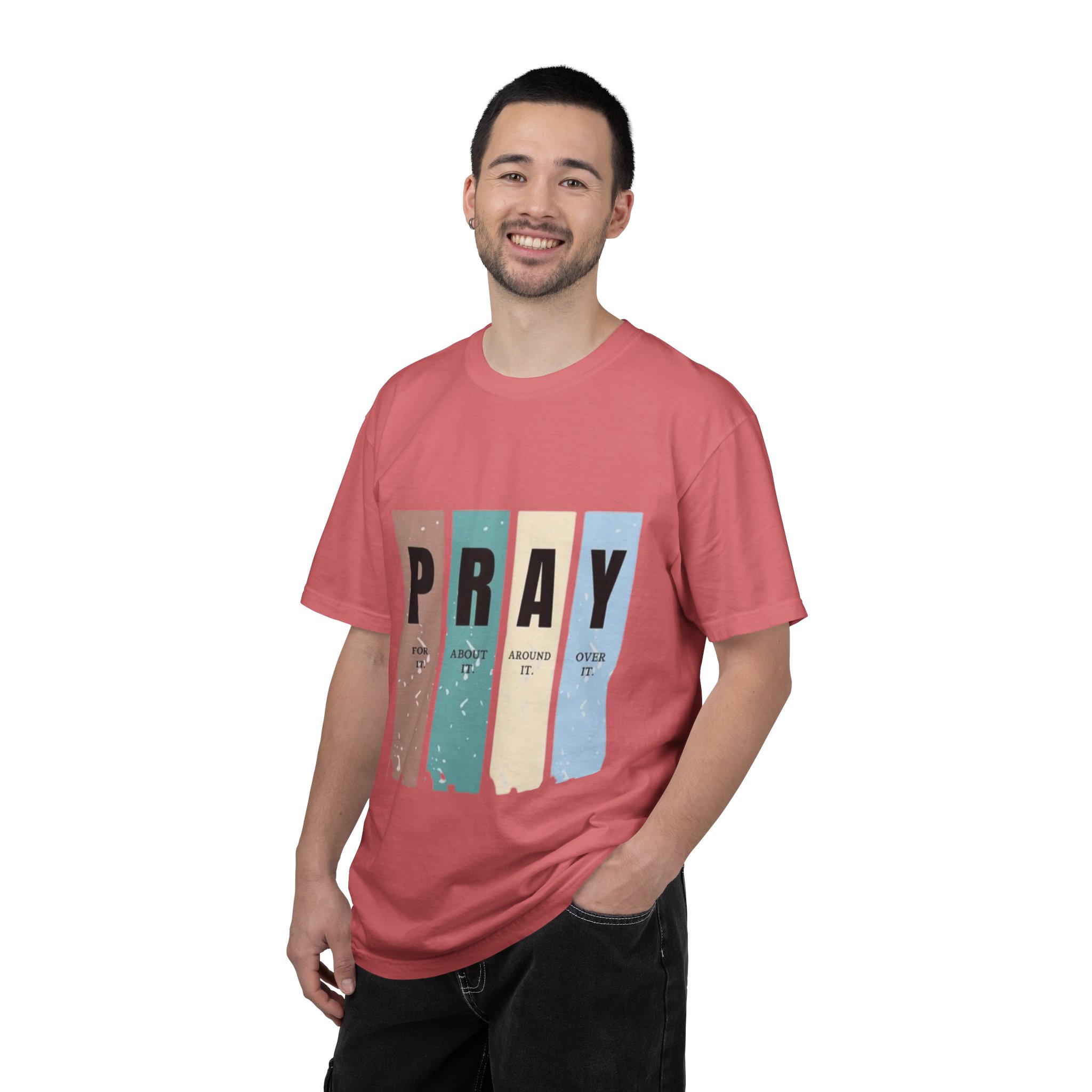 Soft, worn-in comfort meets quiet encouragement. This garment-dyed tee carries a calm, vintage palette across four painted panels that spell out PRAY — each panel gently distressed as if passed down from a trusted friend. Lightweight but substantial, it drapes loosely for easy movement and settles into the rhythm of everyday life: morning coffee, a slow commute, or an evening of small-group worship. It’s for people who choose faith in ordinary moments and want clothing that feels familiar from the first wear. The muted colors and subtle texture let the message sit humbly, not shouted. It layers under jackets, pairs with well-worn jeans, and becomes part of routines centered on reflection, community gatherings, or quiet Sundays.