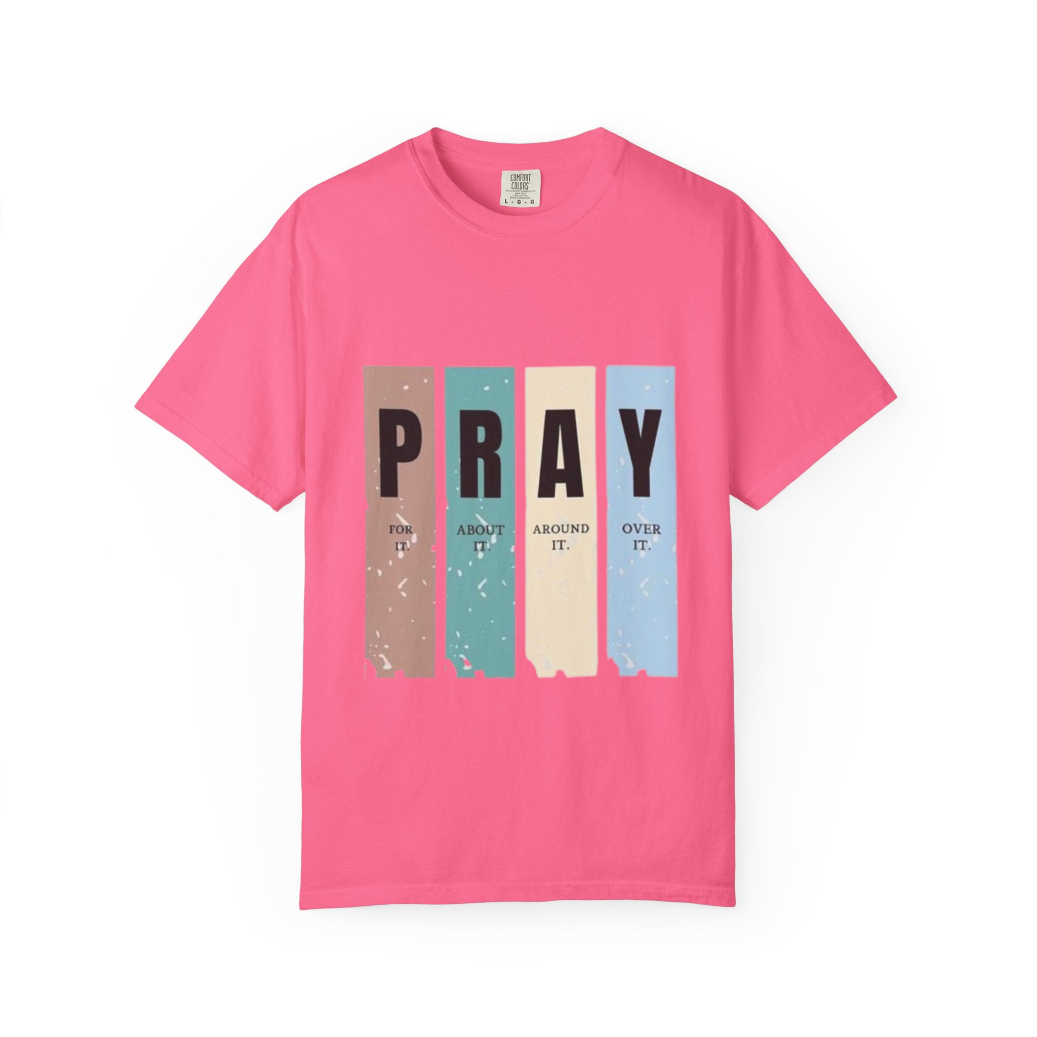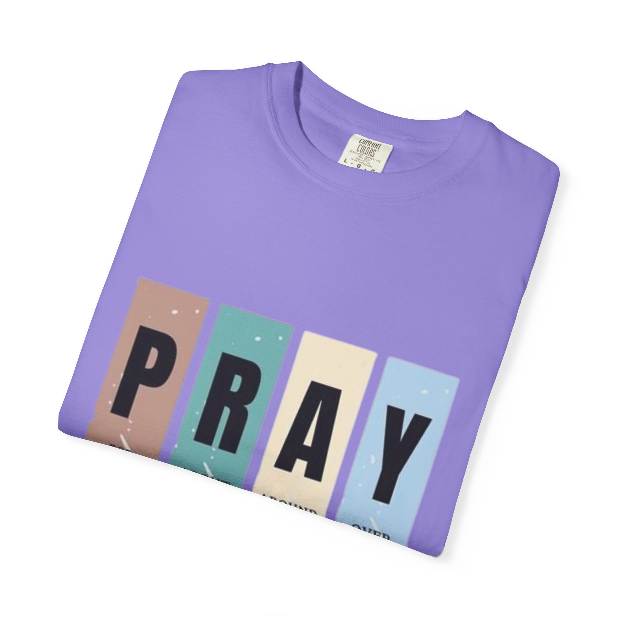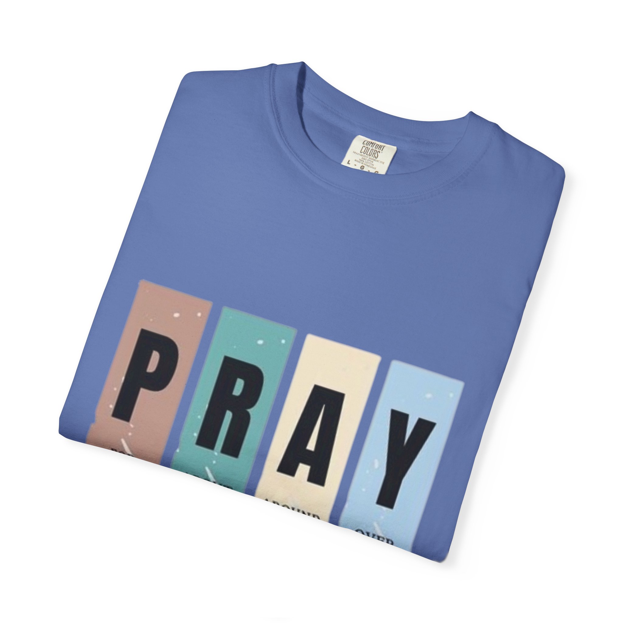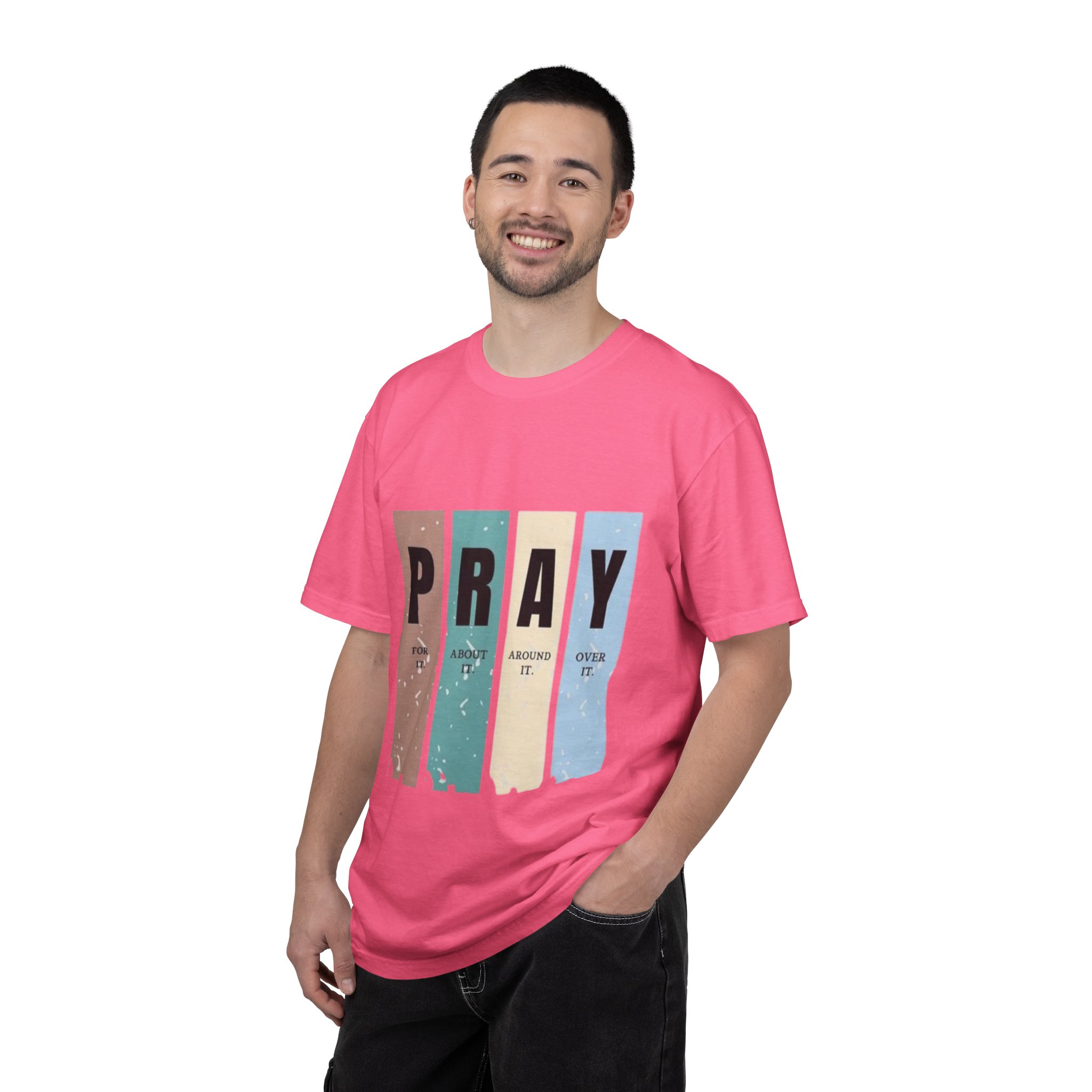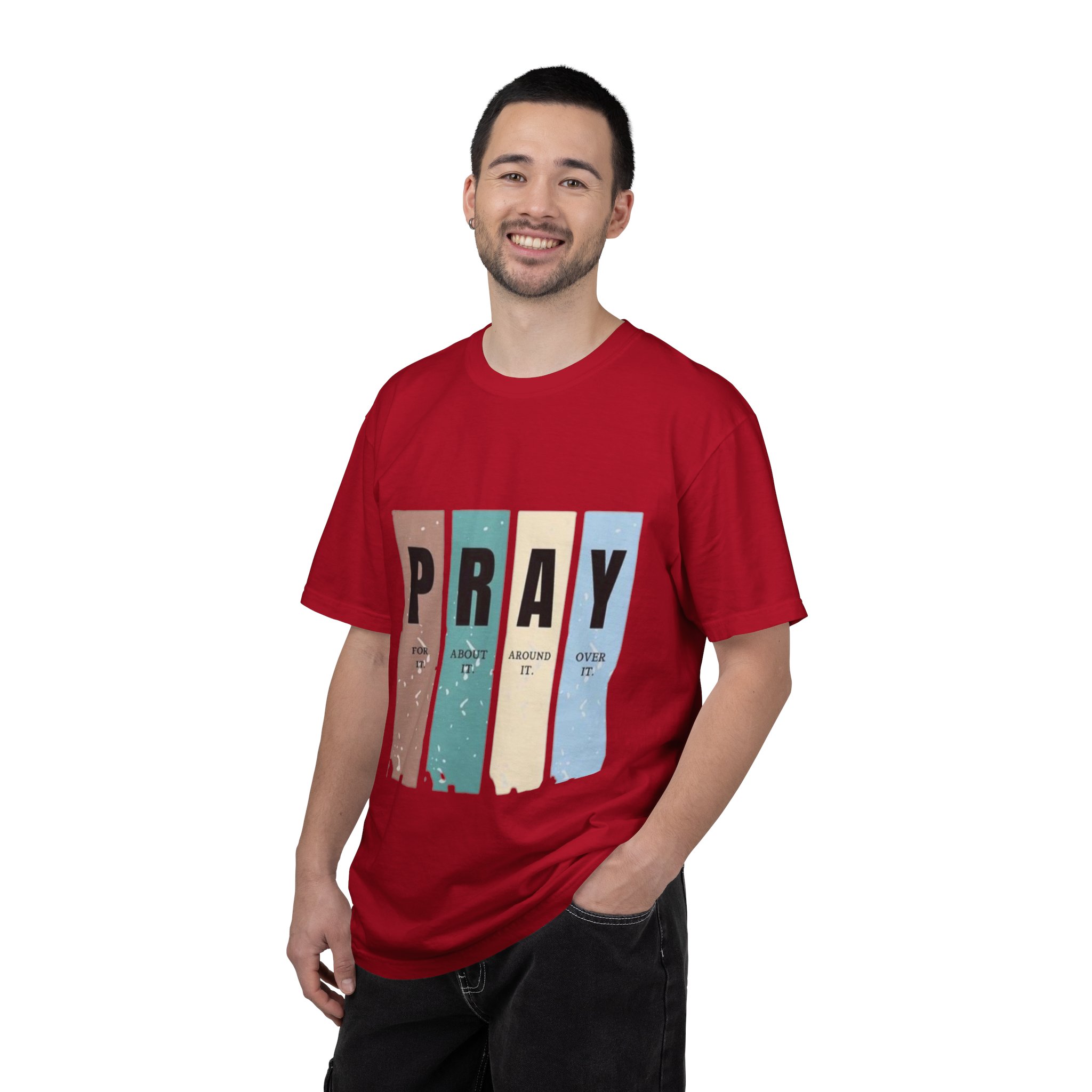 Soft, worn-in comfort meets quiet encouragement. This garment-dyed tee carries a calm, vintage palette across four painted panels that spell out PRAY — each panel gently distressed as if passed down from a trusted friend. Lightweight but substantial, it drapes loosely for easy movement and settles into the rhythm of everyday life: morning coffee, a slow commute, or an evening of small-group worship. It’s for people who choose faith in ordinary moments and want clothing that feels familiar from the first wear. The muted colors and subtle texture let the message sit humbly, not shouted. It layers under jackets, pairs with well-worn jeans, and becomes part of routines centered on reflection, community gatherings, or quiet Sundays.