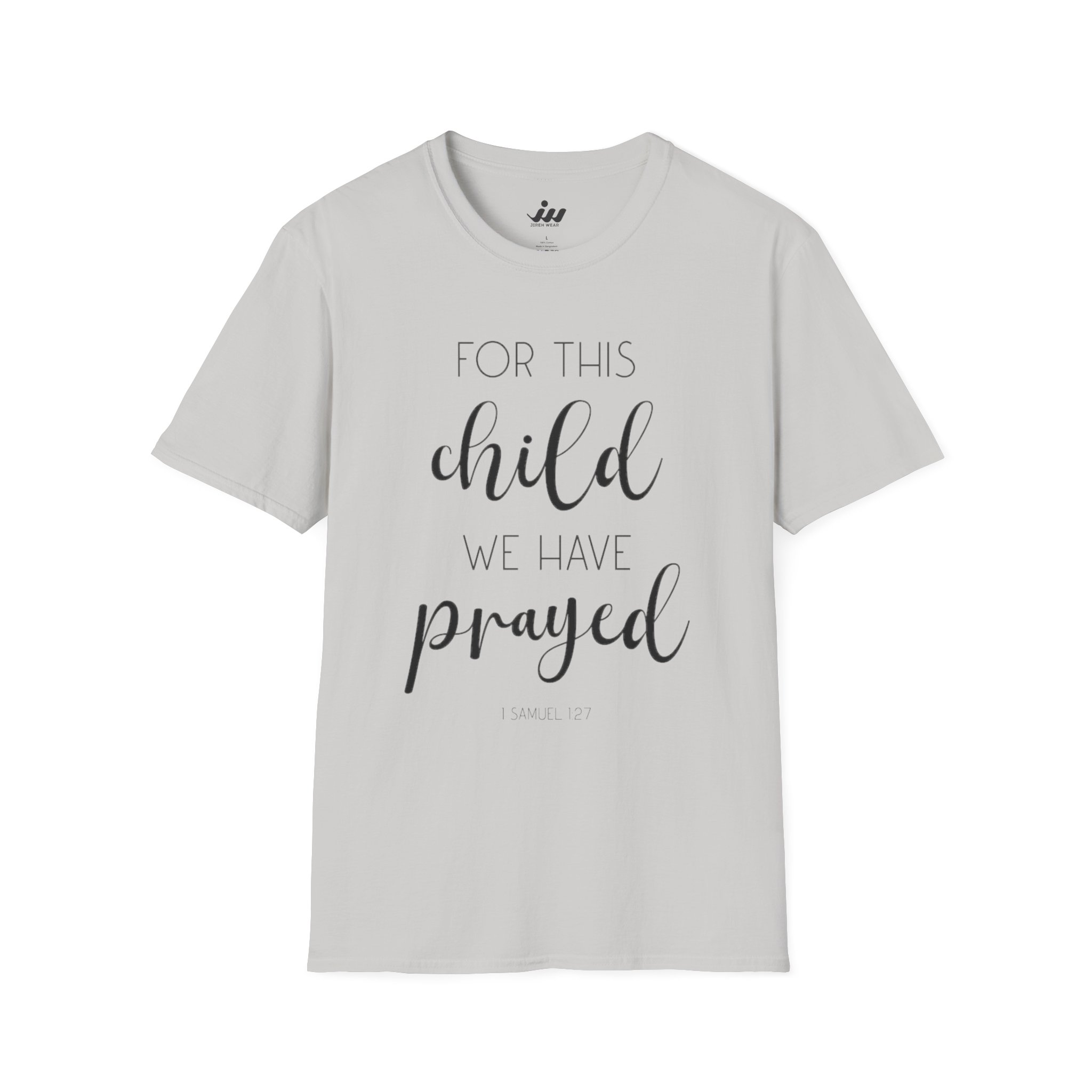 A soft, breathable tee made to carry a quiet, heartfelt message. Lightweight ring-spun cotton gives this shirt a smooth, lived-in feel that layers easily or stands on its own. The delicate script—“For this child we have prayed”—settles gently across the chest, offering a subtle, faith-filled statement without shouting. Tubular knit construction and shoulder tape keep the silhouette clean and stable wash after wash. Wear it to baptism gatherings, pregnancy announcements, baby showers, or slow Sunday mornings when you want clothing that feels like comfort and keeps a personal story close to your heart.