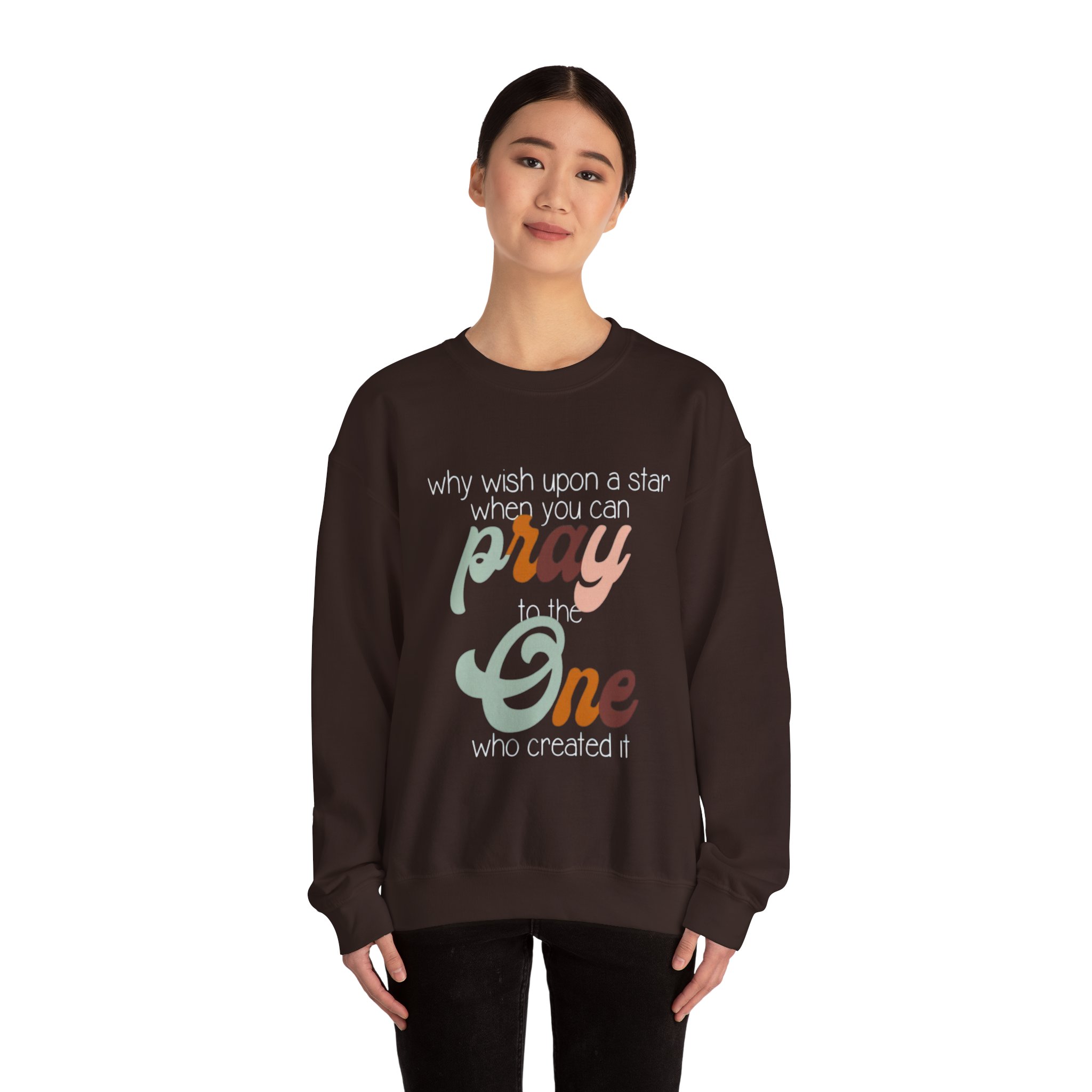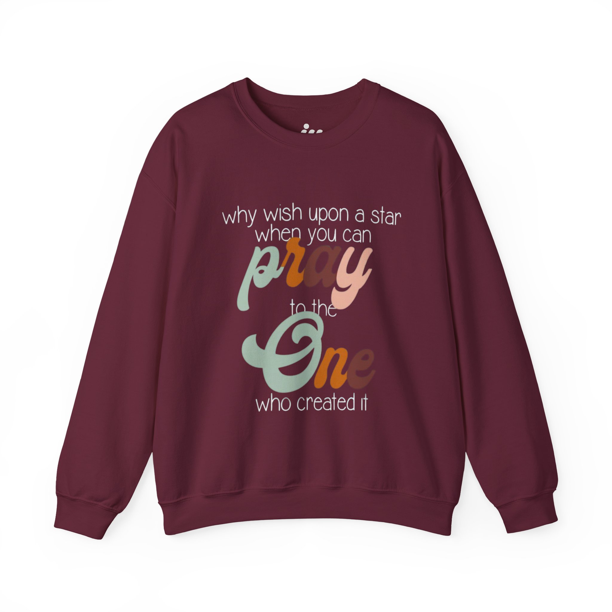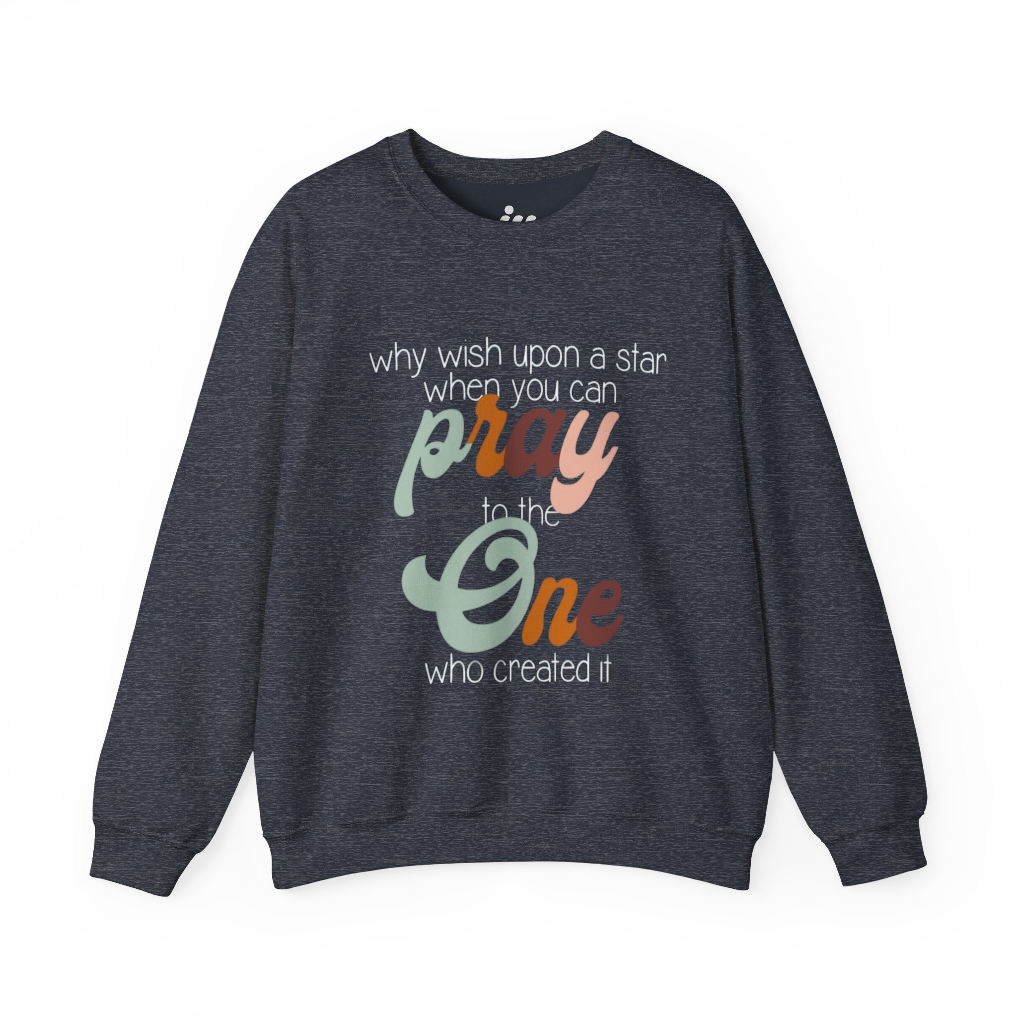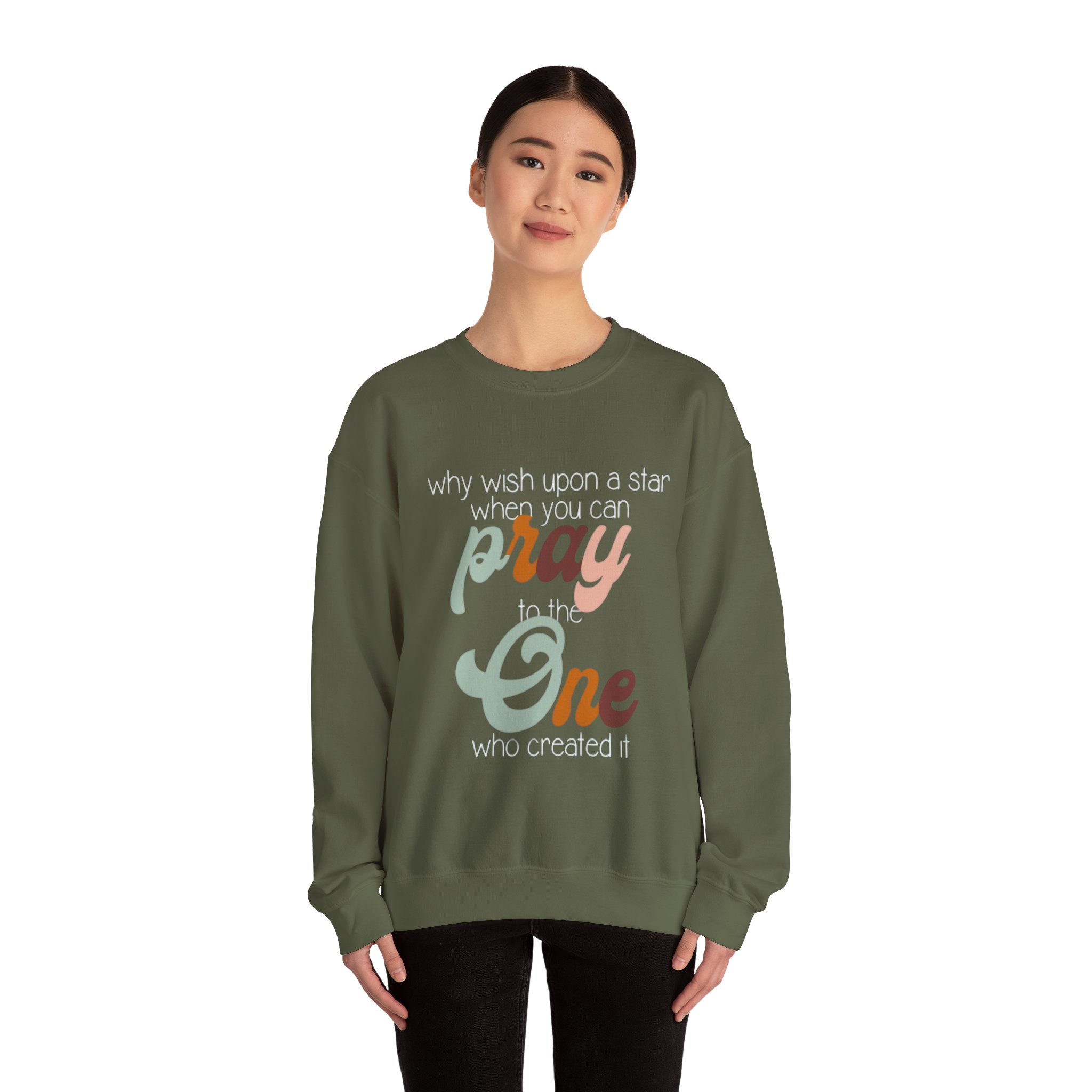 Soft, warm, and quietly expressive — this crewneck wraps faith in vintage-inspired color. A mid-weight cotton-poly blend keeps the fit structured but cozy, while the retro script reading “pray to the One who created it” sits centered as a gentle reminder of gratitude and wonder. Wear it on slow mornings with coffee, to evening worship, or layered for chilly campfire nights. The muted, sun-washed palette makes the message feel personal, not loud — a comfortable piece that slips easily into everyday life and conversations.