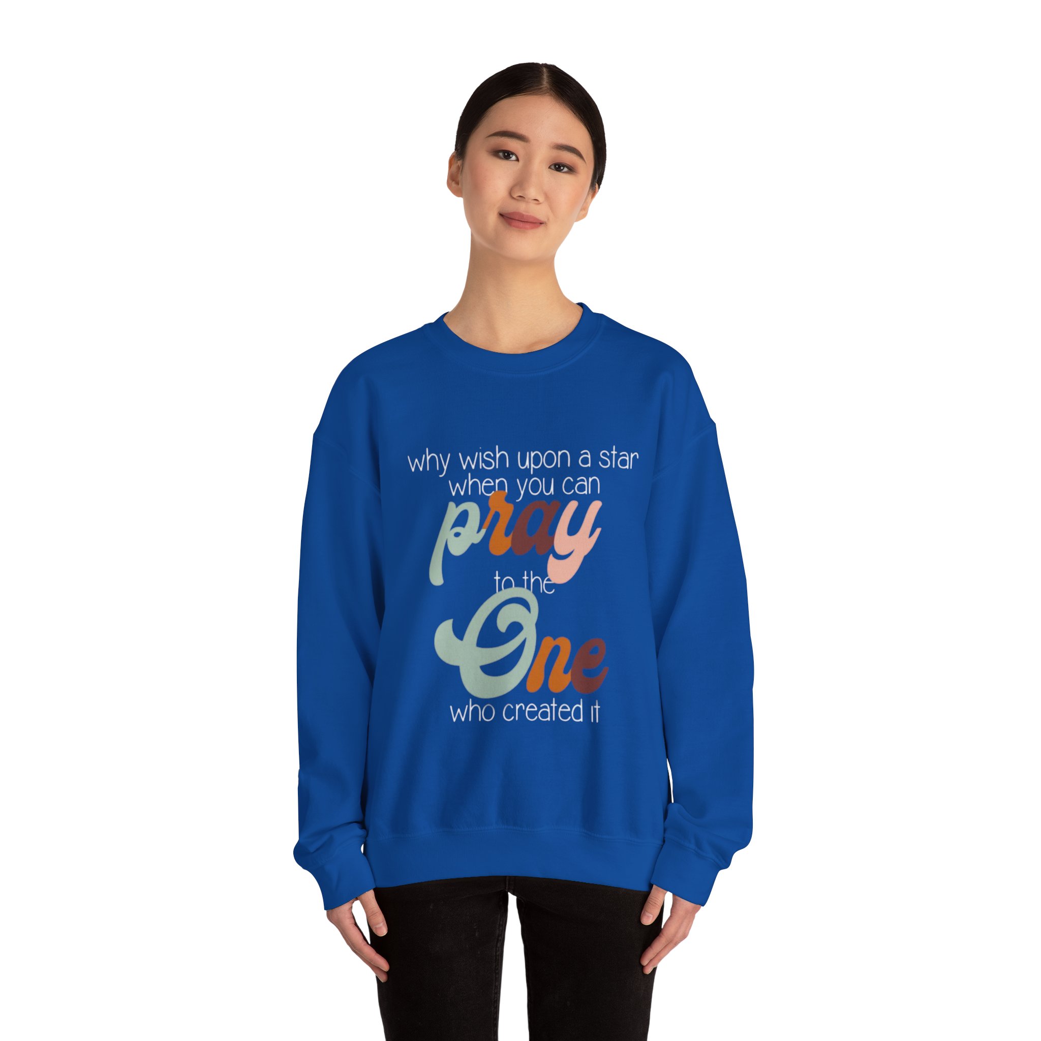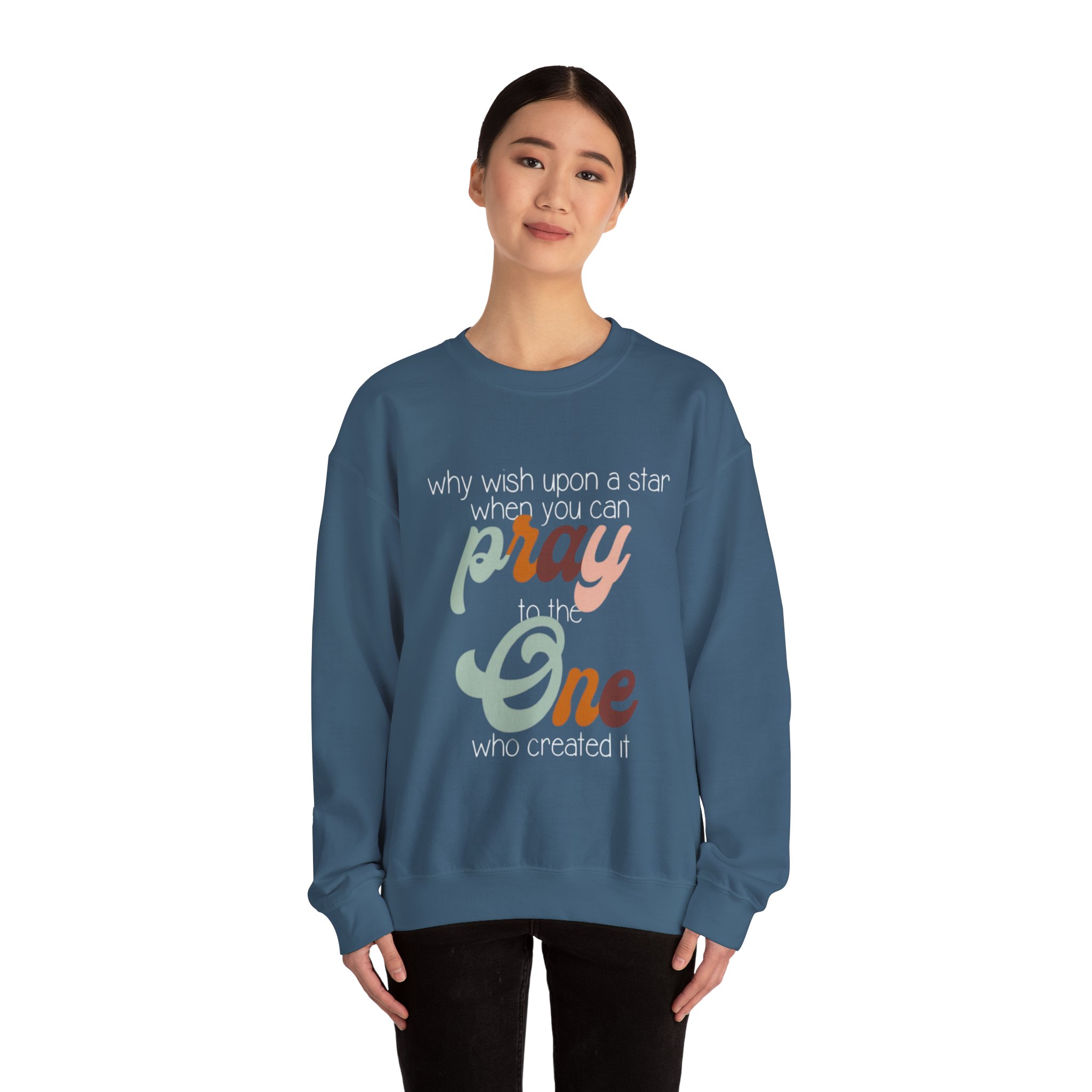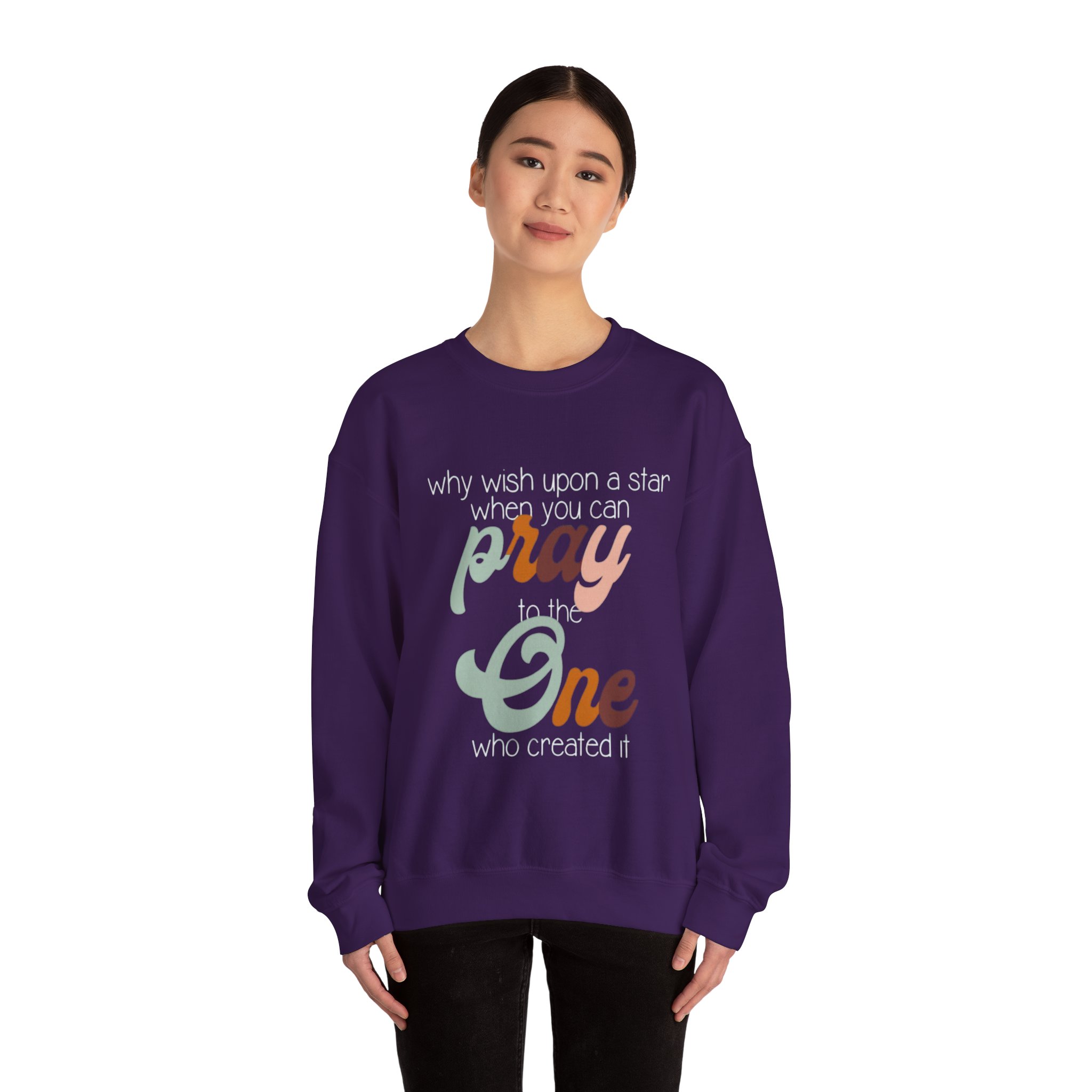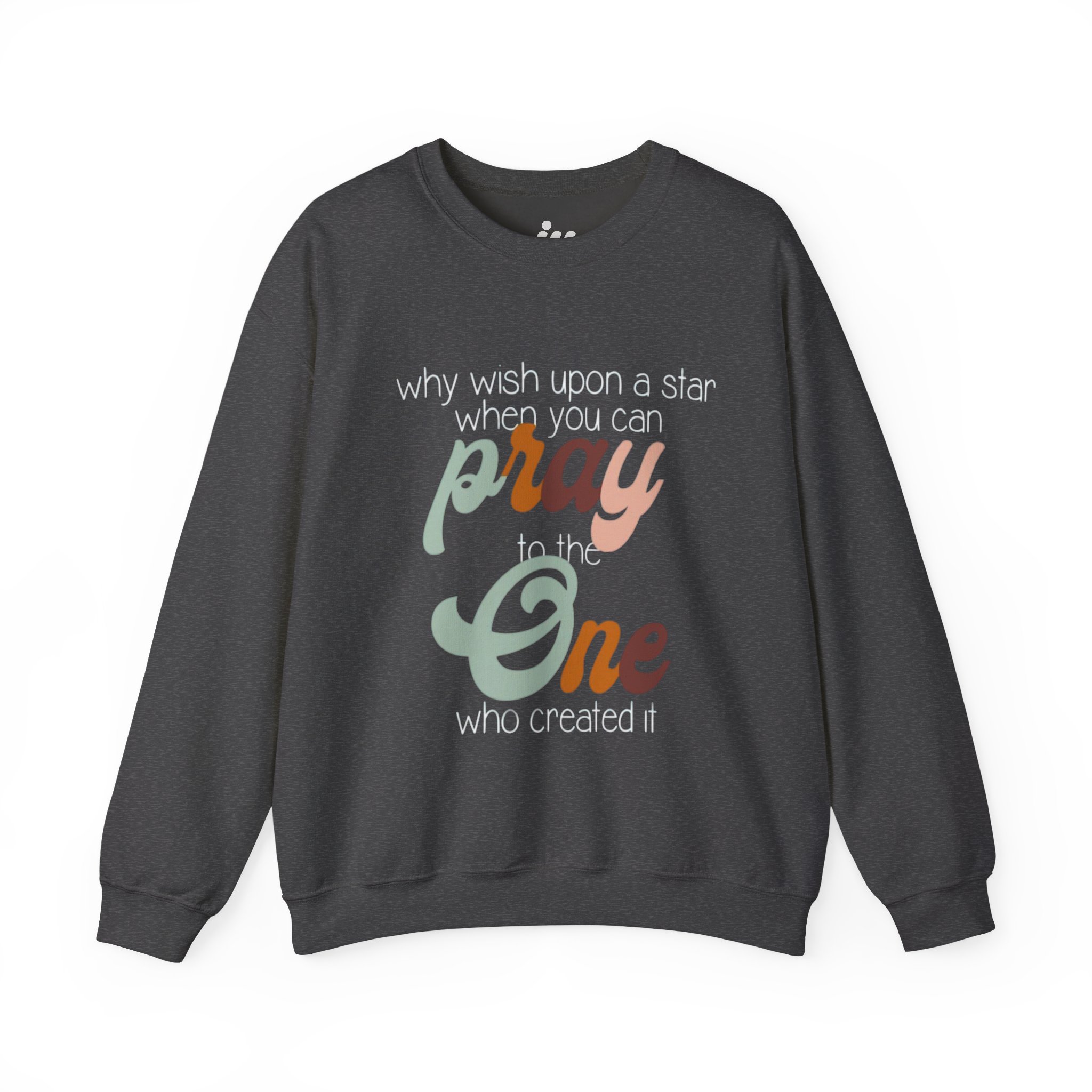 Soft, warm, and quietly expressive — this crewneck wraps faith in vintage-inspired color. A mid-weight cotton-poly blend keeps the fit structured but cozy, while the retro script reading “pray to the One who created it” sits centered as a gentle reminder of gratitude and wonder. Wear it on slow mornings with coffee, to evening worship, or layered for chilly campfire nights. The muted, sun-washed palette makes the message feel personal, not loud — a comfortable piece that slips easily into everyday life and conversations.