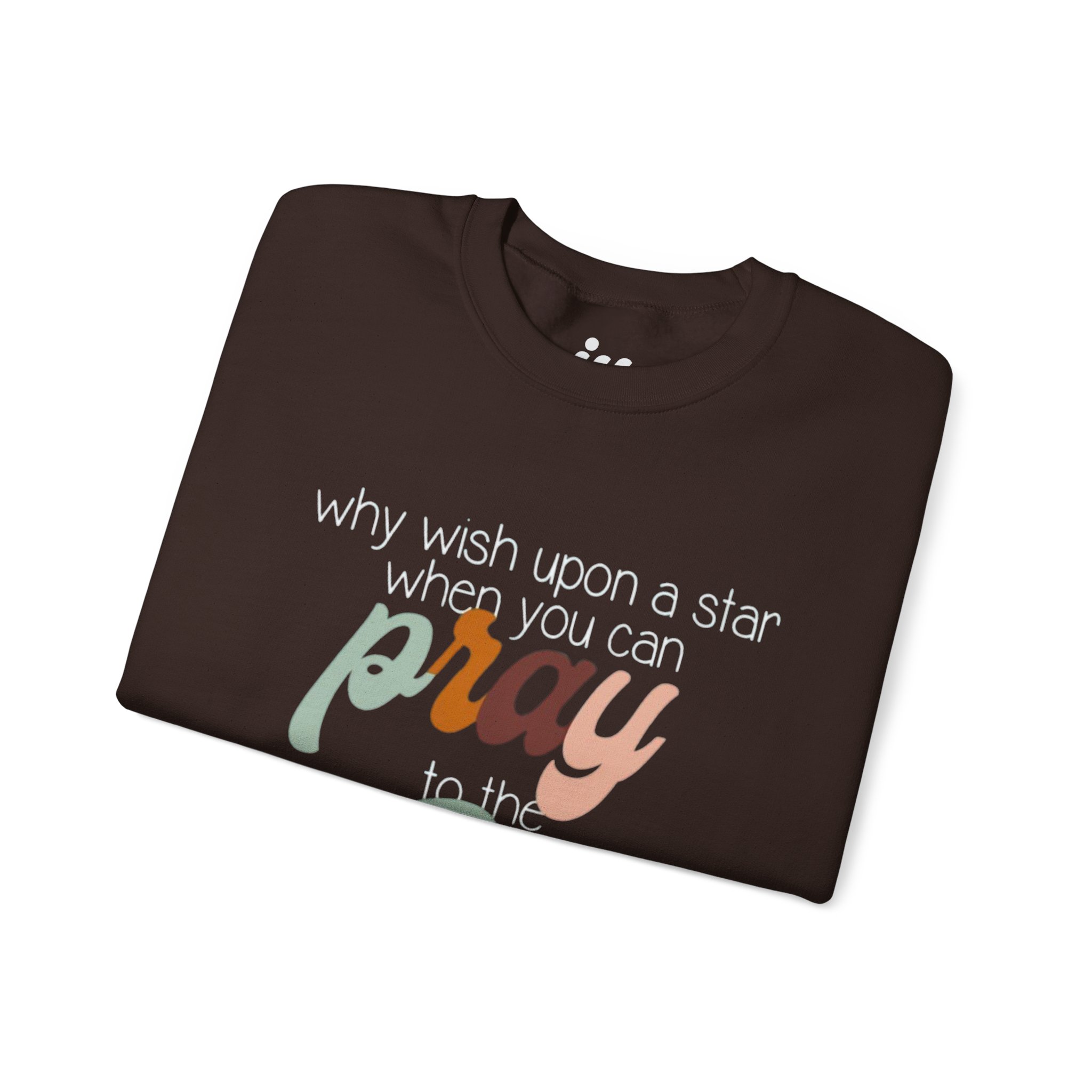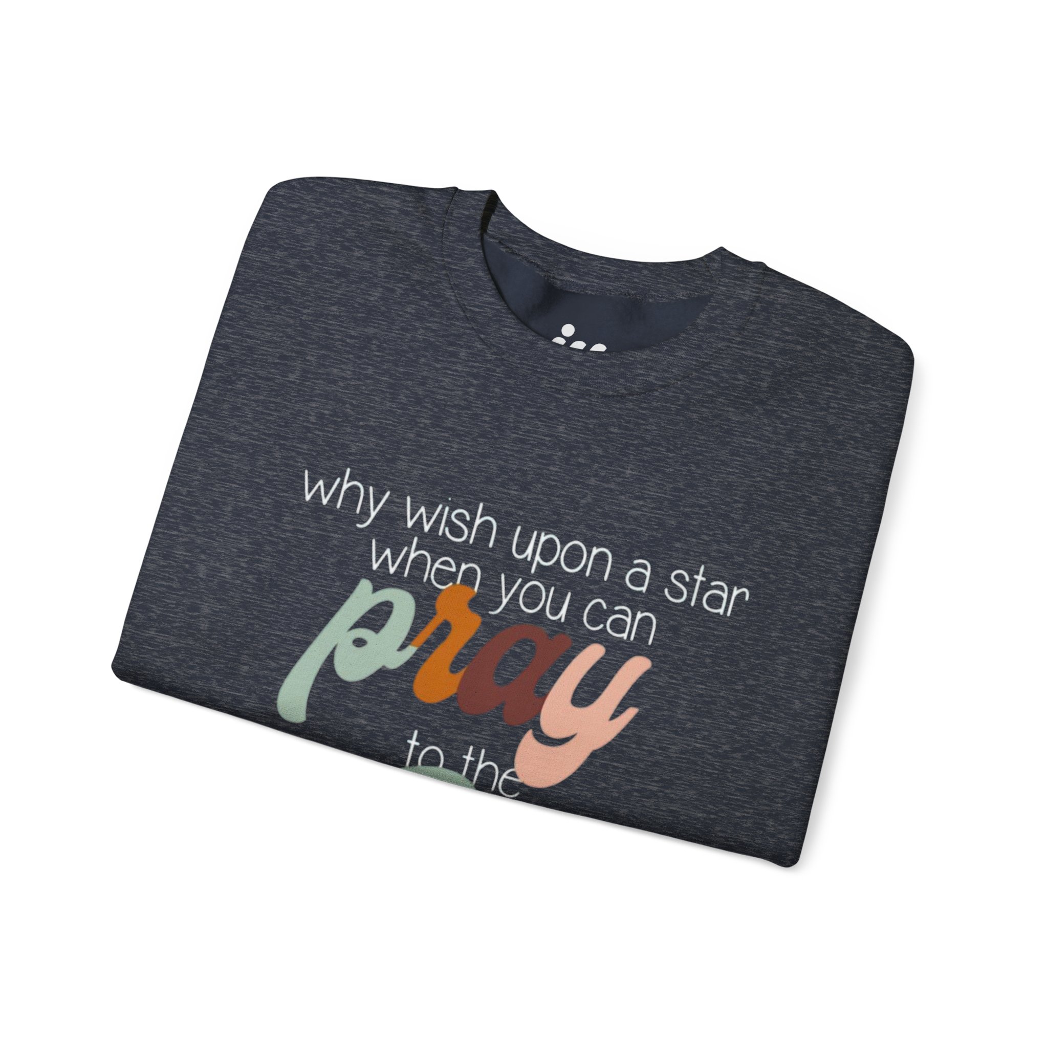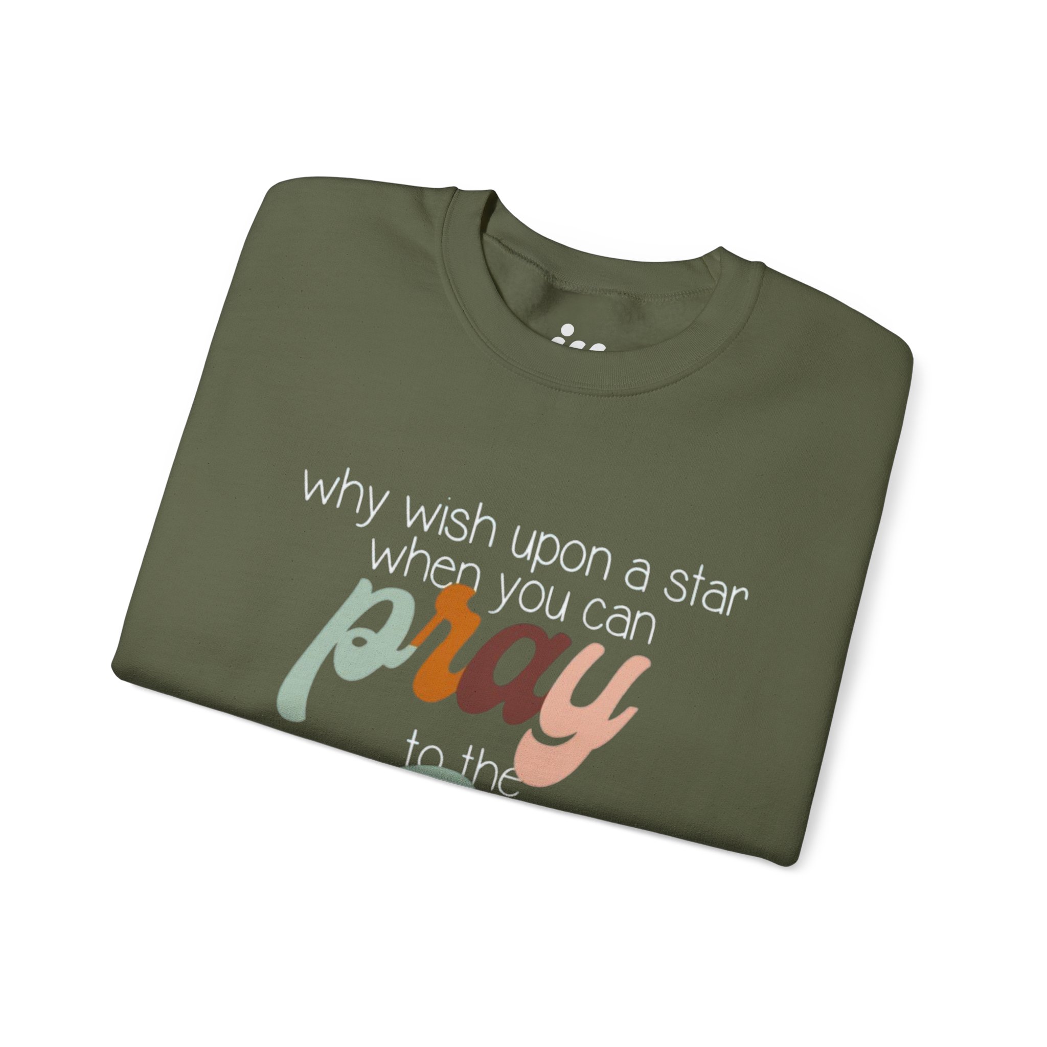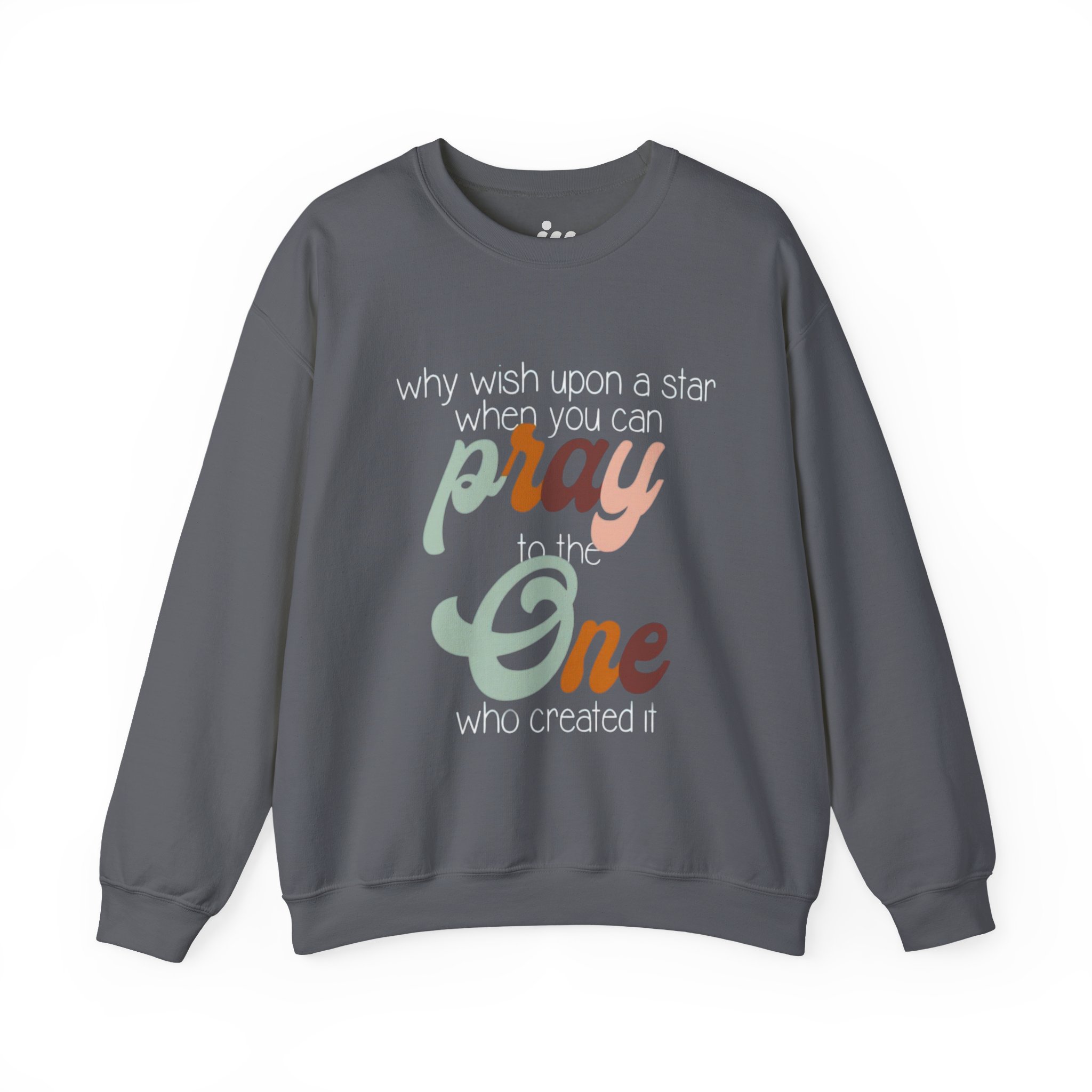 Soft, warm, and quietly expressive — this crewneck wraps faith in vintage-inspired color. A mid-weight cotton-poly blend keeps the fit structured but cozy, while the retro script reading “pray to the One who created it” sits centered as a gentle reminder of gratitude and wonder. Wear it on slow mornings with coffee, to evening worship, or layered for chilly campfire nights. The muted, sun-washed palette makes the message feel personal, not loud — a comfortable piece that slips easily into everyday life and conversations.