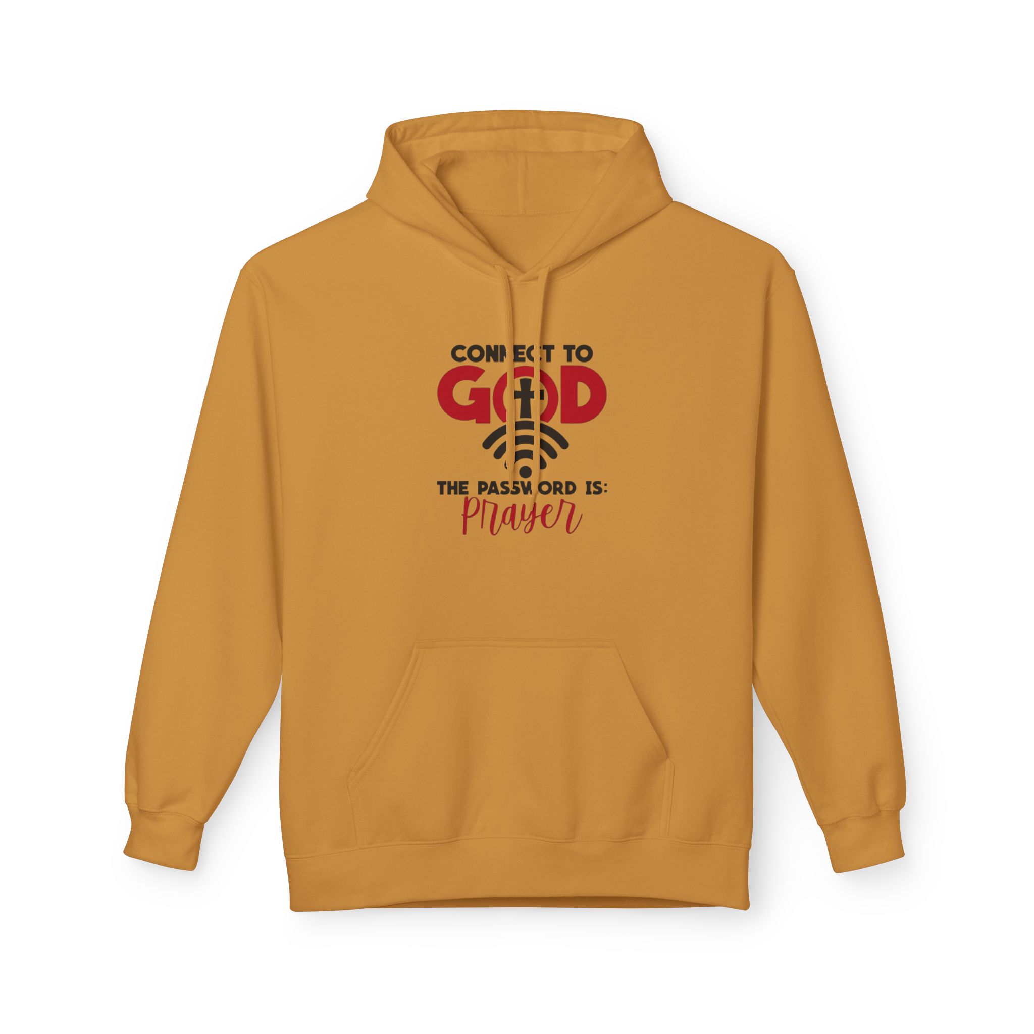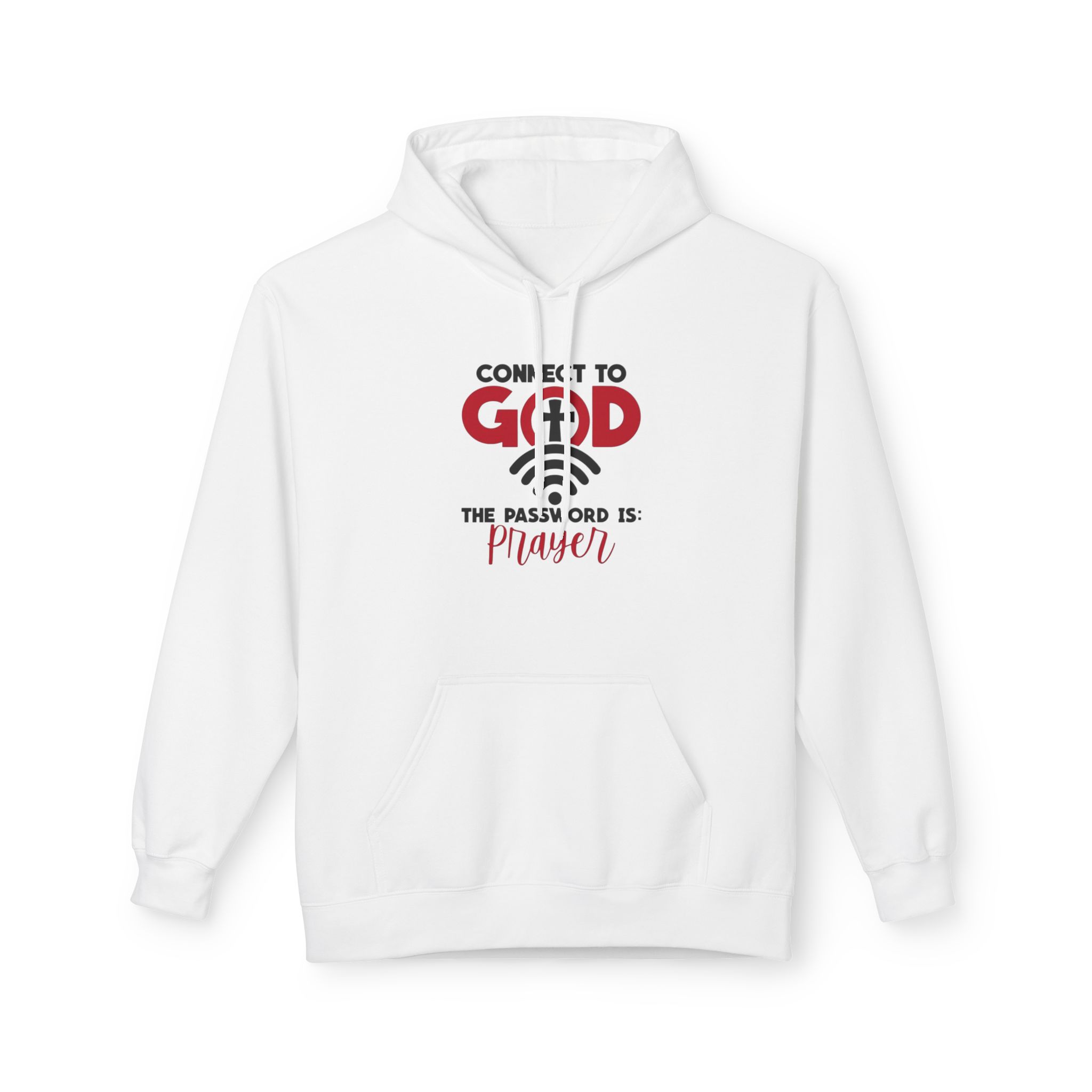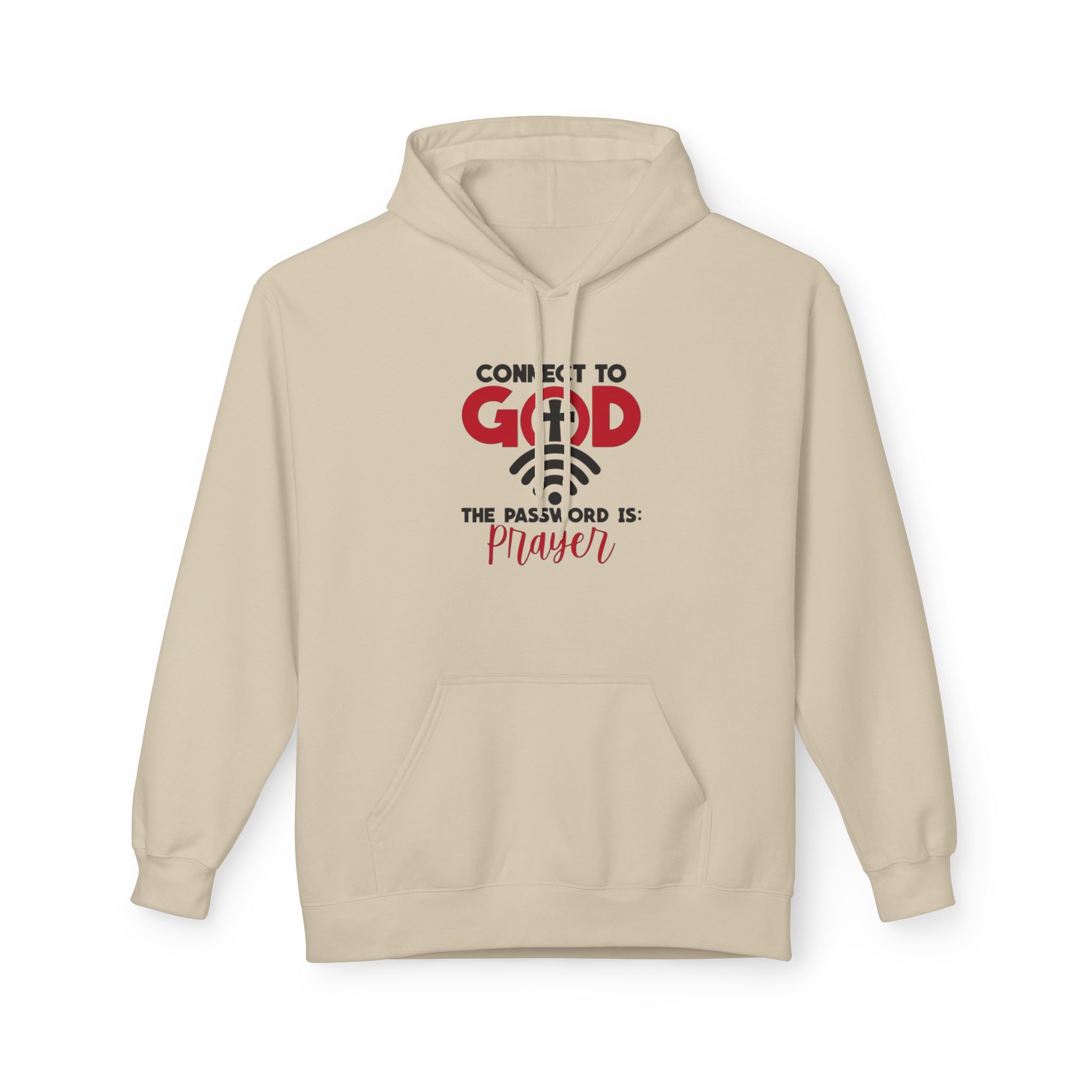 Soft, warm, and quietly confident — this midweight hoodie carries a simple message of faith woven into everyday life. The front features a clean, typographic design that reads “Connect to God” with a subtle cross and the line “The password is: Prayer.” It sits centered over a classic pouch pocket and structured two-piece hood, creating a balanced, lived-in look. The dropped shoulders and medium-heavy fabric give it that relaxed silhouette you reach for on slow mornings, evening walks, or when you want to sit and pray without fuss. Ethically made and OEKO-TEX certified, it feels good to wear and to stand behind.