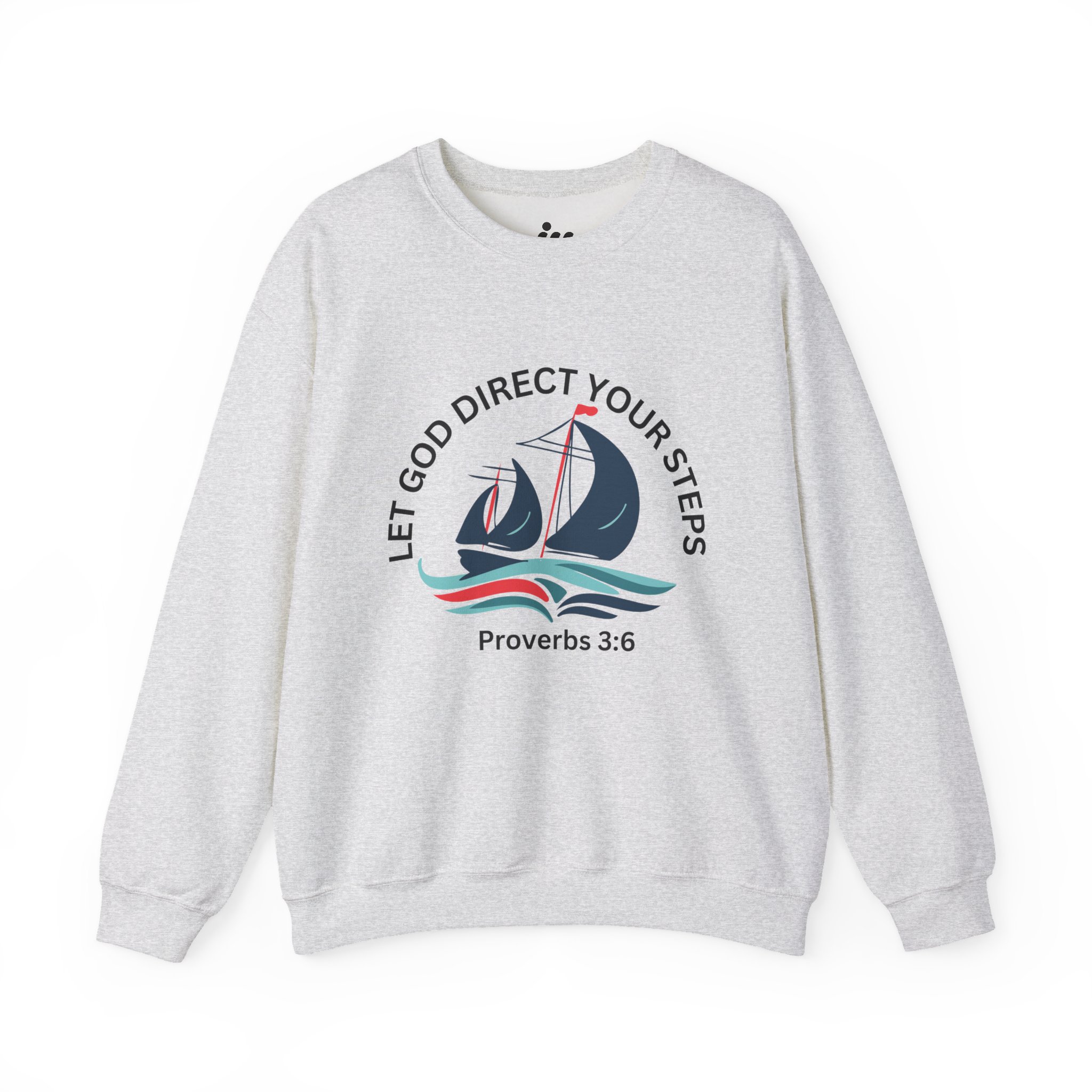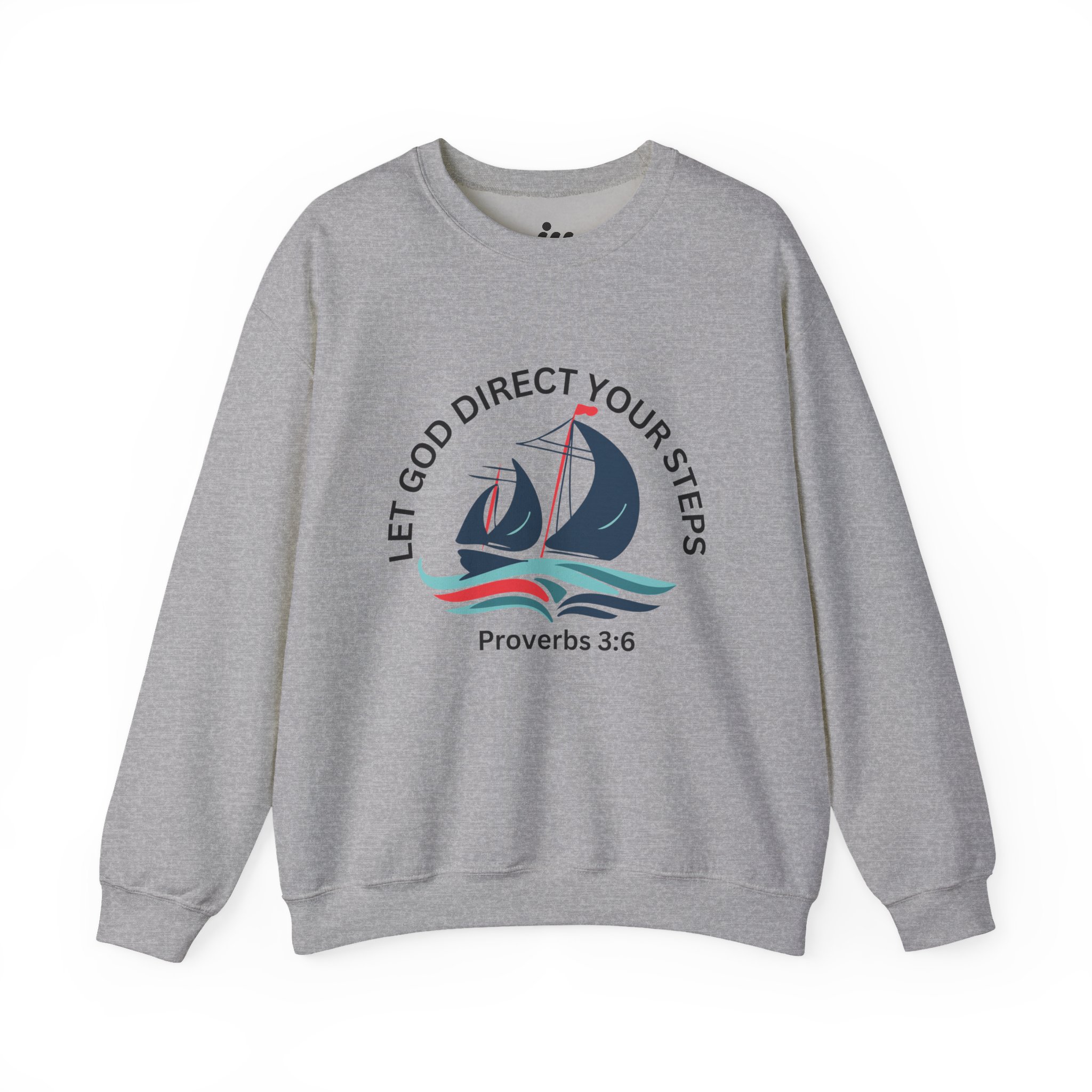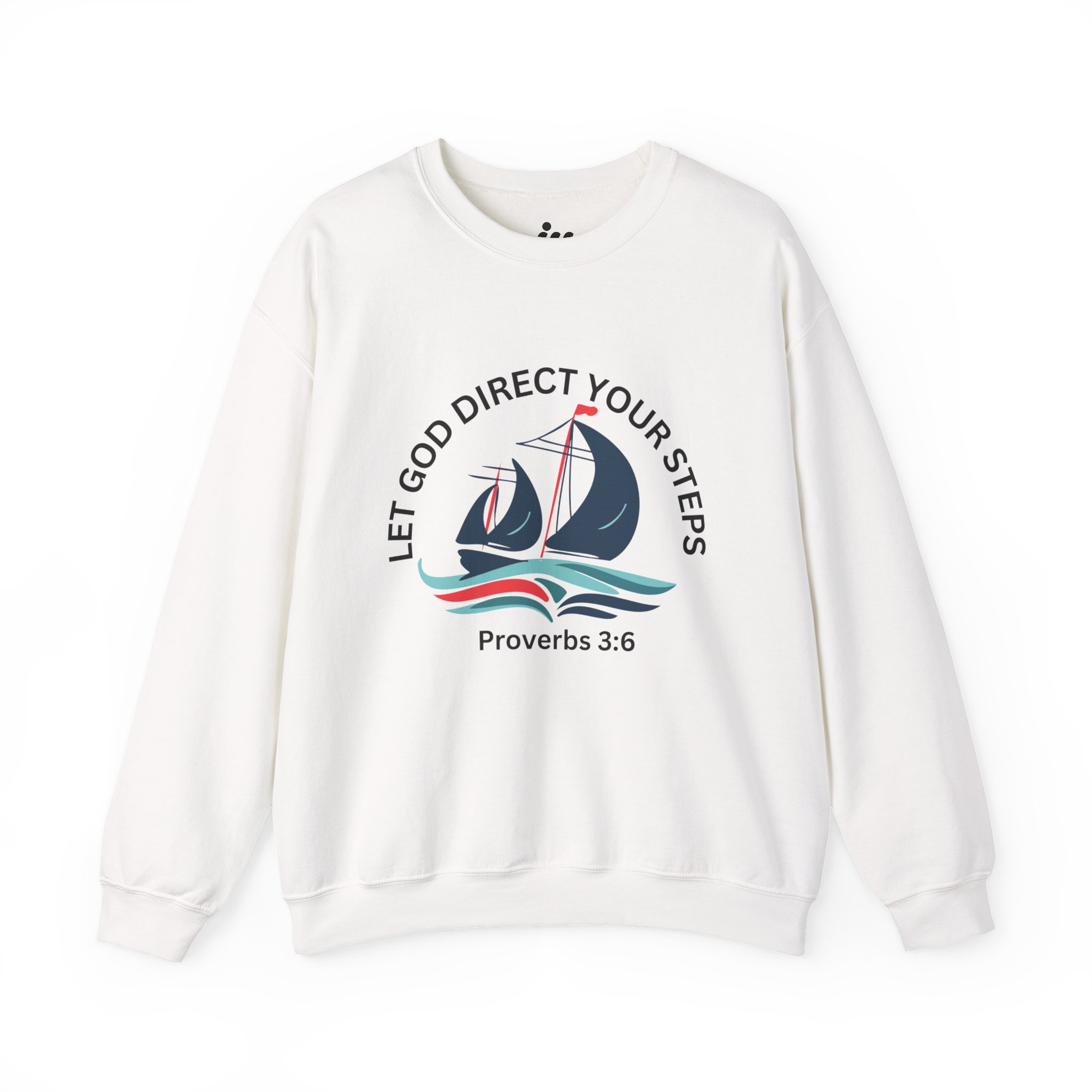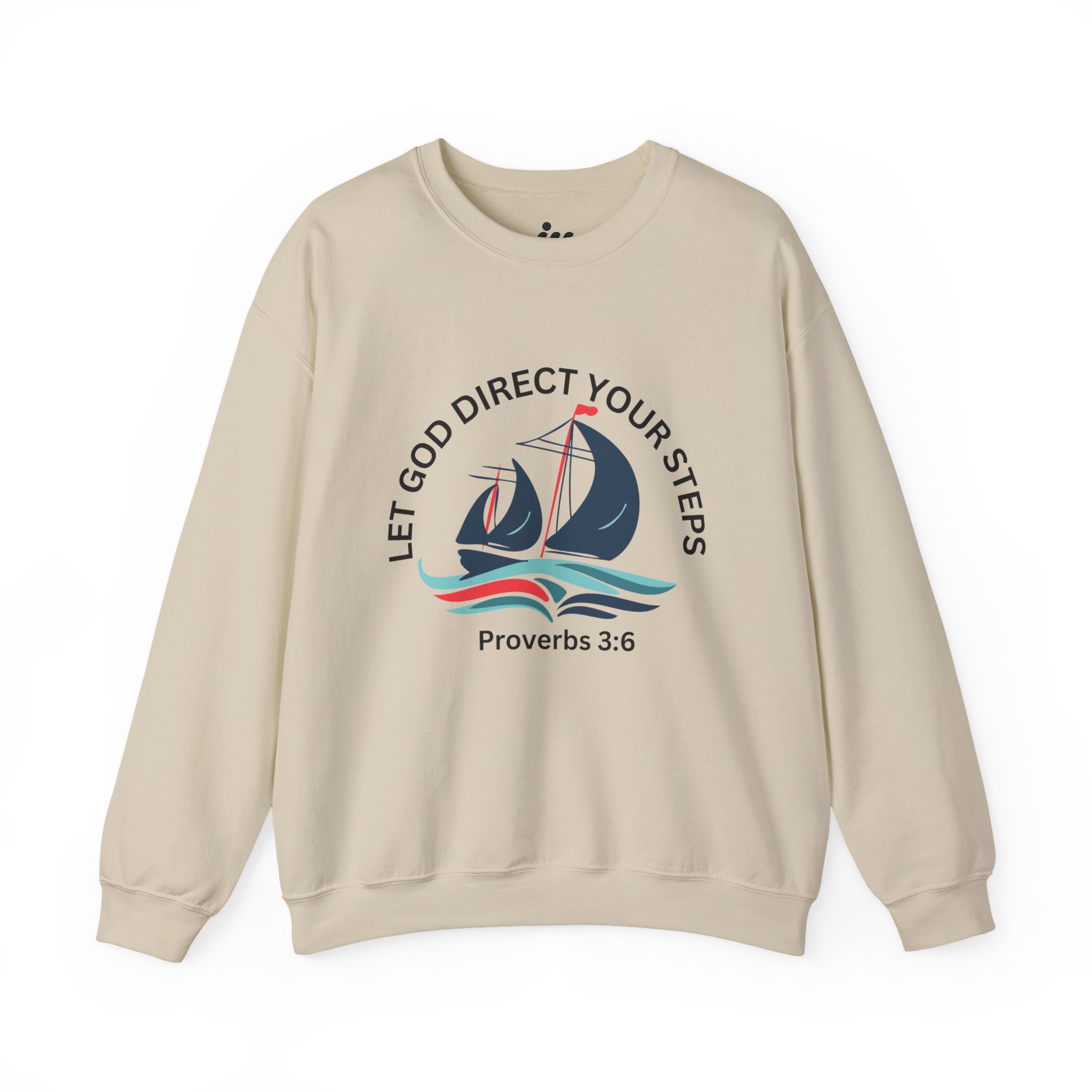 A soft, mid-weight crewneck sweatshirt that carries a calm, faith-centered message. The front shows a simple sailboat motif with gentle waves and the verse “Let God direct your steps — Proverbs 3:6,” rendered in muted navy, teal, and coral tones. The classic fit and ribbed collar give it a clean silhouette for layering or lounging. It feels like a quiet, reassuring hug on cool mornings — the kind of piece you reach for before church, a coastal walk, or an evening of reflection with friends and family.